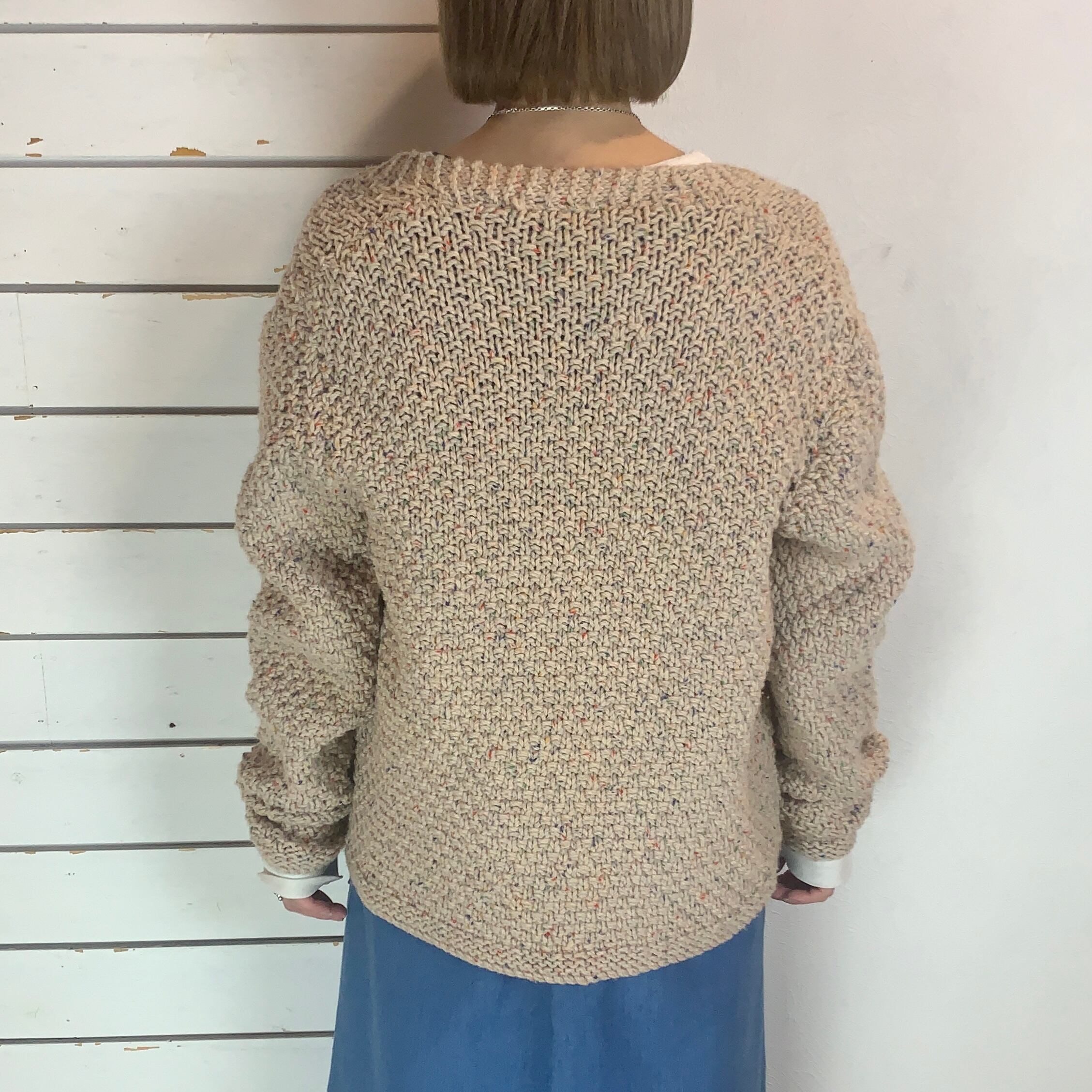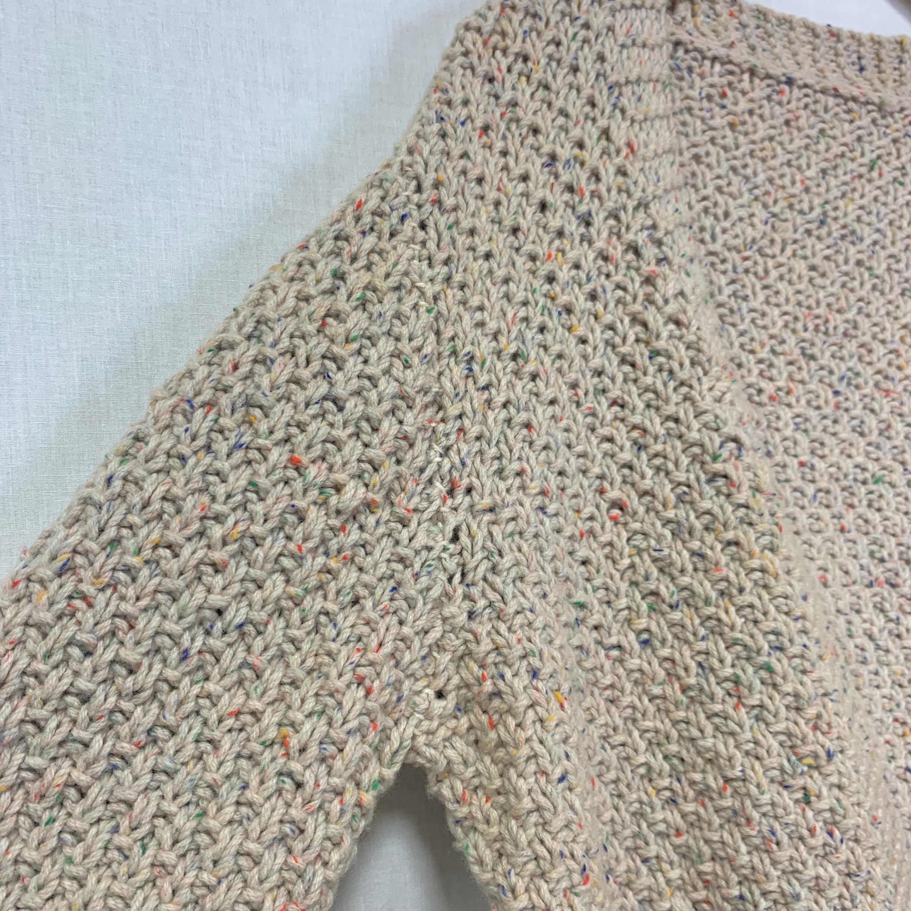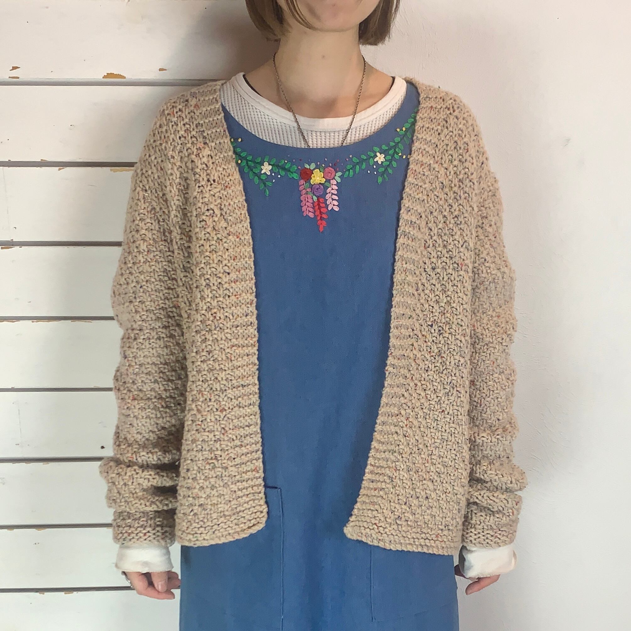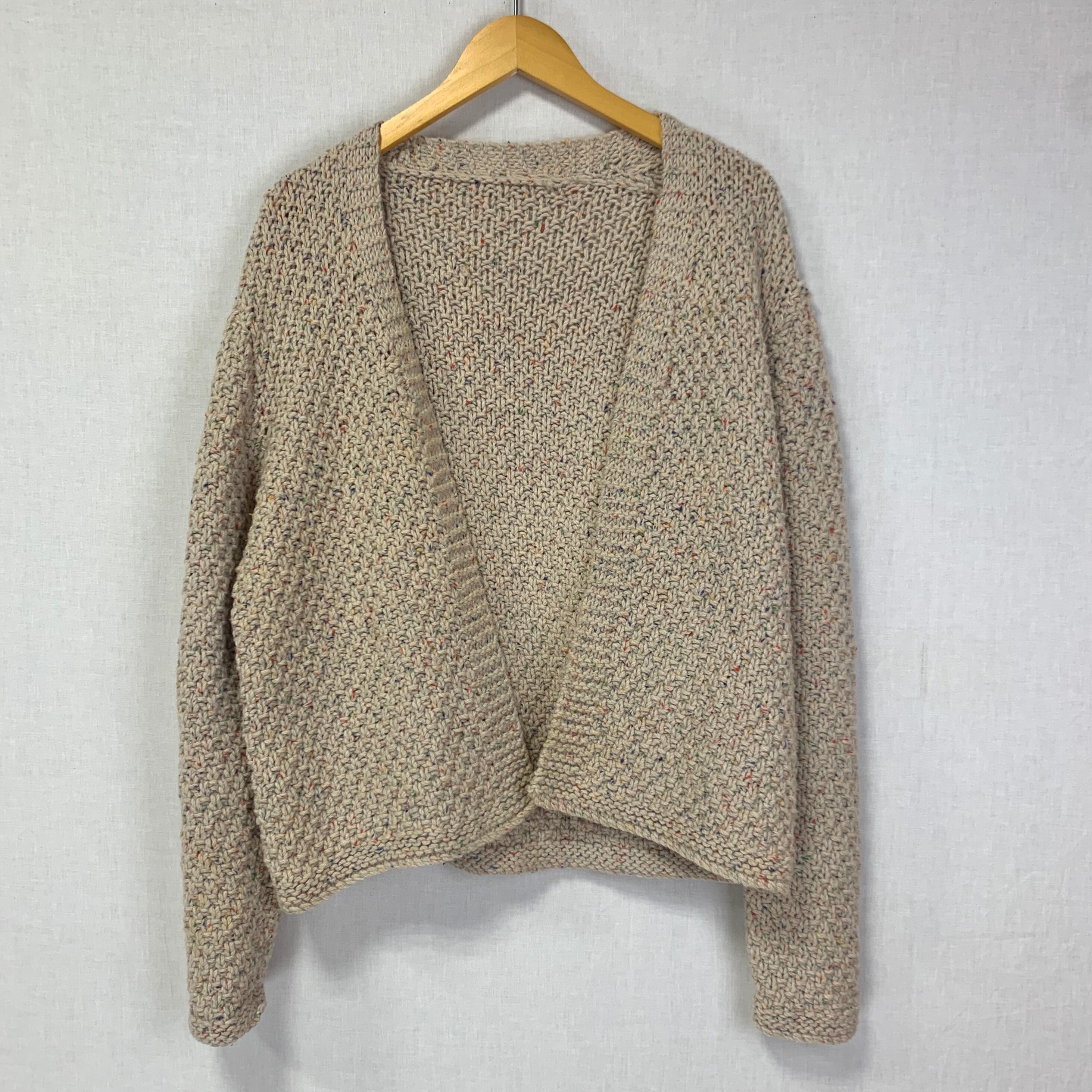 春らしいベビーピンクにカラフルなネップが入ったニットカーディガン