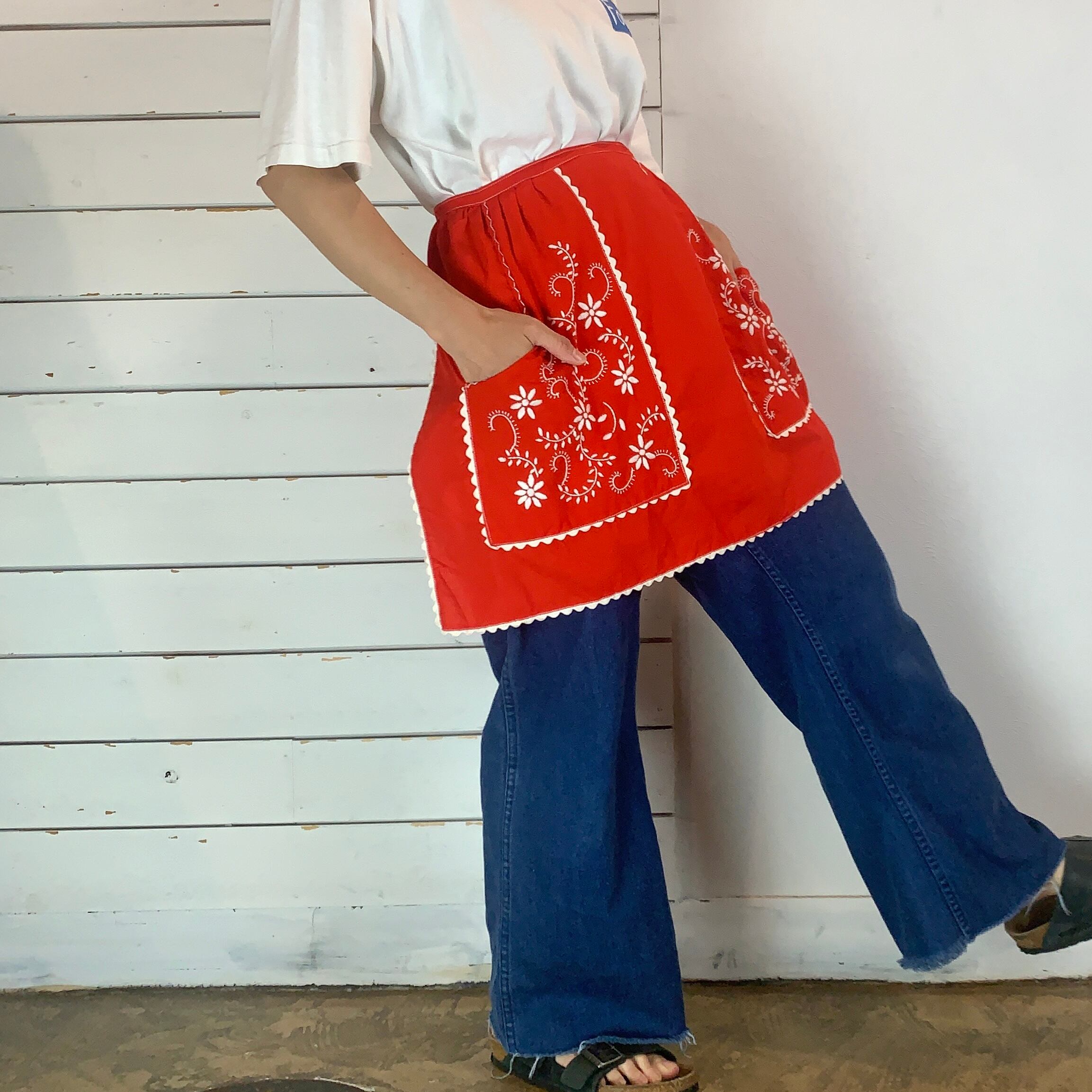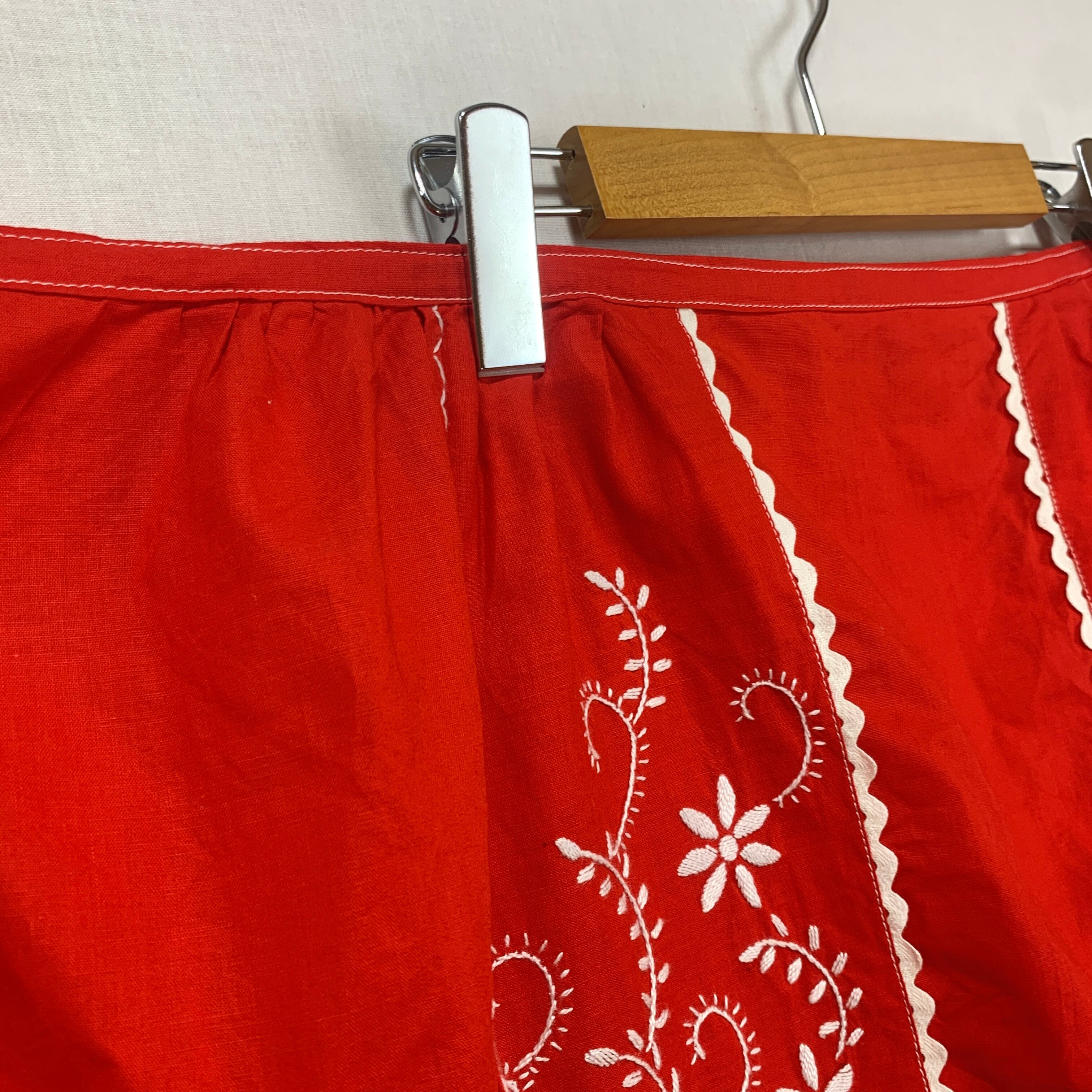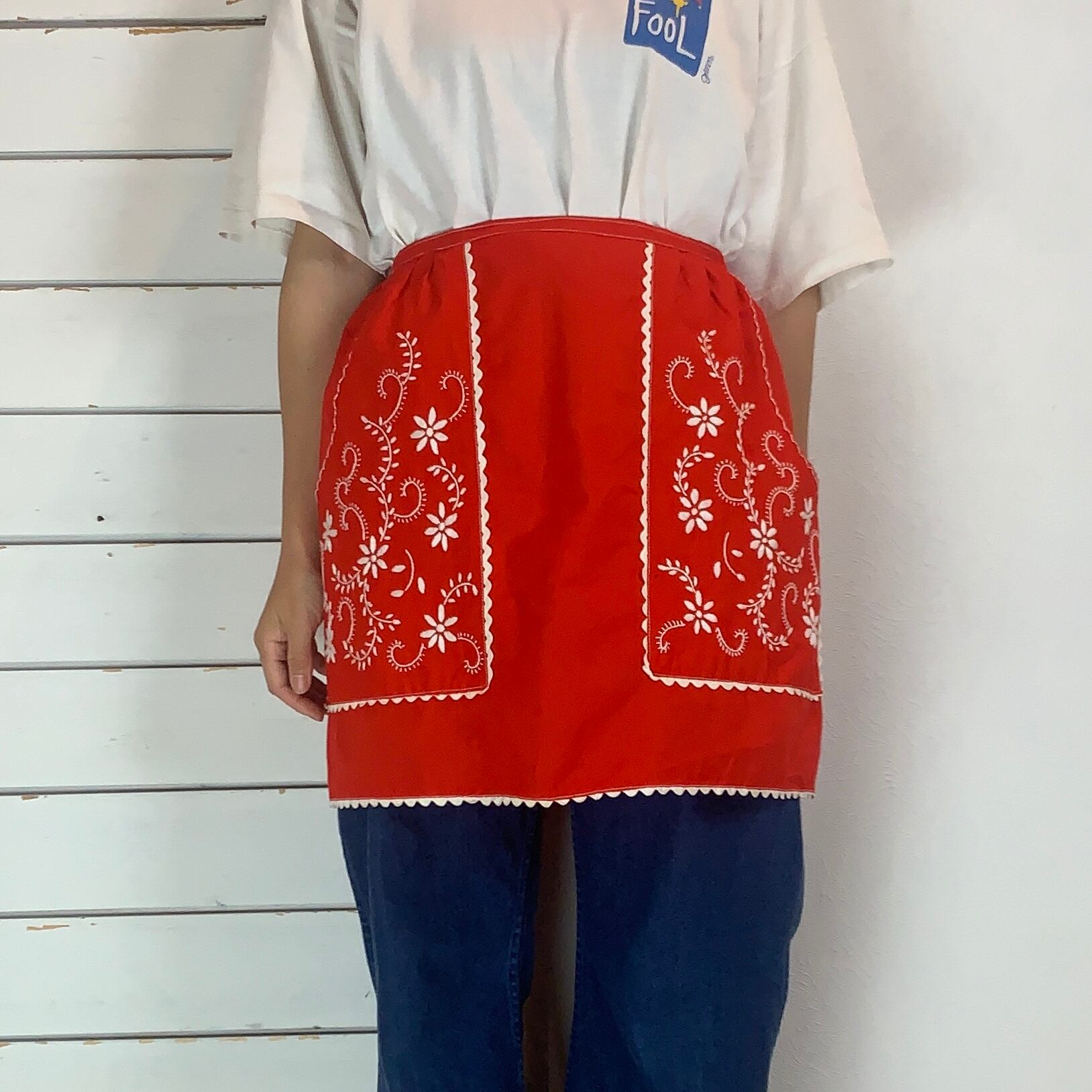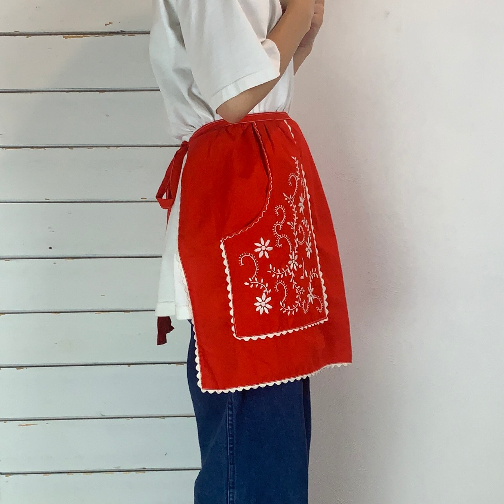 鮮やかな赤に白のお花刺繍が映える前かけエプロン