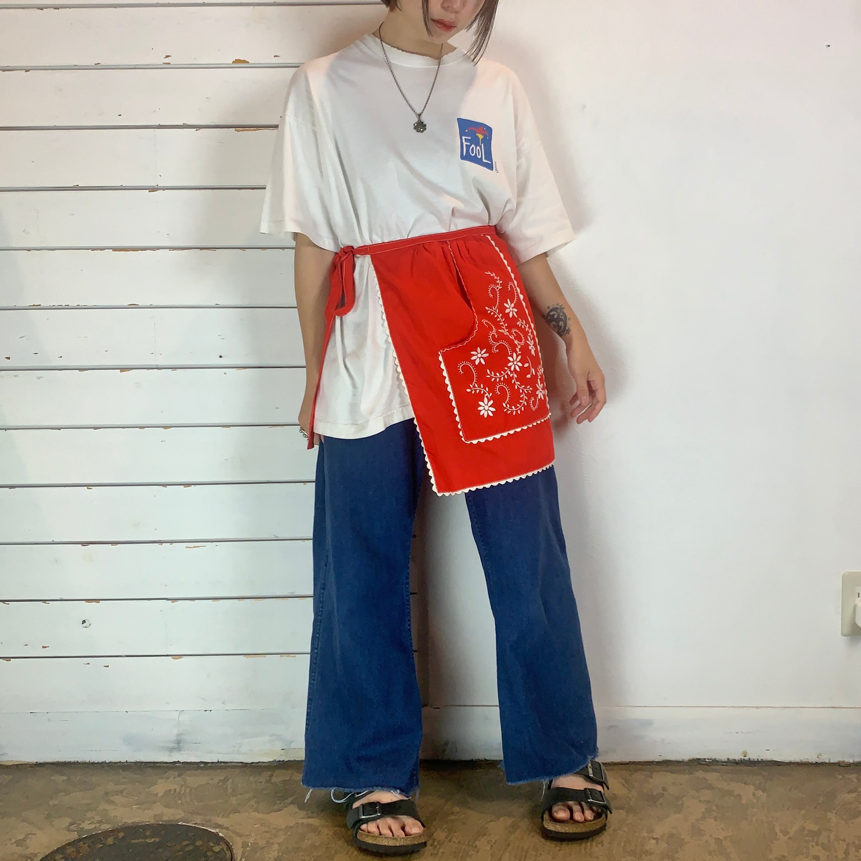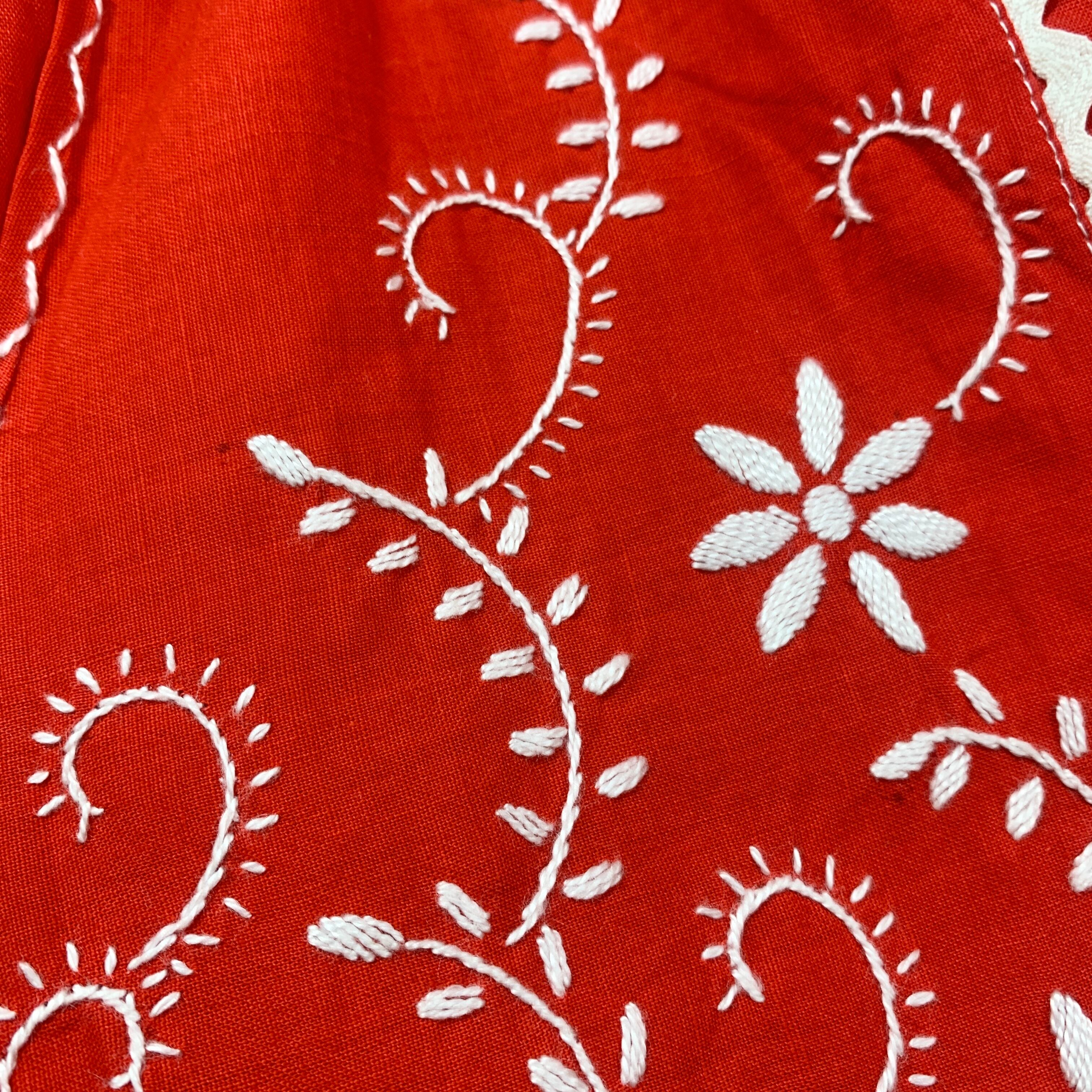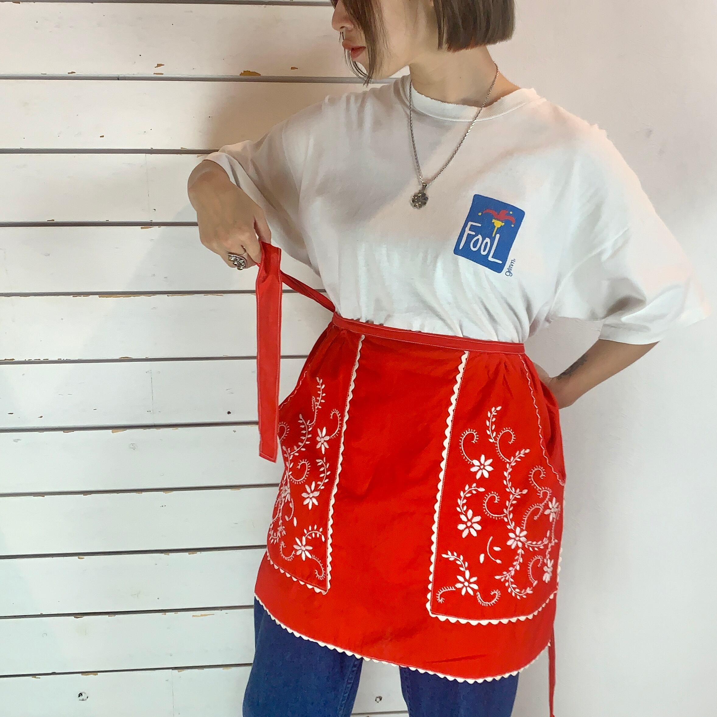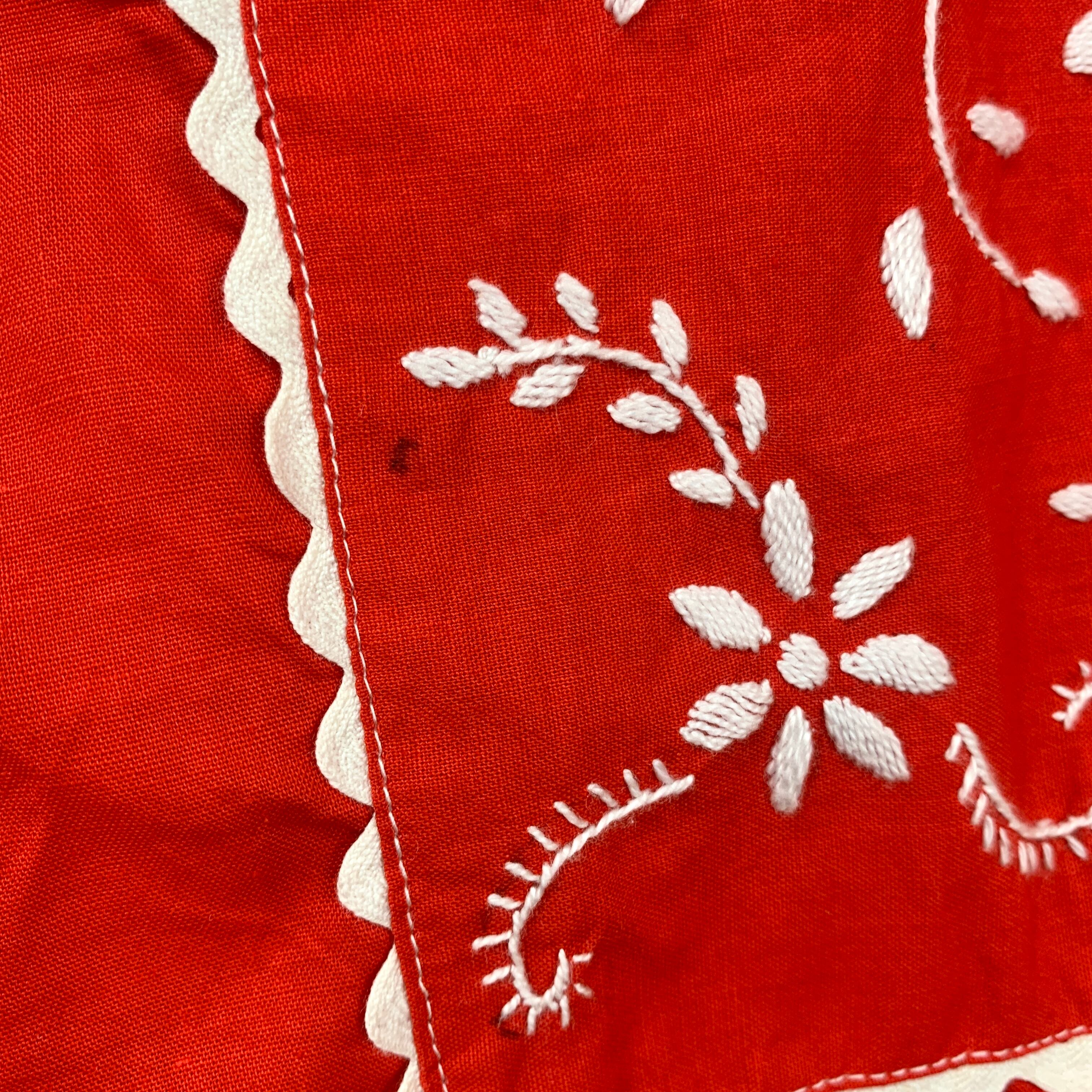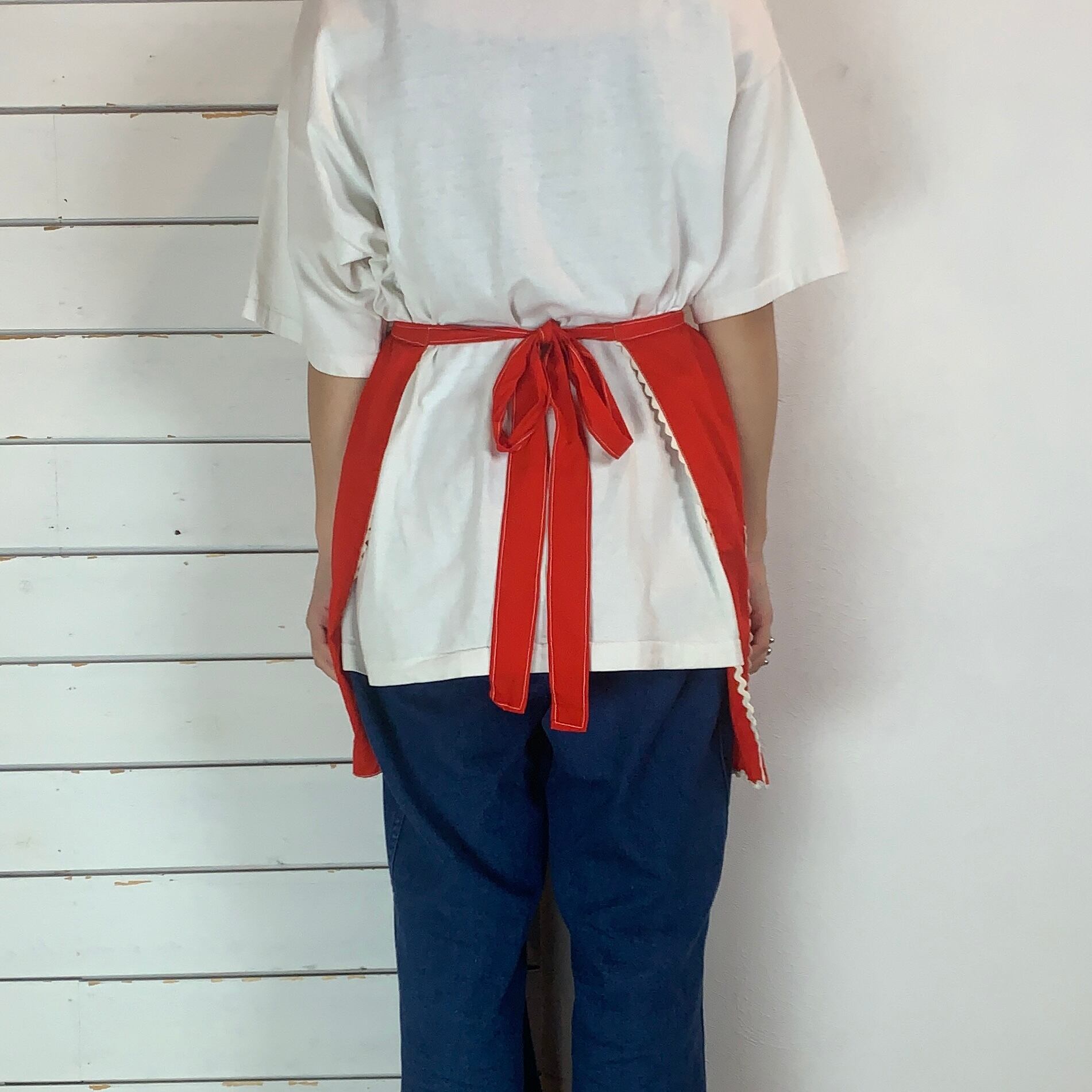 鮮やかな赤に白のお花刺繍が映える前かけエプロン