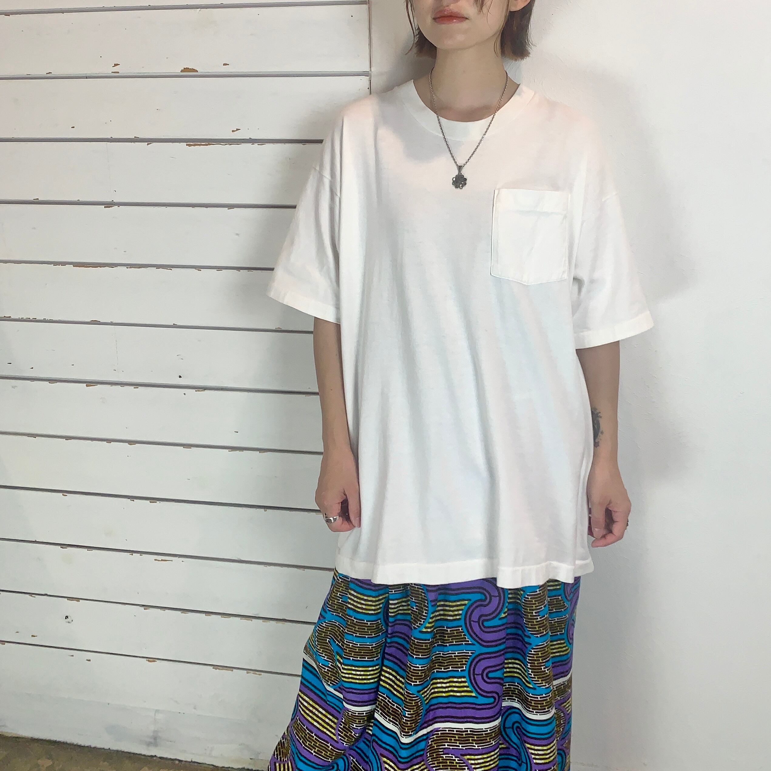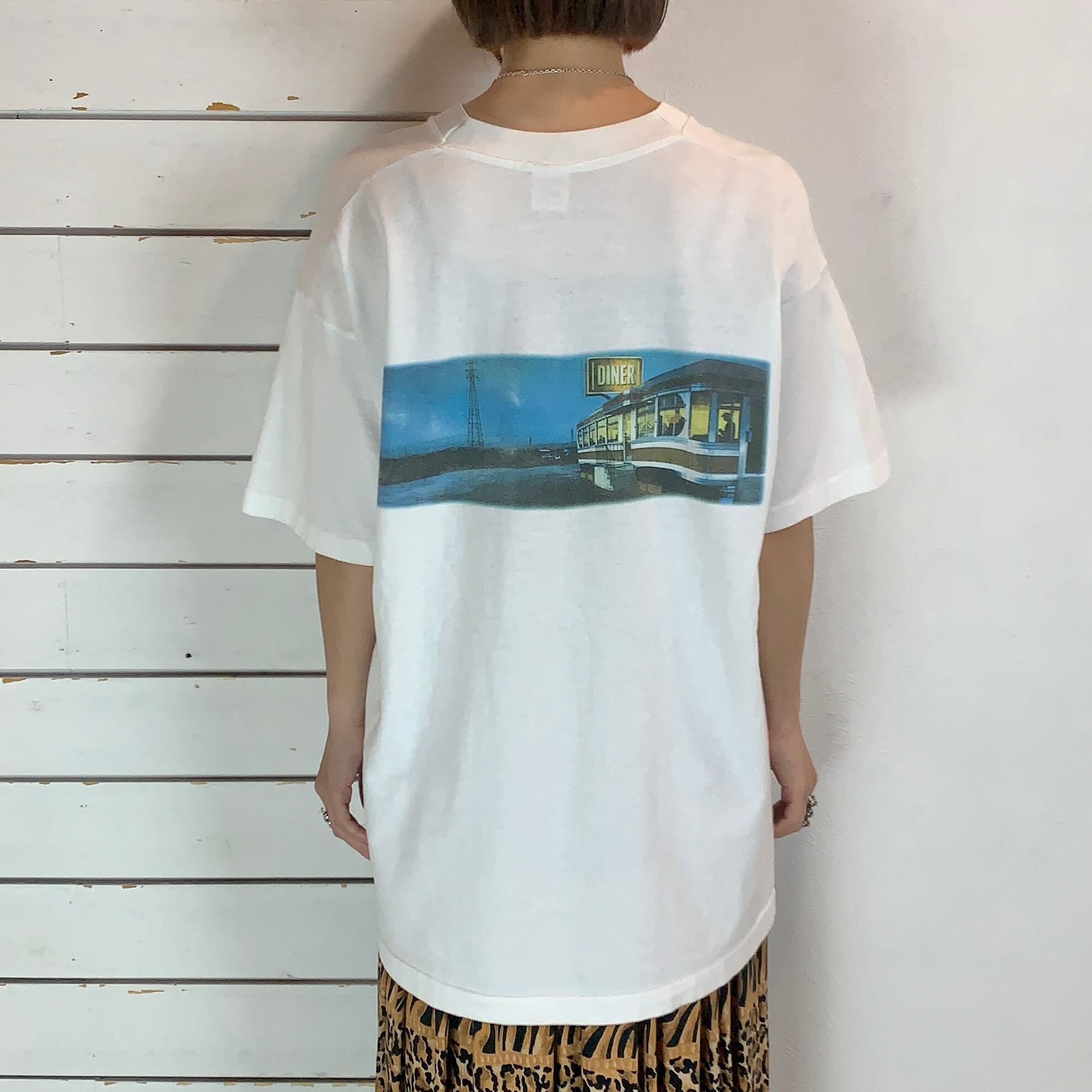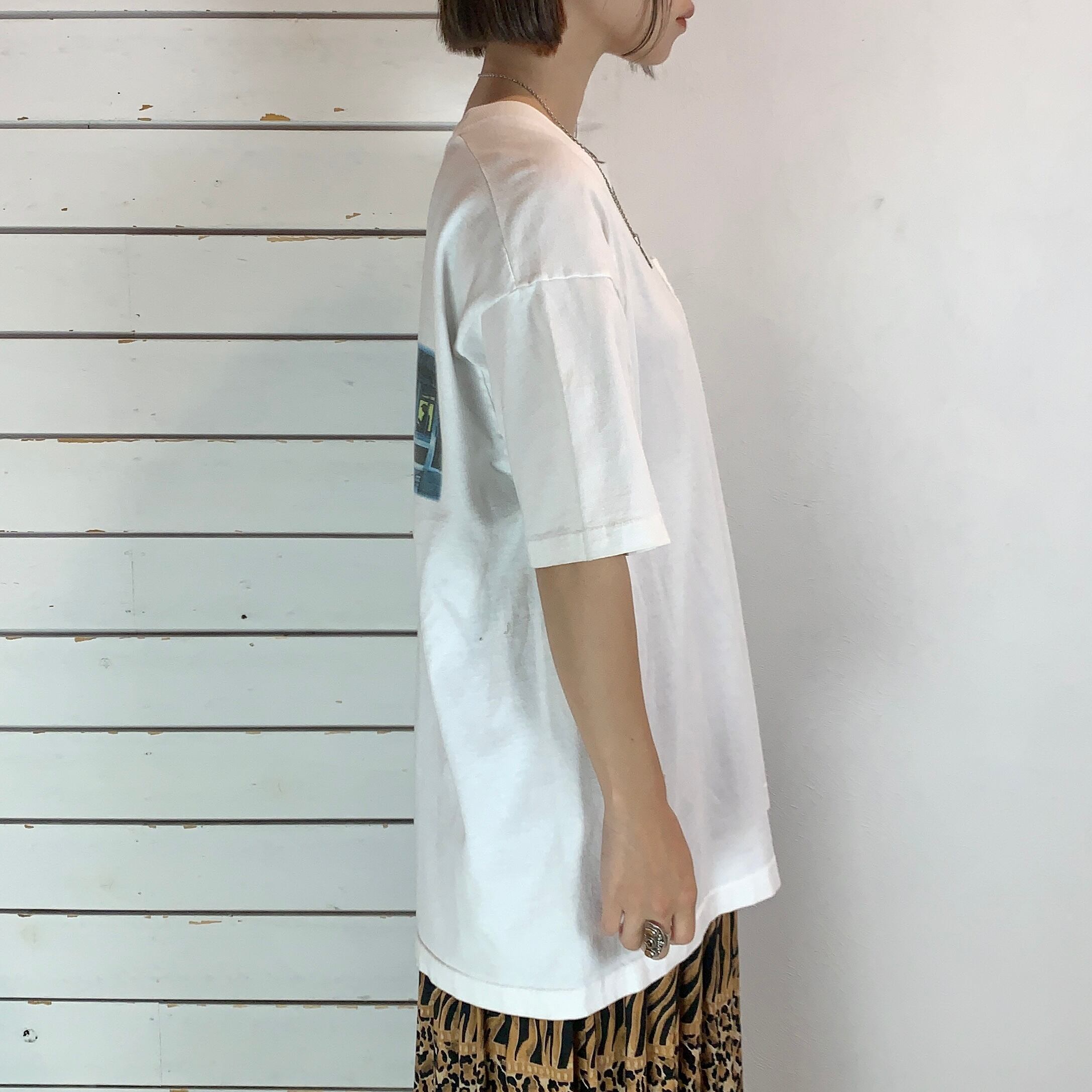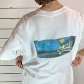 フロントは無地ホワイトのポケT、バックにアートな風景プリント