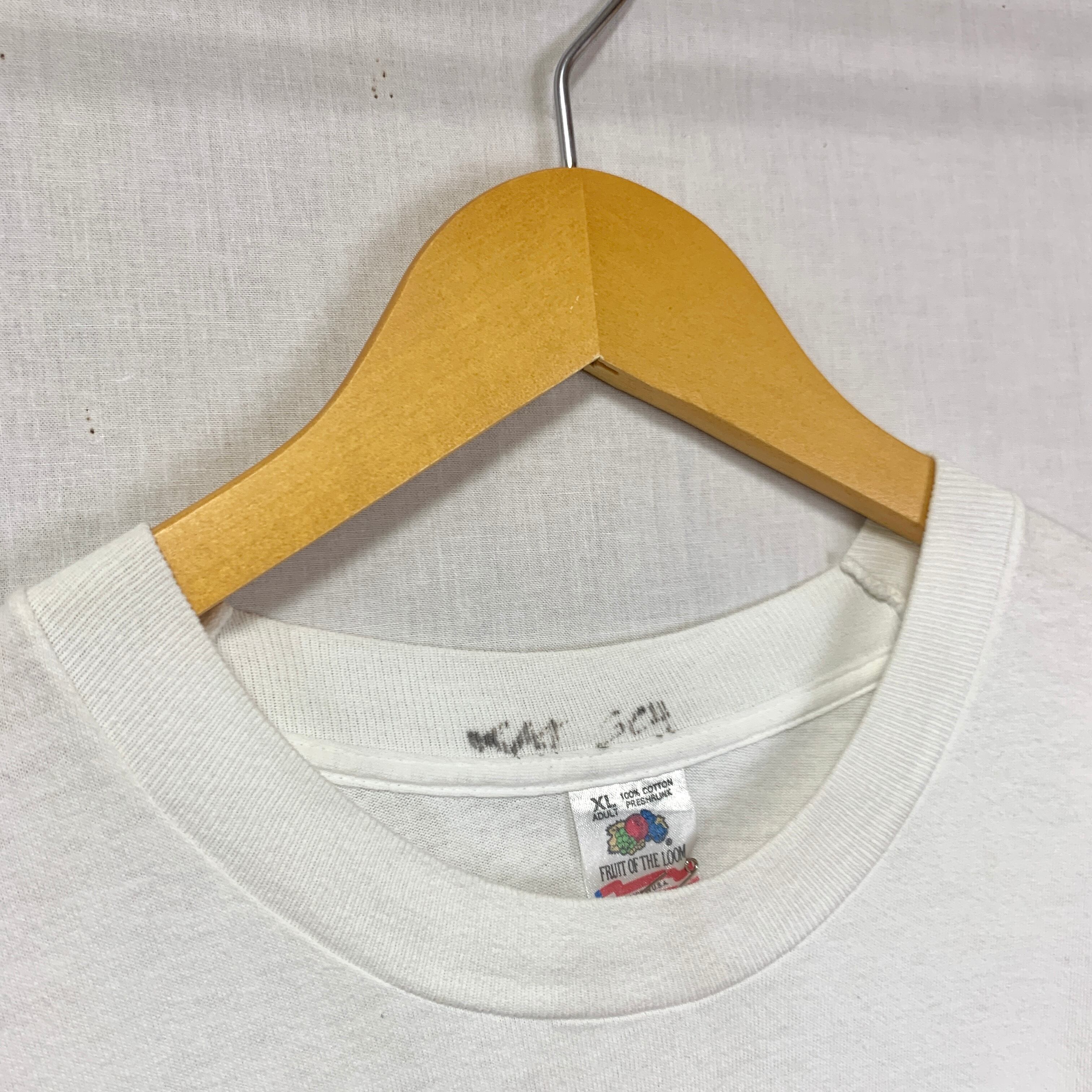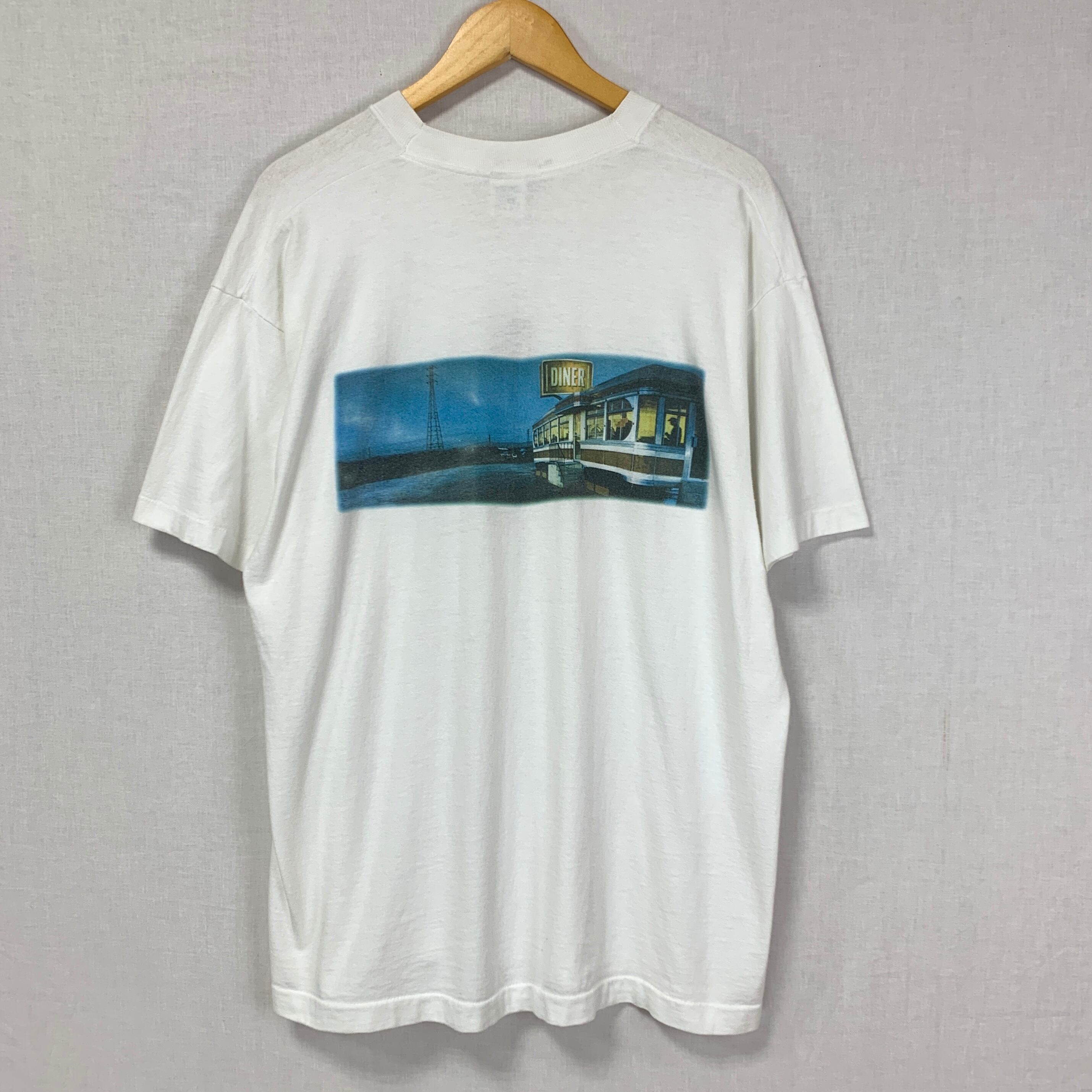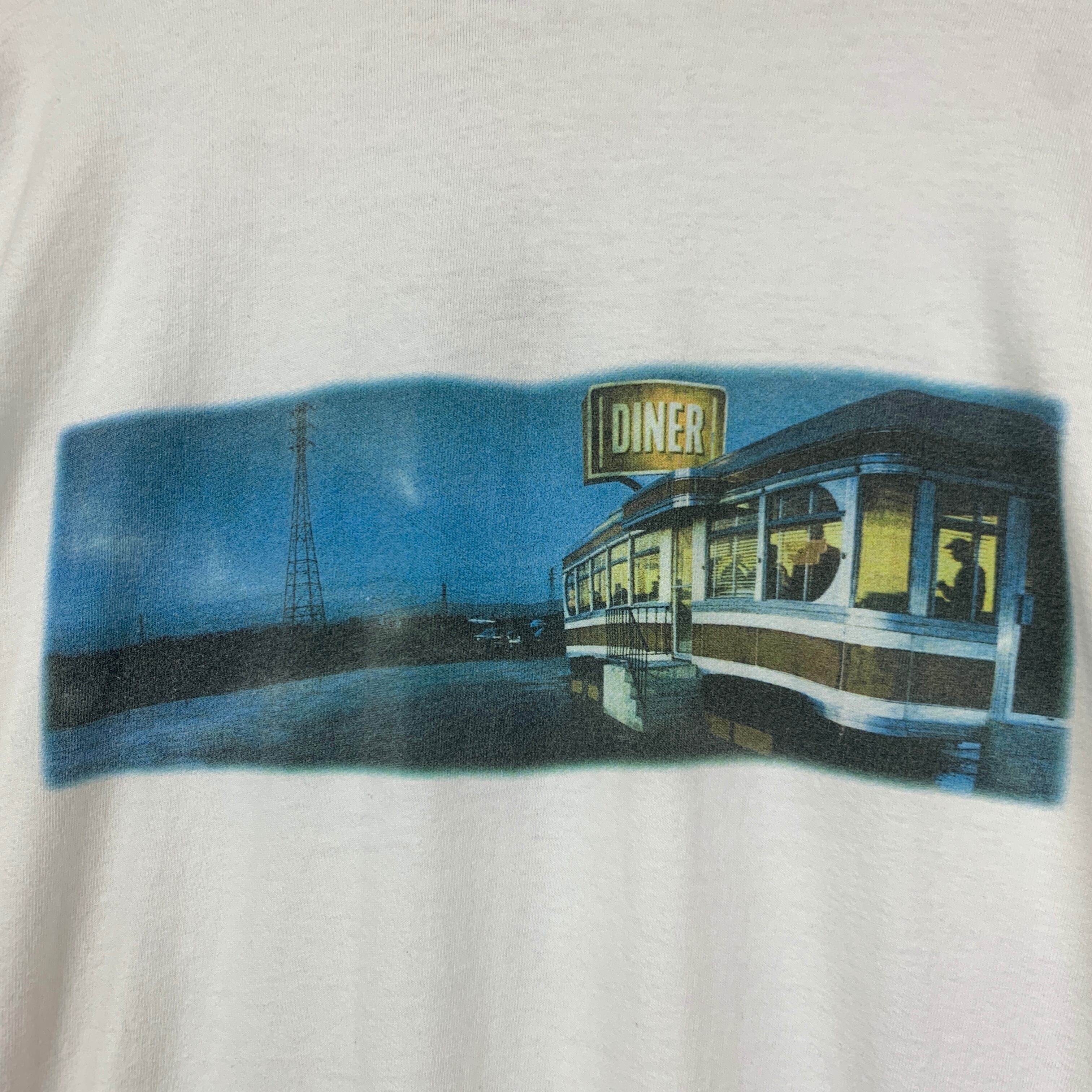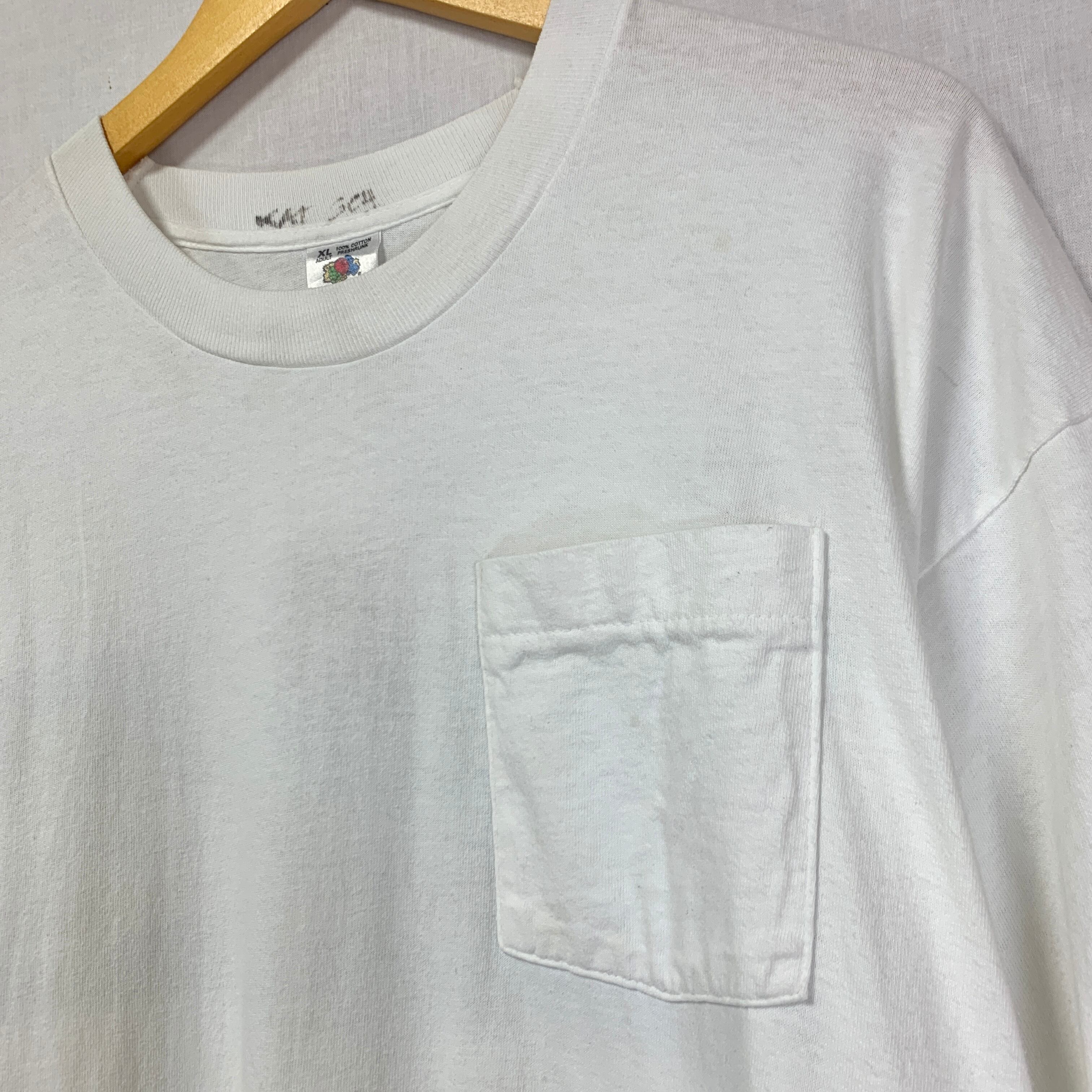フロントは無地ホワイトのポケT、バックにアートな風景プリント