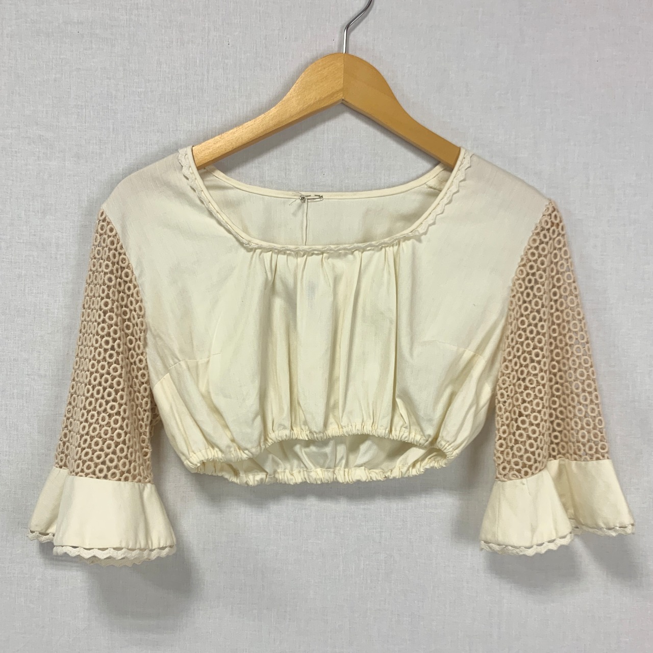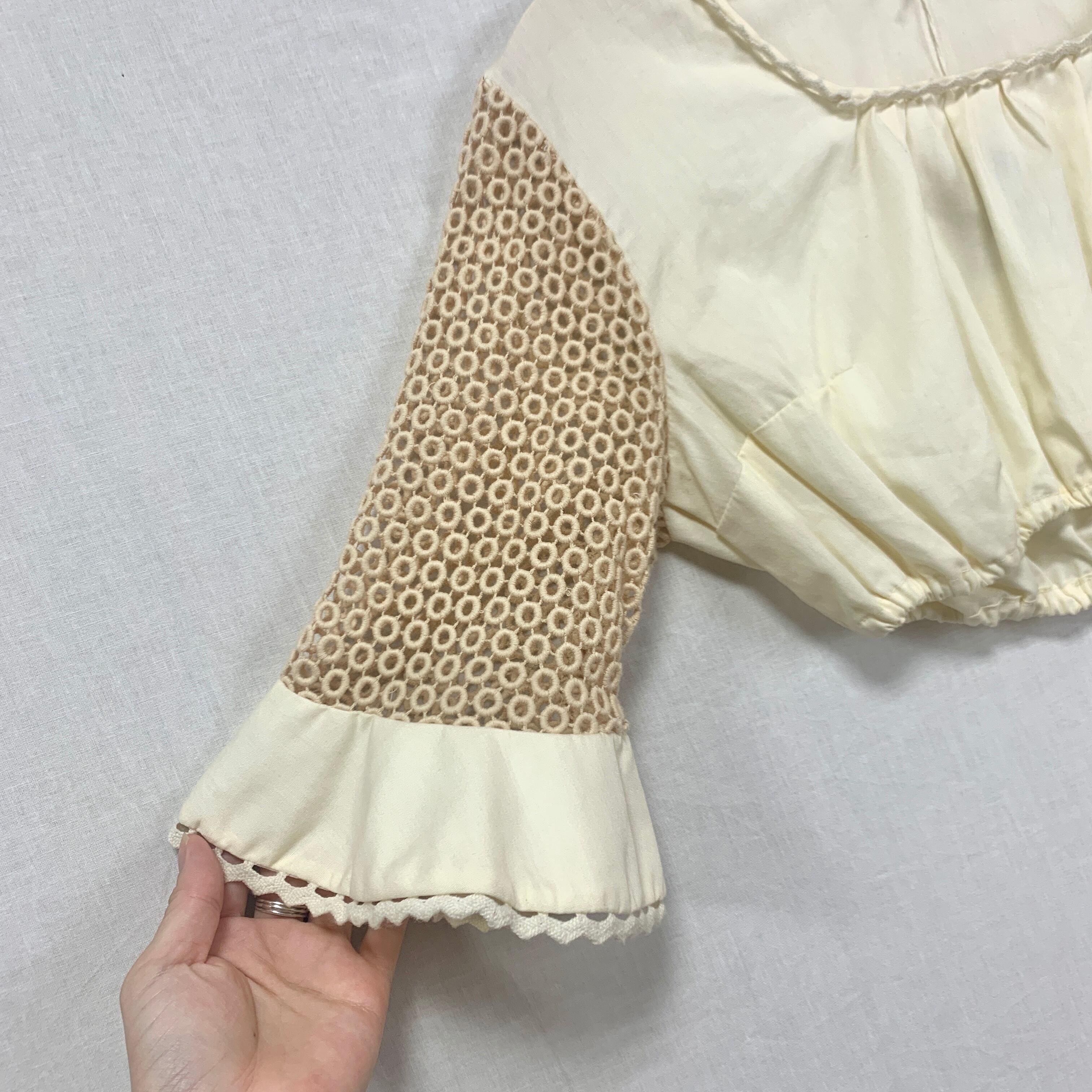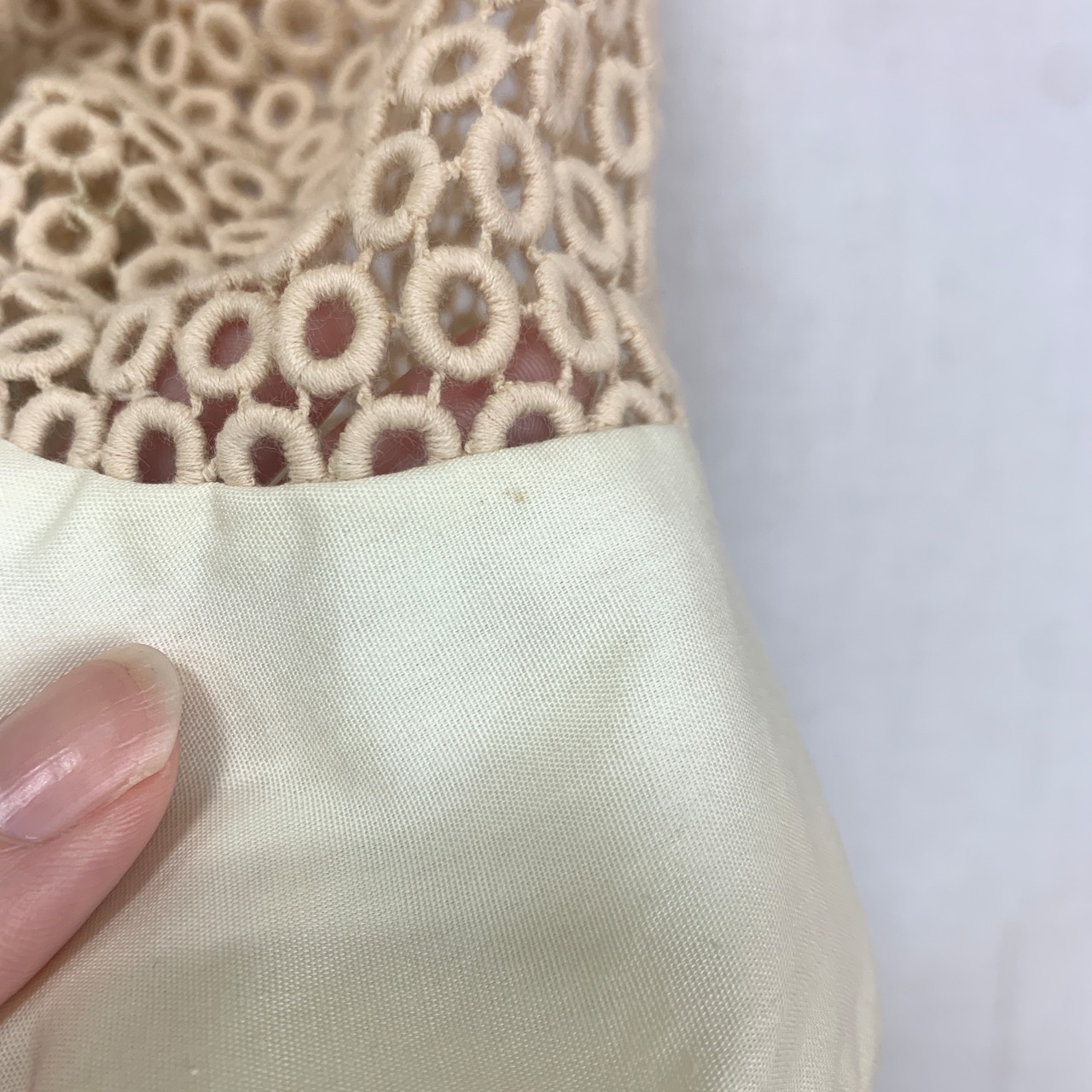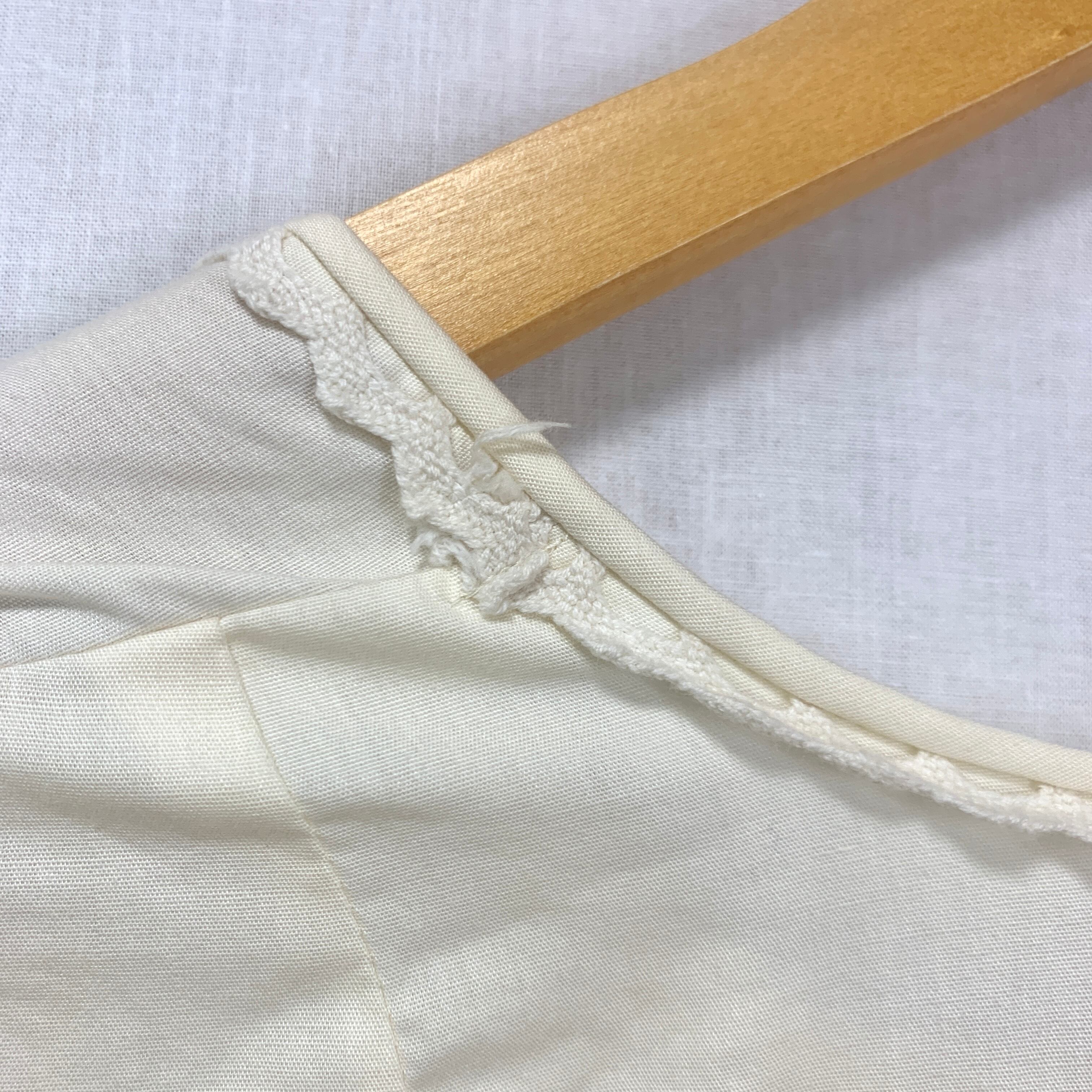 袖付近に若干の汚れ、首まわりのレース部分にほつれがございます。(写真15枚目〜)