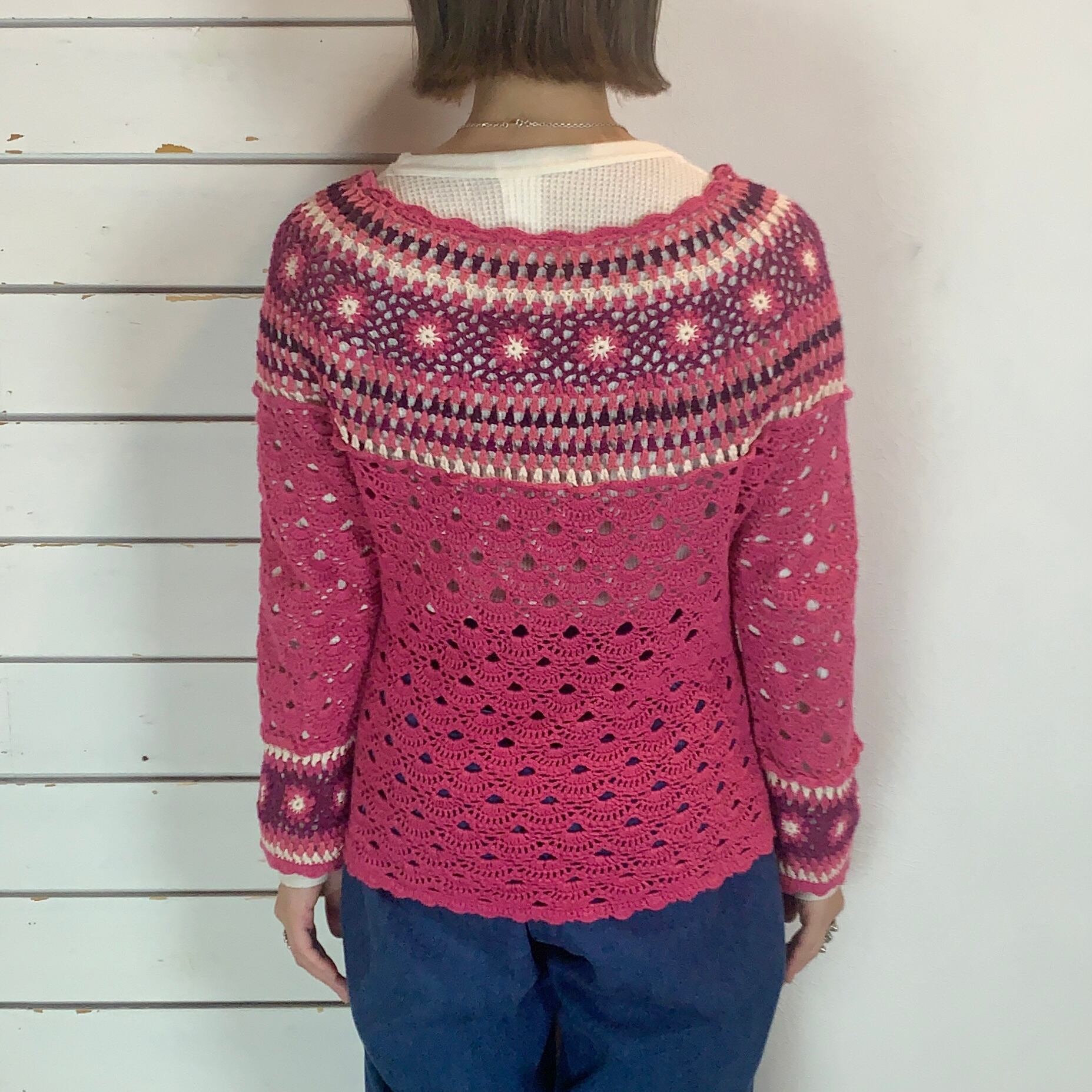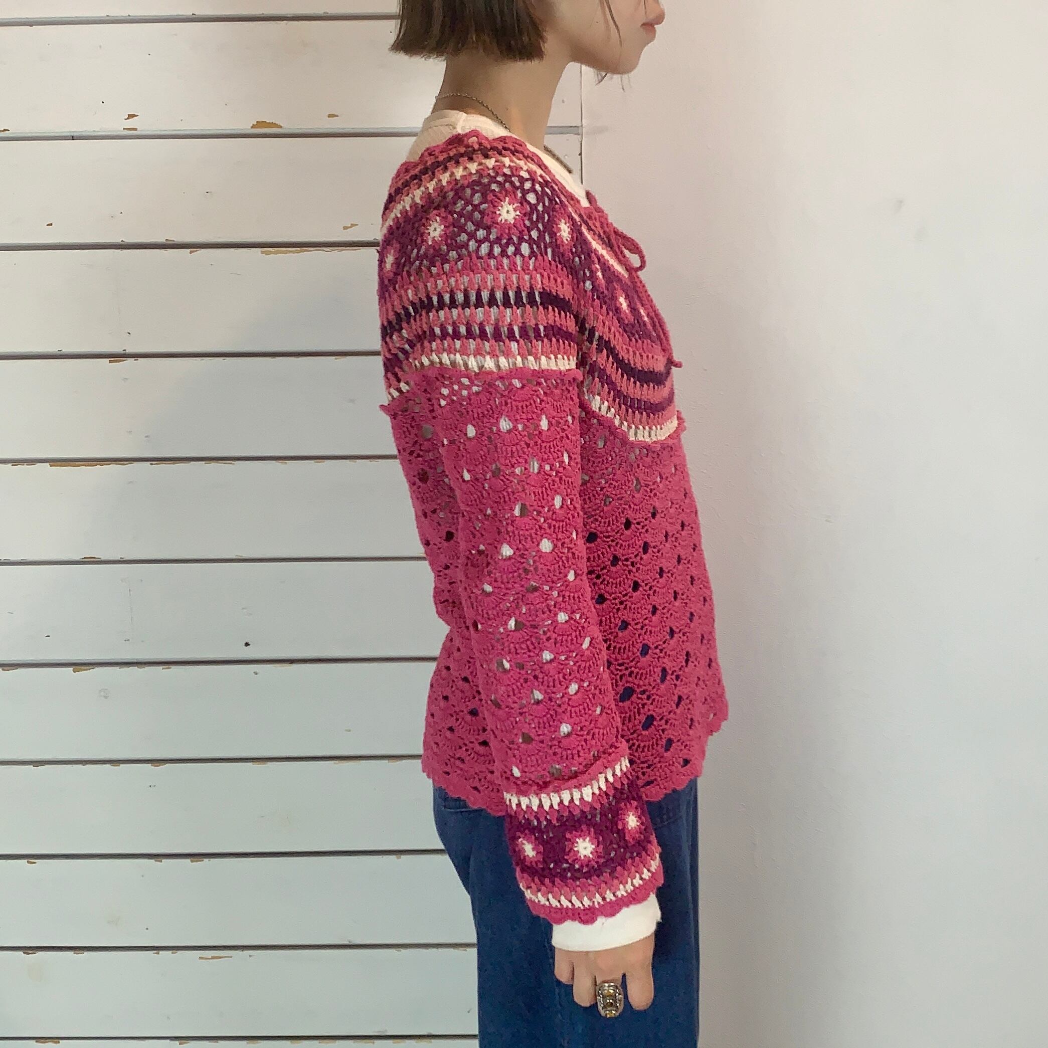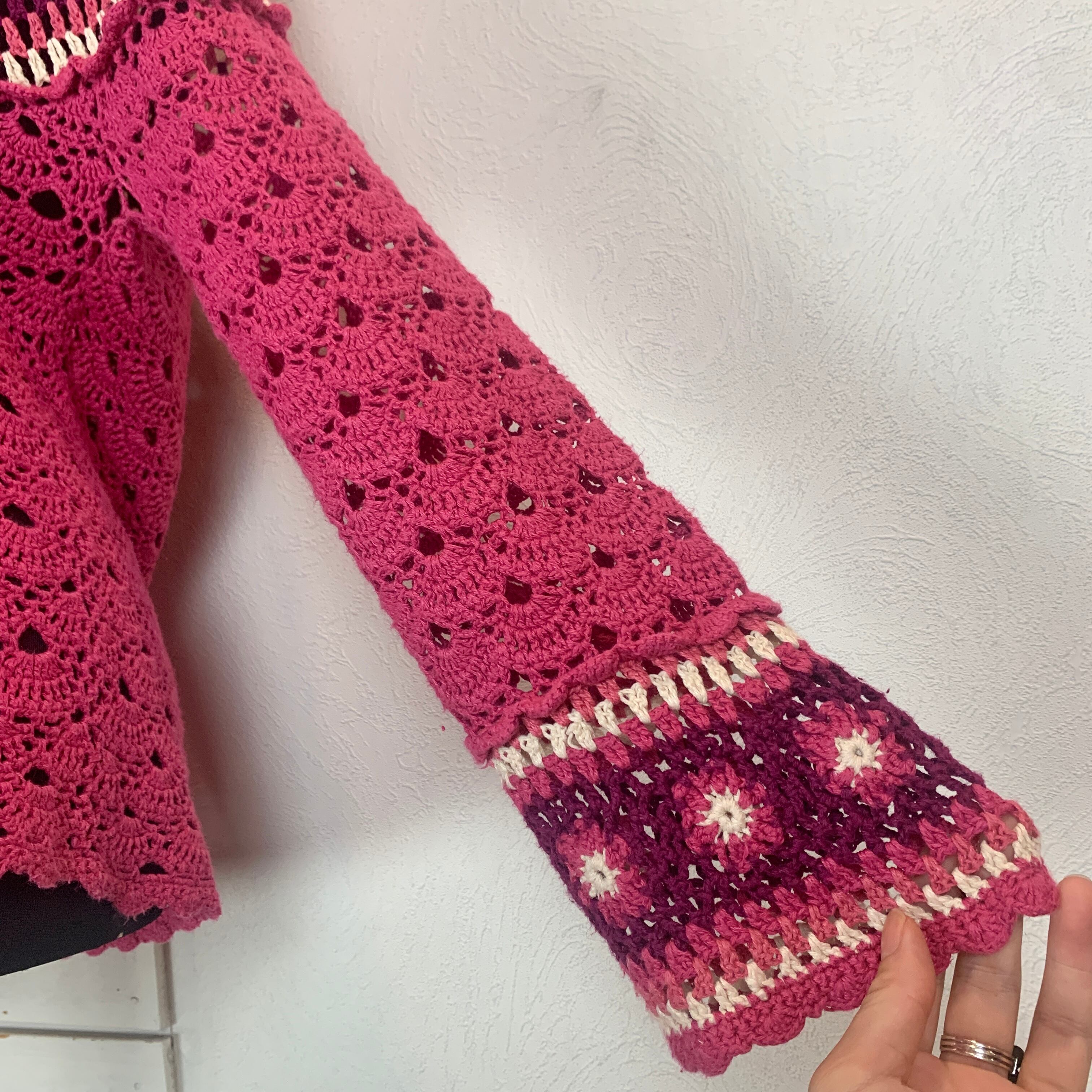 ピンク×パープルで胸元、袖口のお花モチーフがかわいいクロシェニット