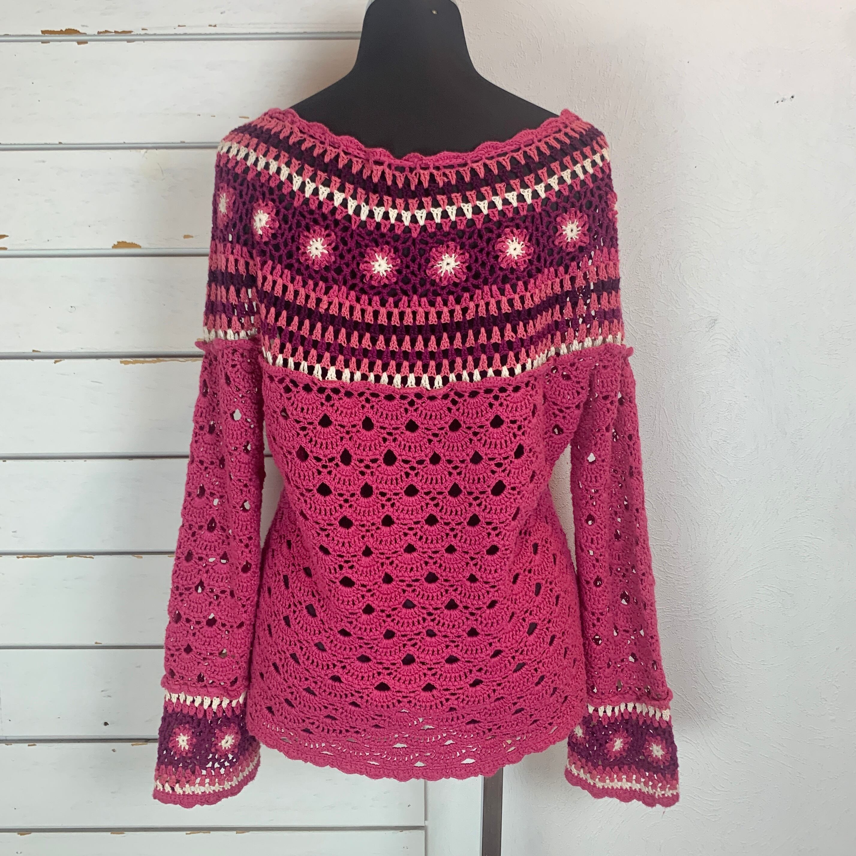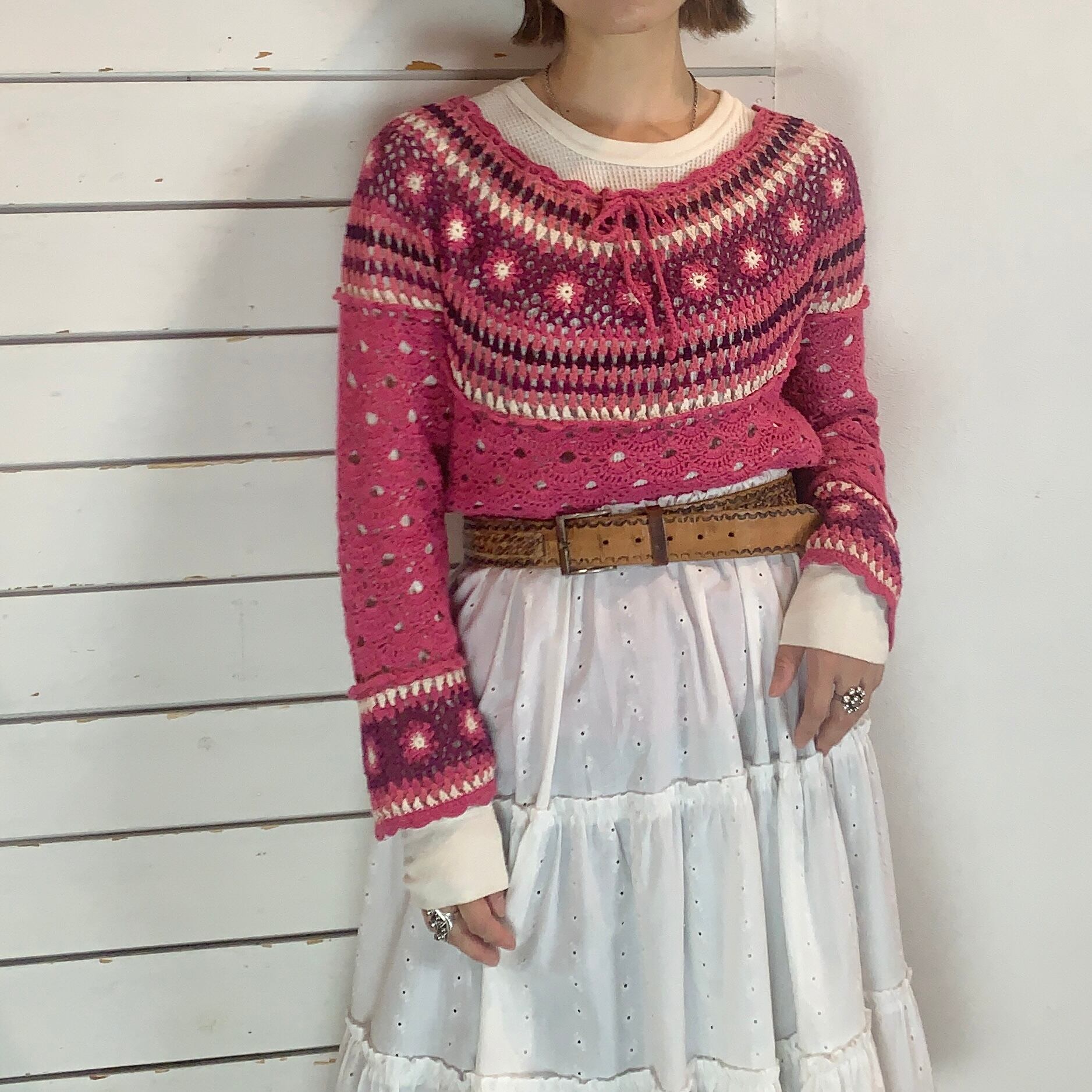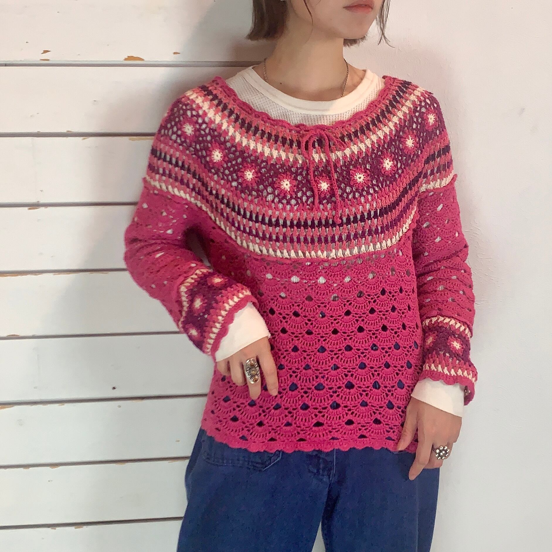 ピンク×パープルで胸元、袖口のお花モチーフがかわいいクロシェニット