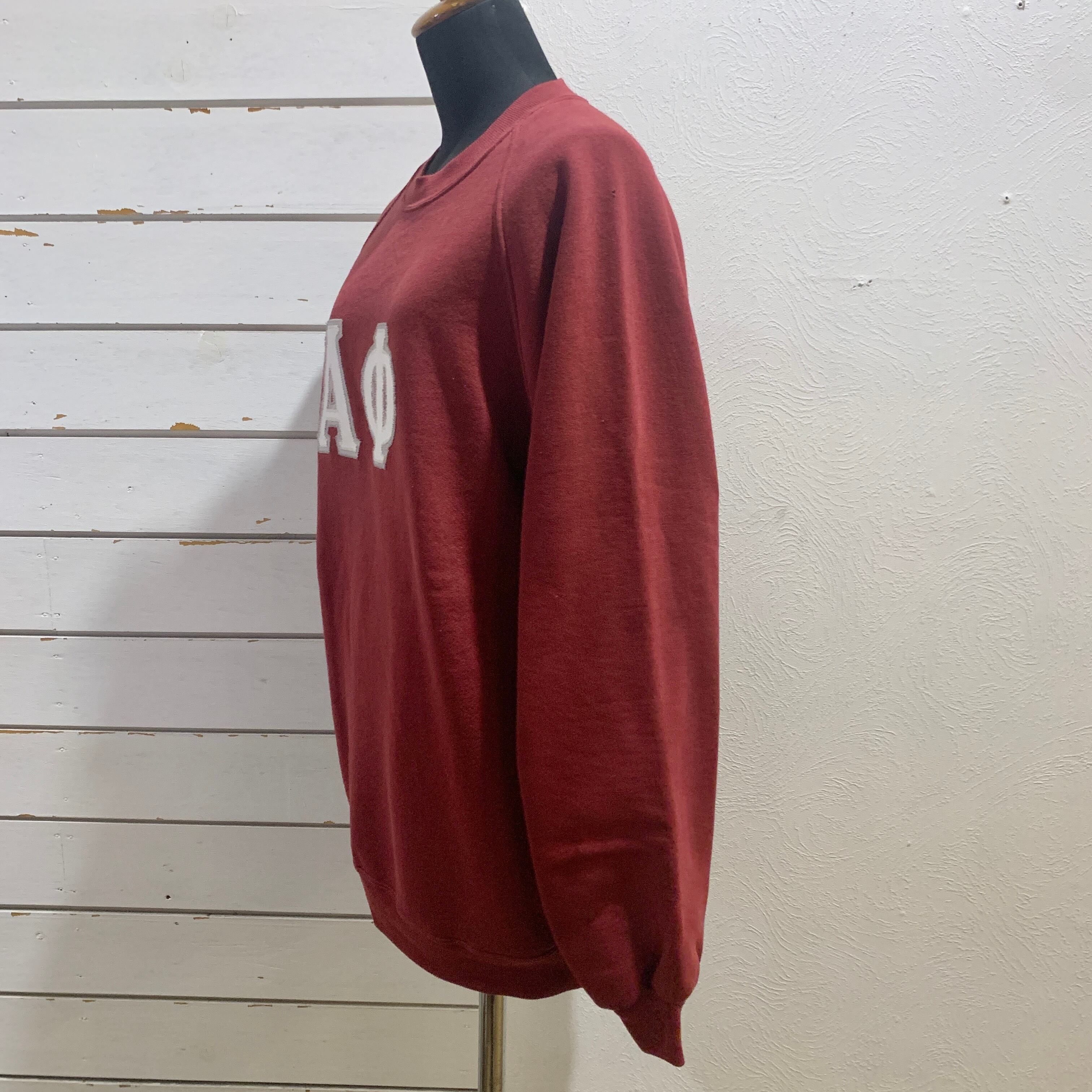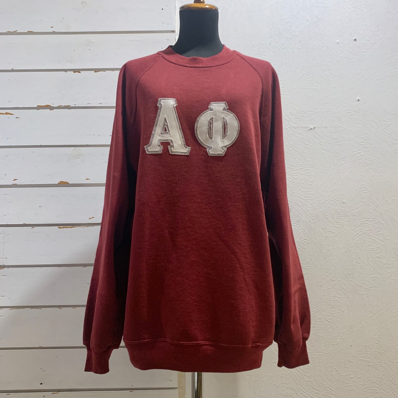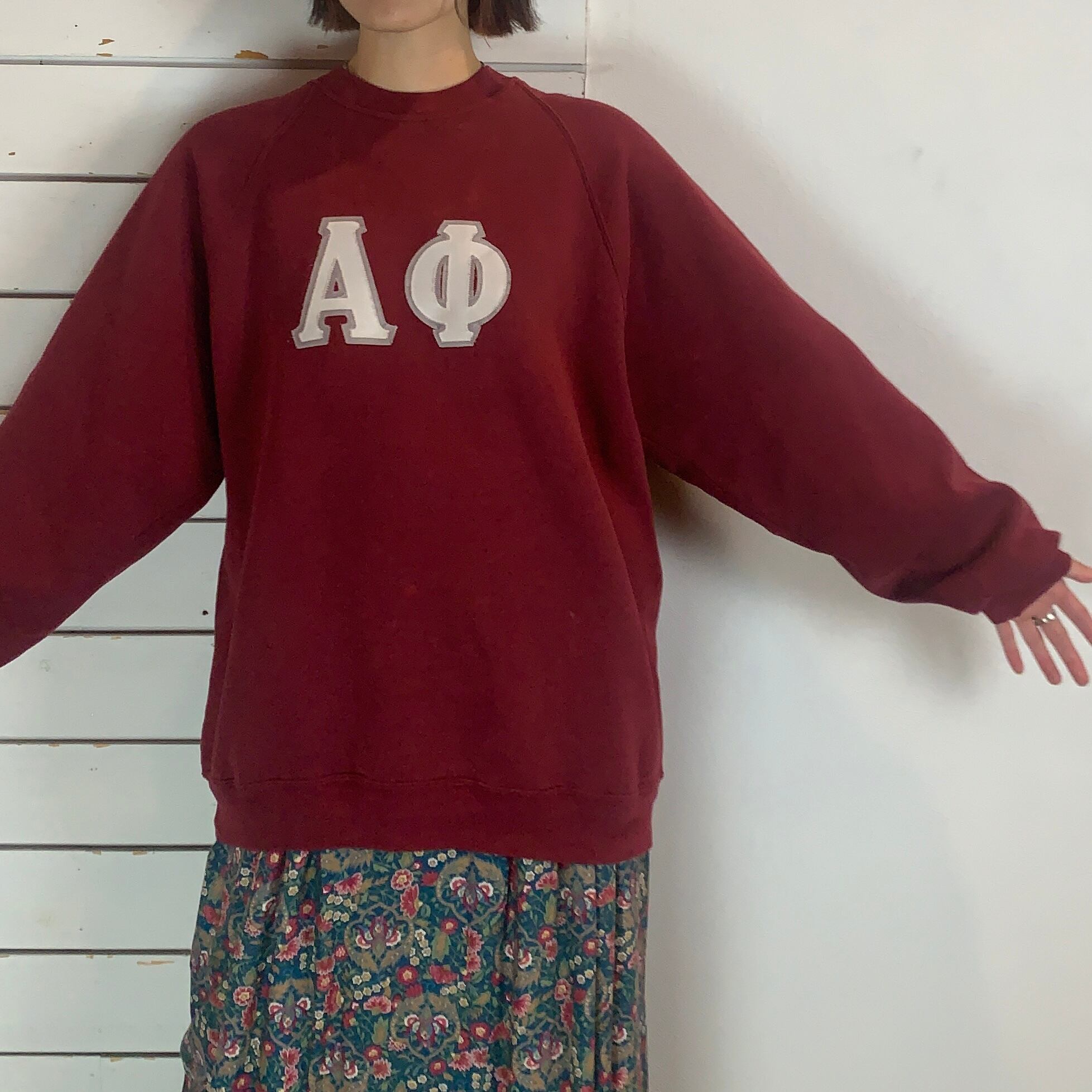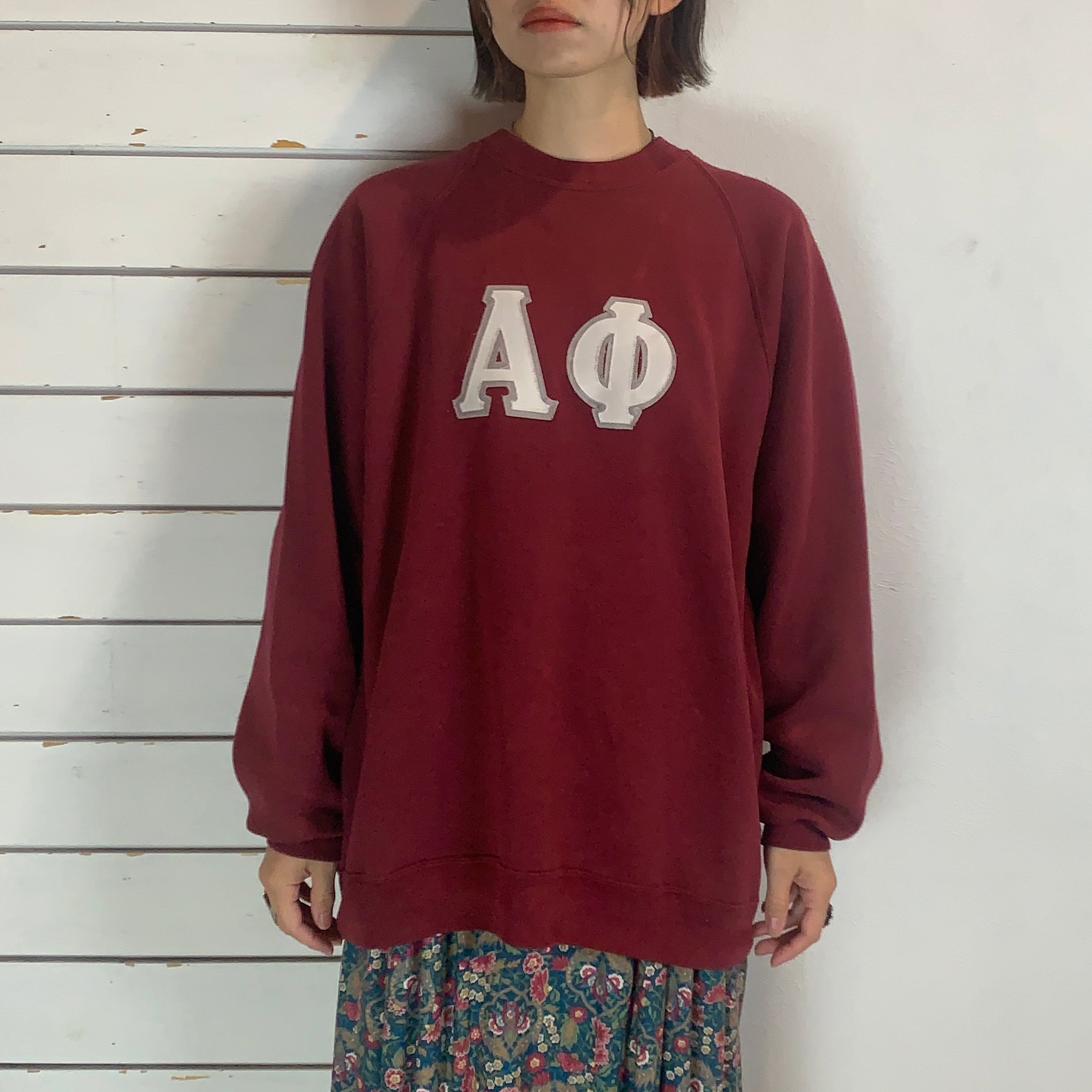 秋冬らしいワインレッドカラーにギリシャ文字のパッチがついたスウェット