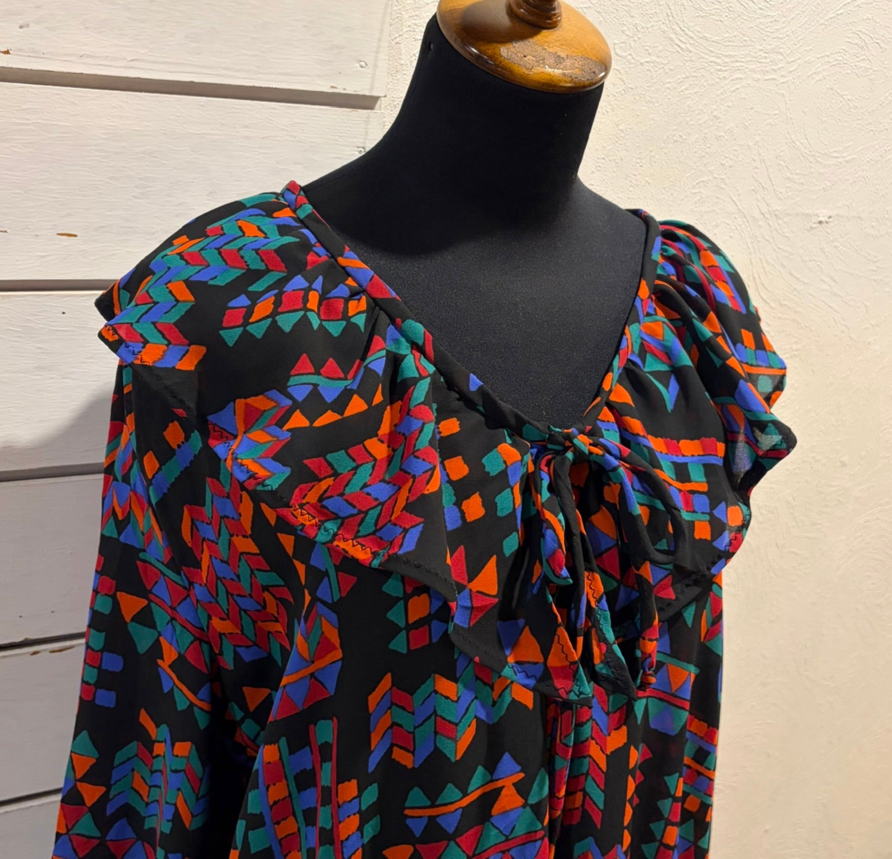 ブラックベースにビビッドでカラフルな三角四角柄のワンピース