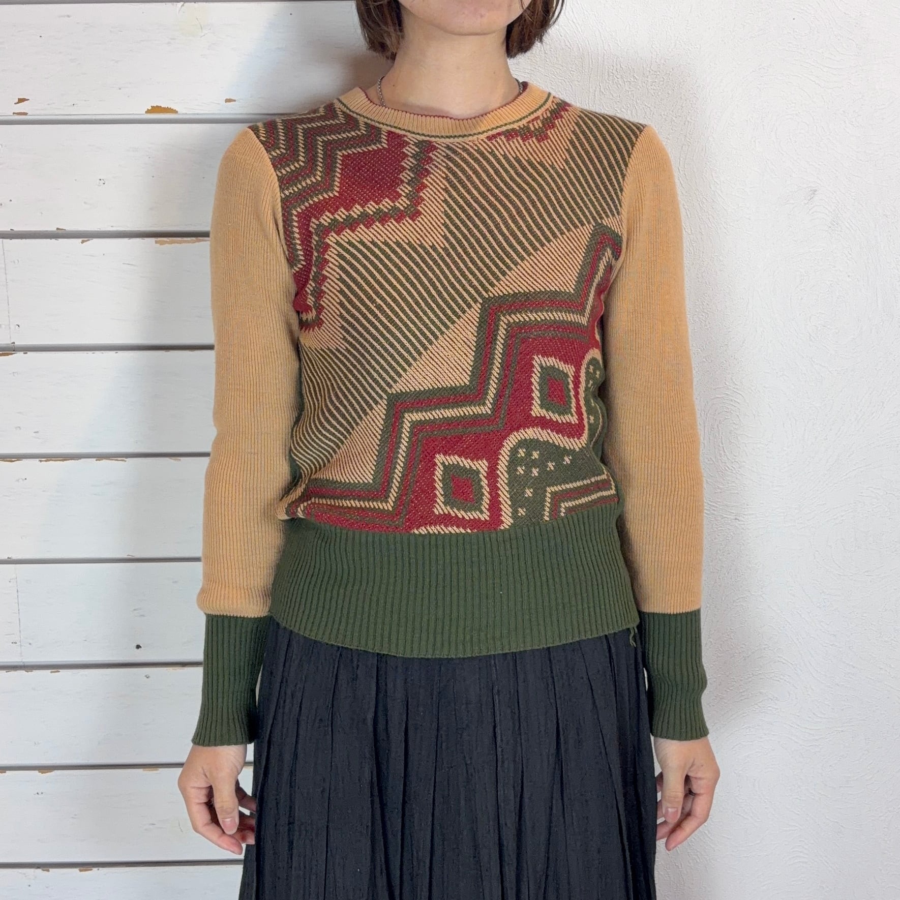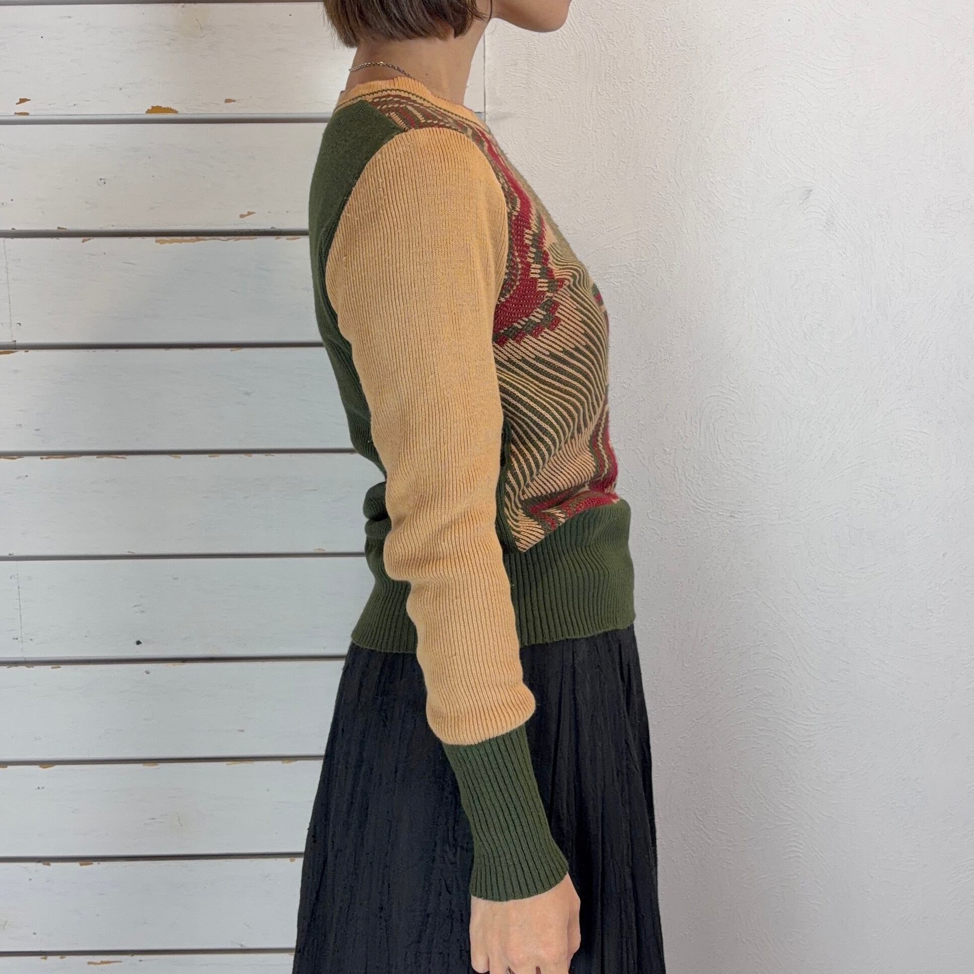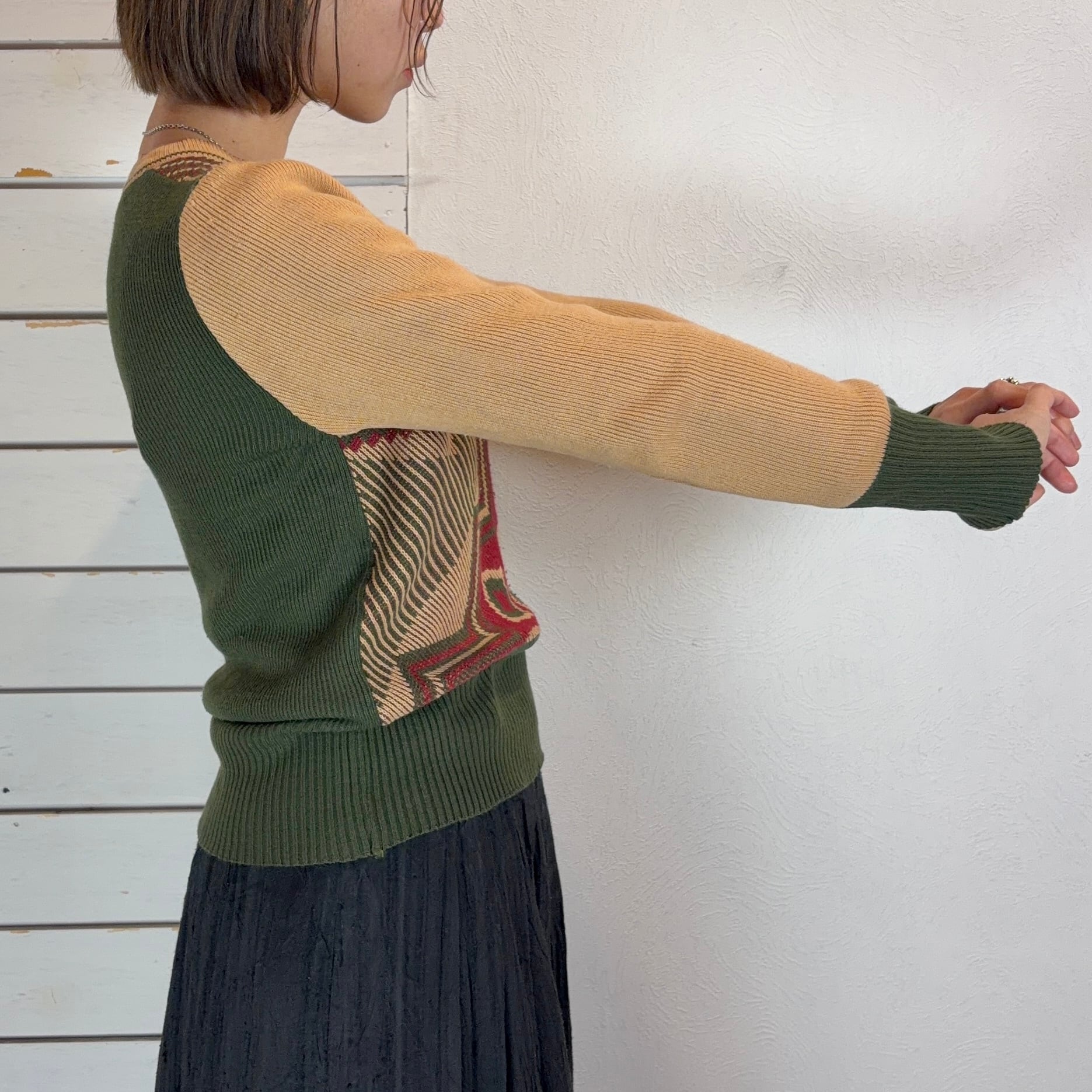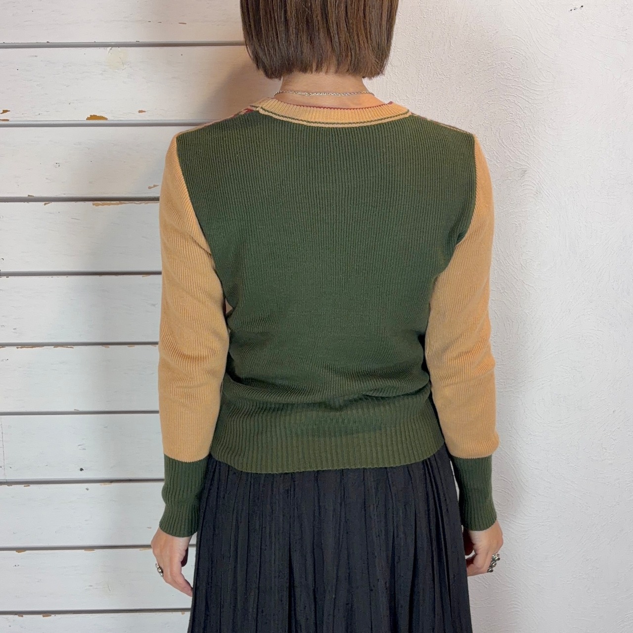 表面はジオメトリックな柄、バックは抹茶一色のレトロニット