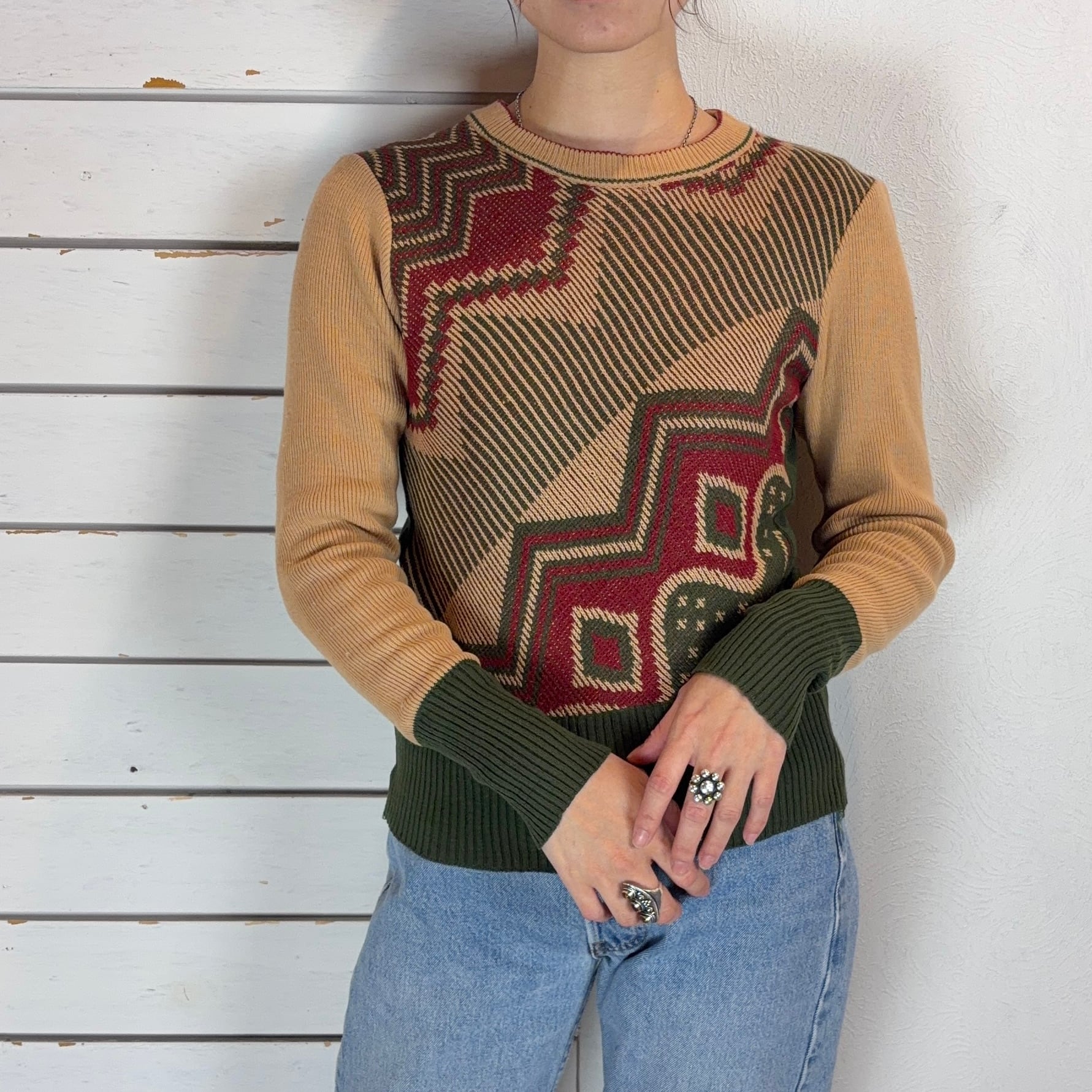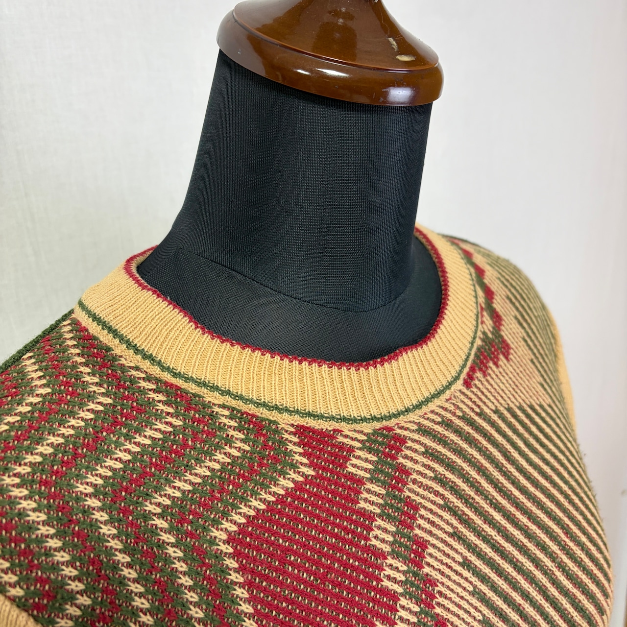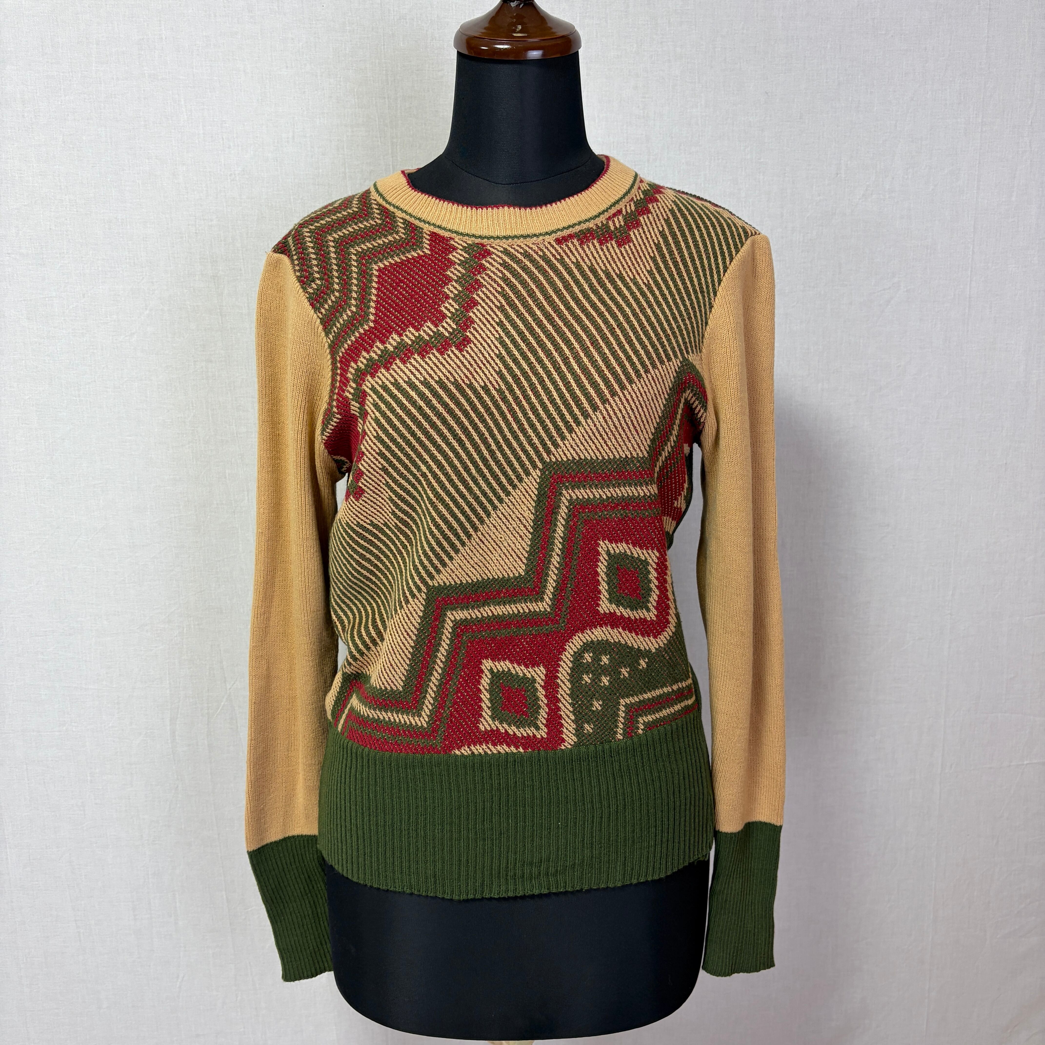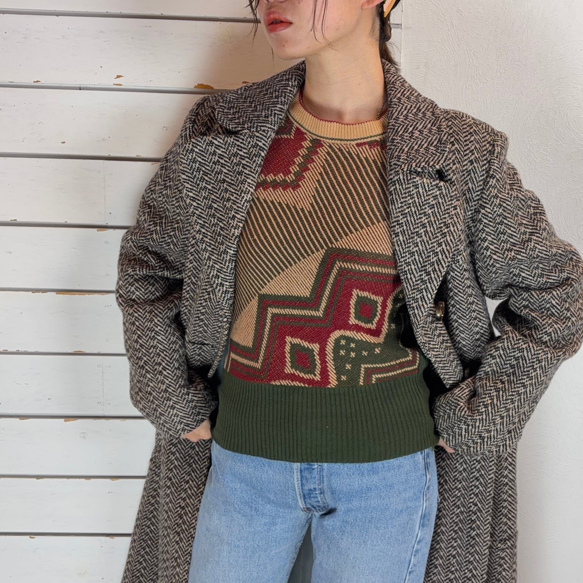 表面はジオメトリックな柄、バックは抹茶一色のレトロニット