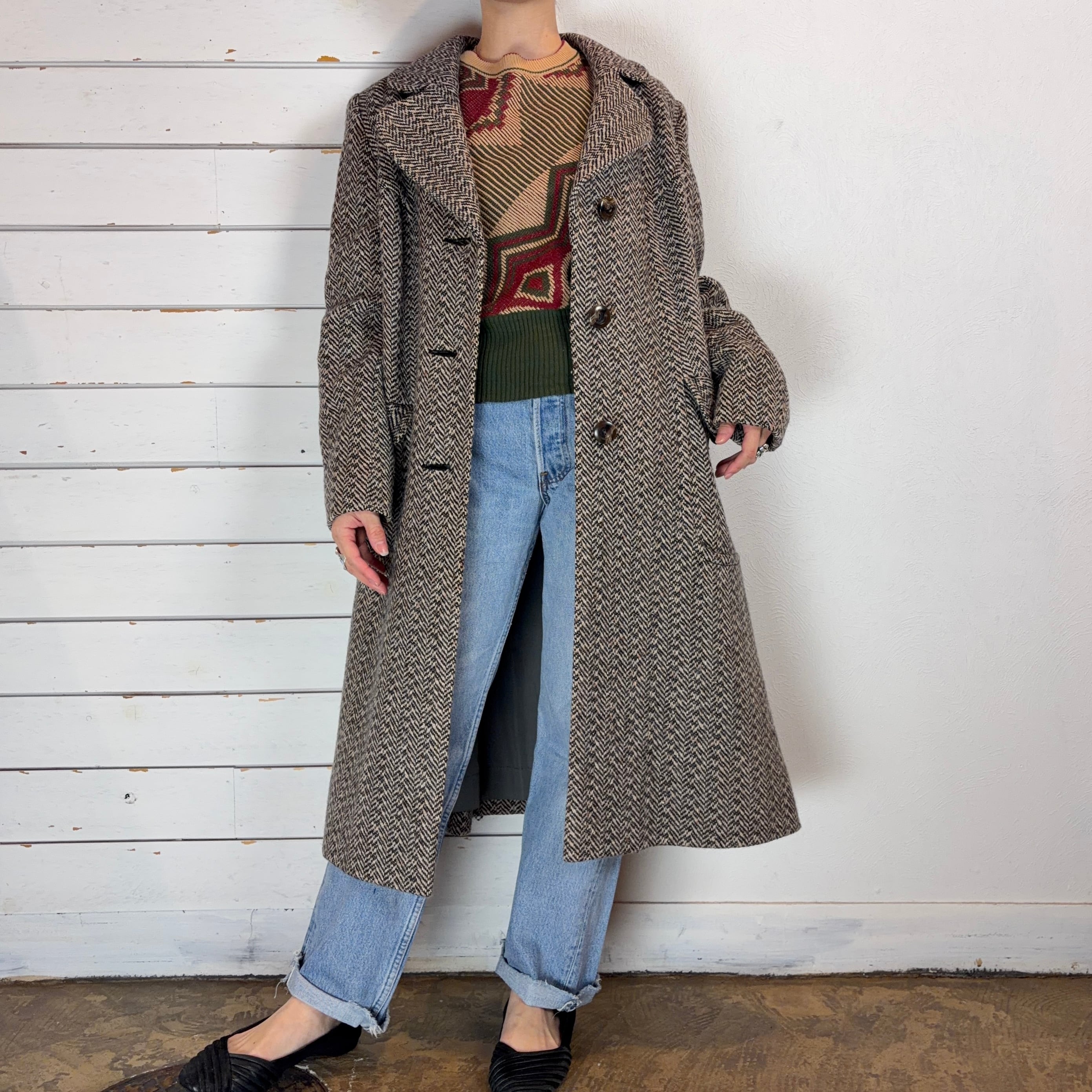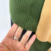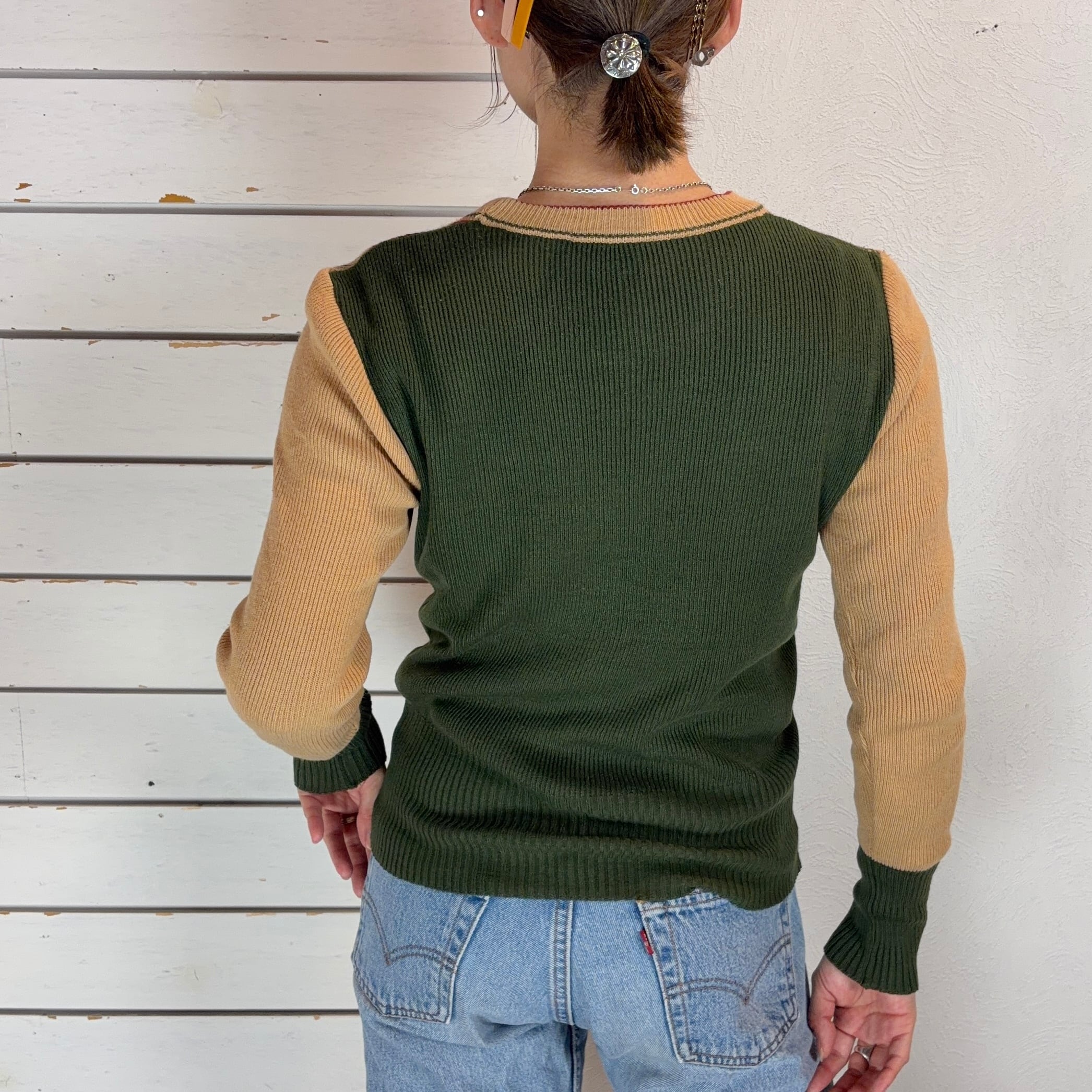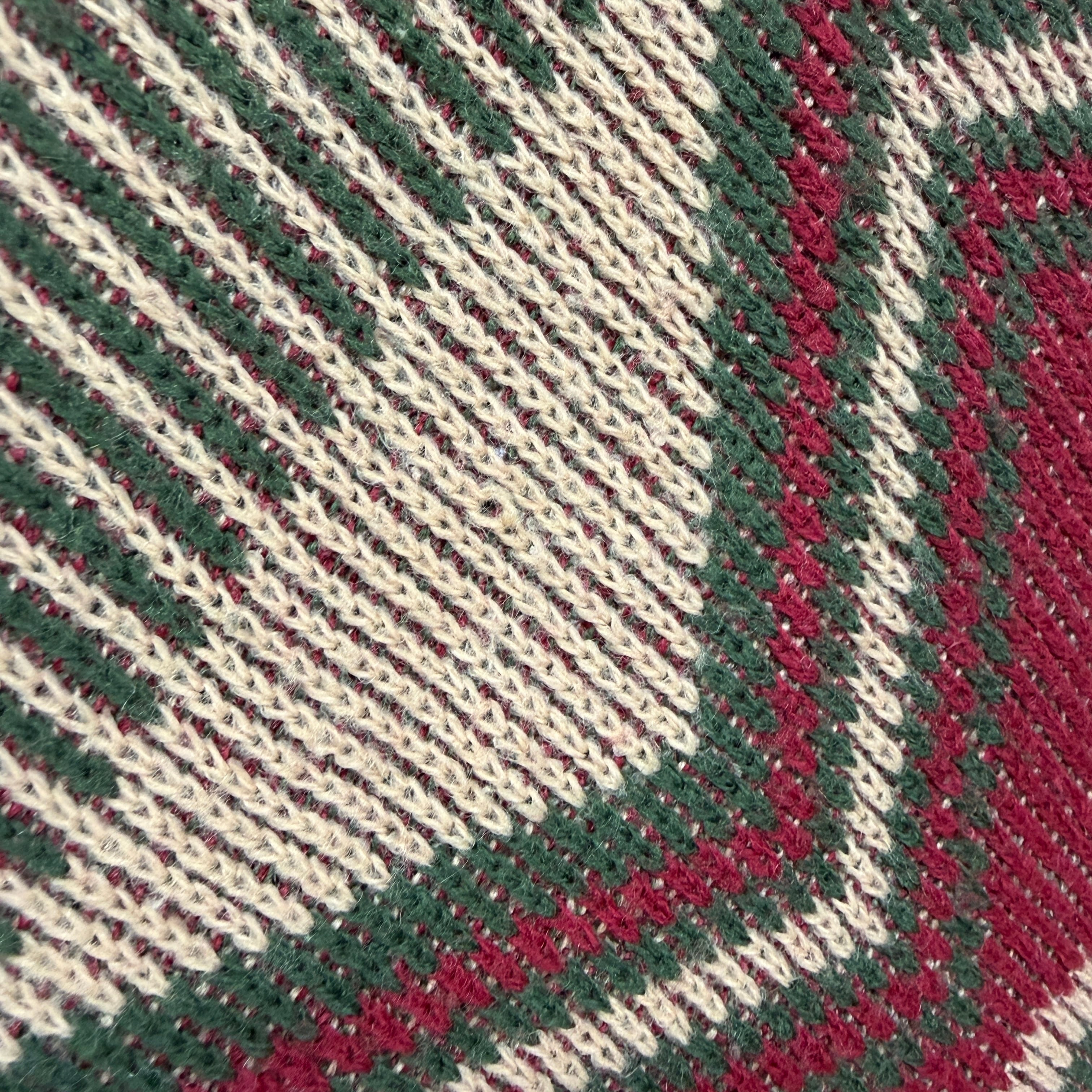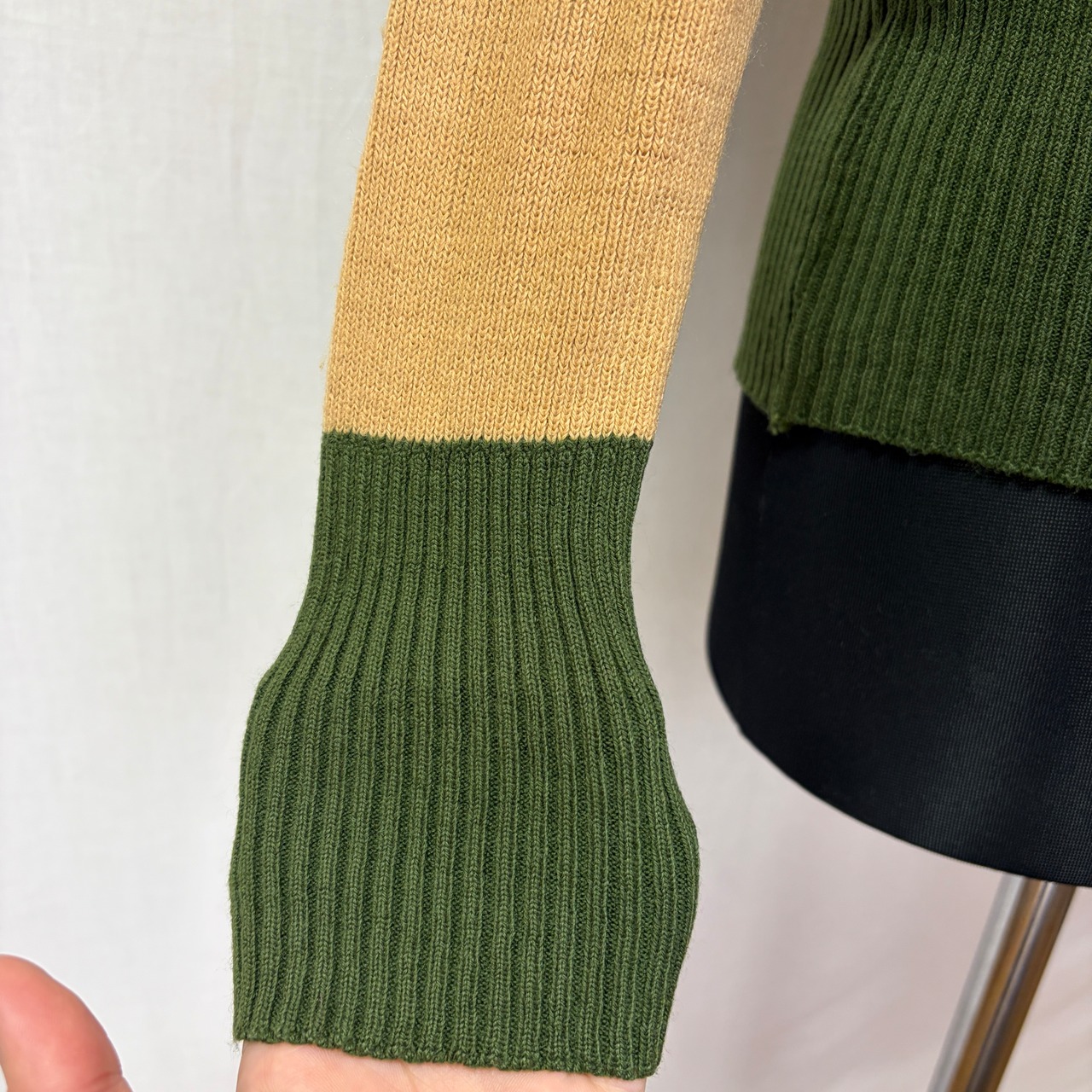 表面はジオメトリックな柄、バックは抹茶一色のレトロニット