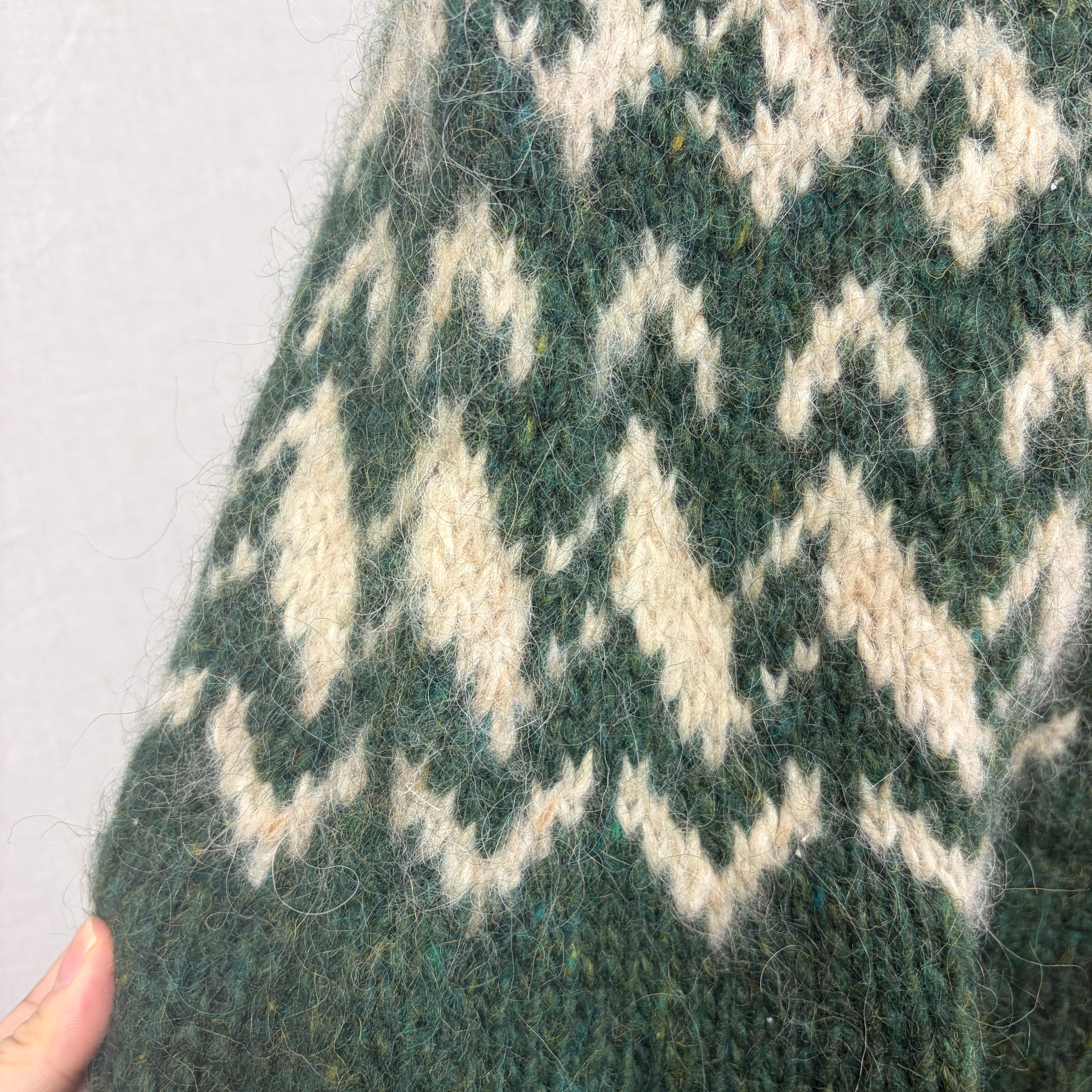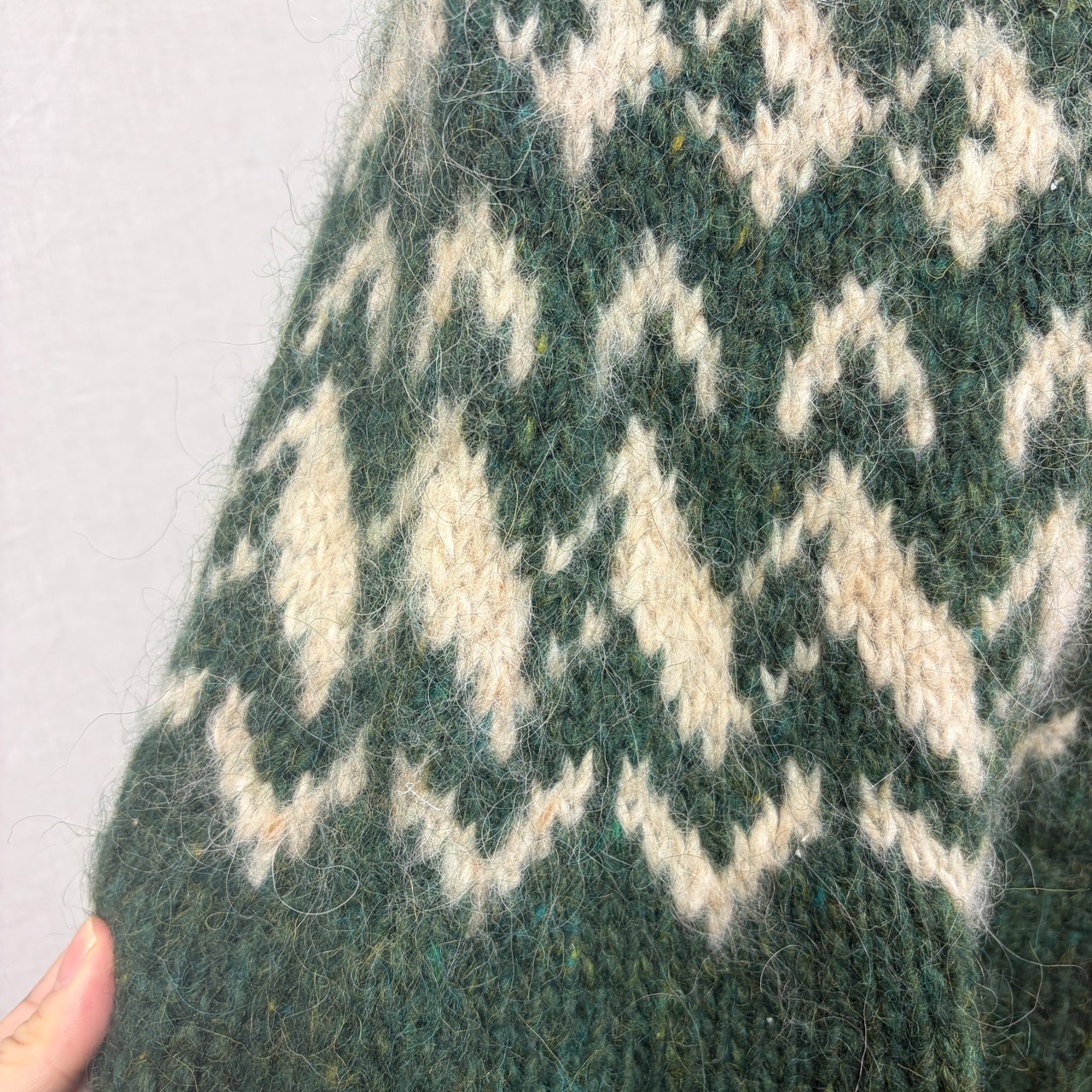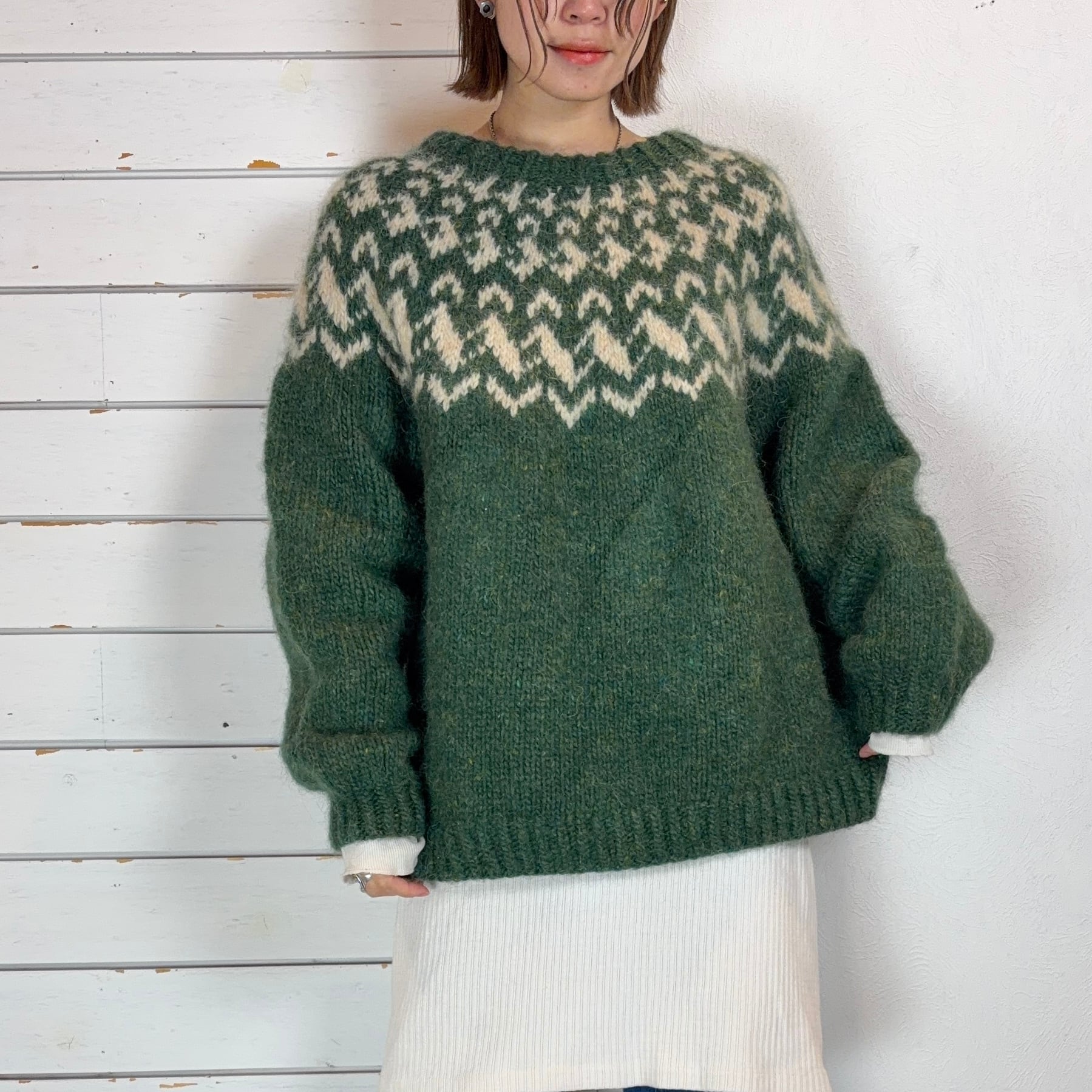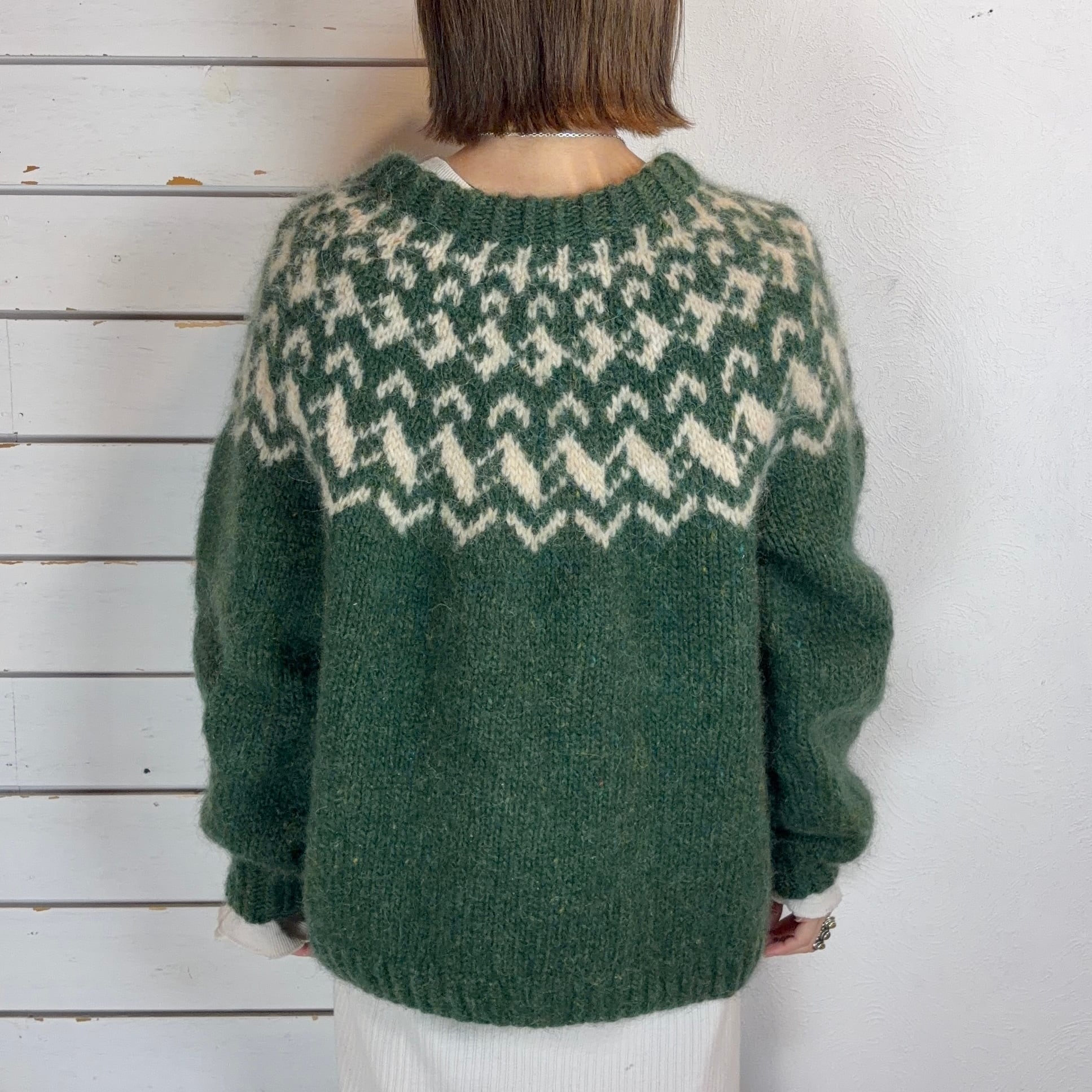 差し色にも最適な落ち着いたグリーンのフェアアイル柄ニット