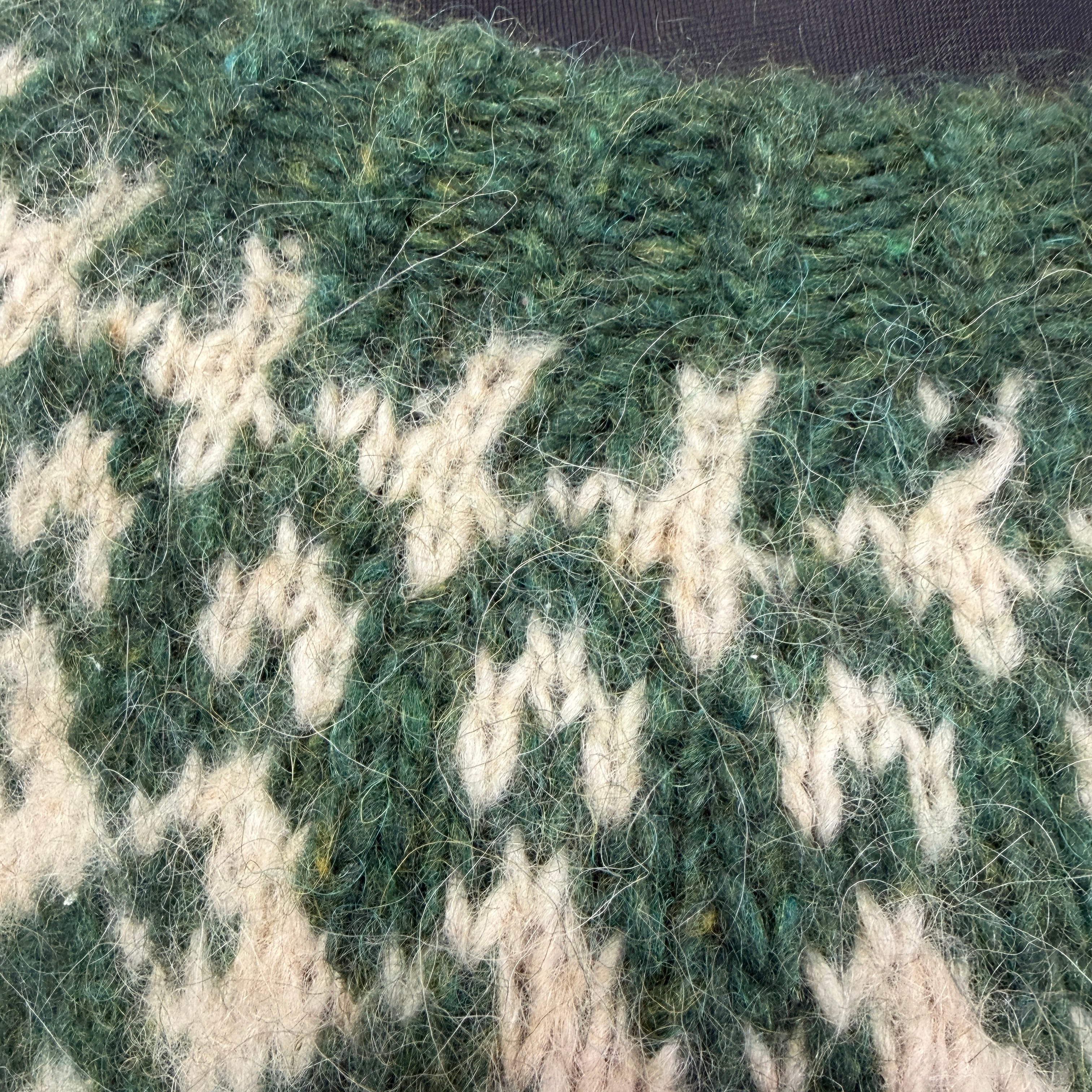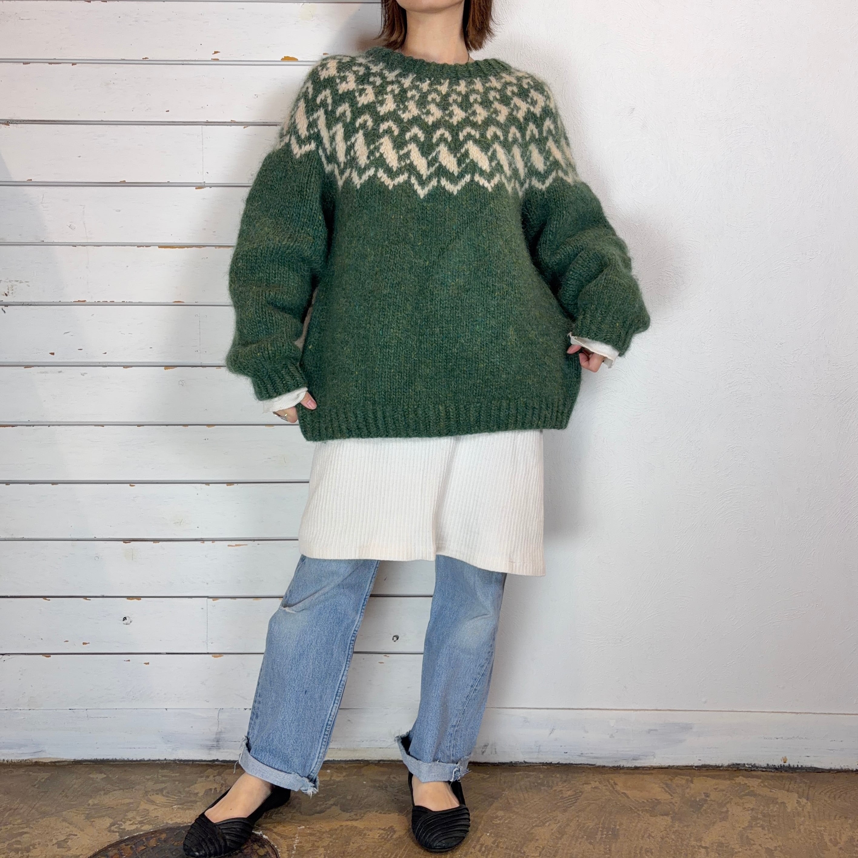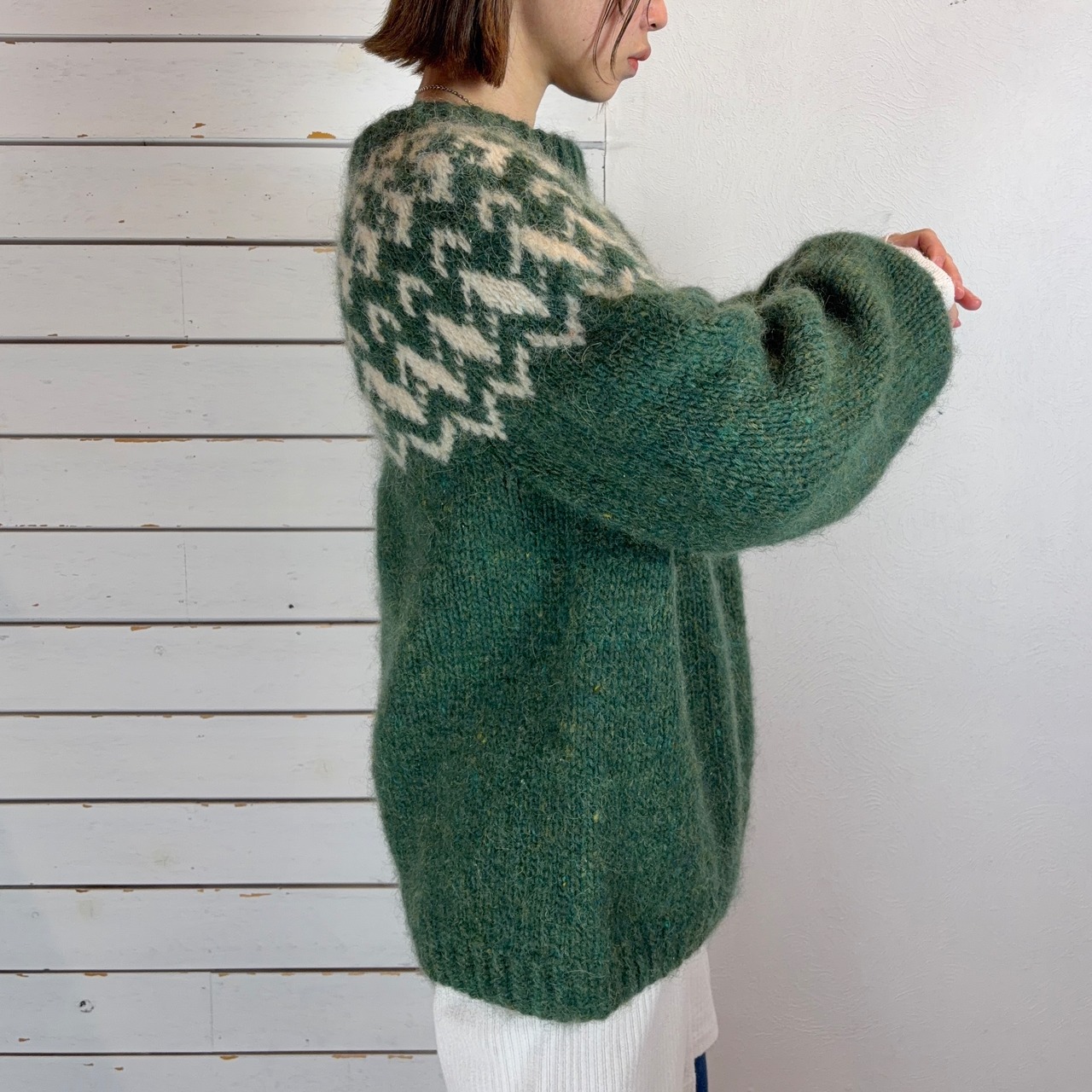 差し色にも最適な落ち着いたグリーンのフェアアイル柄ニット