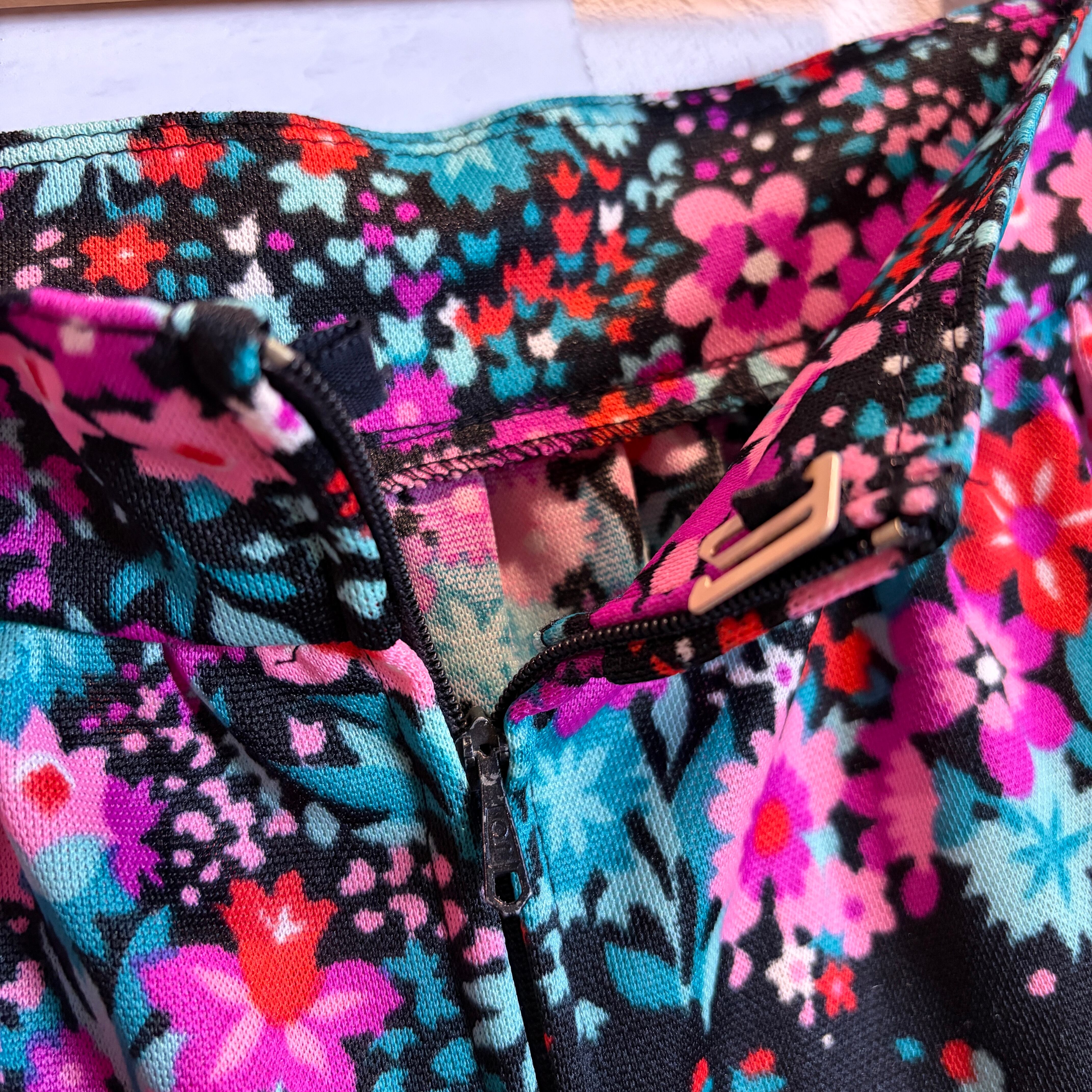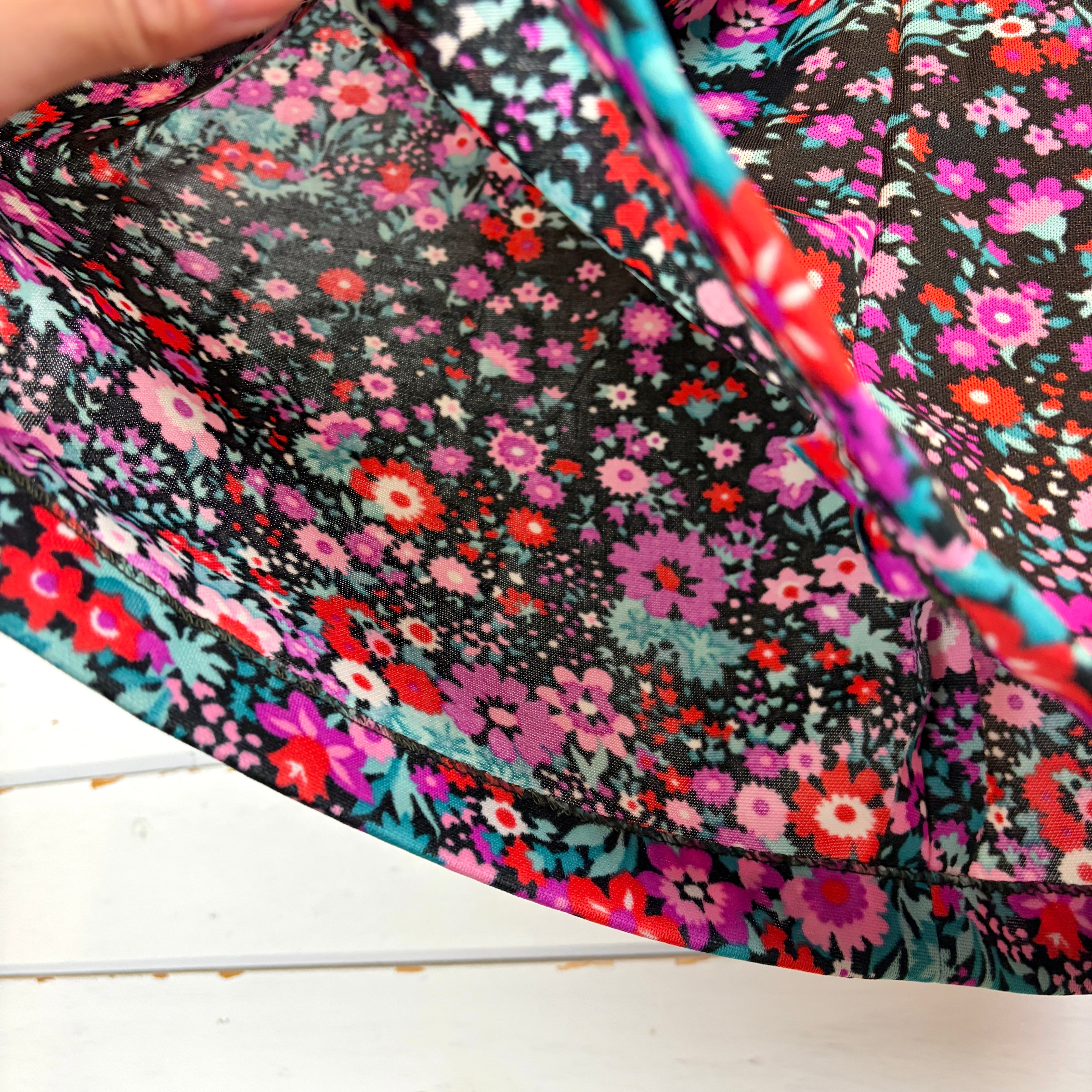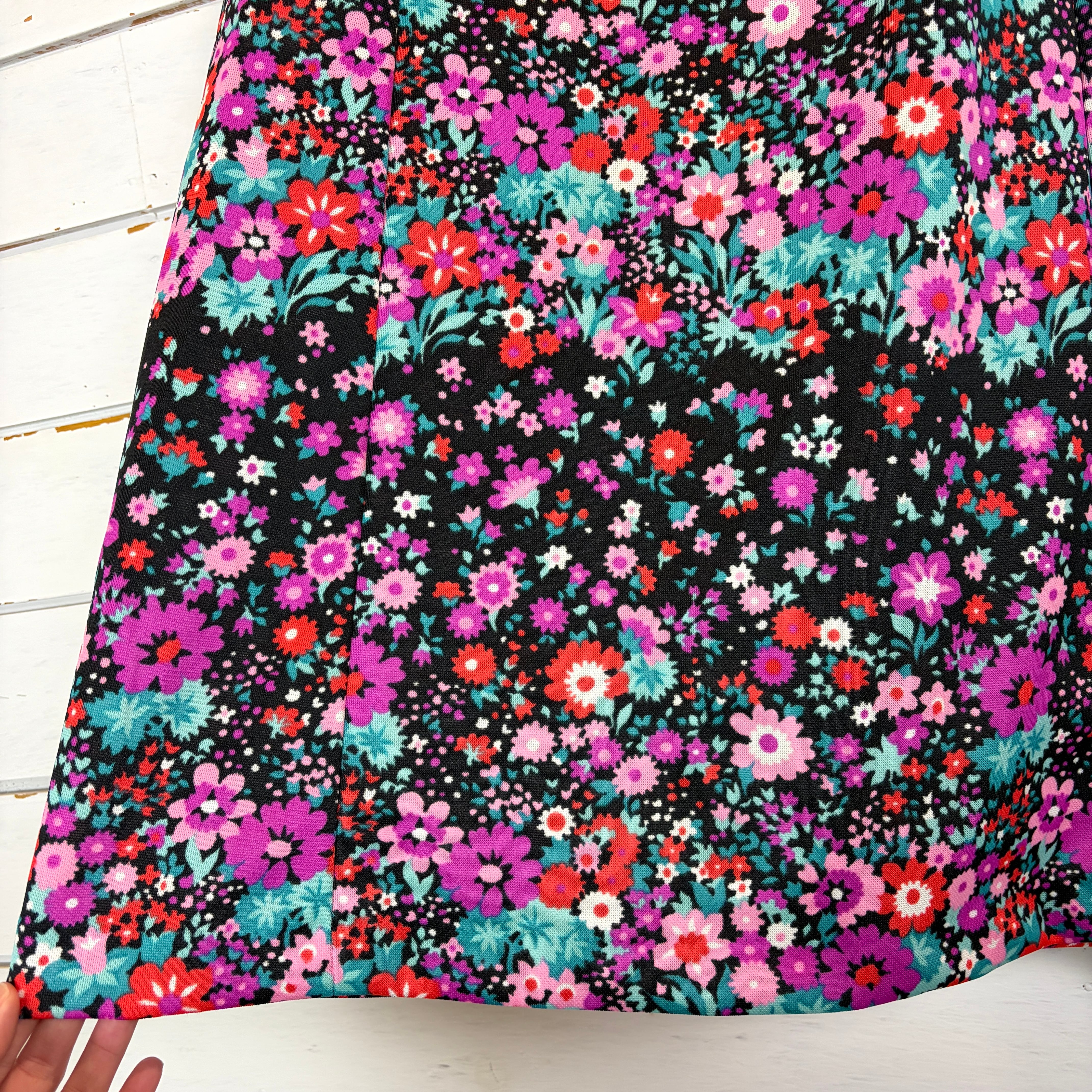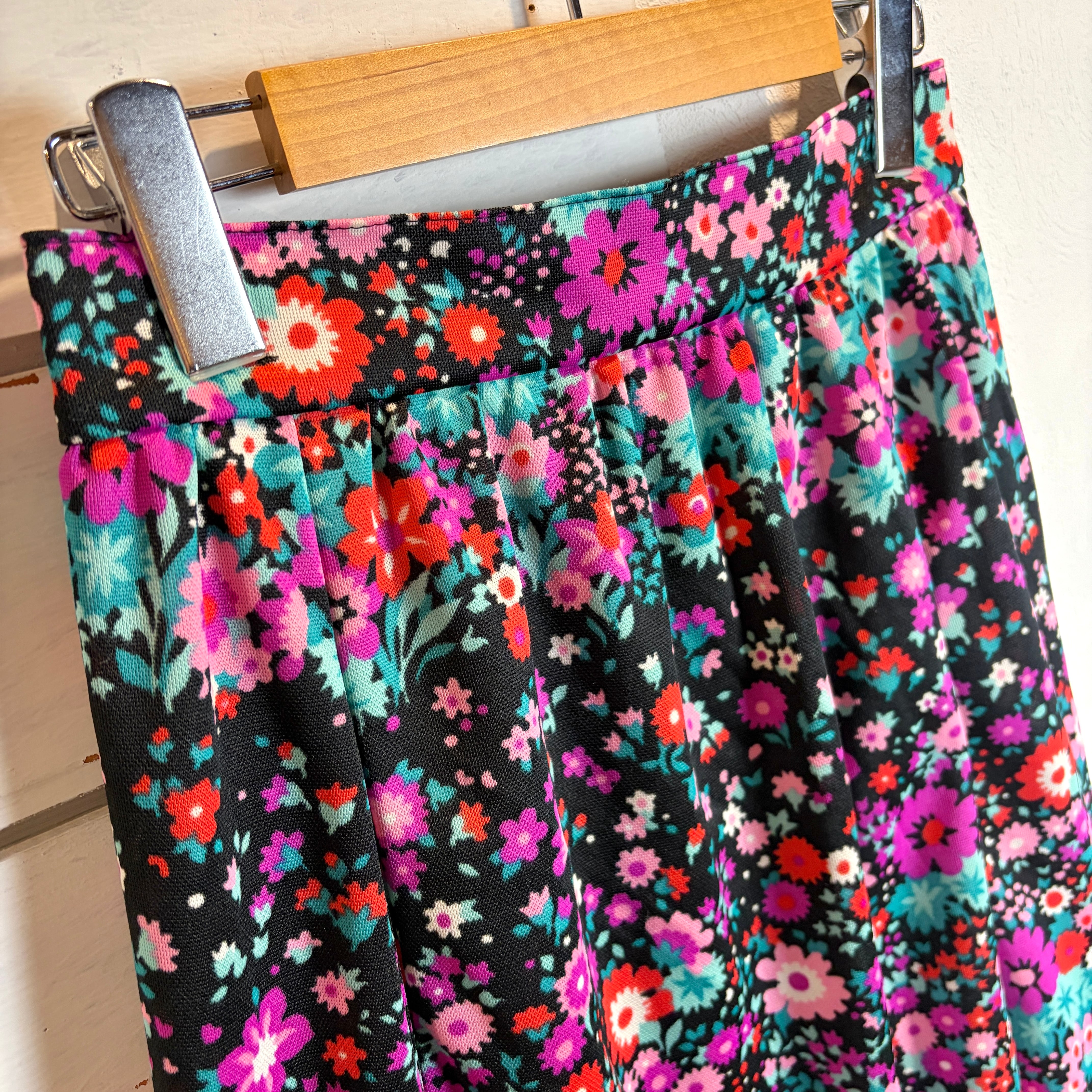 ブラックベースに鮮やかなピンク・レッド・ターコイズが目を惹く花柄スカート
