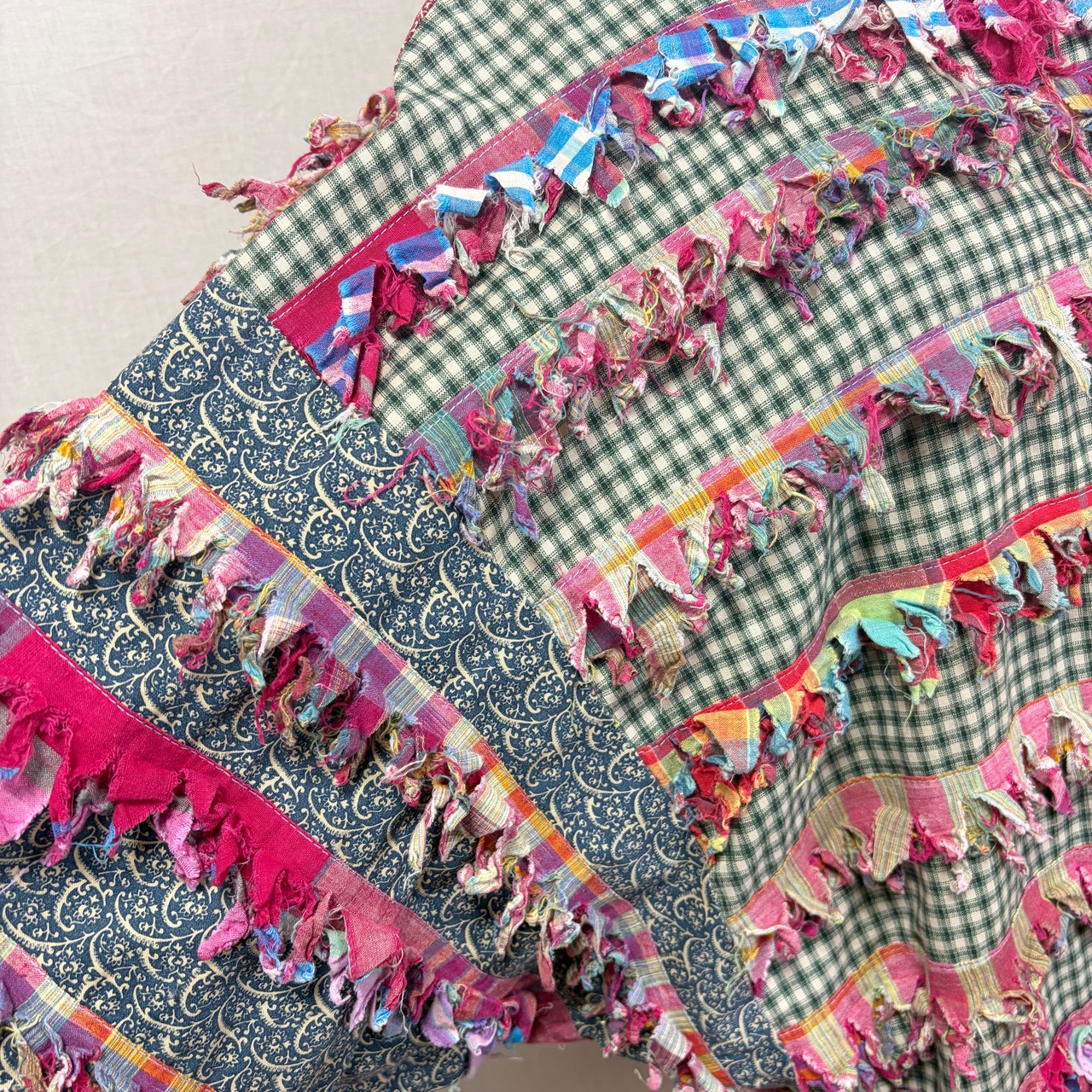 正面はやわらかなくすみカラーのチェック柄、バックはペイズリーのような柄