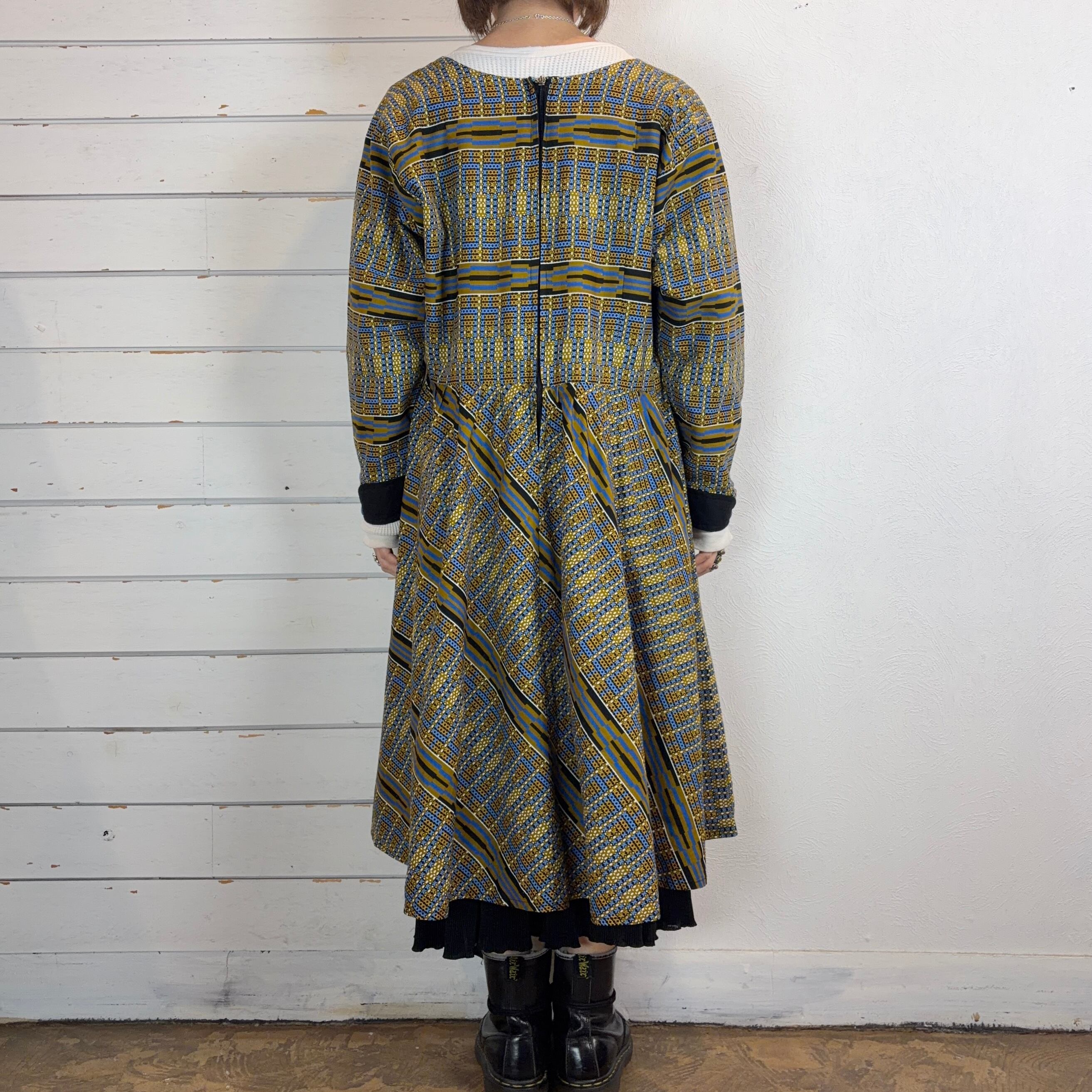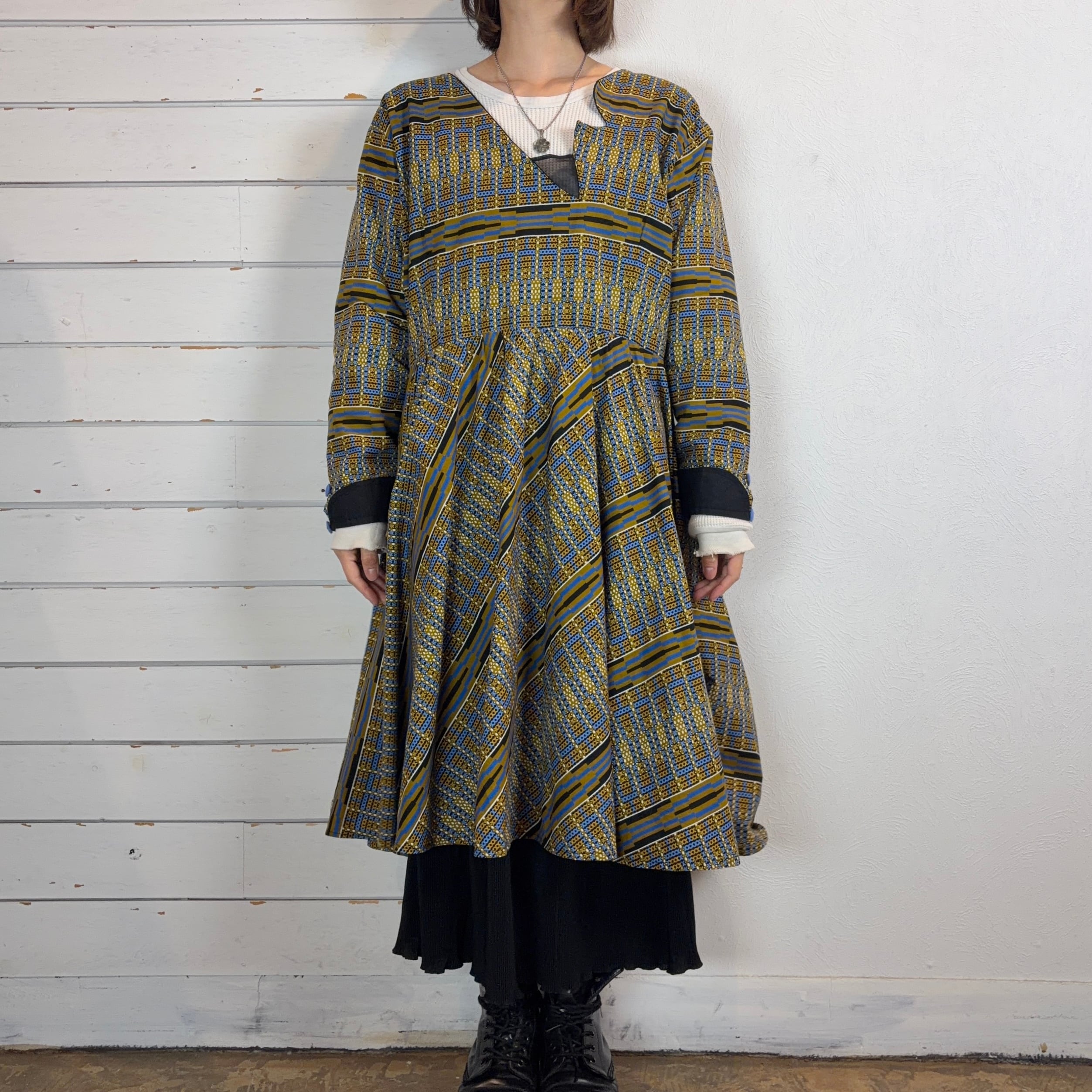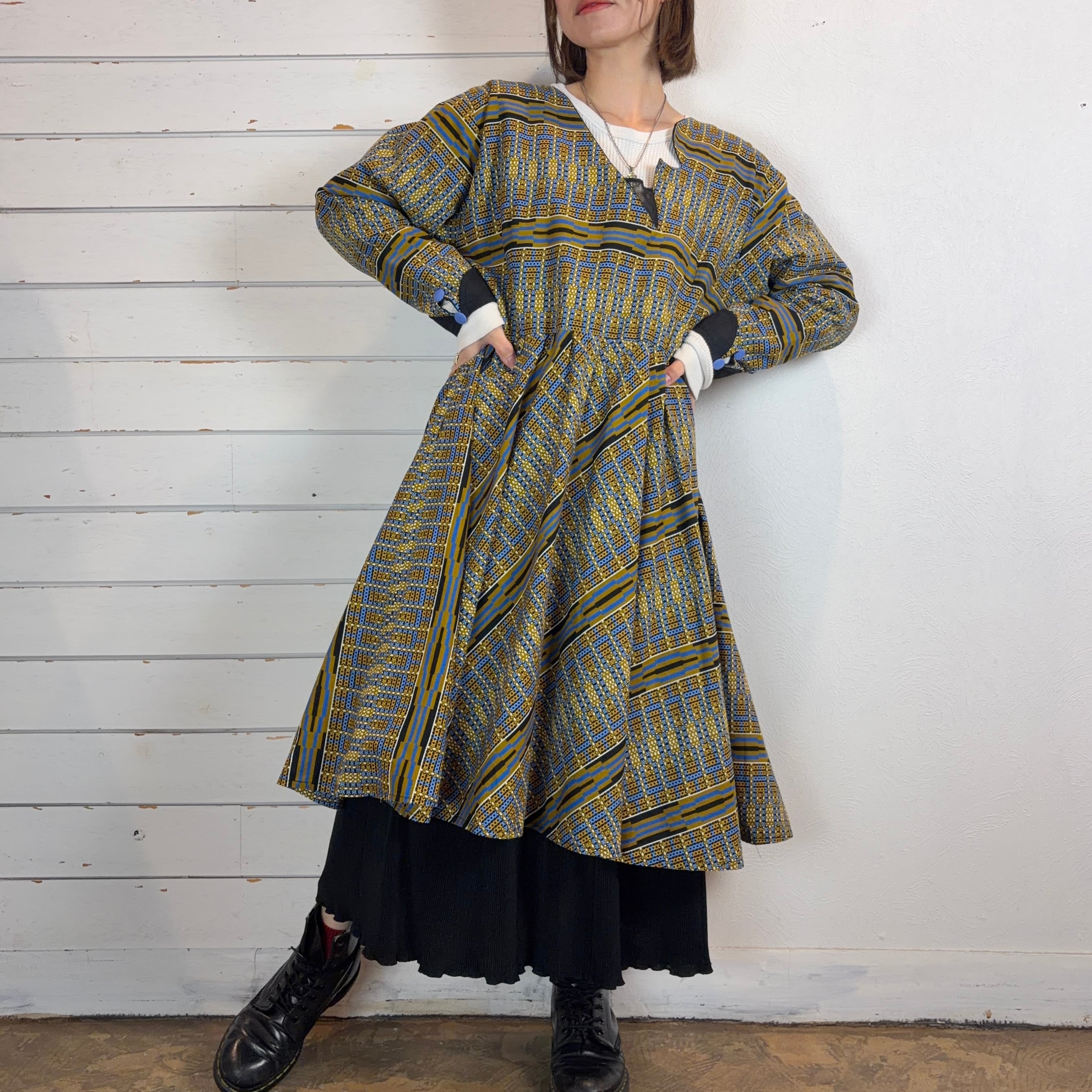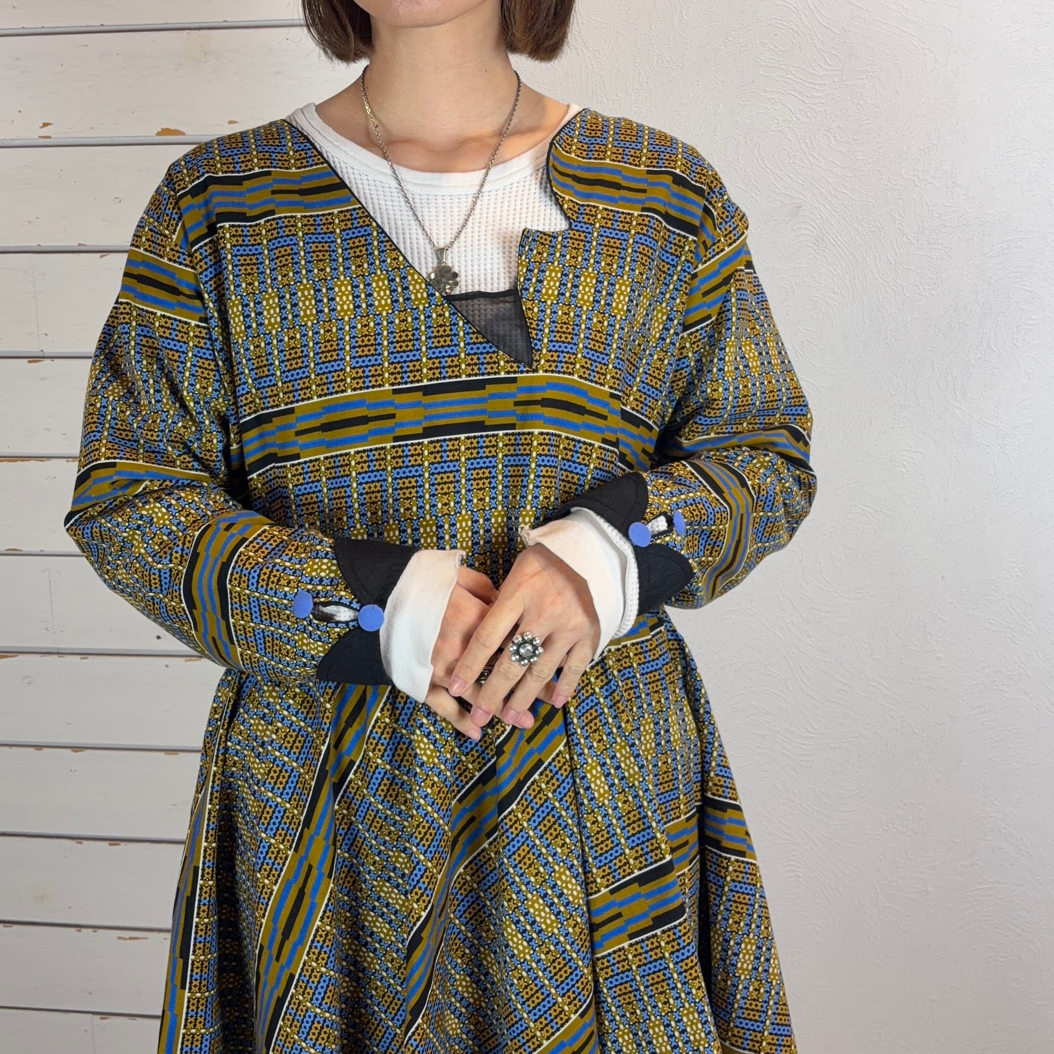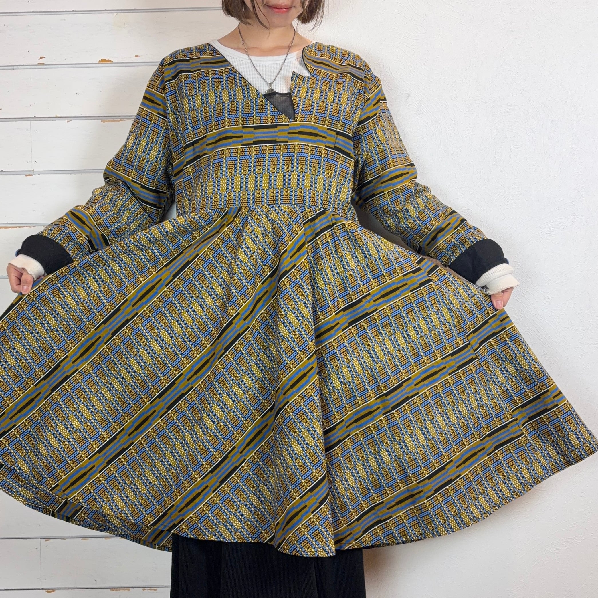 幾何学模様が印象的なアフリカンバティックのワンピース