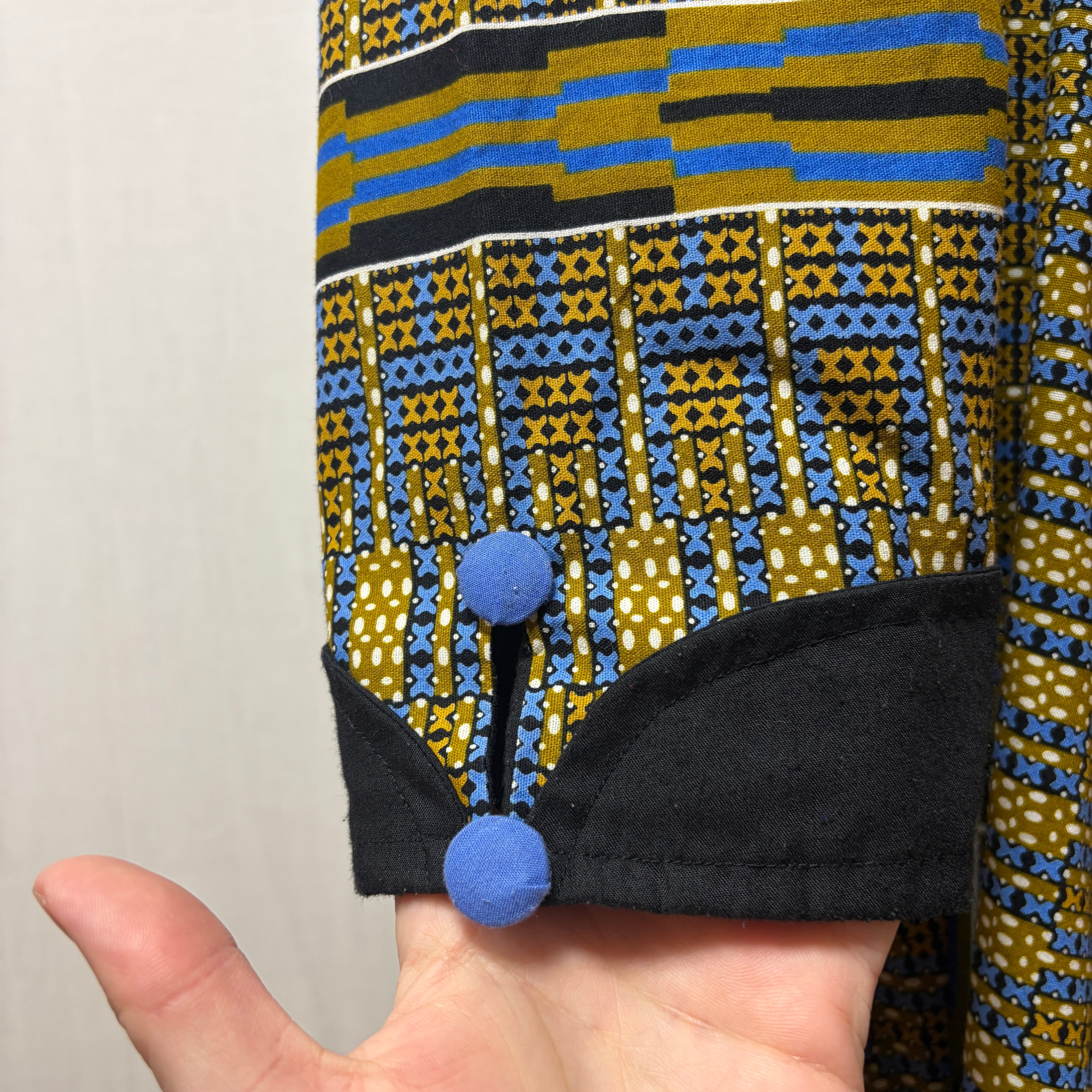 くすんだブルーと黄土色でトーンも程よく、柄が細かいので総柄ですが着用しやすいかと思います