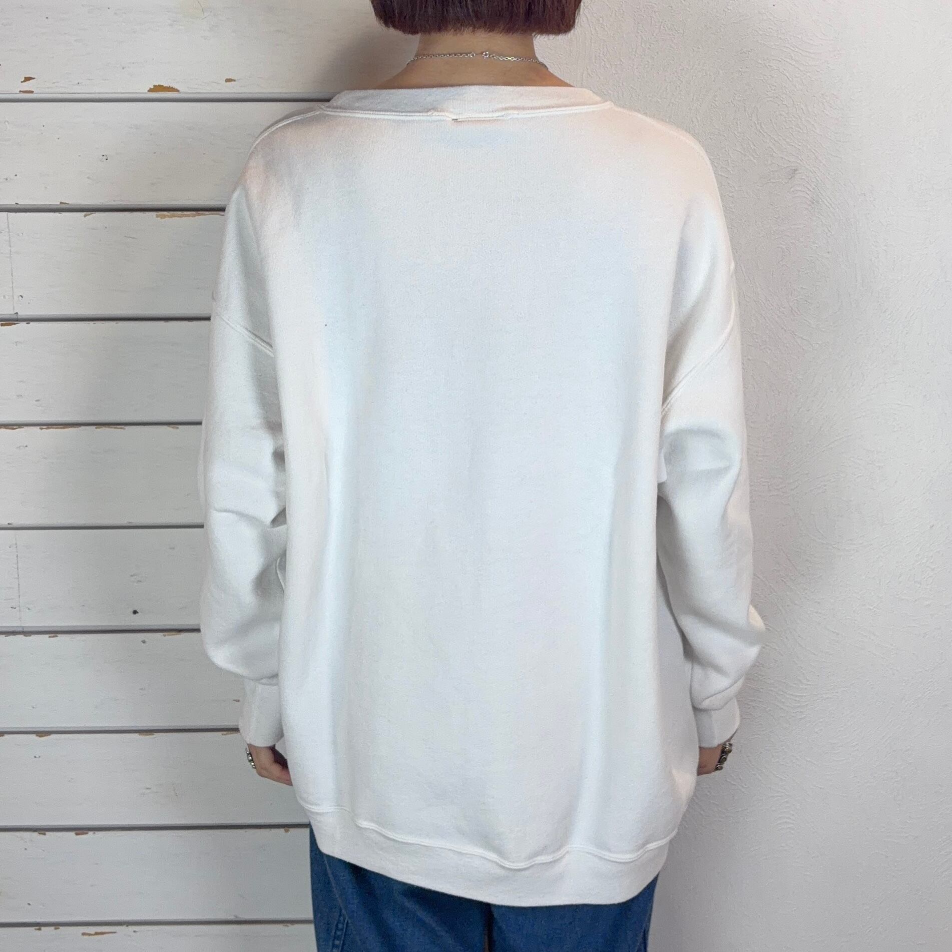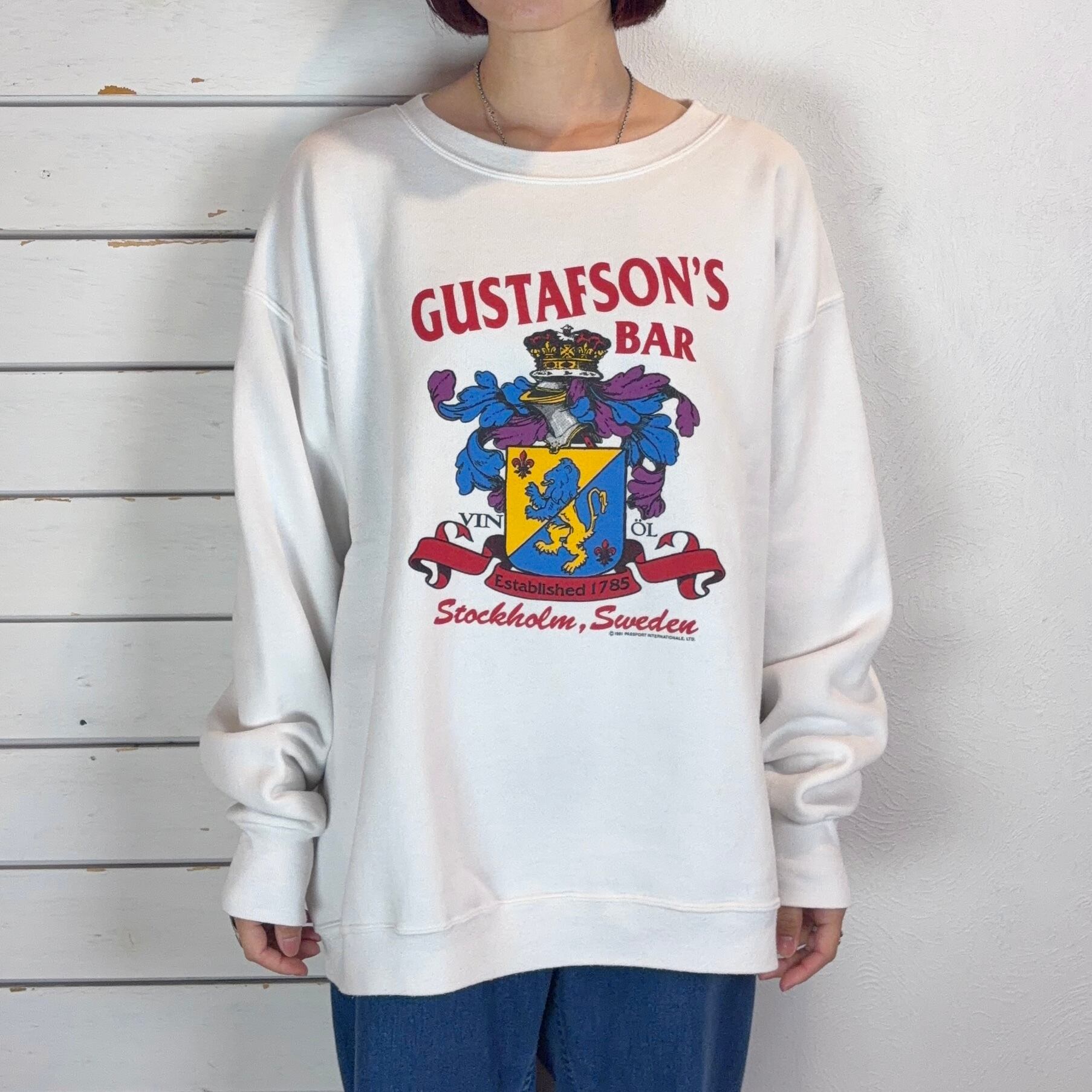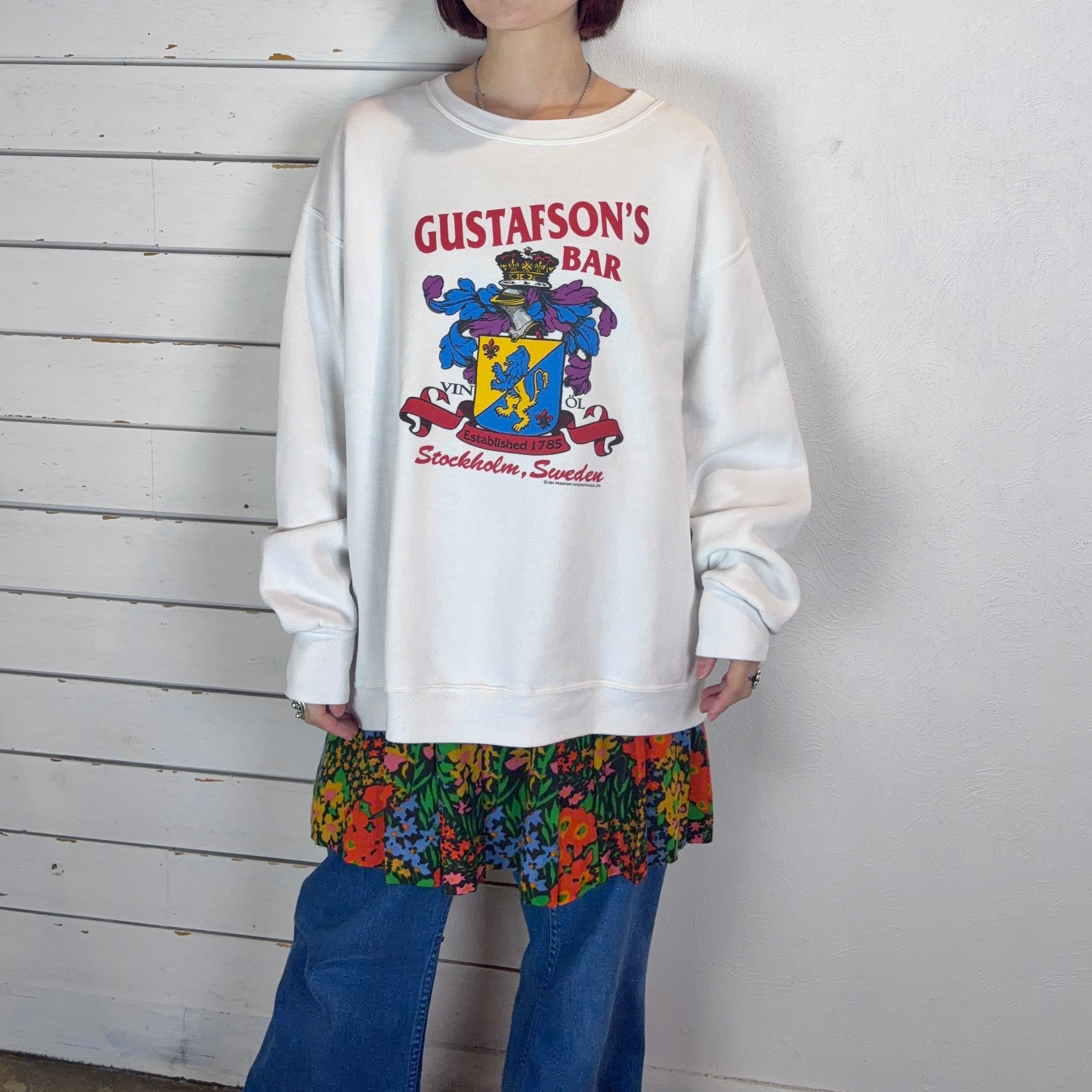 使いやすい白ボディにヨーロッパの紋章っぽいグラフィックとロゴプリントのスウェット