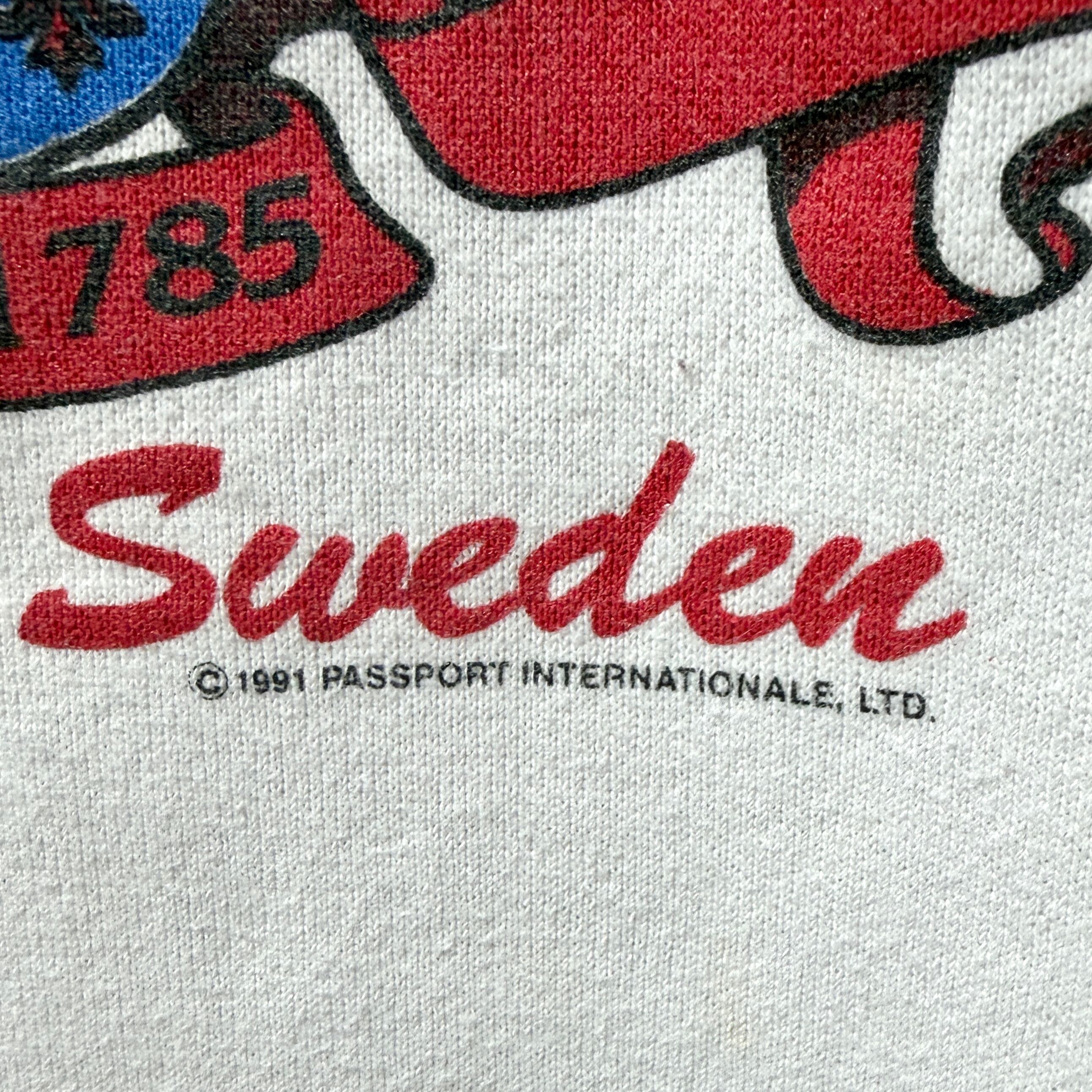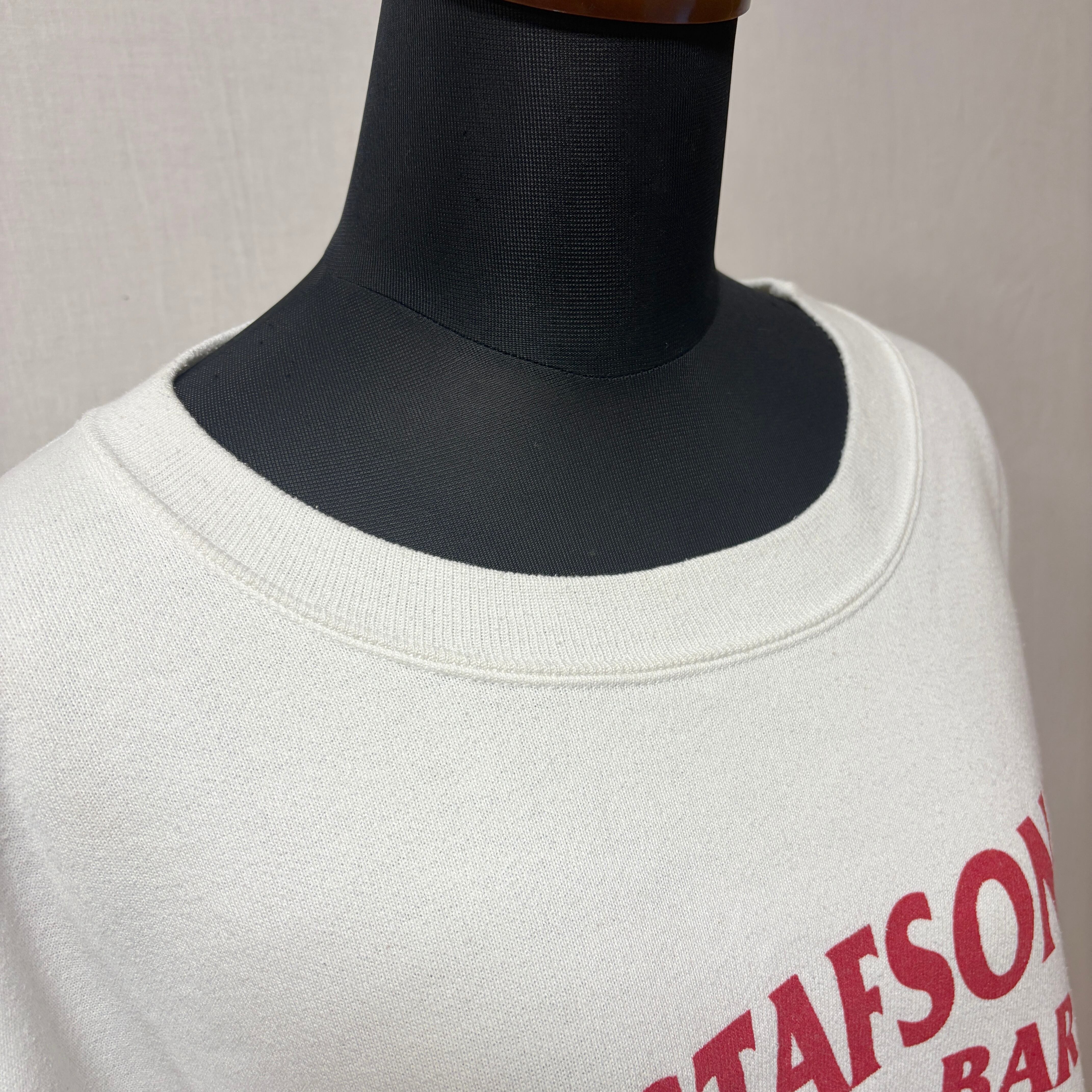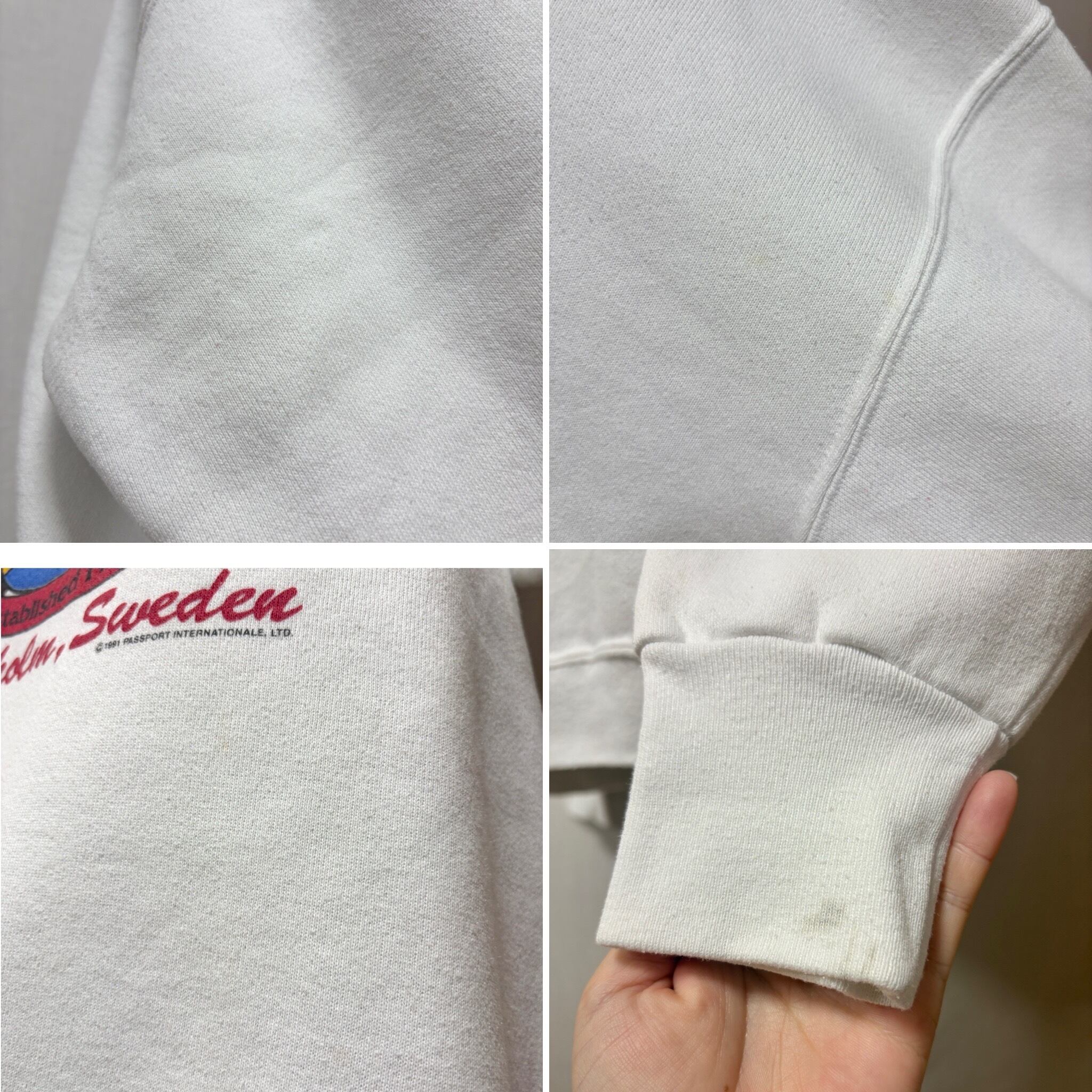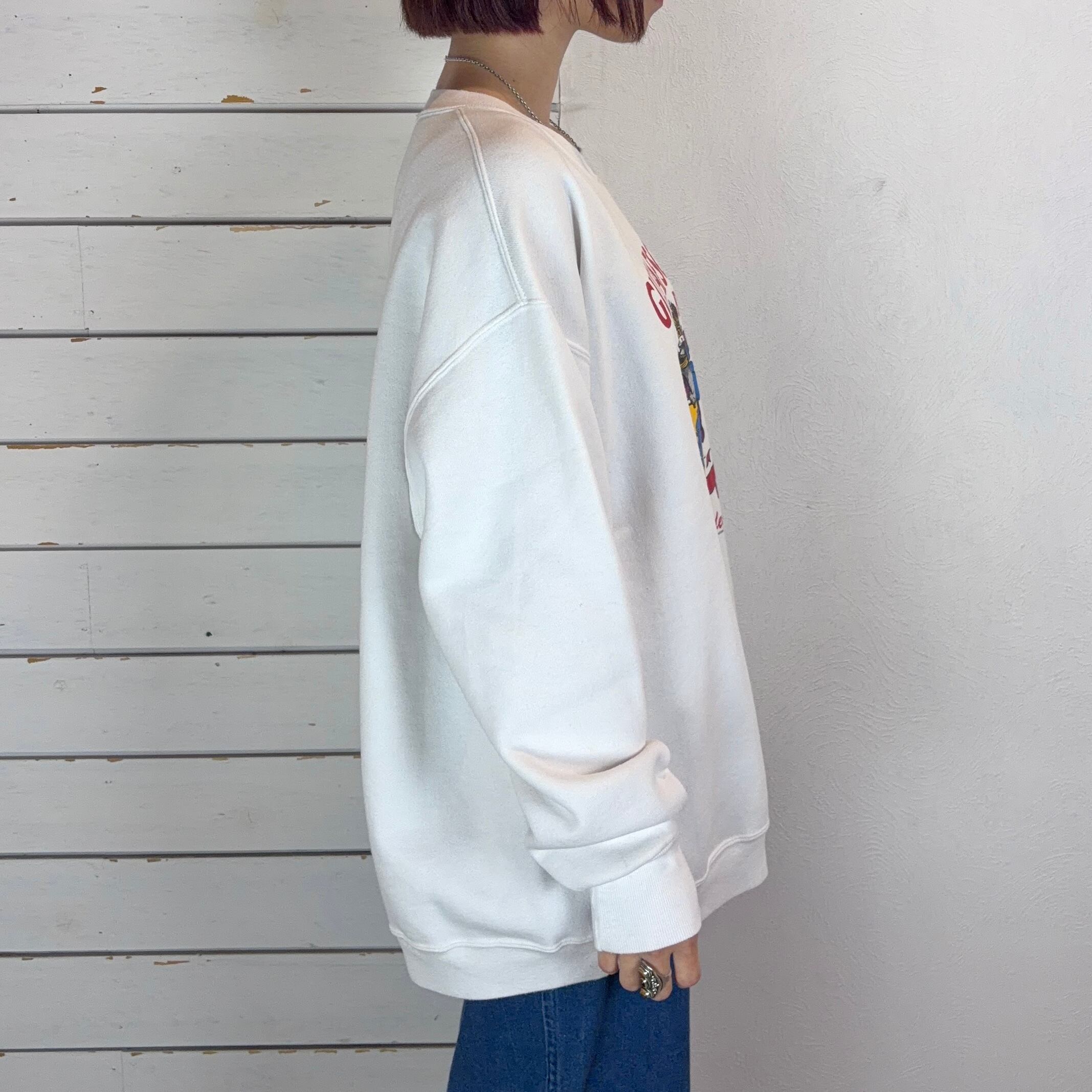 使いやすい白ボディにヨーロッパの紋章っぽいグラフィックとロゴプリントのスウェット