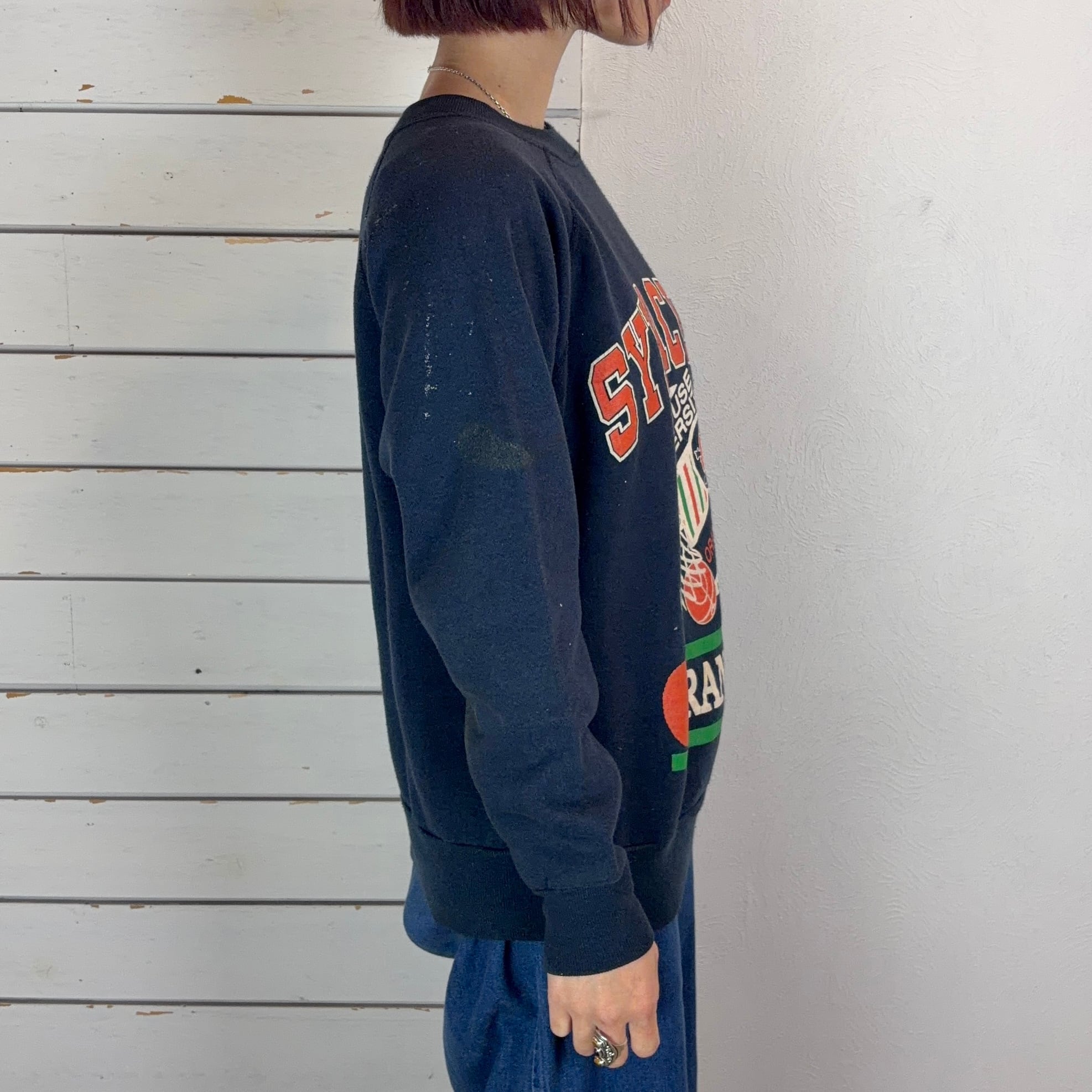 ネイビーボディにちょっとポップなカレッジプリントのスウェット