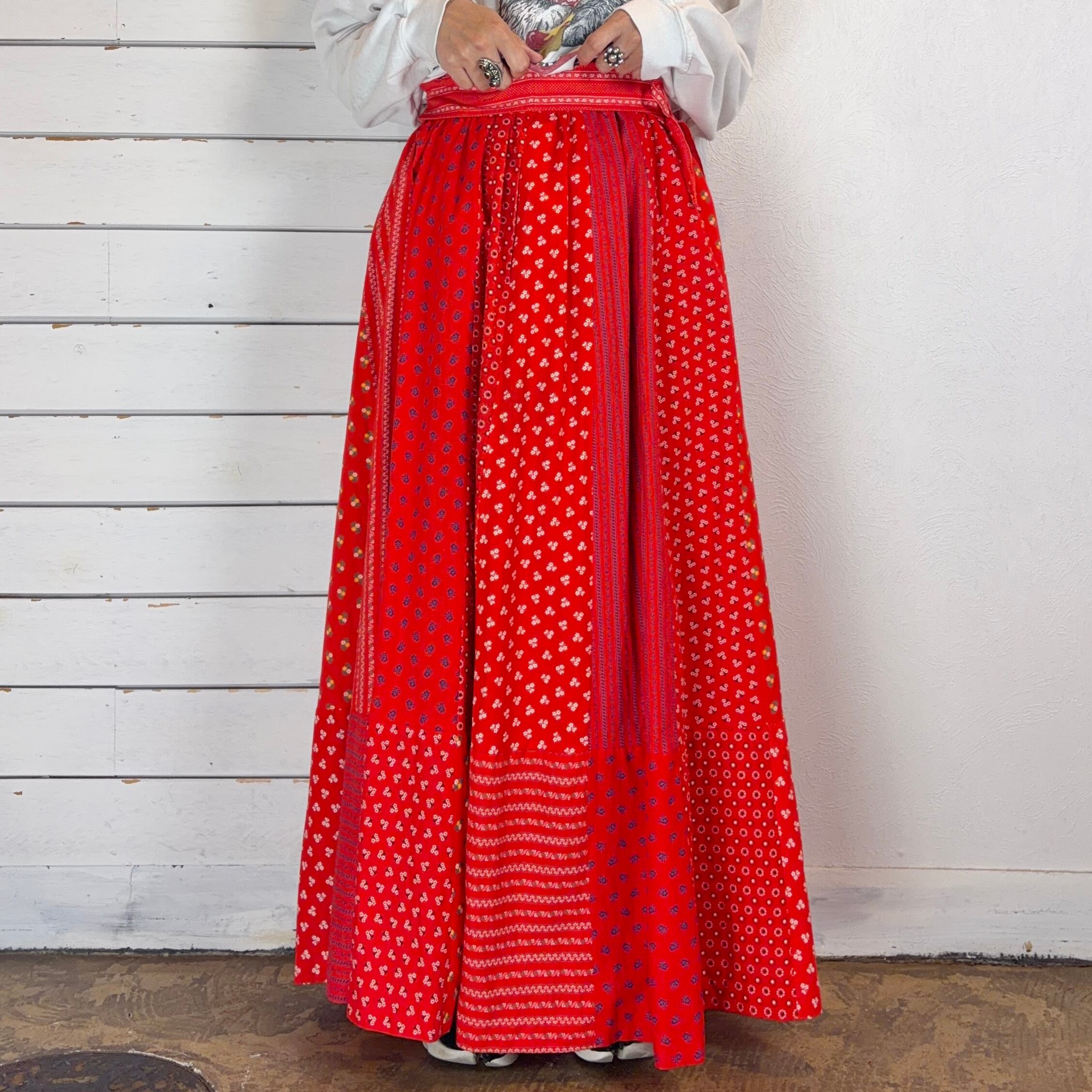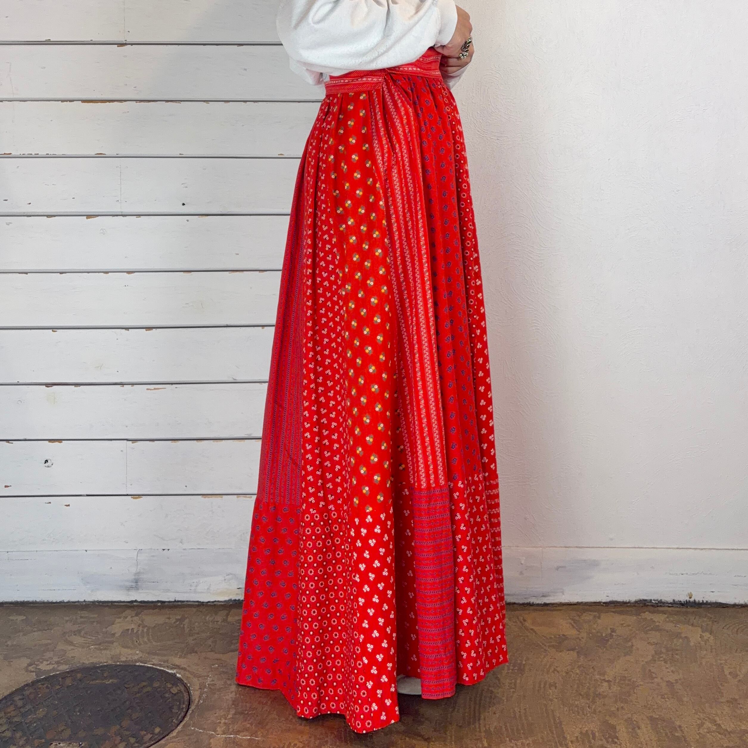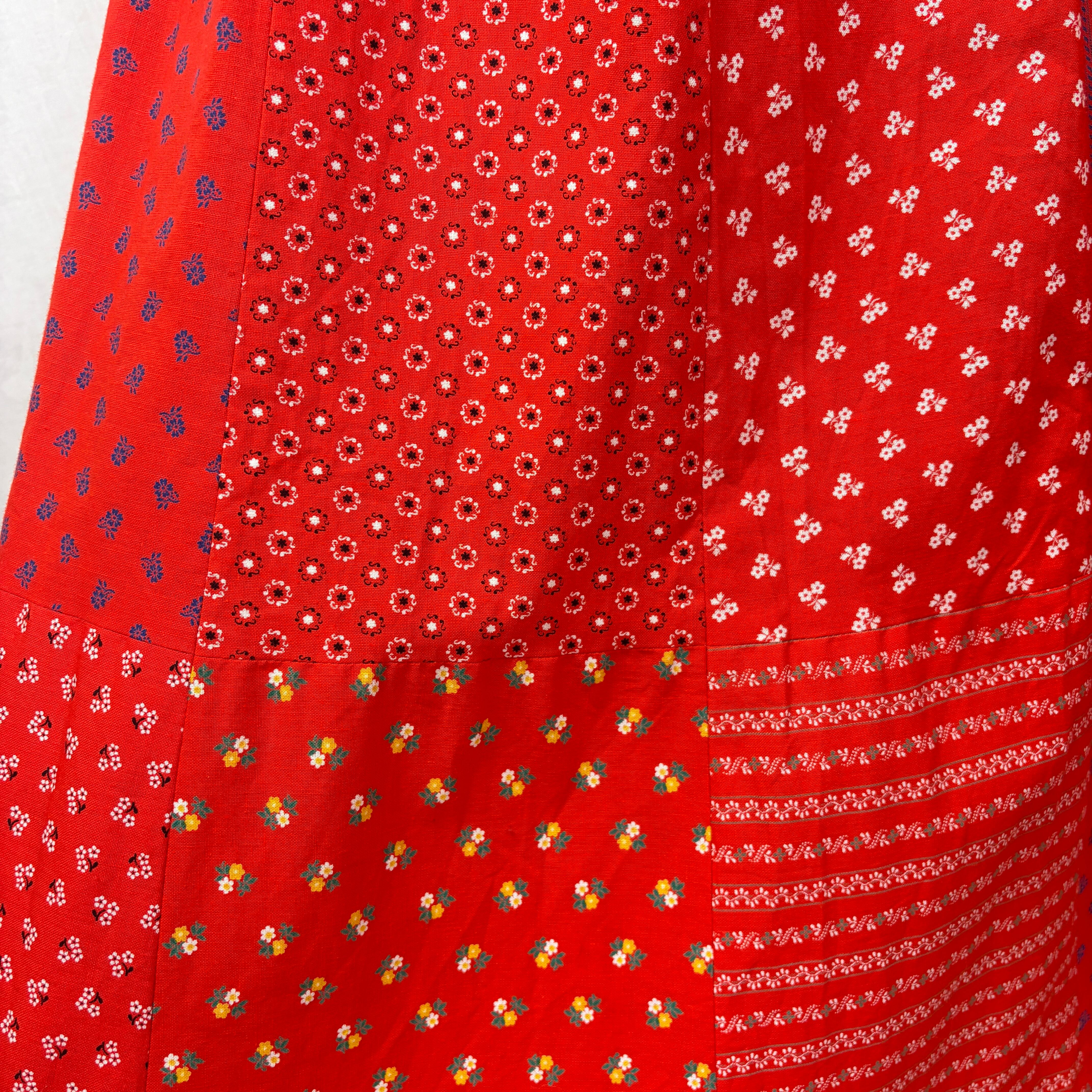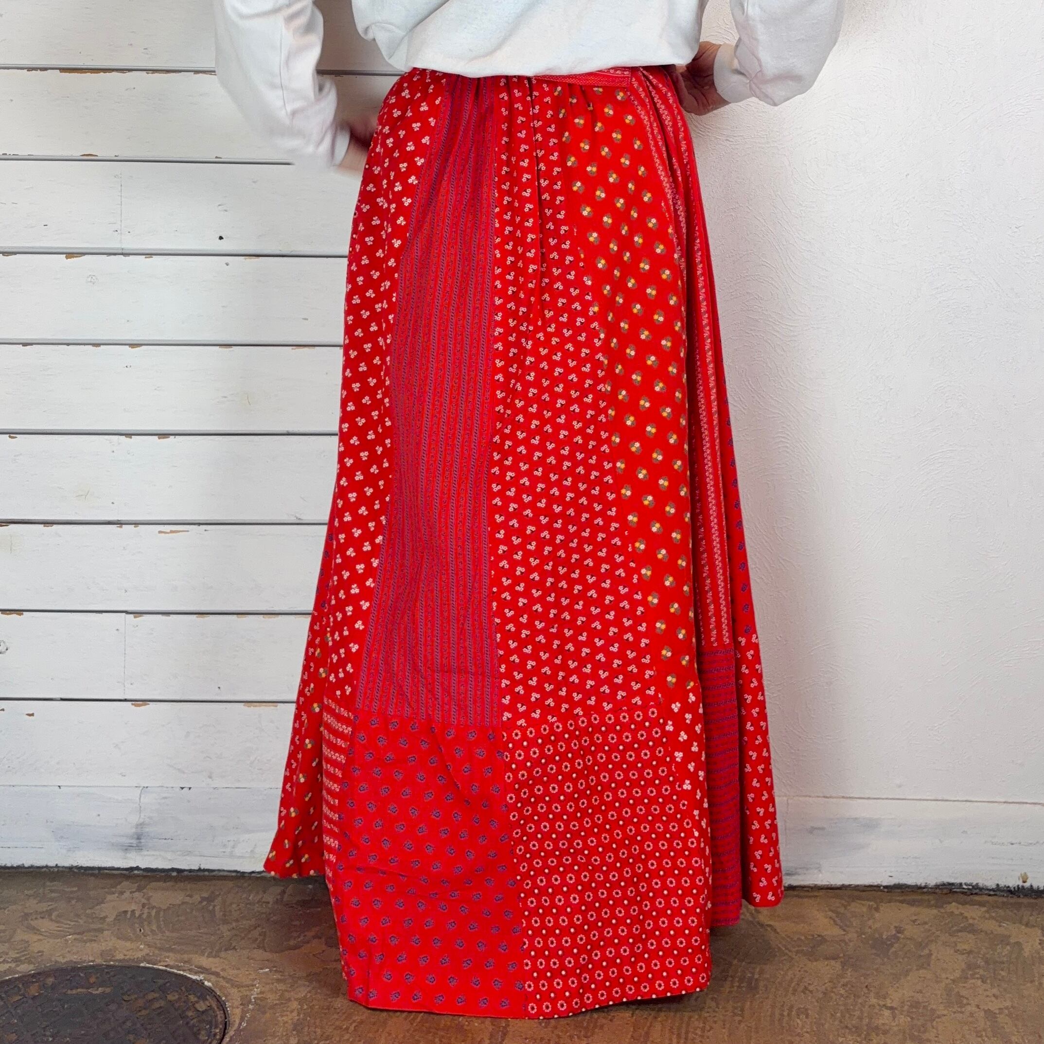 ビビッドな赤ベースで様々な花柄パターンがパッチワークになったスカート