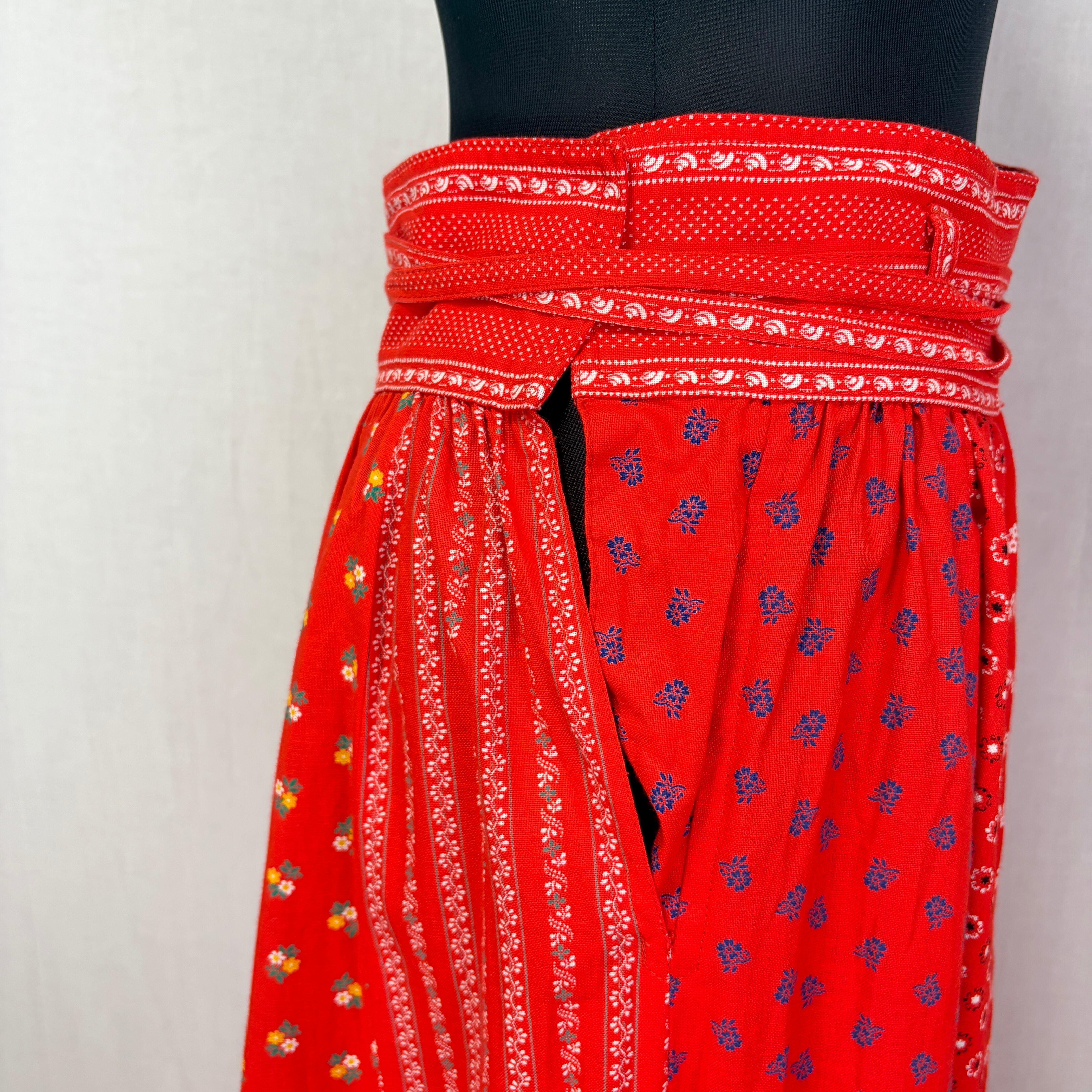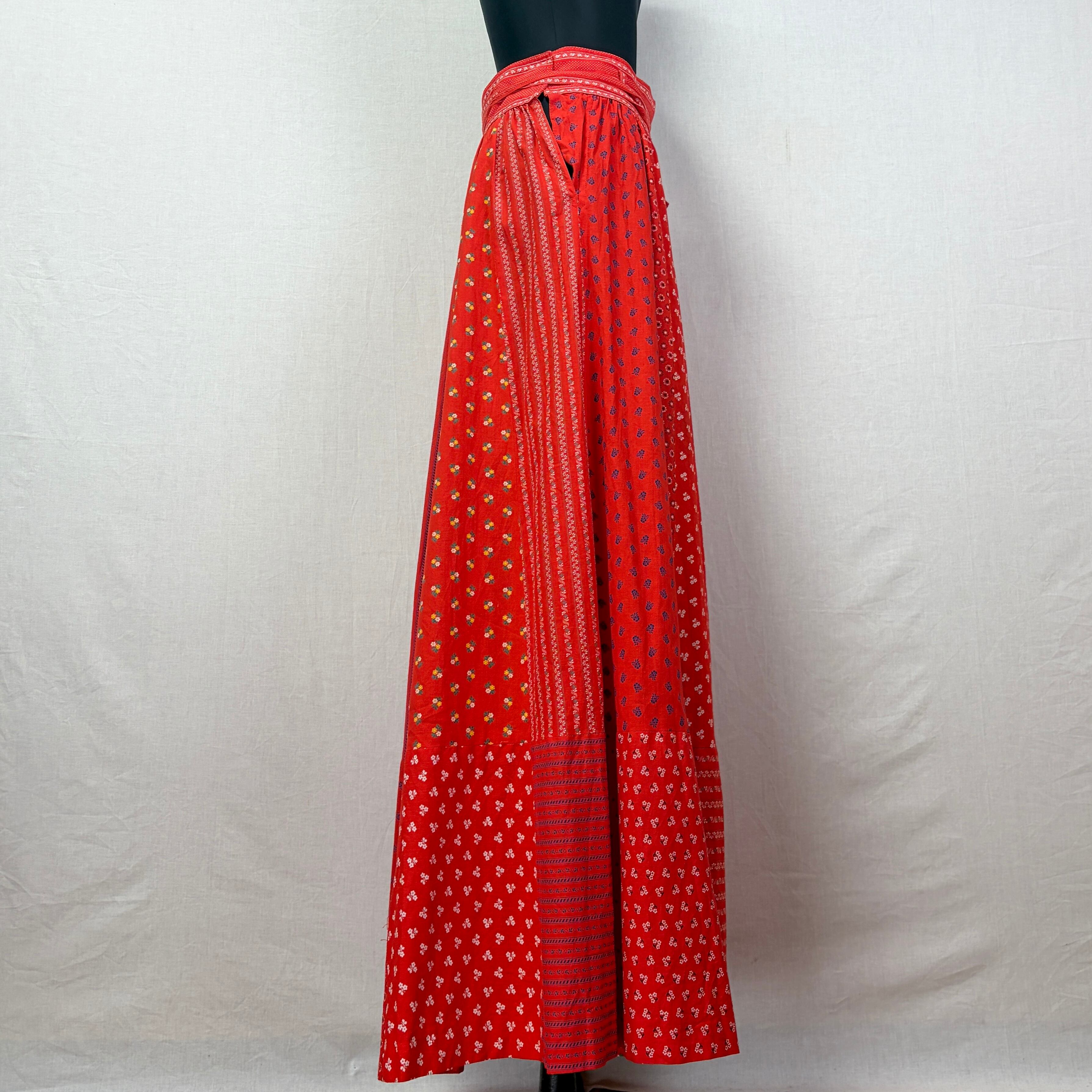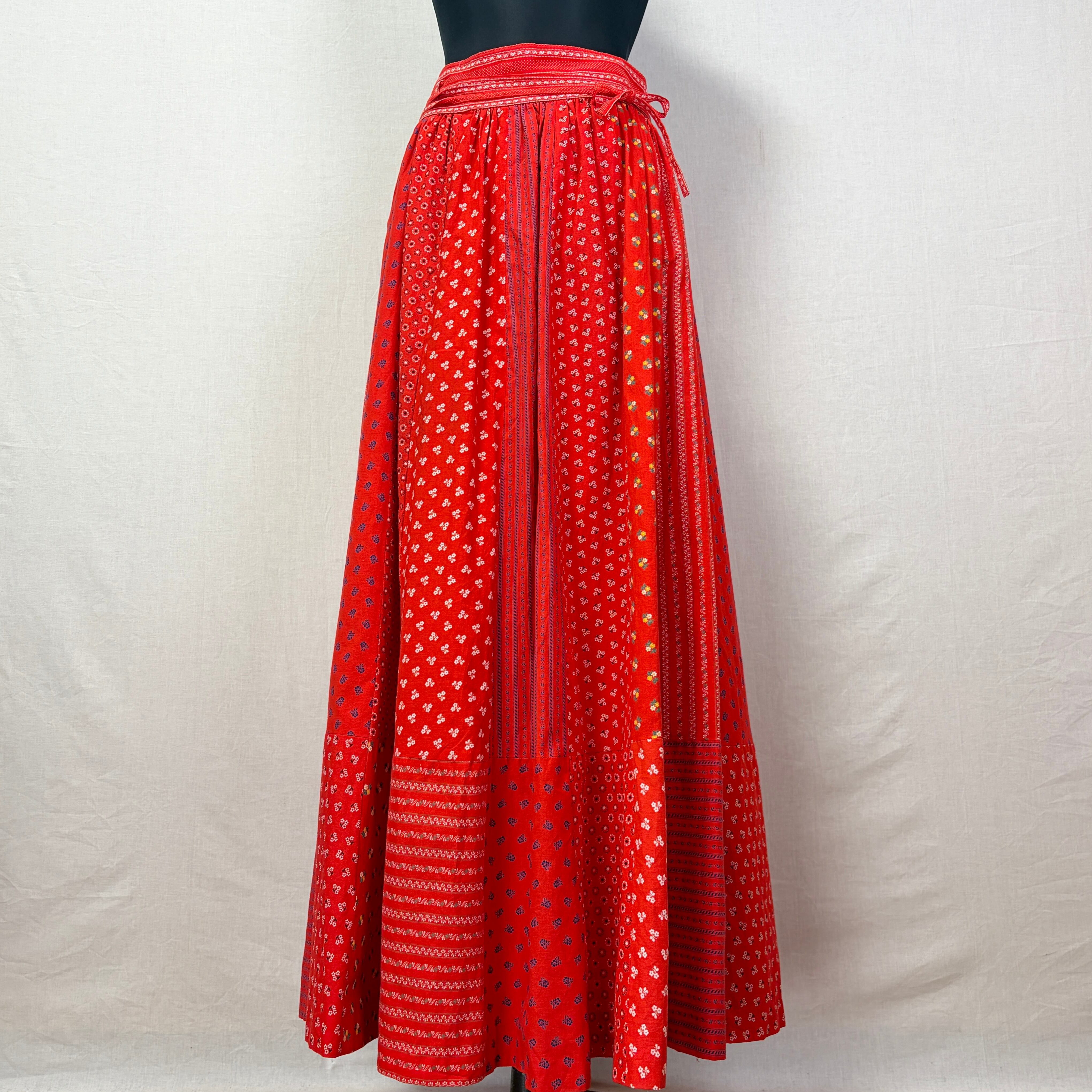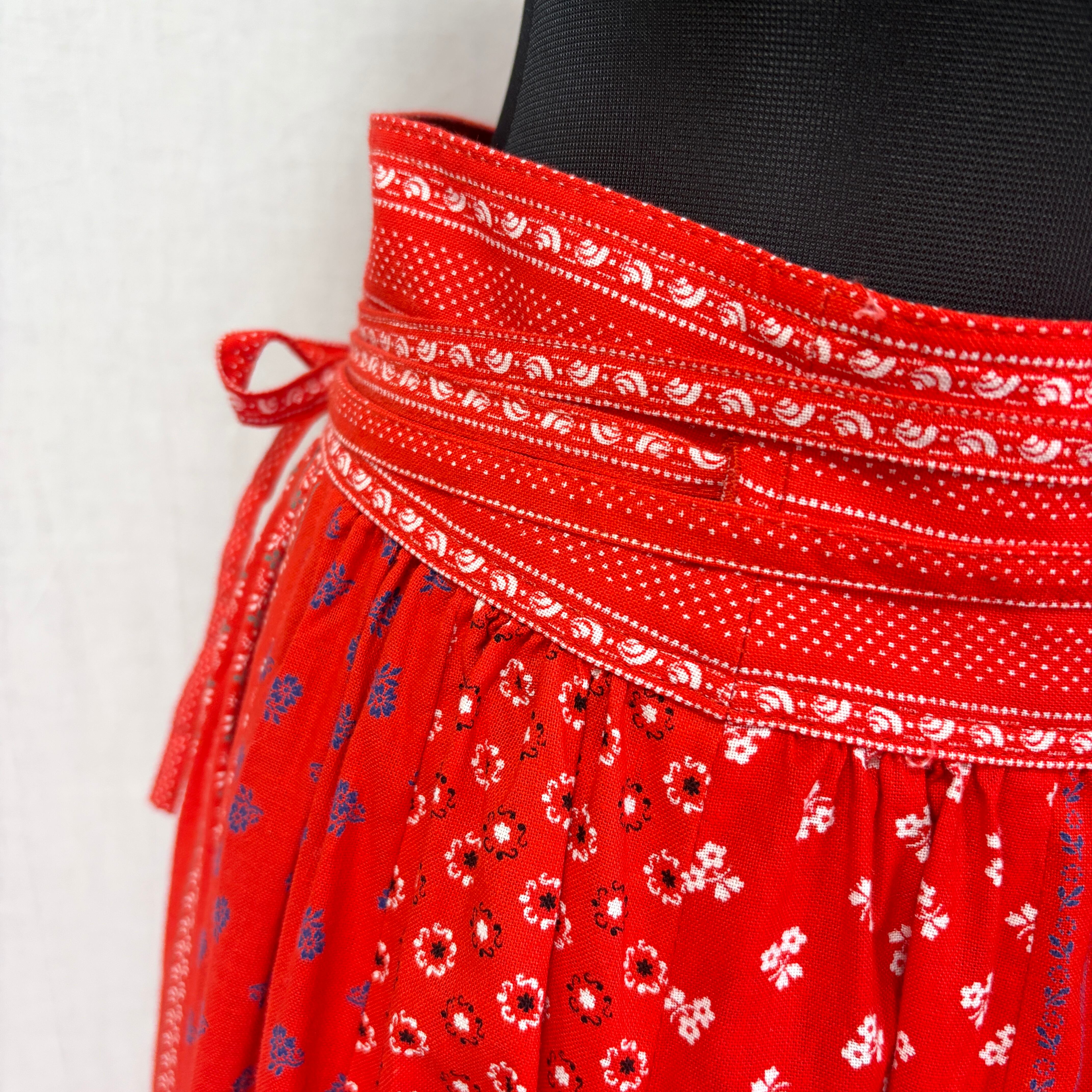 ビビッドな赤ベースで様々な花柄パターンがパッチワークになったスカート