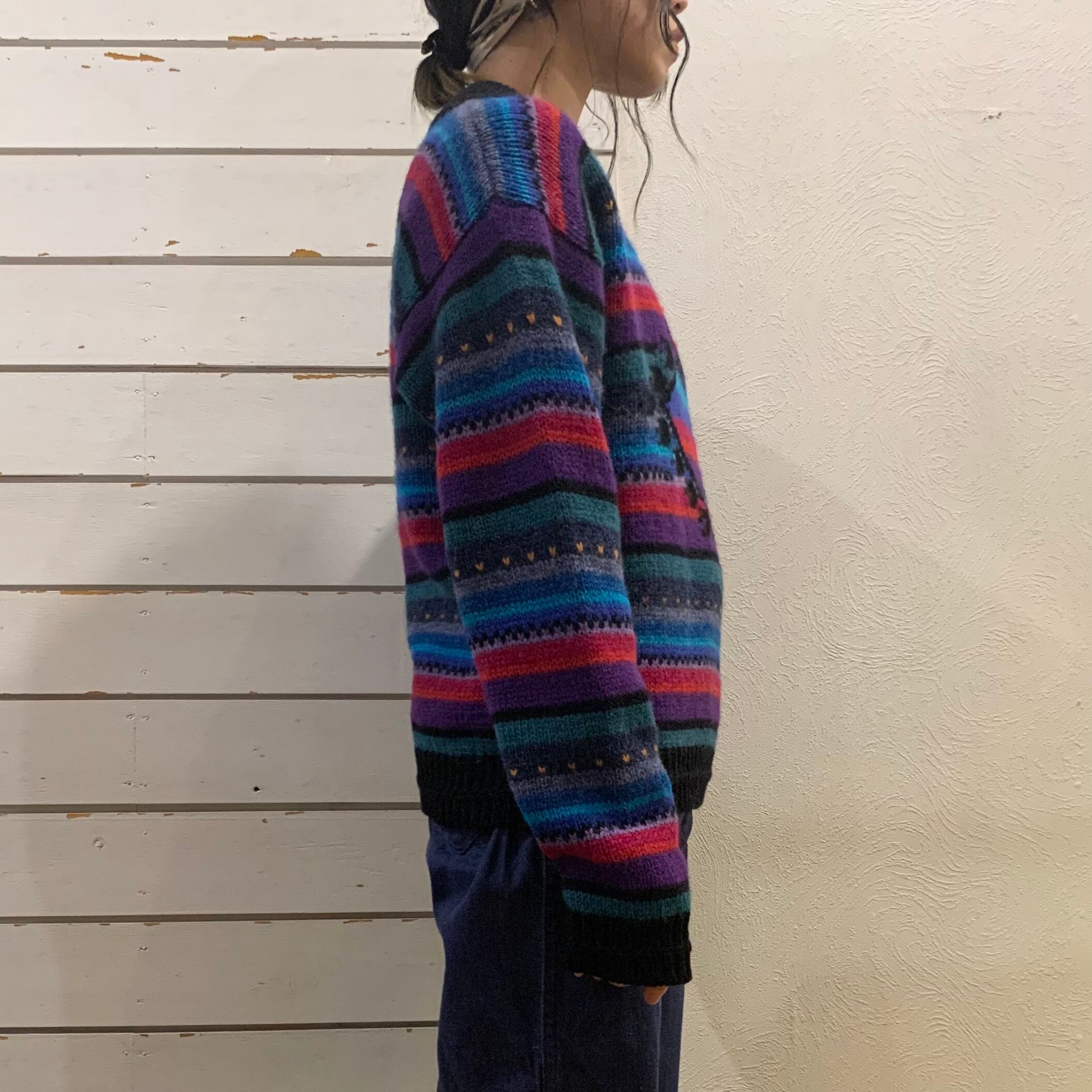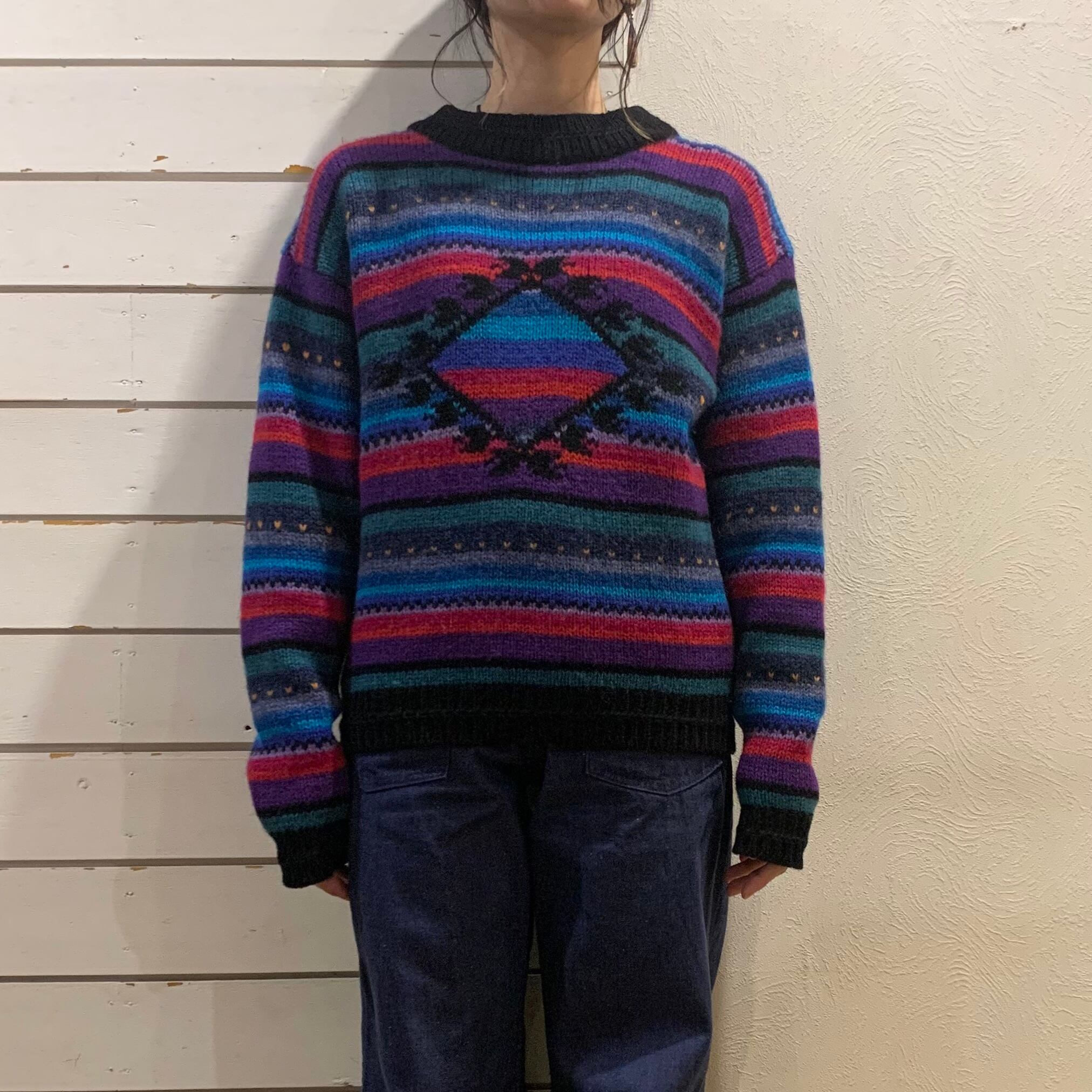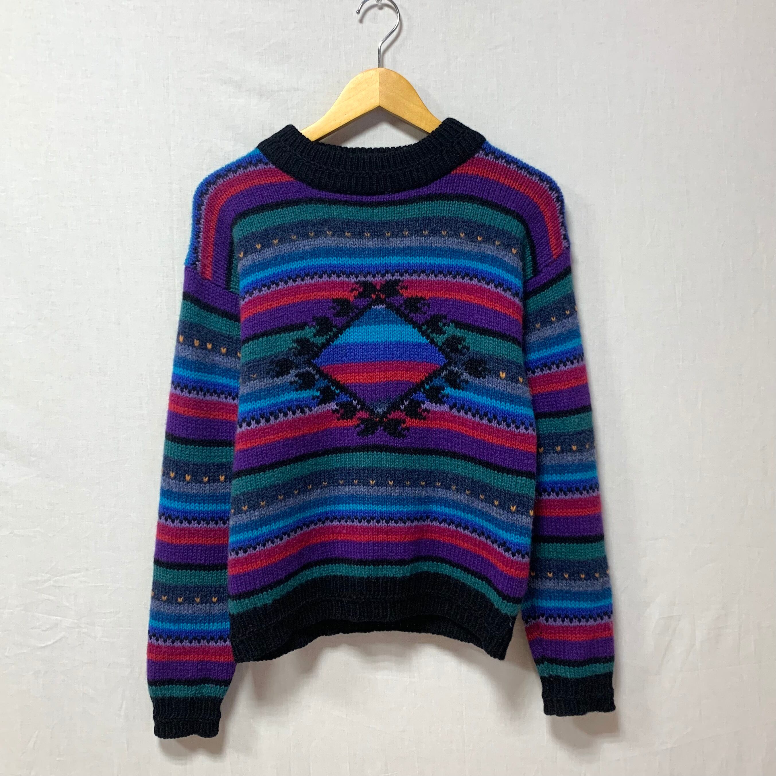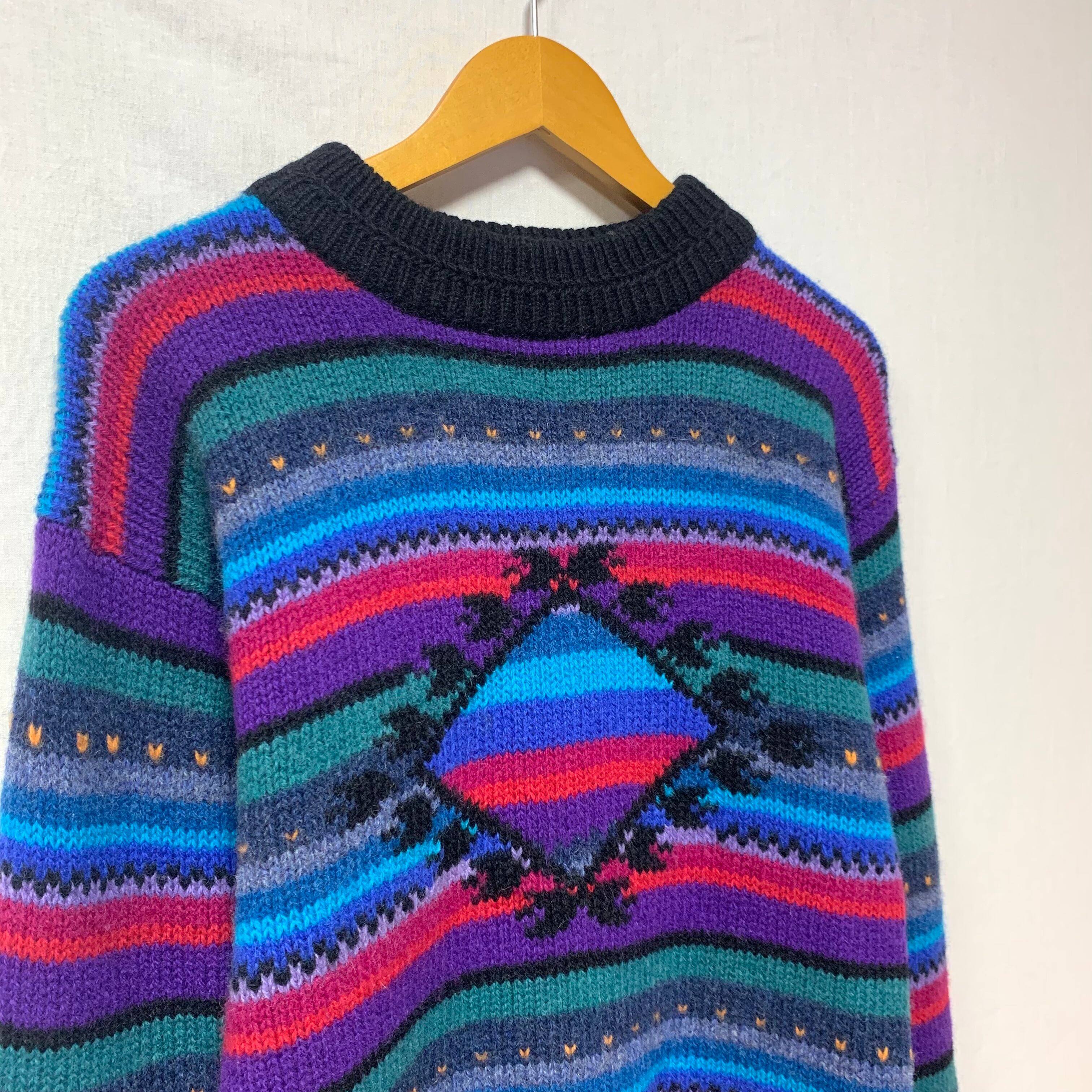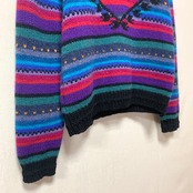 カラフルで目を惹くマルチボーダーにネイティブ柄が中央におかれたデザインニット❤︎