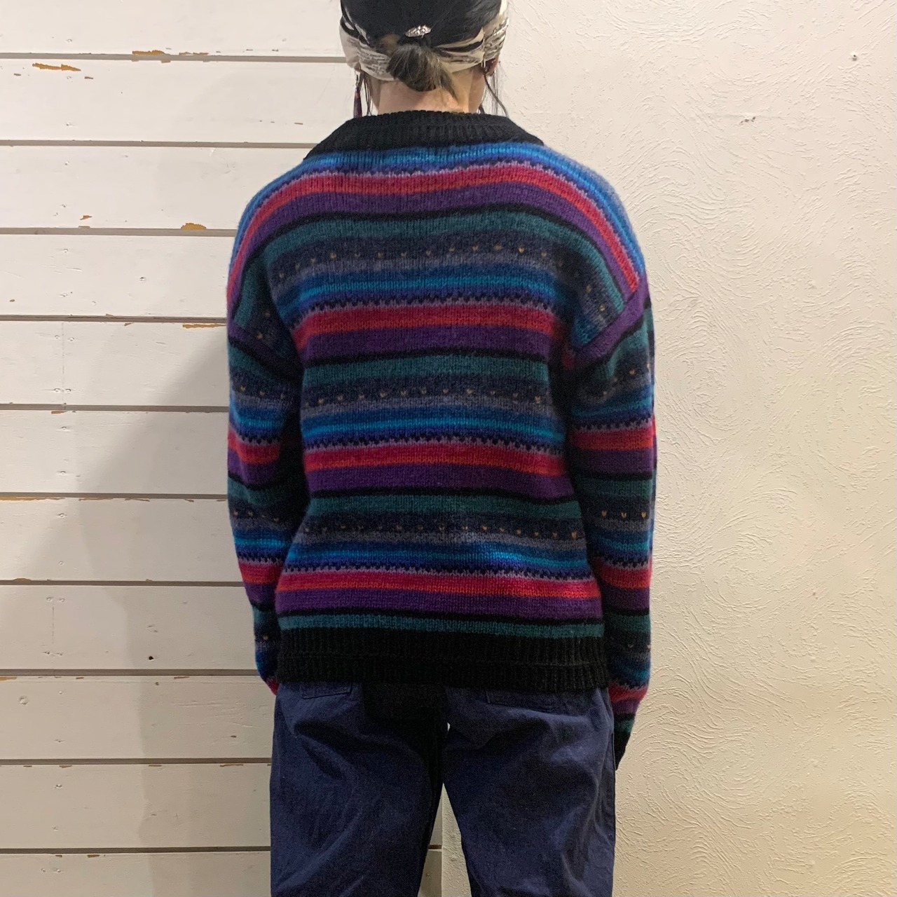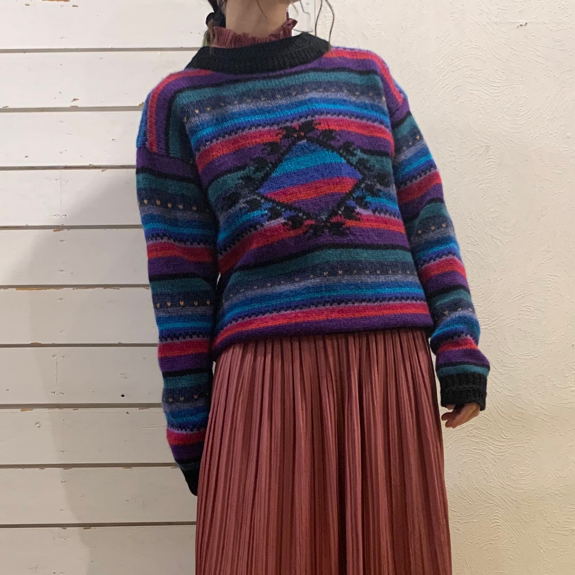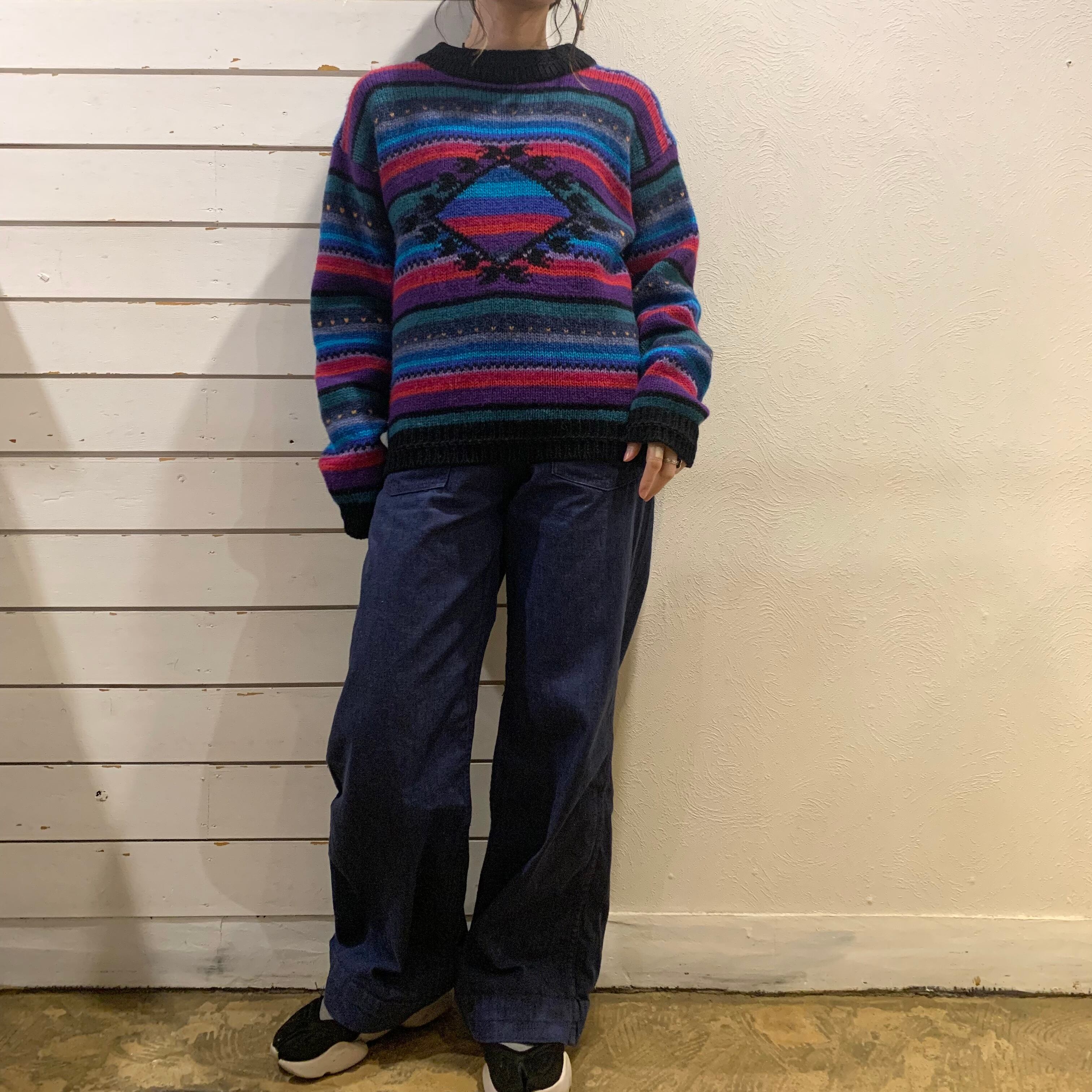カラフルで目を惹くマルチボーダーにネイティブ柄が中央におかれたデザインニット❤︎