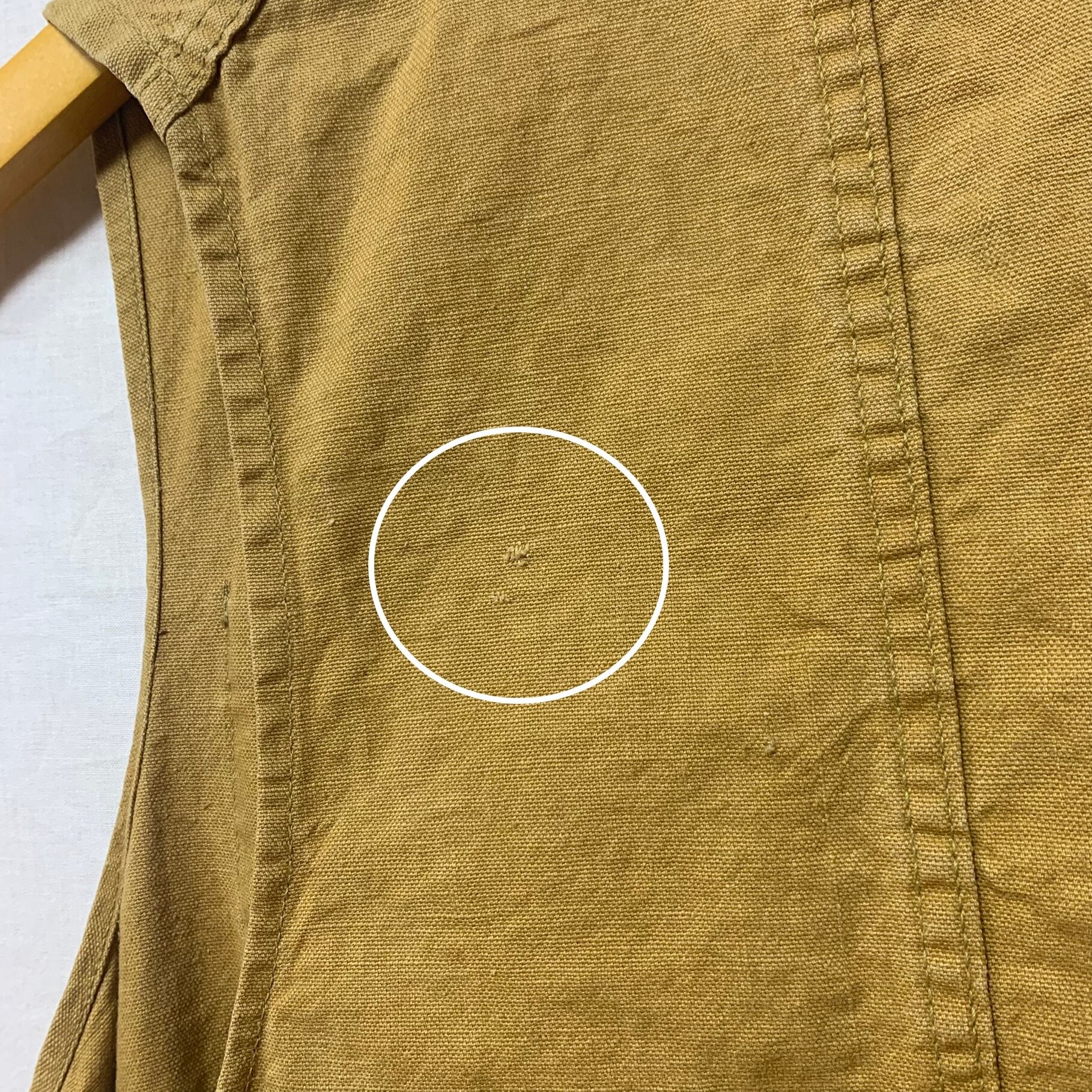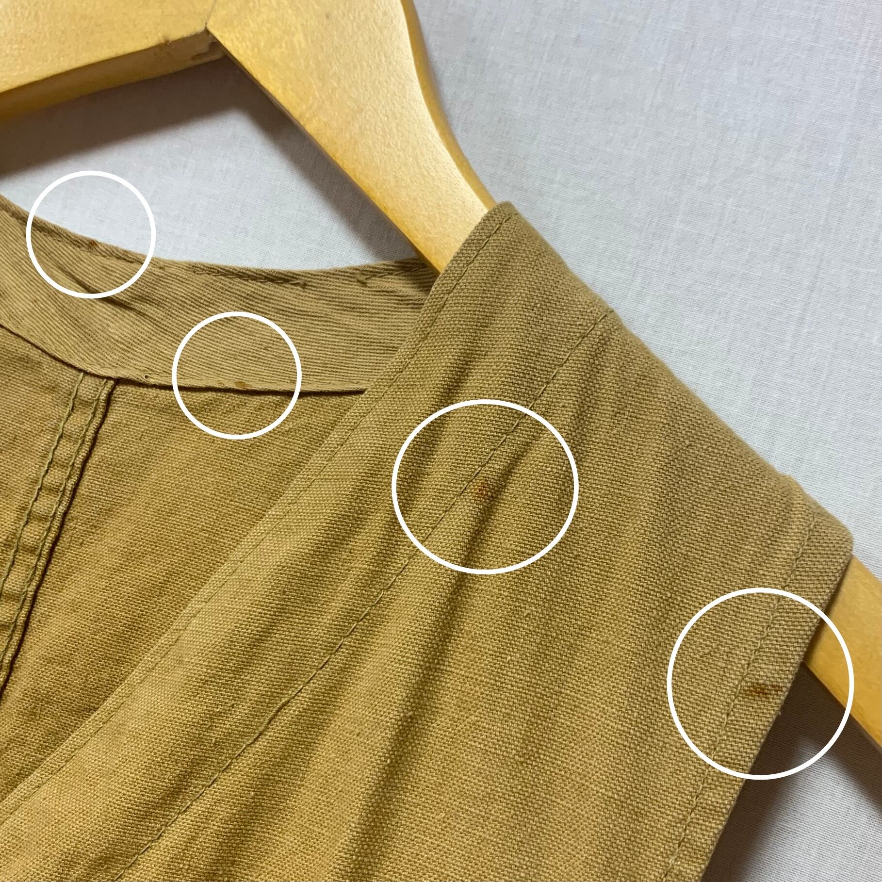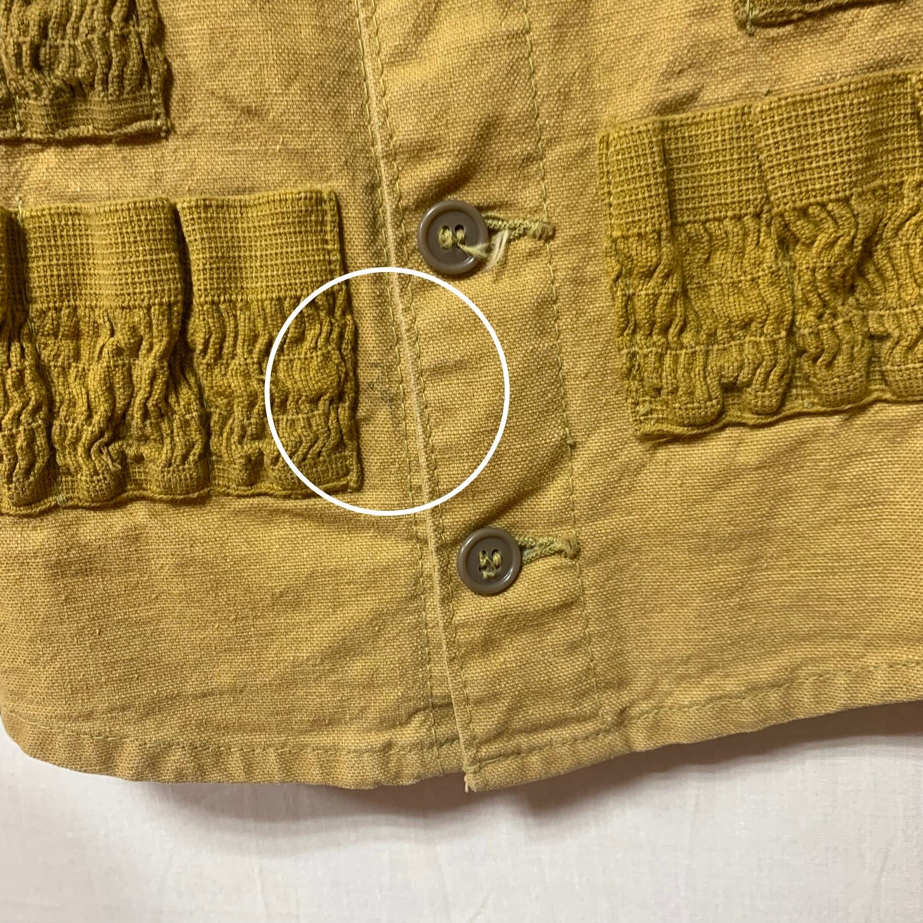 フロント左上・左胸・ボタン横に汚れ、バック左側にダメージがございます。