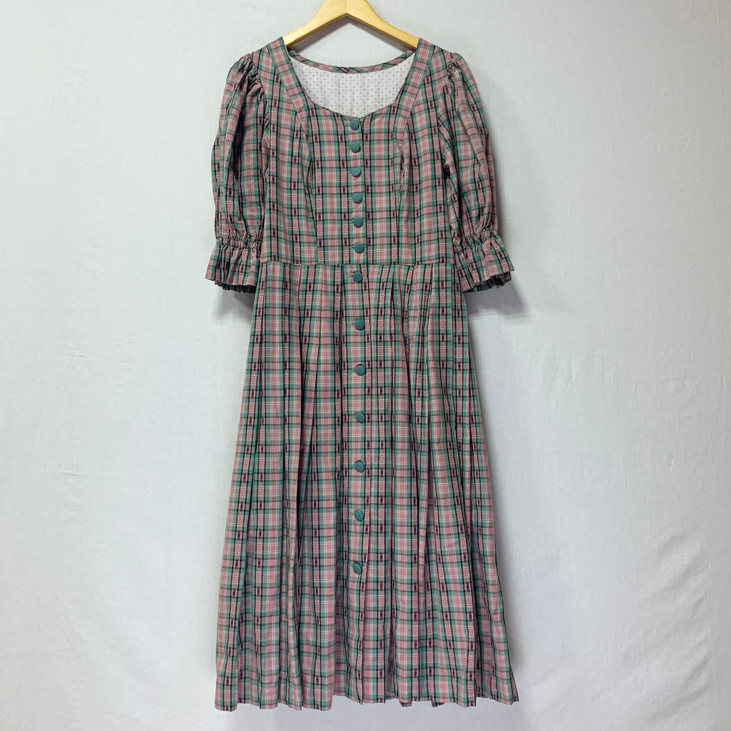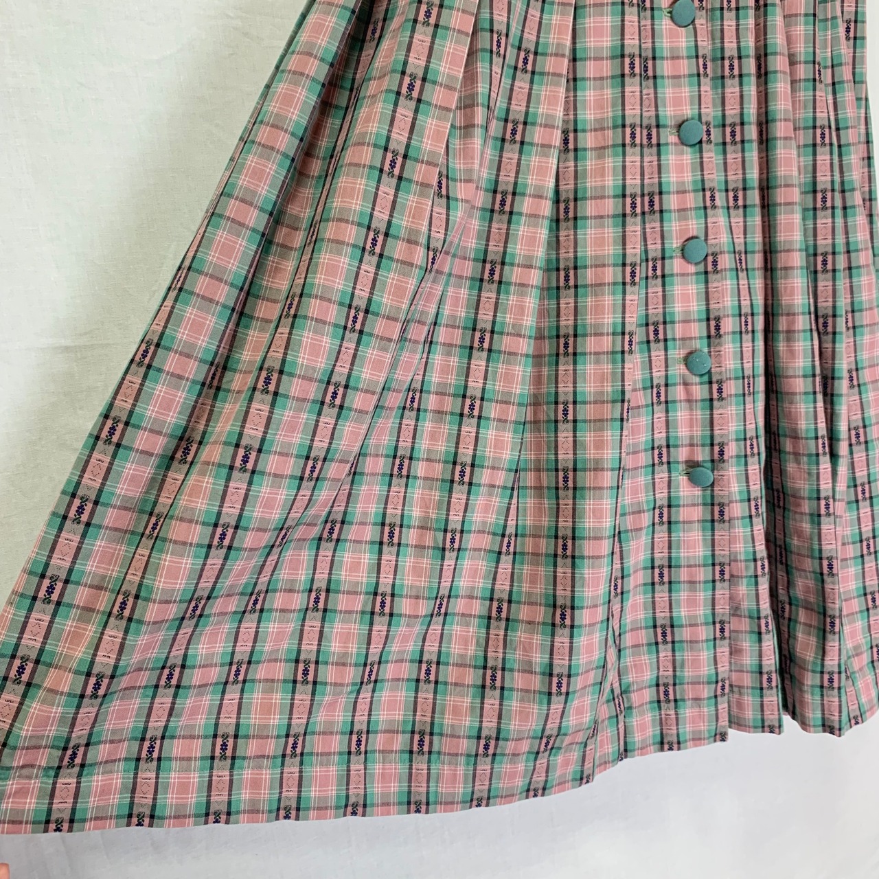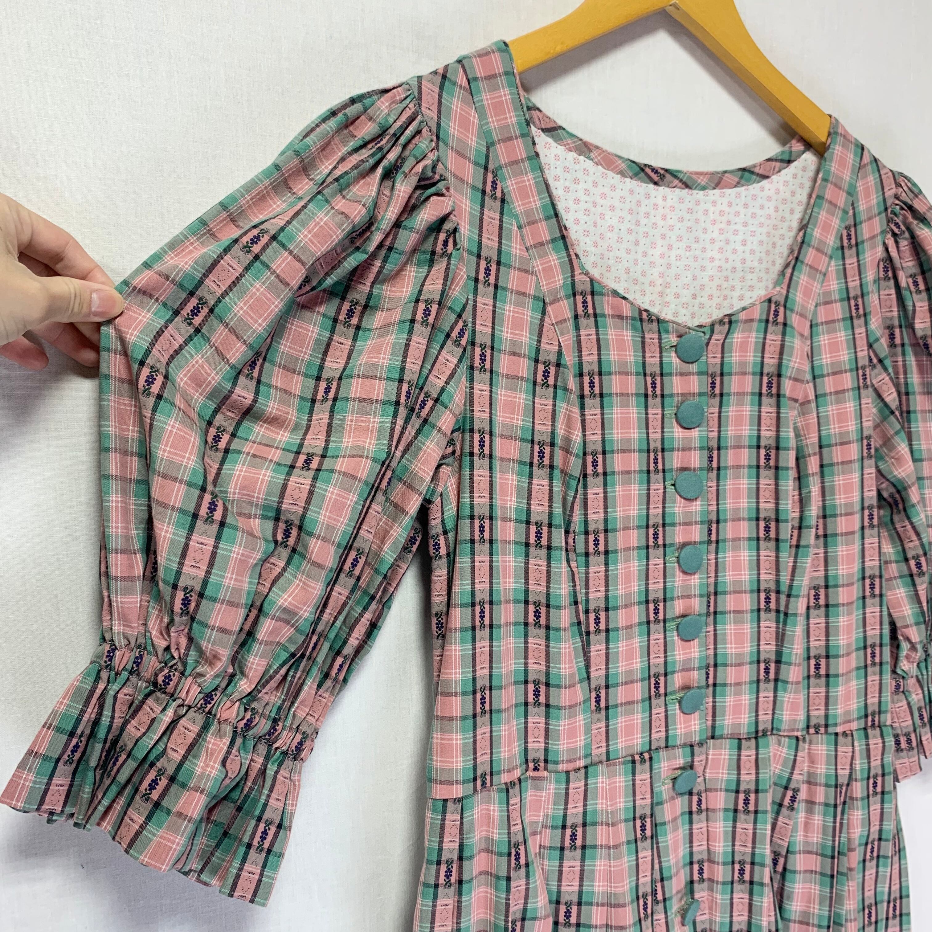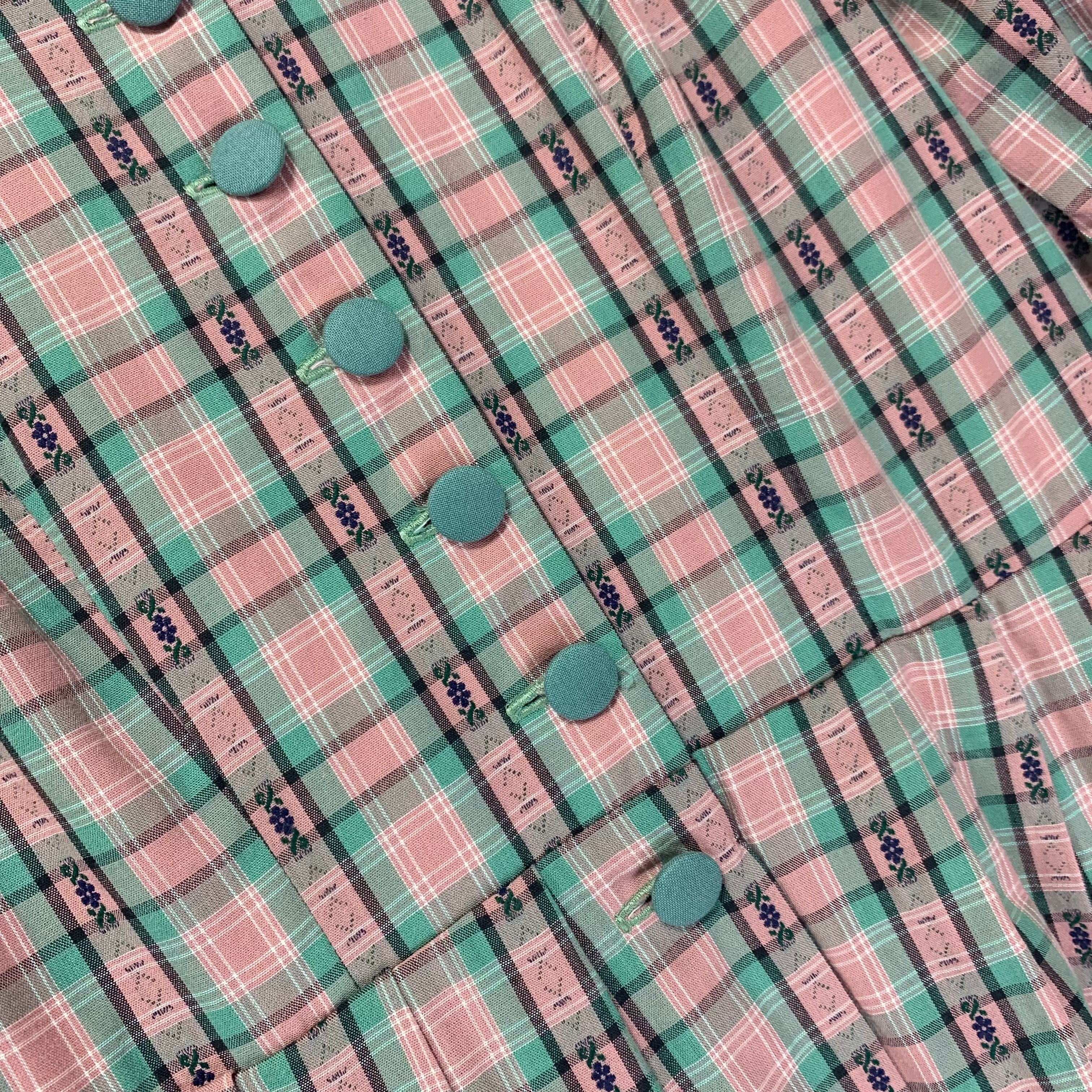 少しくすんだピンクにミントグリーンのチェック柄がかわいいチロリアンワンピース