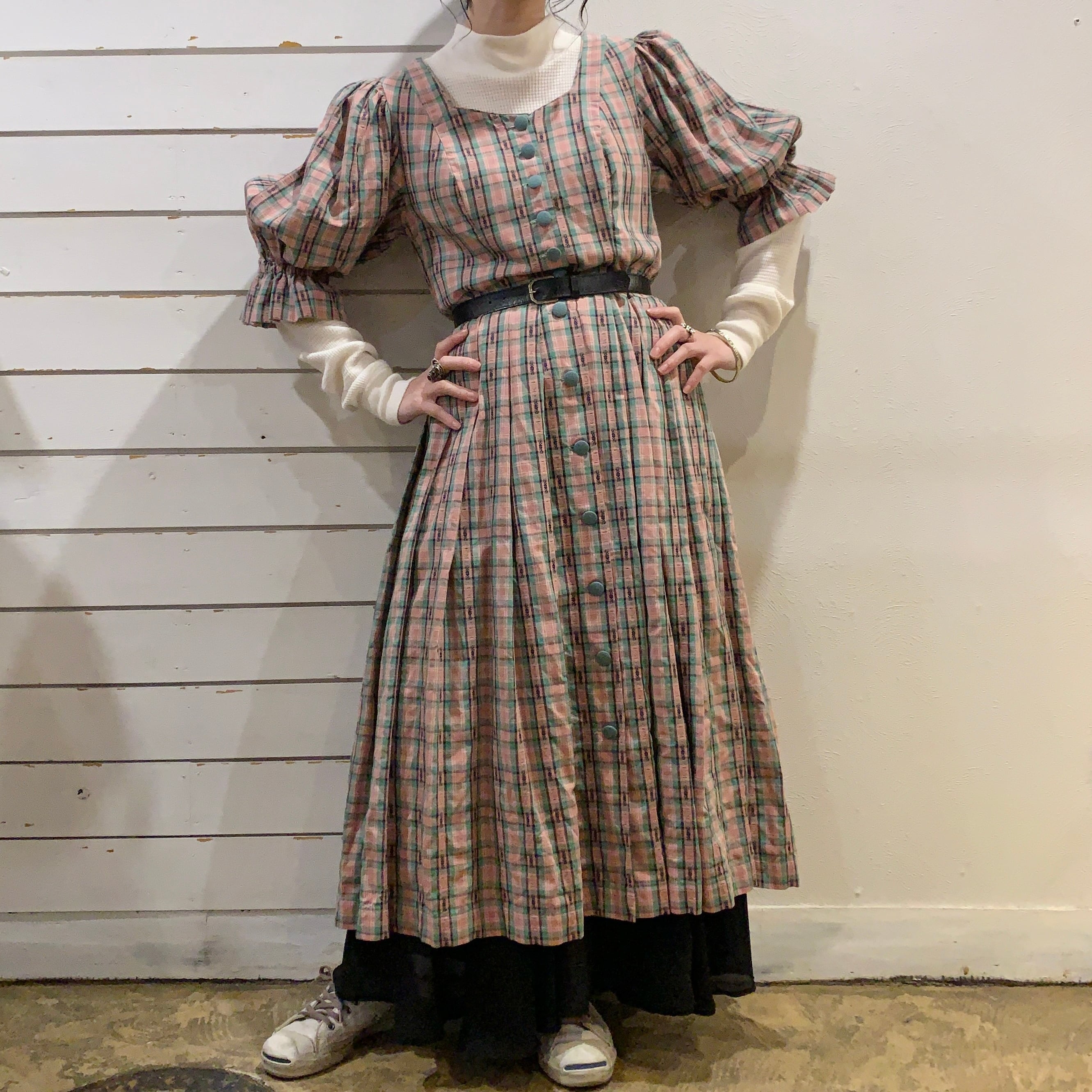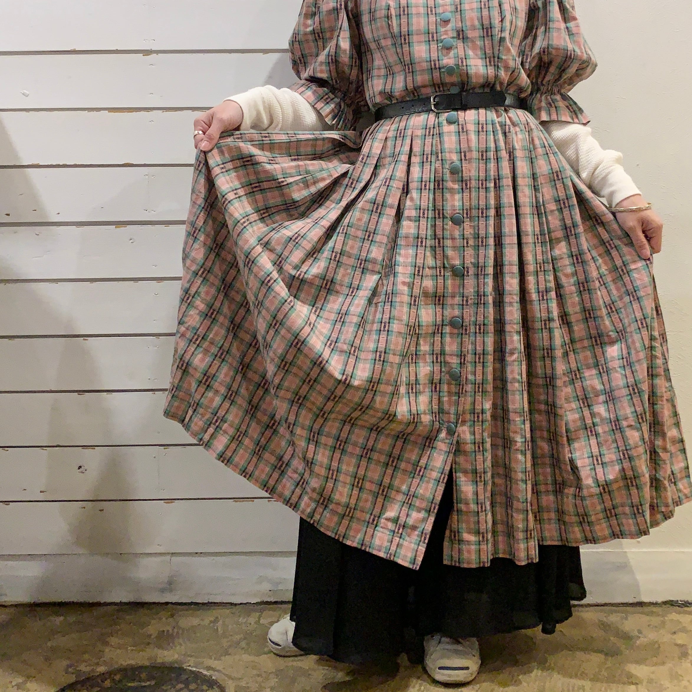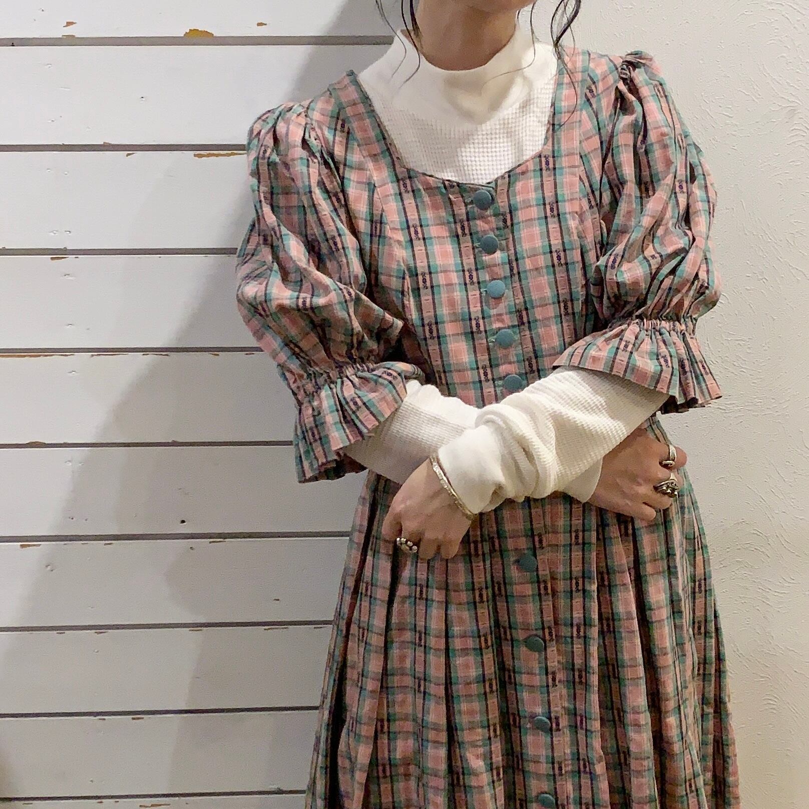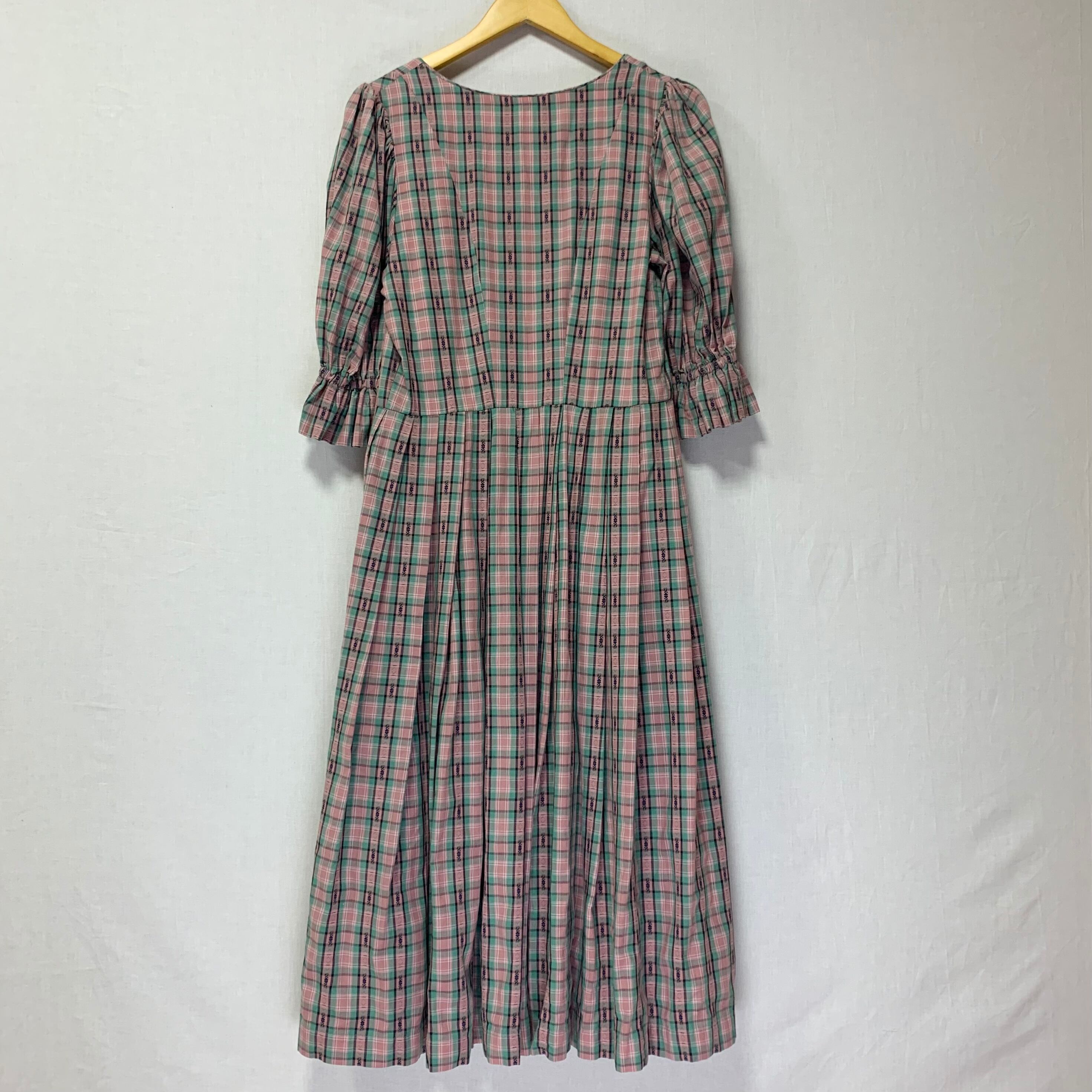 少しくすんだピンクにミントグリーンのチェック柄がかわいいチロリアンワンピース
