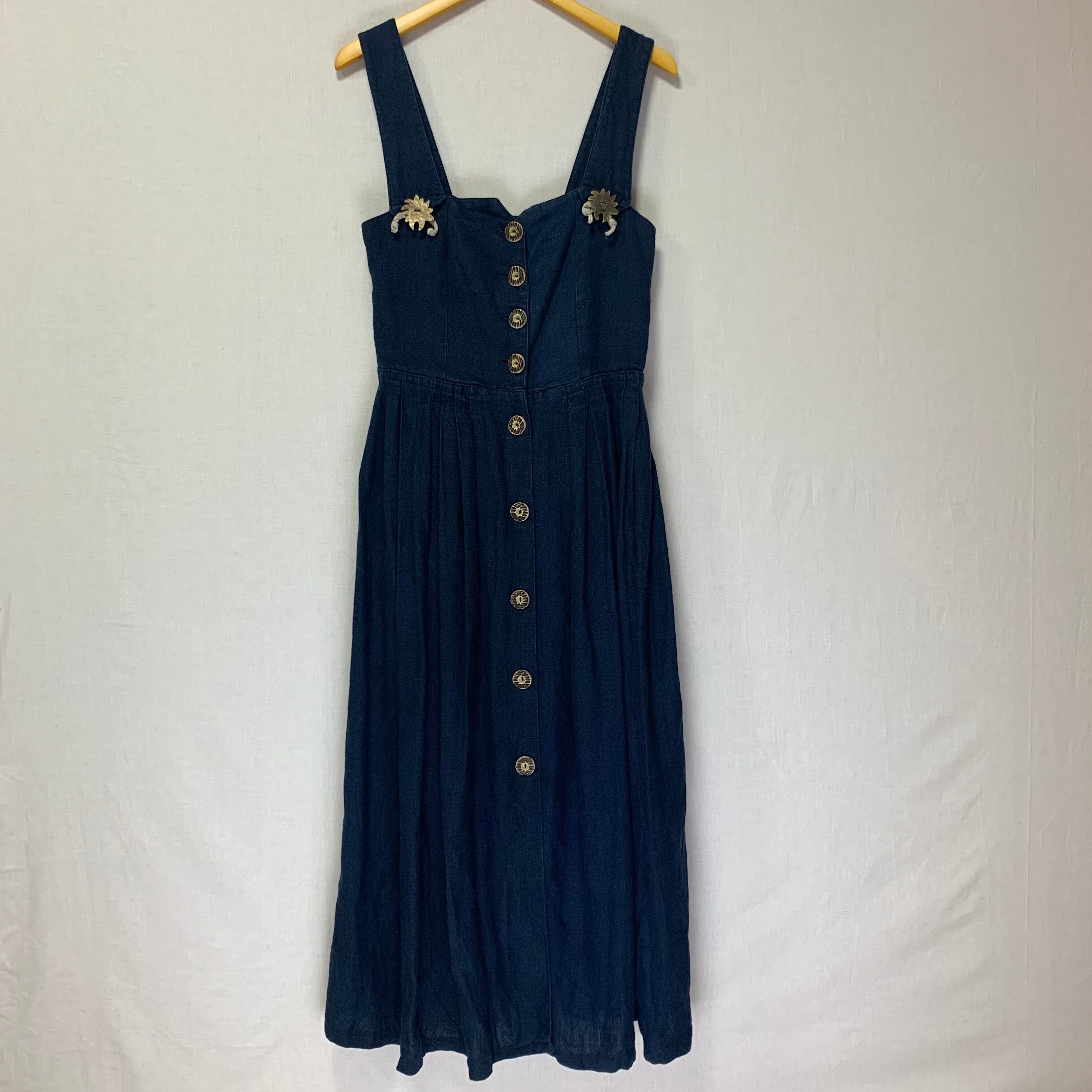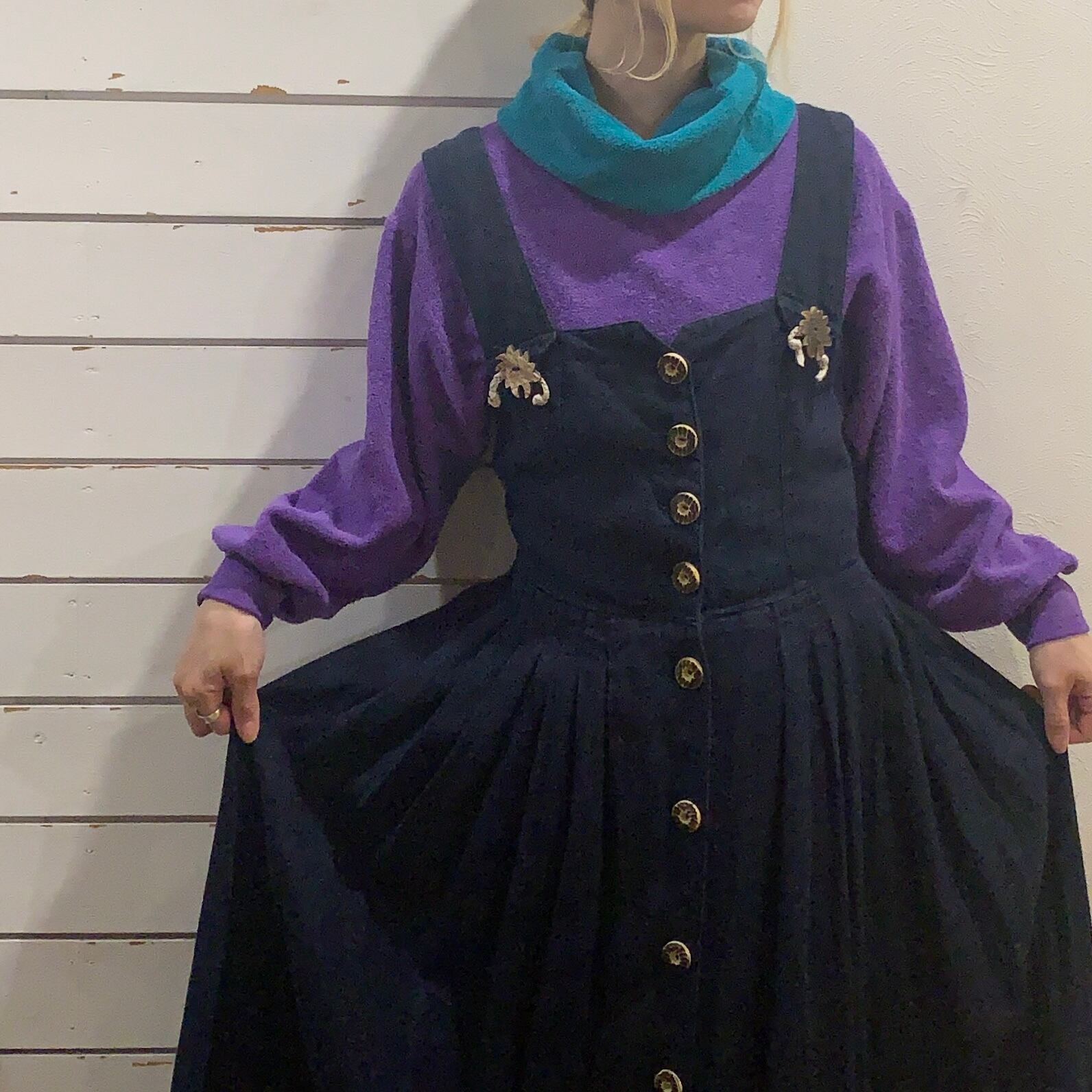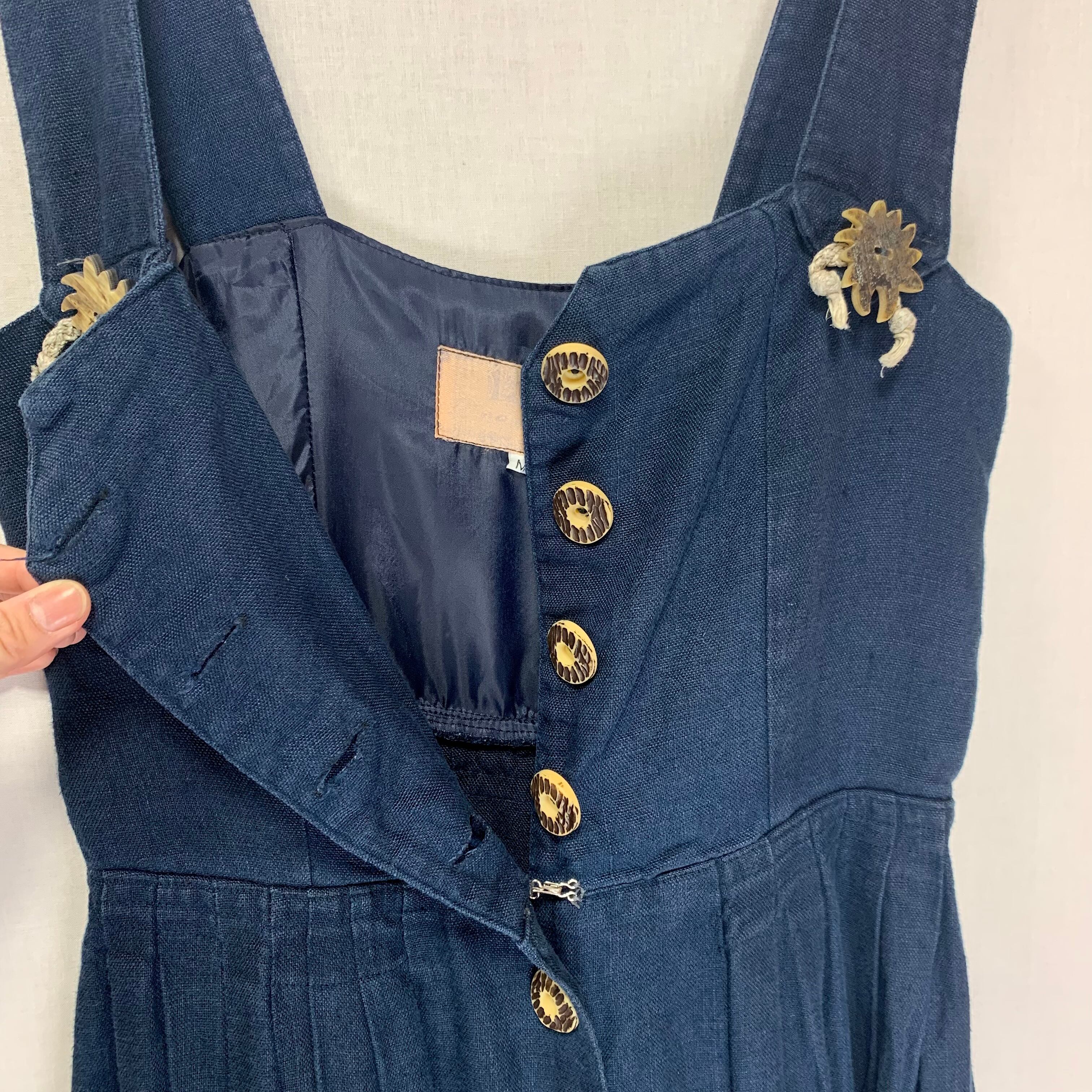 落ち着いたトーンのネイビーにお花のようなウッドボタンがポイントのチロリアンワンピース