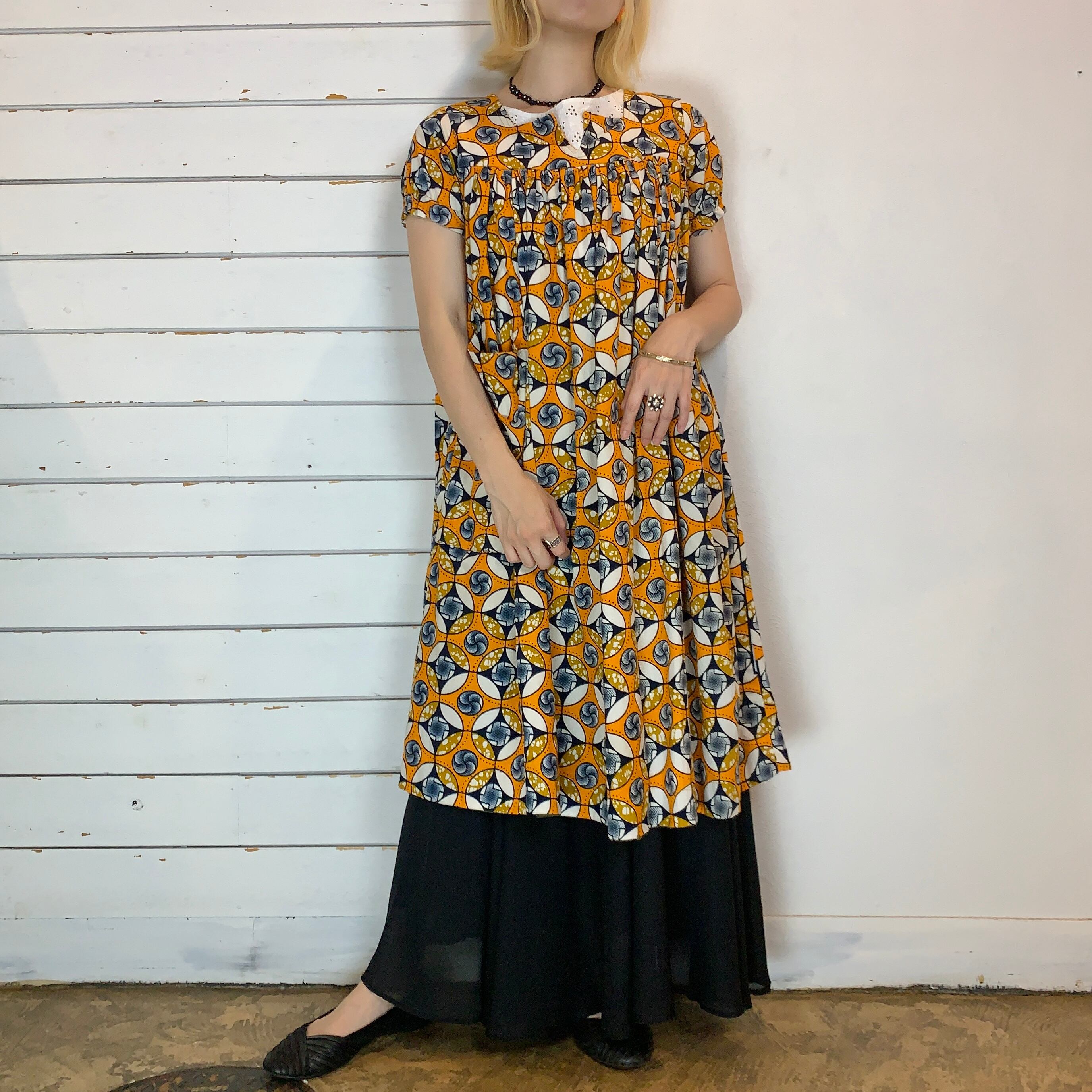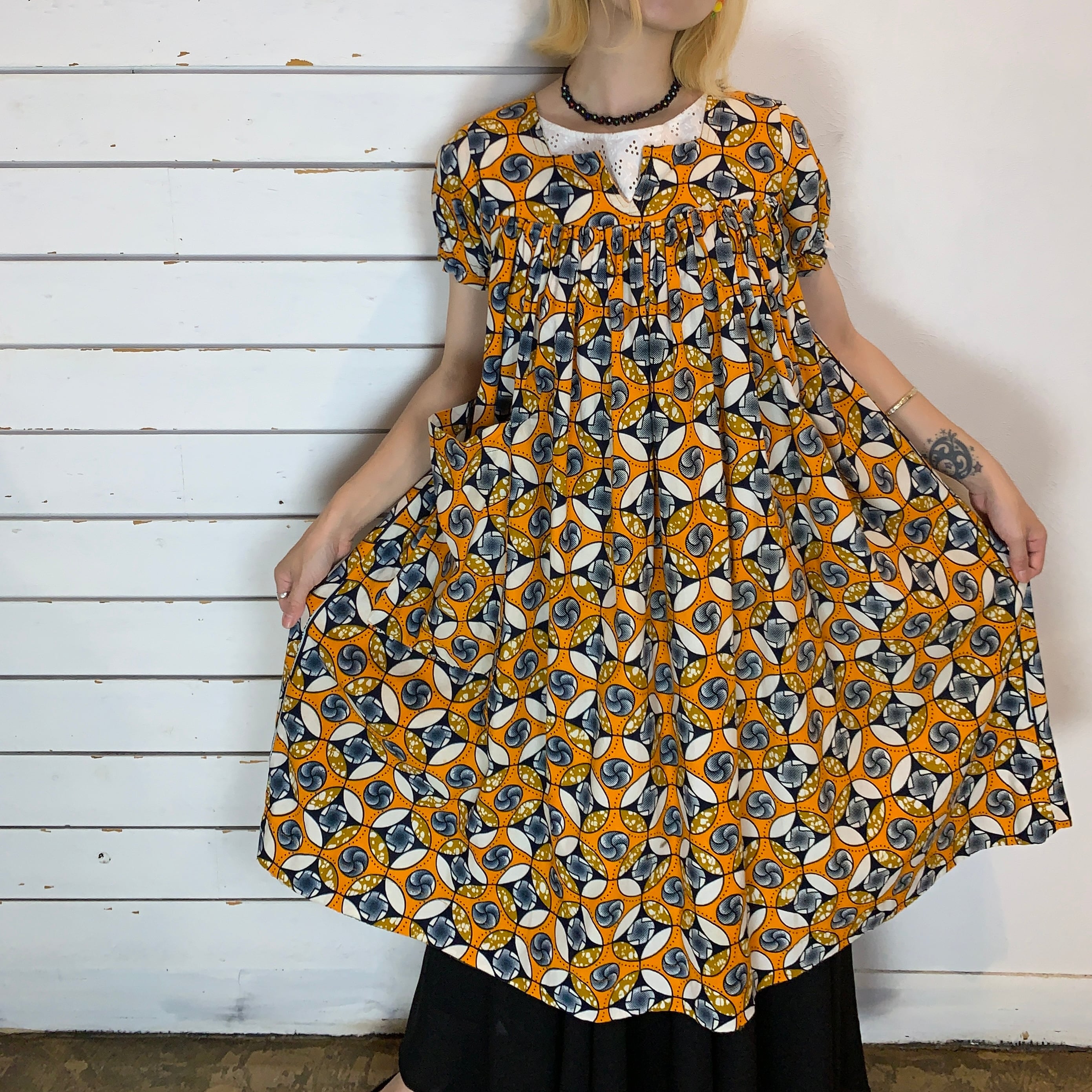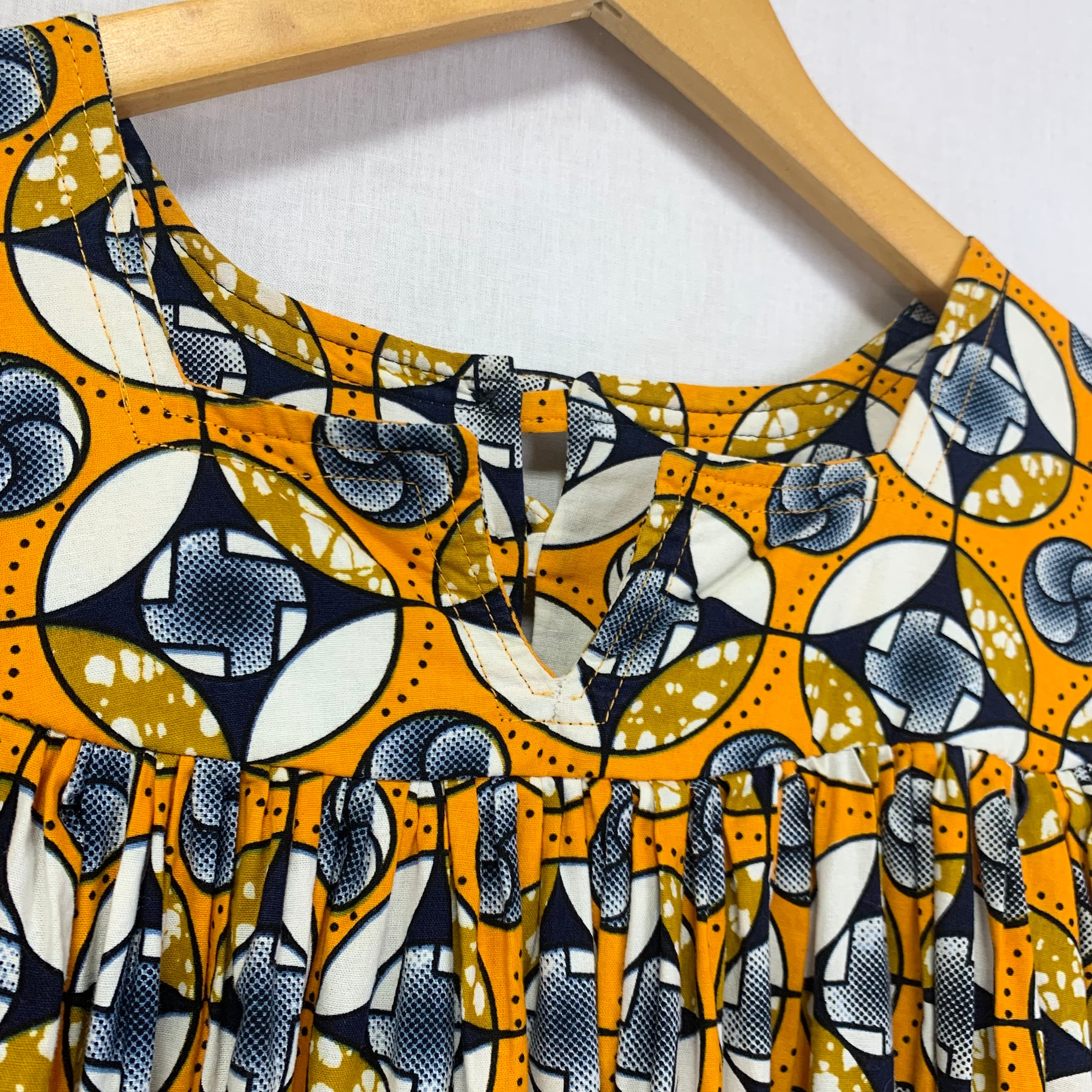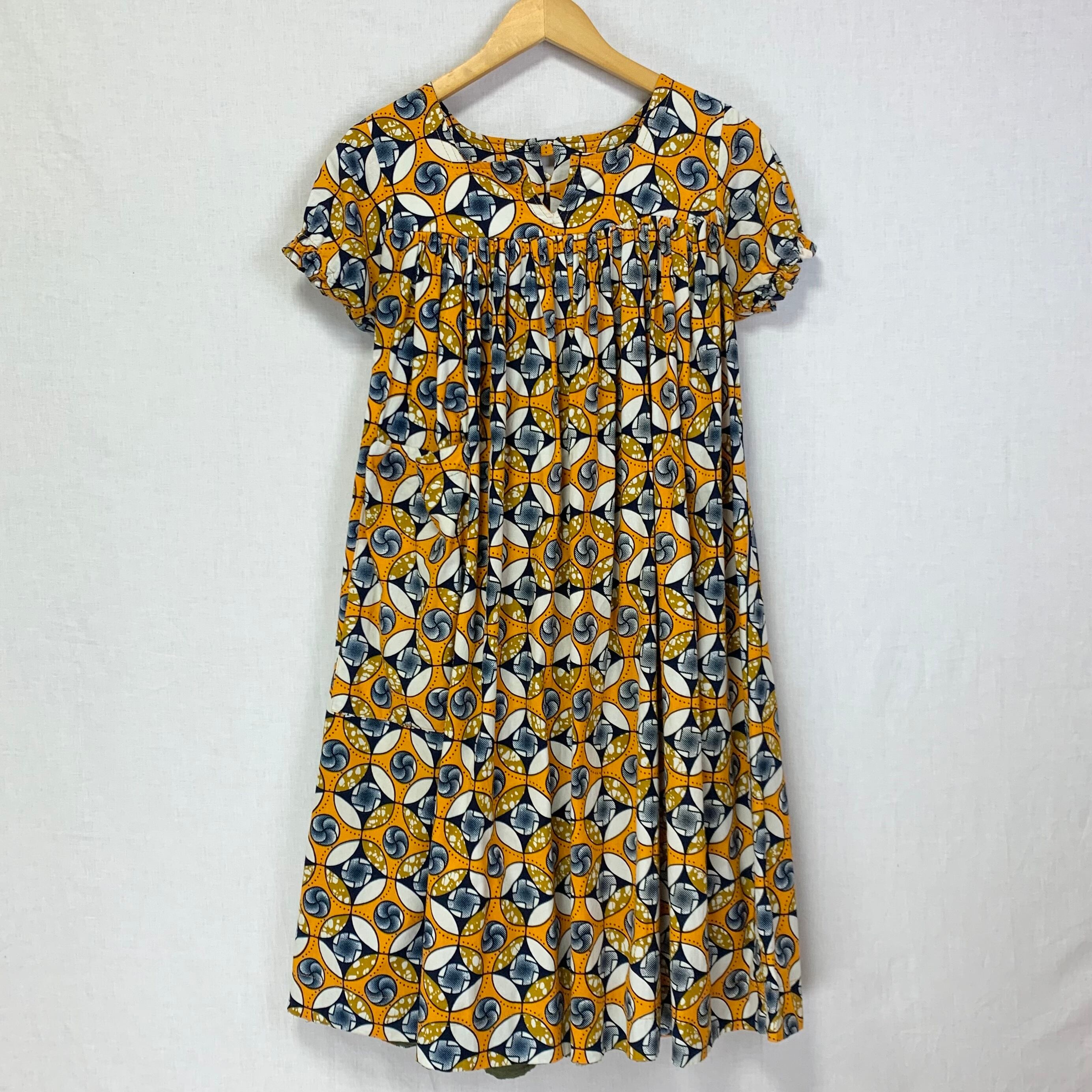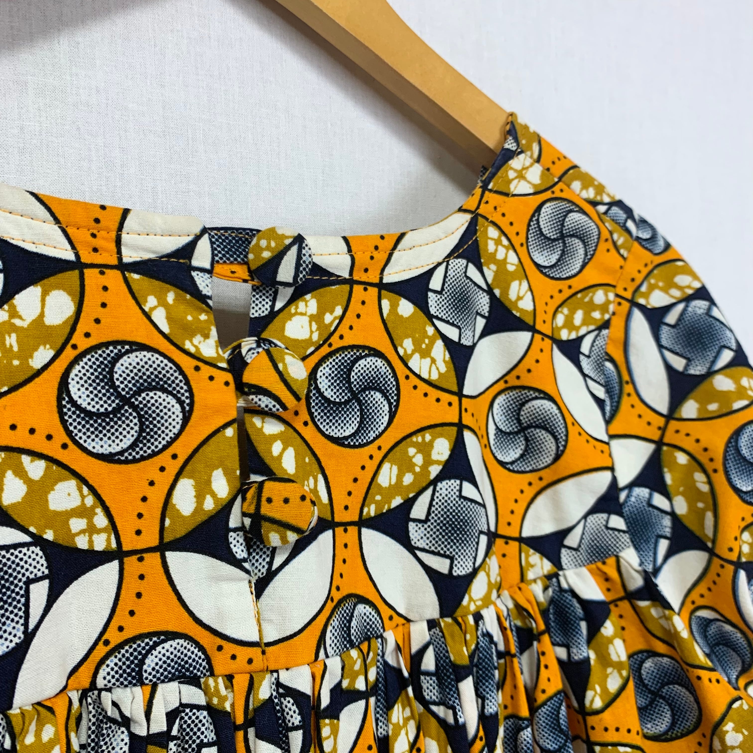 オレンジの黄色の間の色味にネイビー混じりのジオメトリック柄が大人な雰囲気のアフリカンバティックワンピ