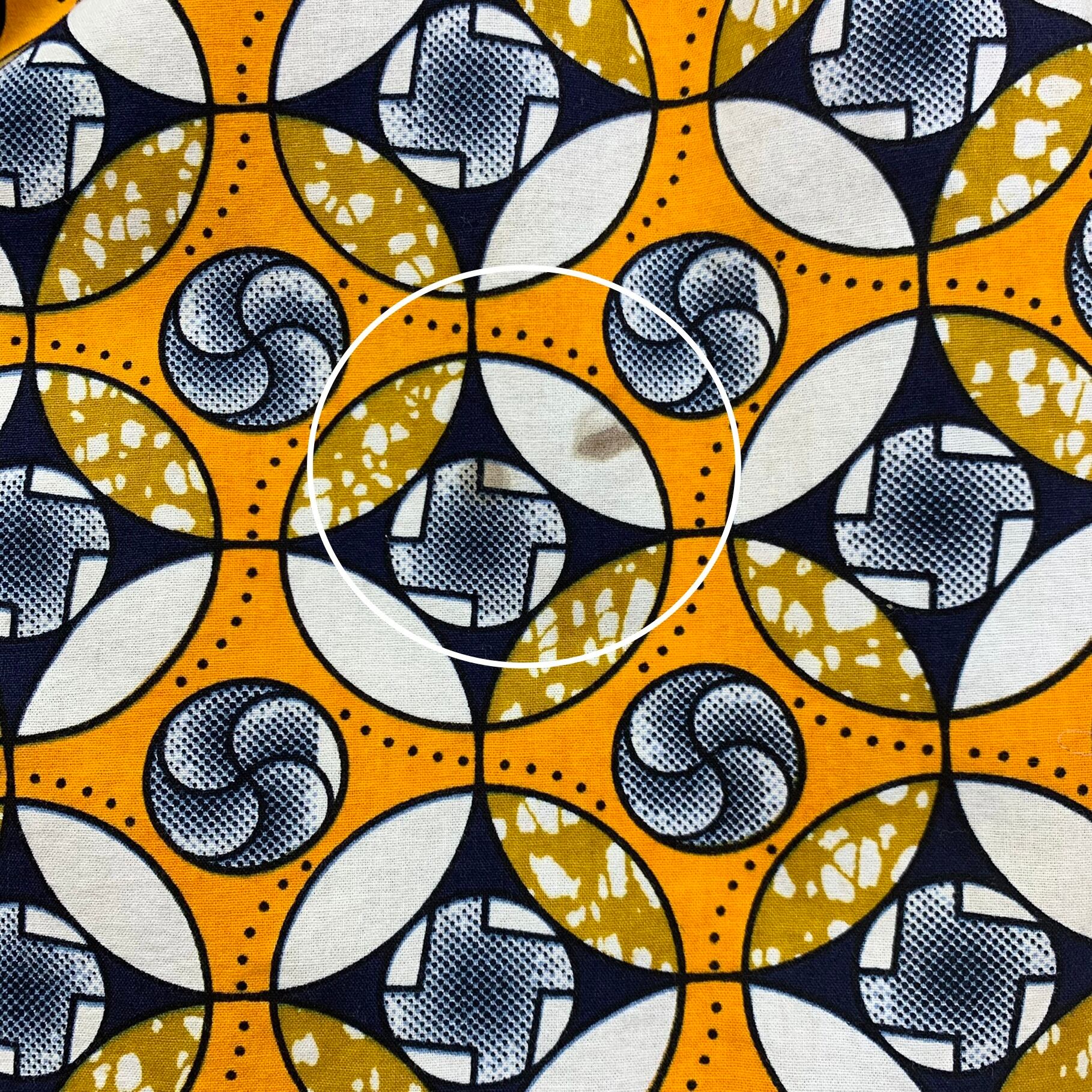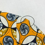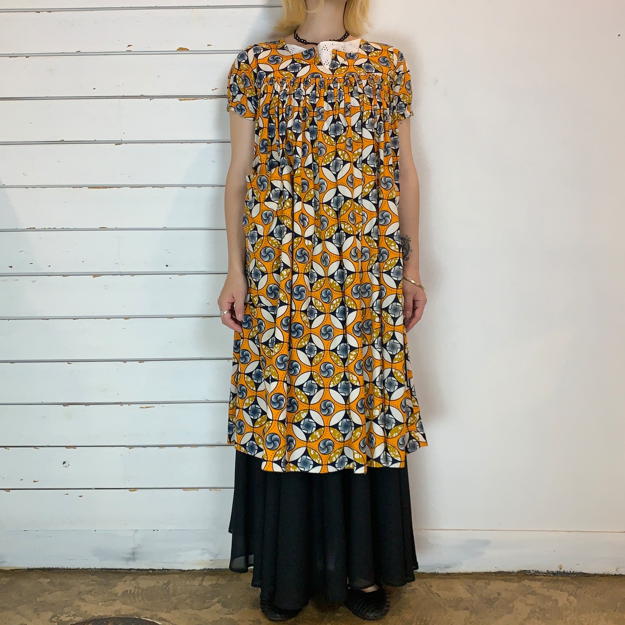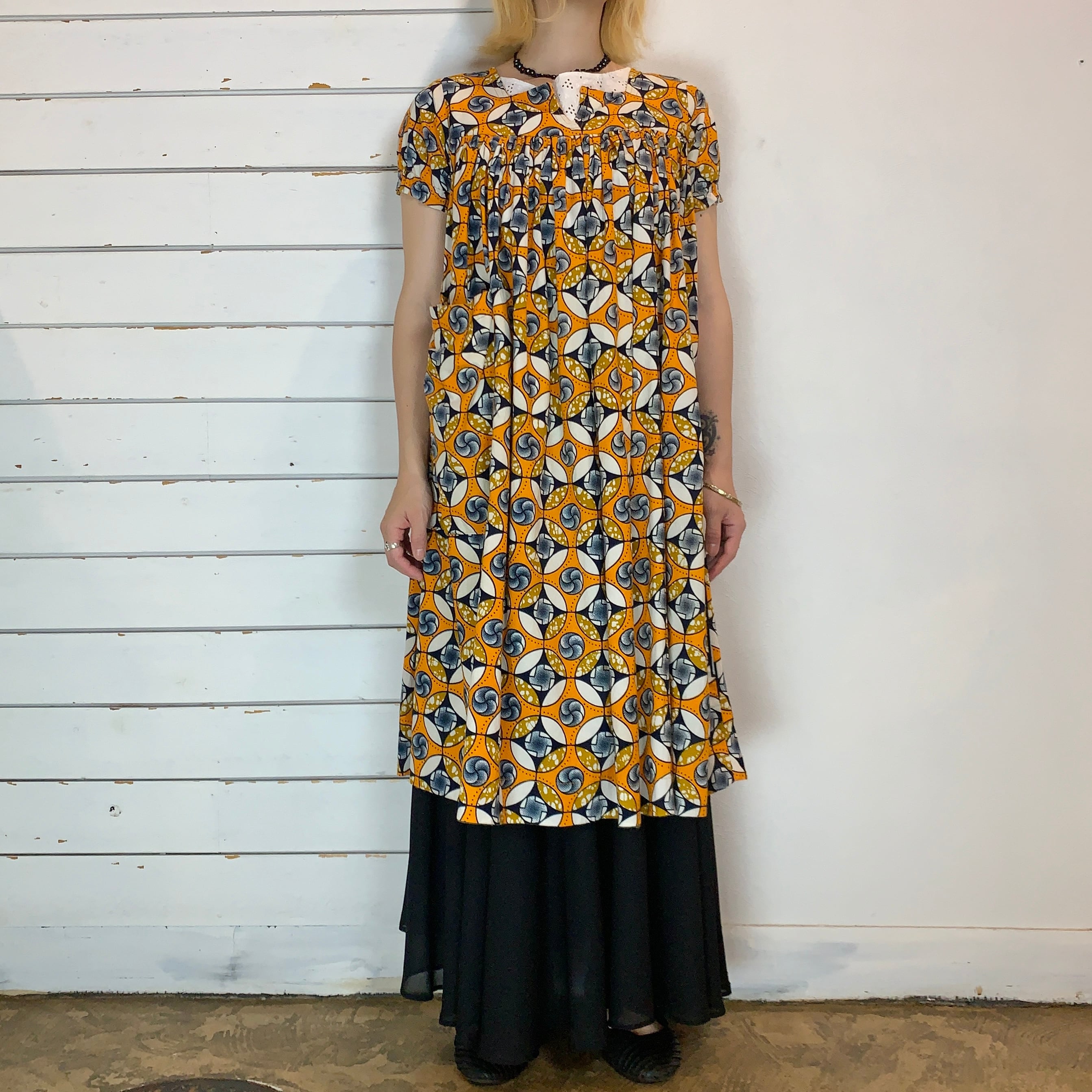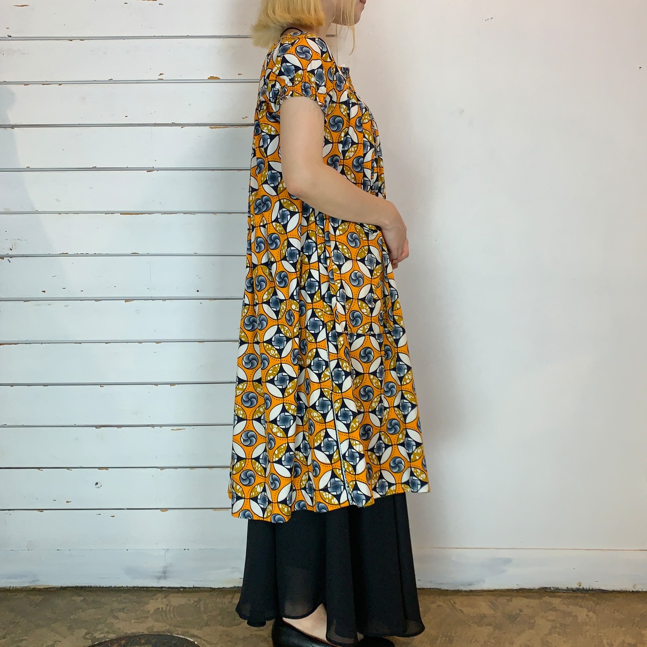 オレンジの黄色の間の色味にネイビー混じりのジオメトリック柄が大人な雰囲気のアフリカンバティックワンピ