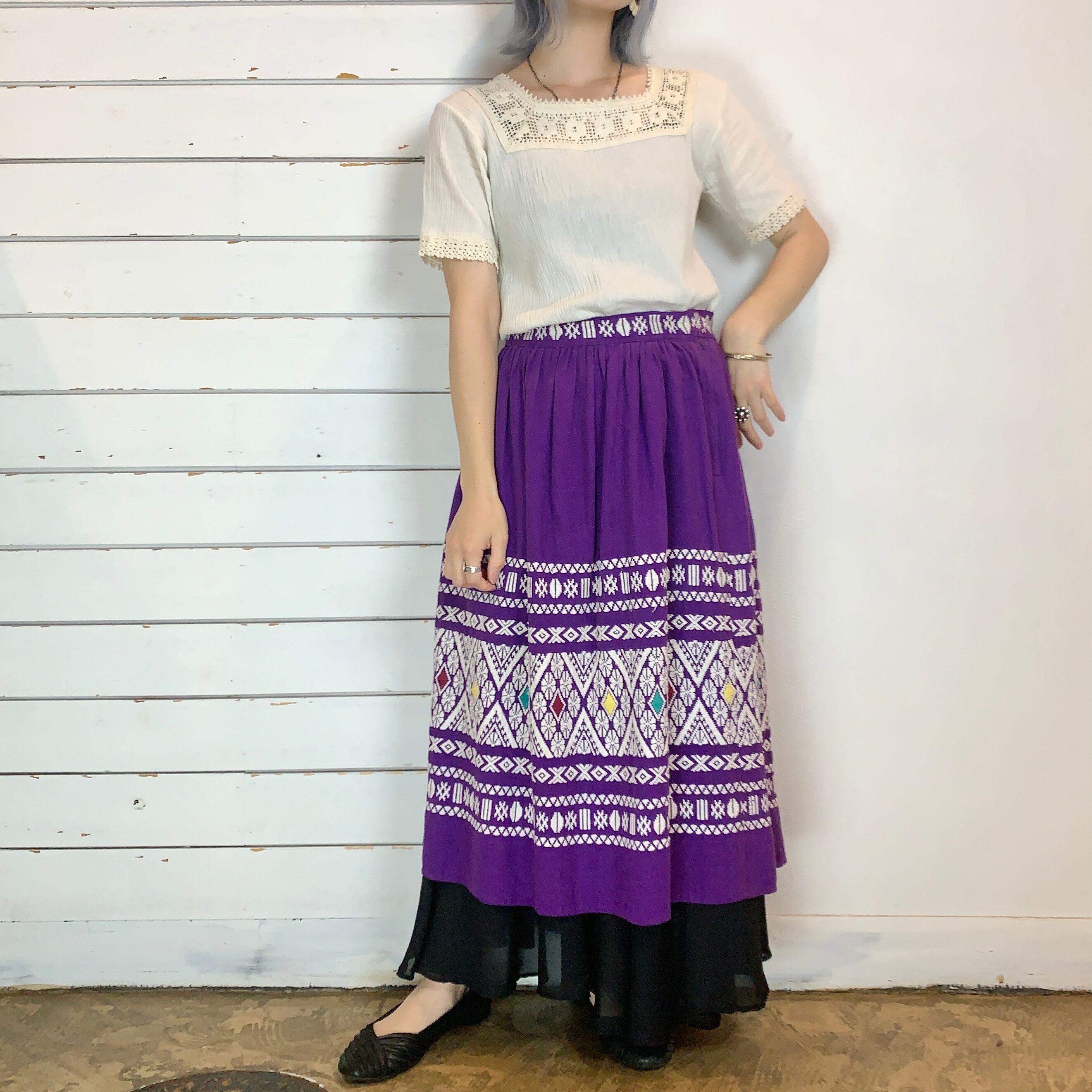 パキッとしたパープルベースのグアテマラ刺繍のスカート