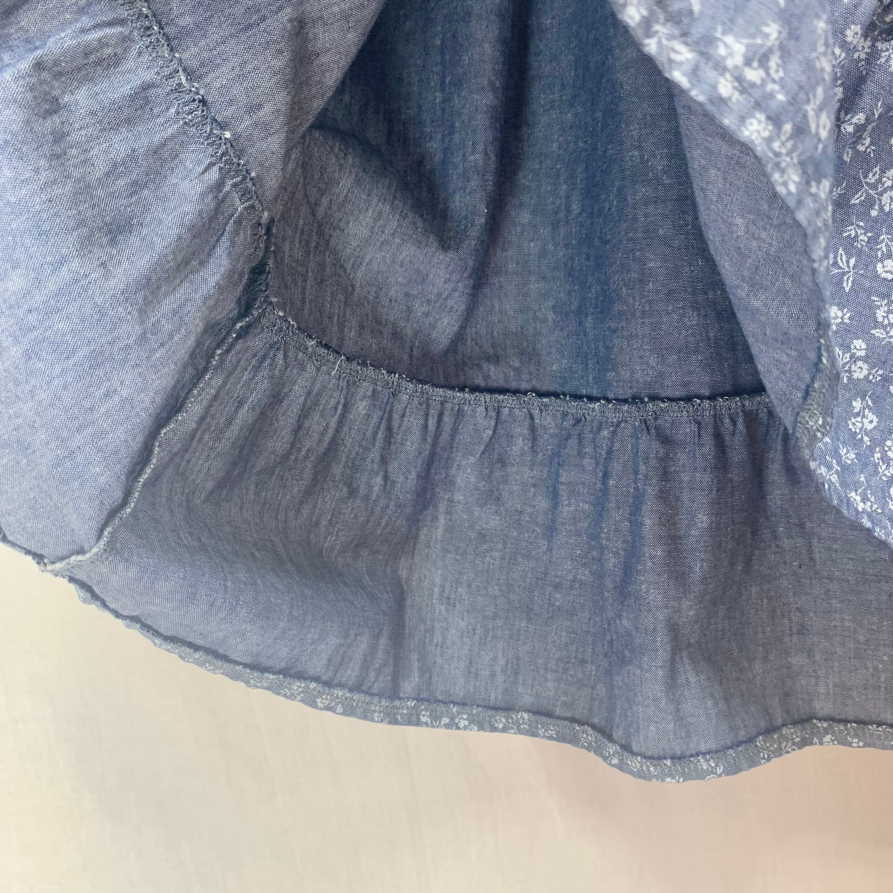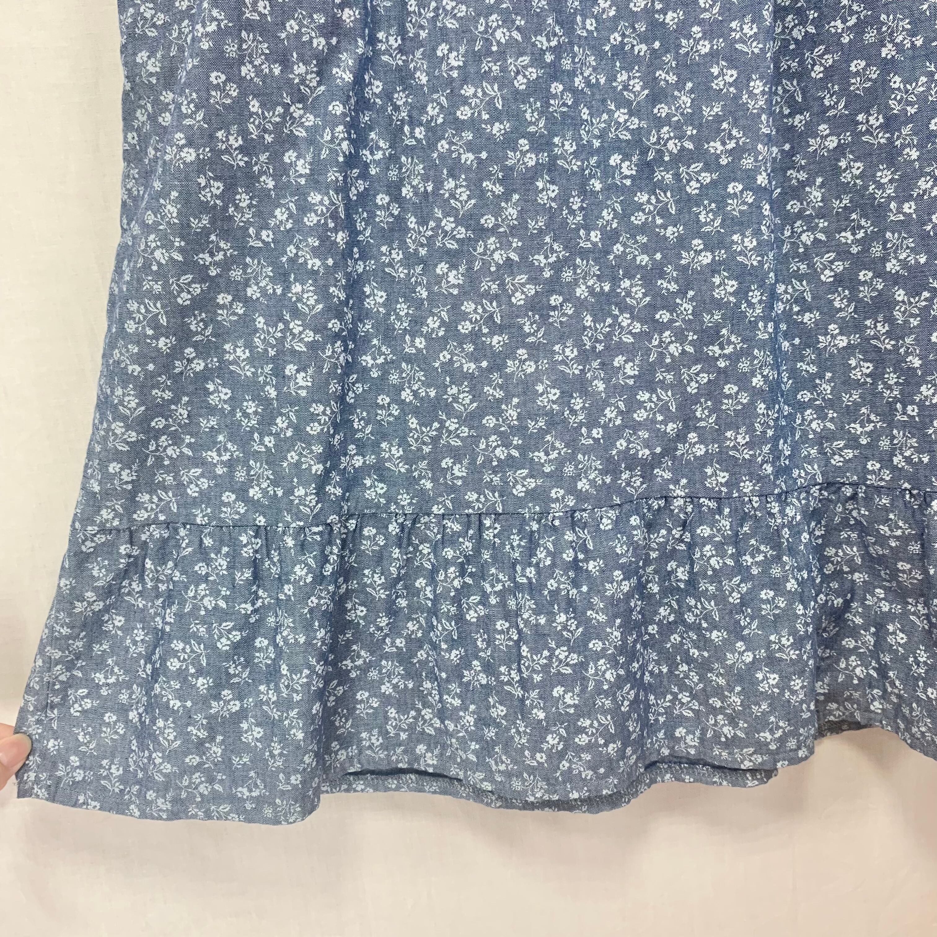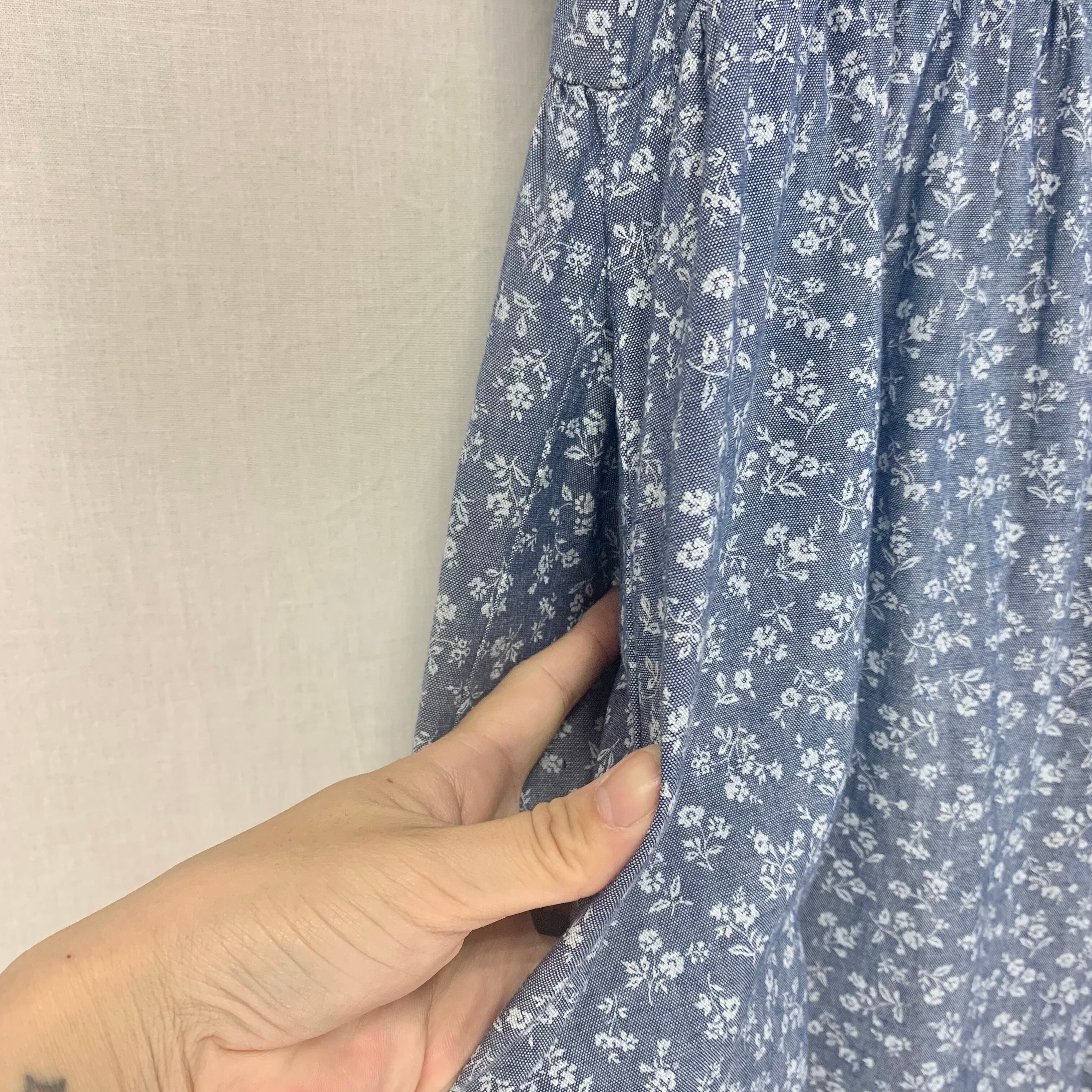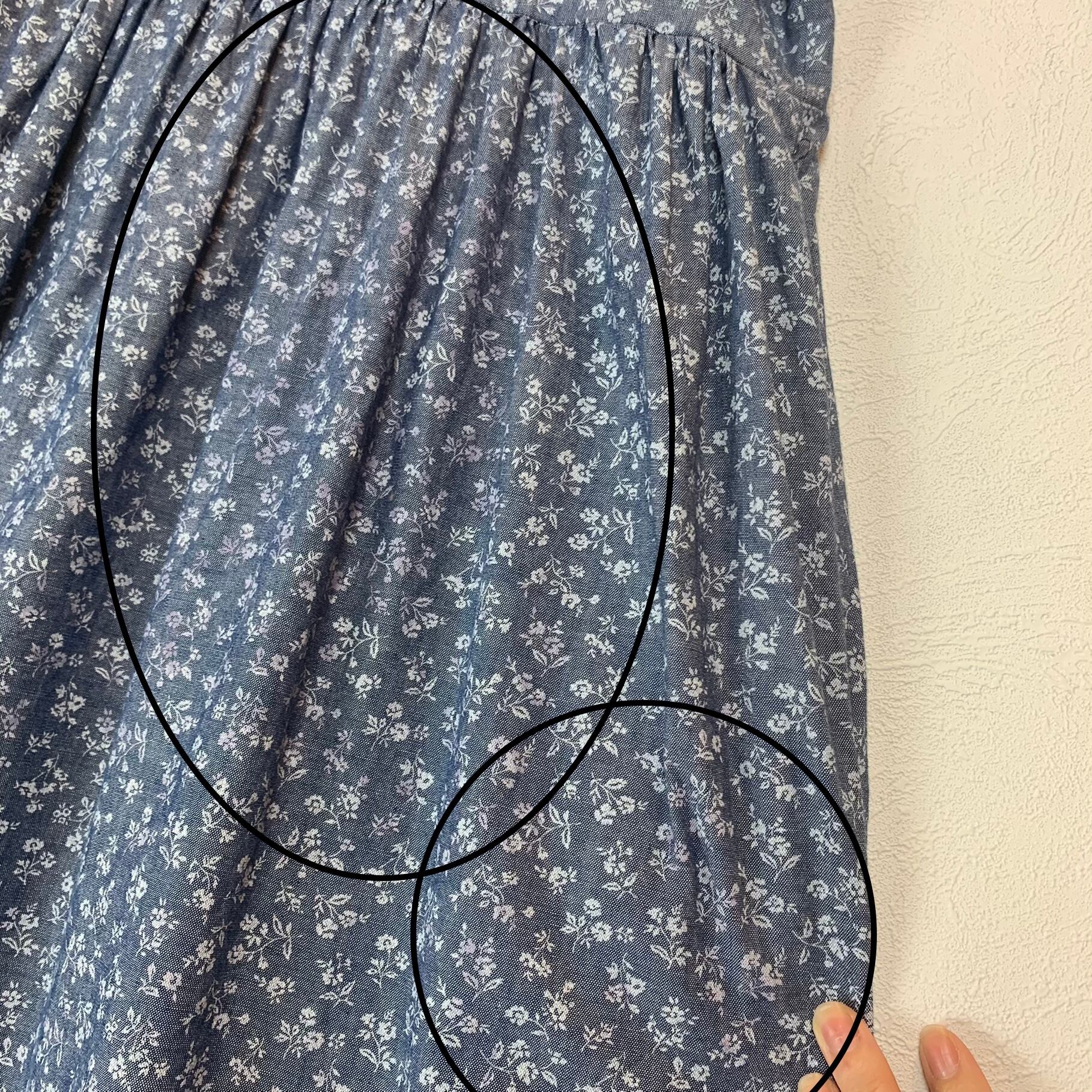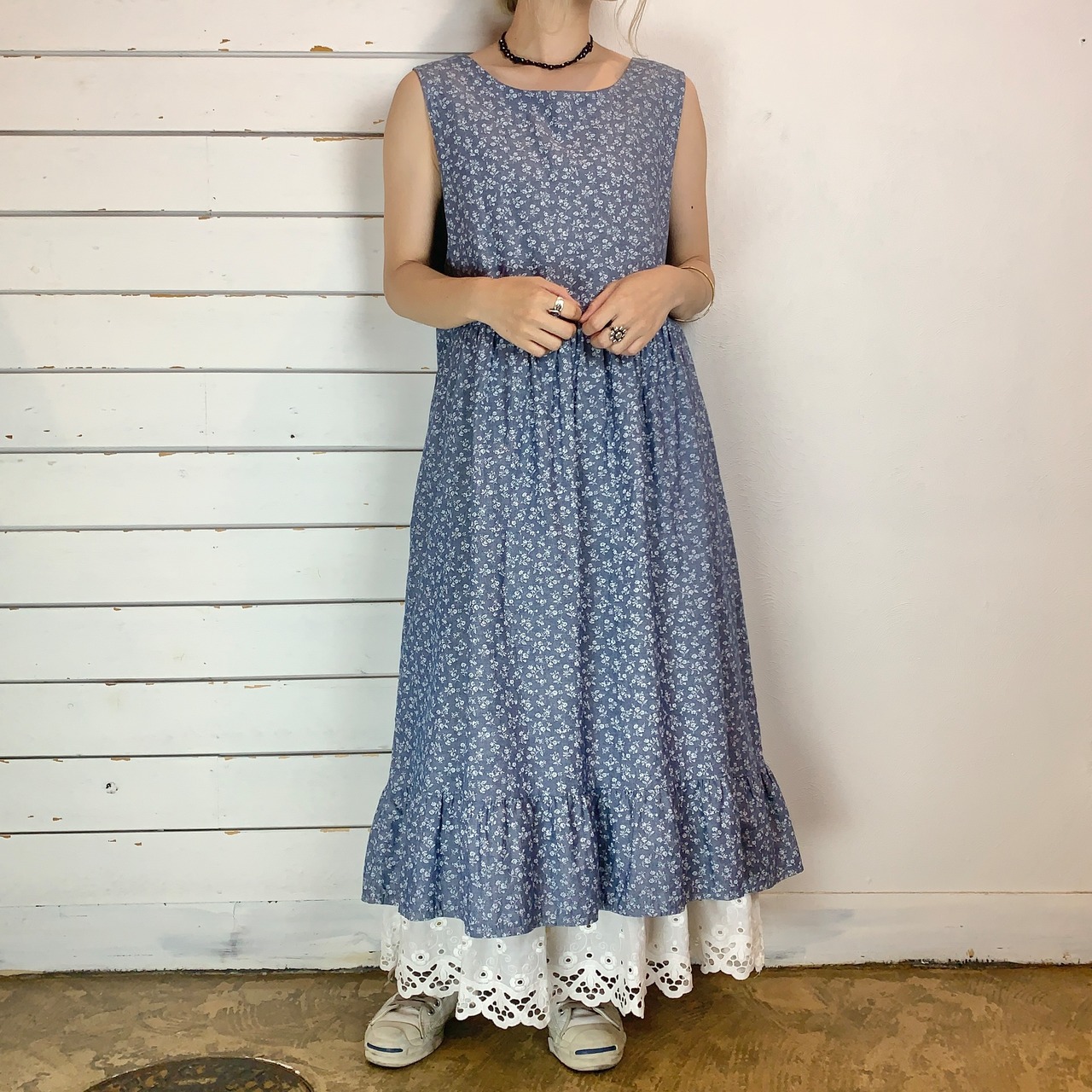 シャンブレー色に白の小花柄とカジュアルに着用しやすいワンピース