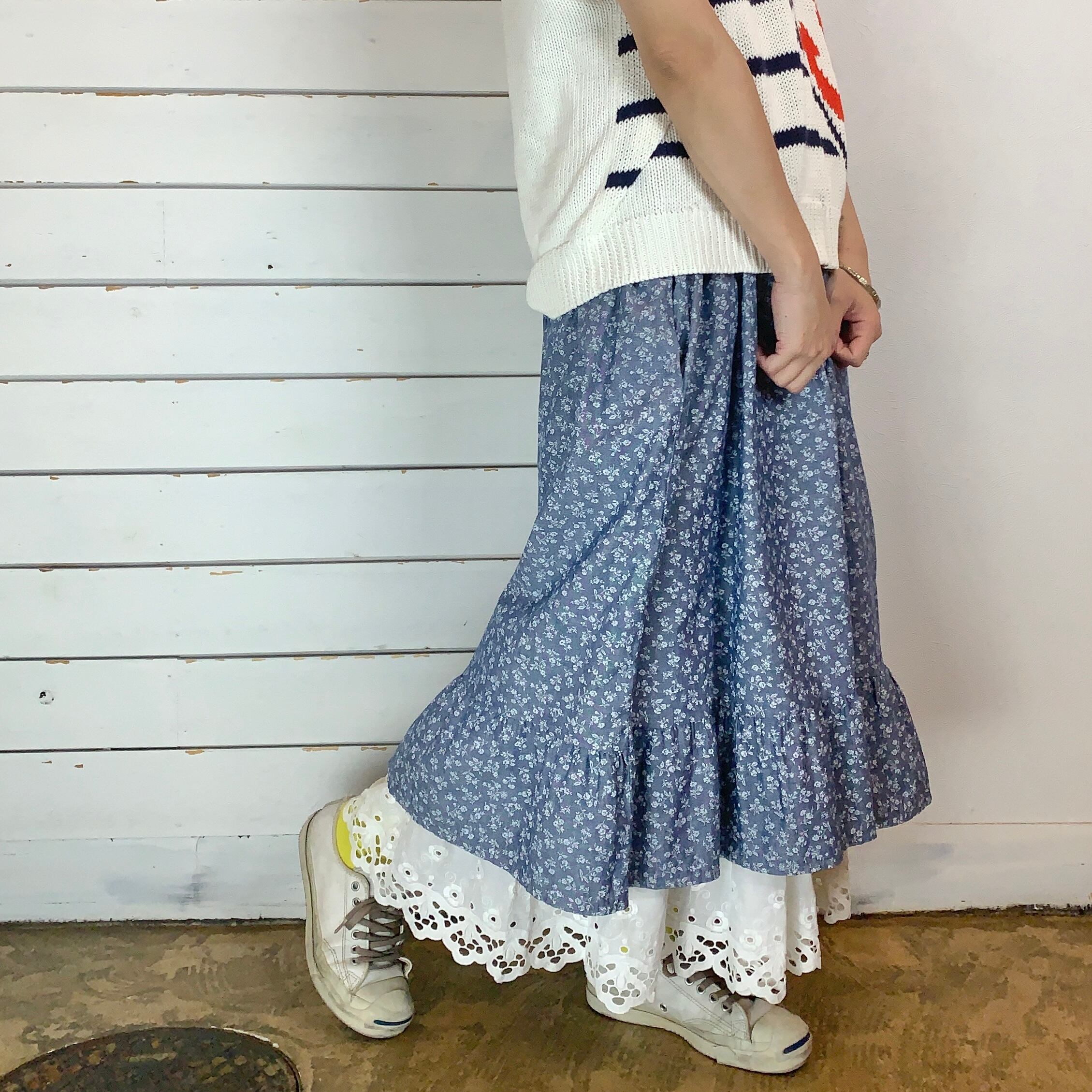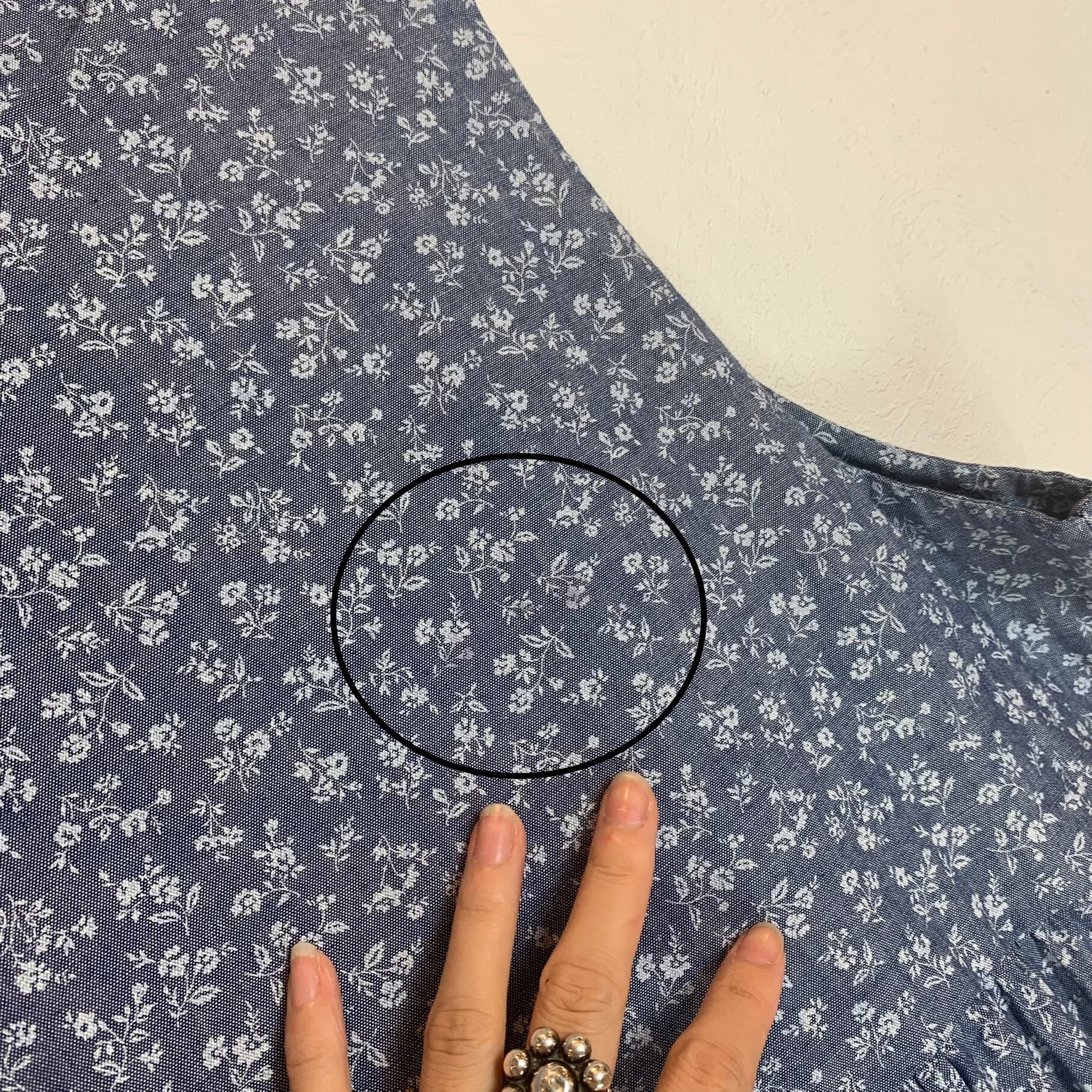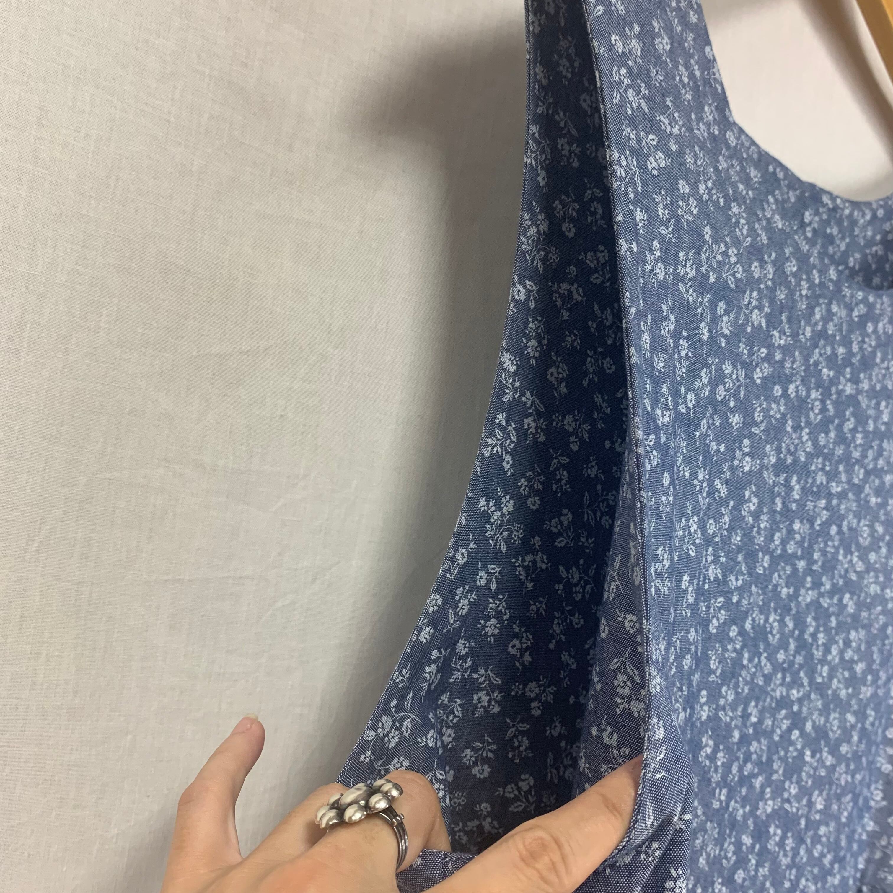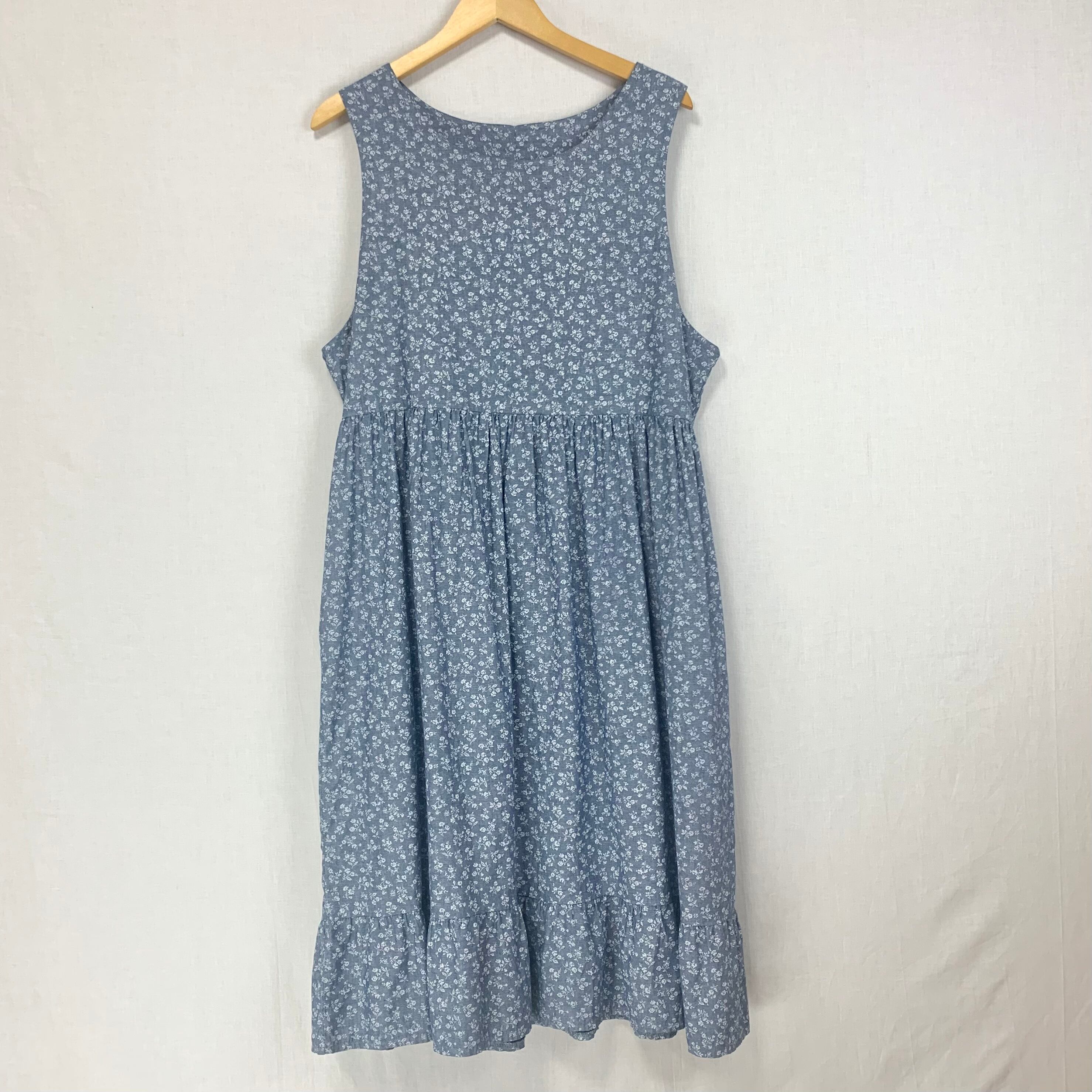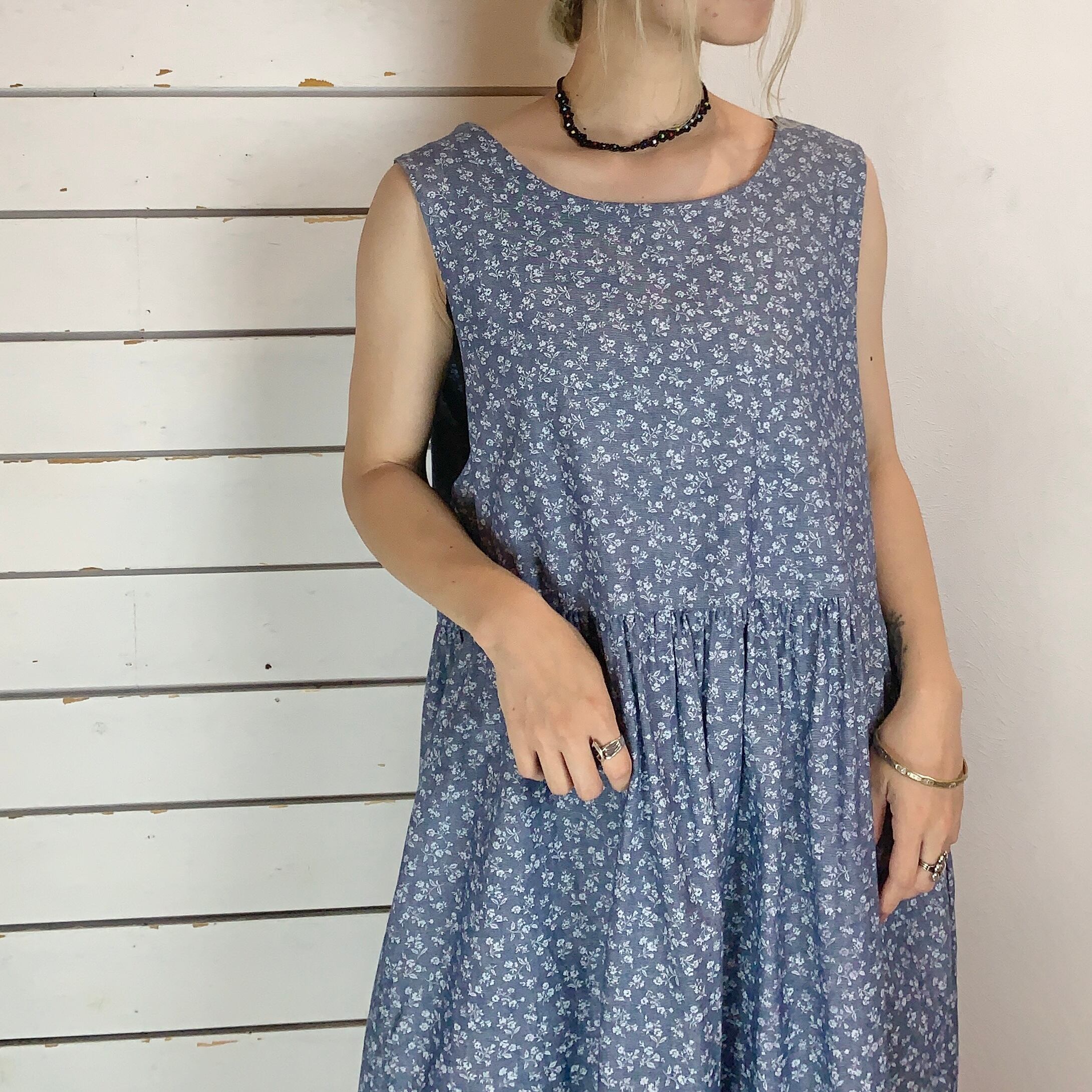 シャンブレー色に白の小花柄とカジュアルに着用しやすいワンピース