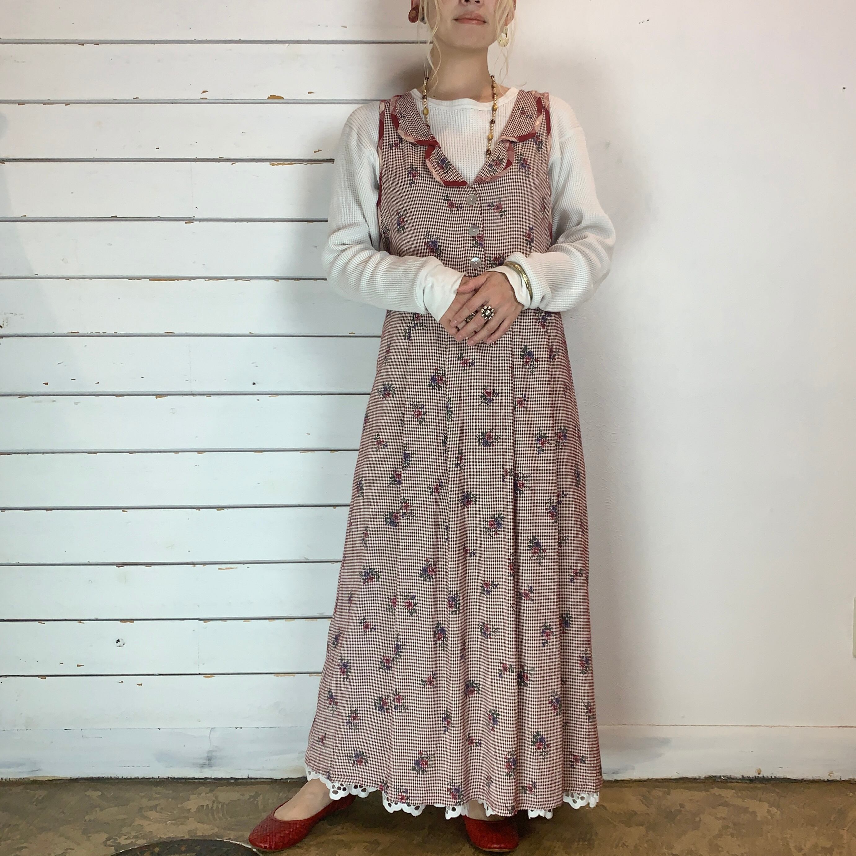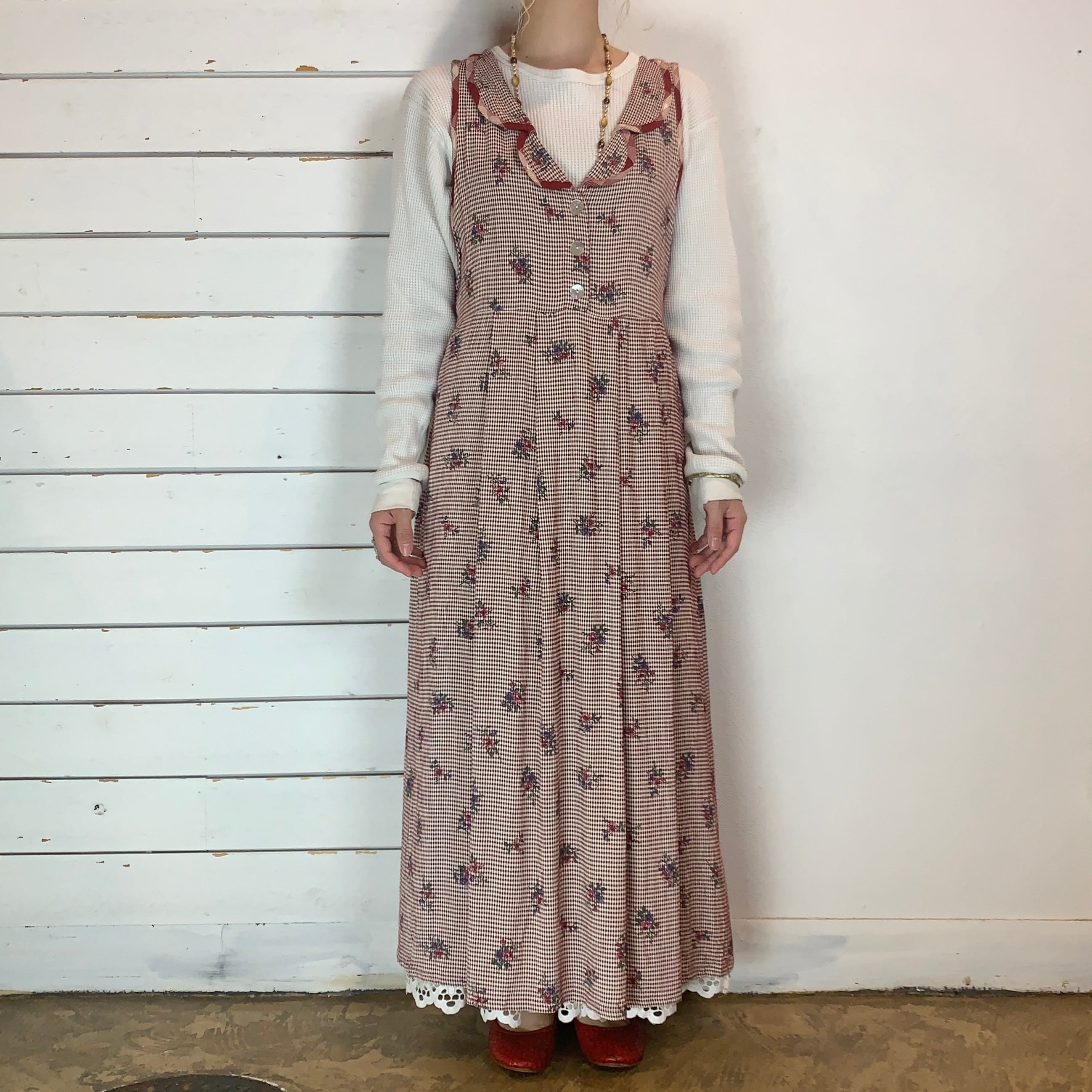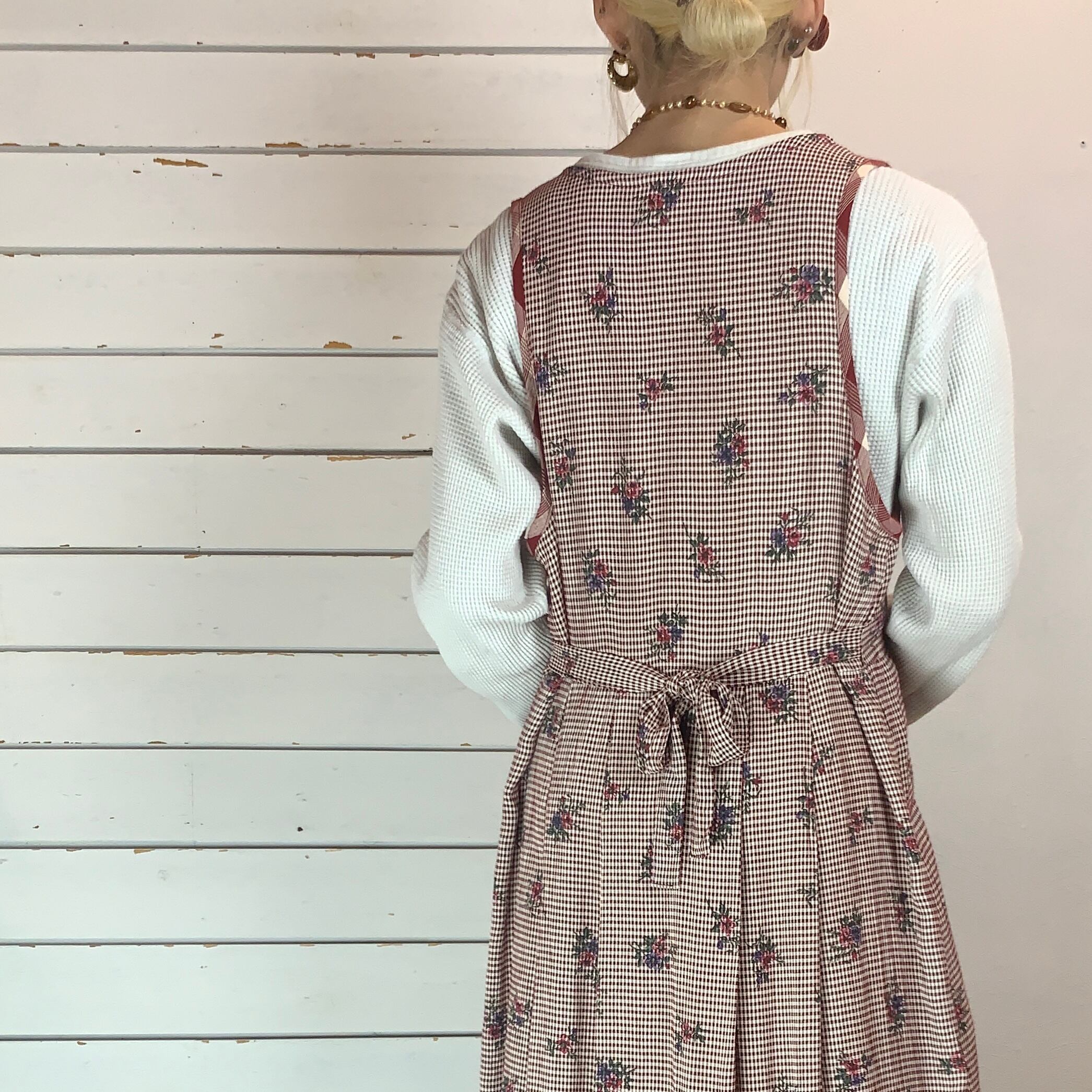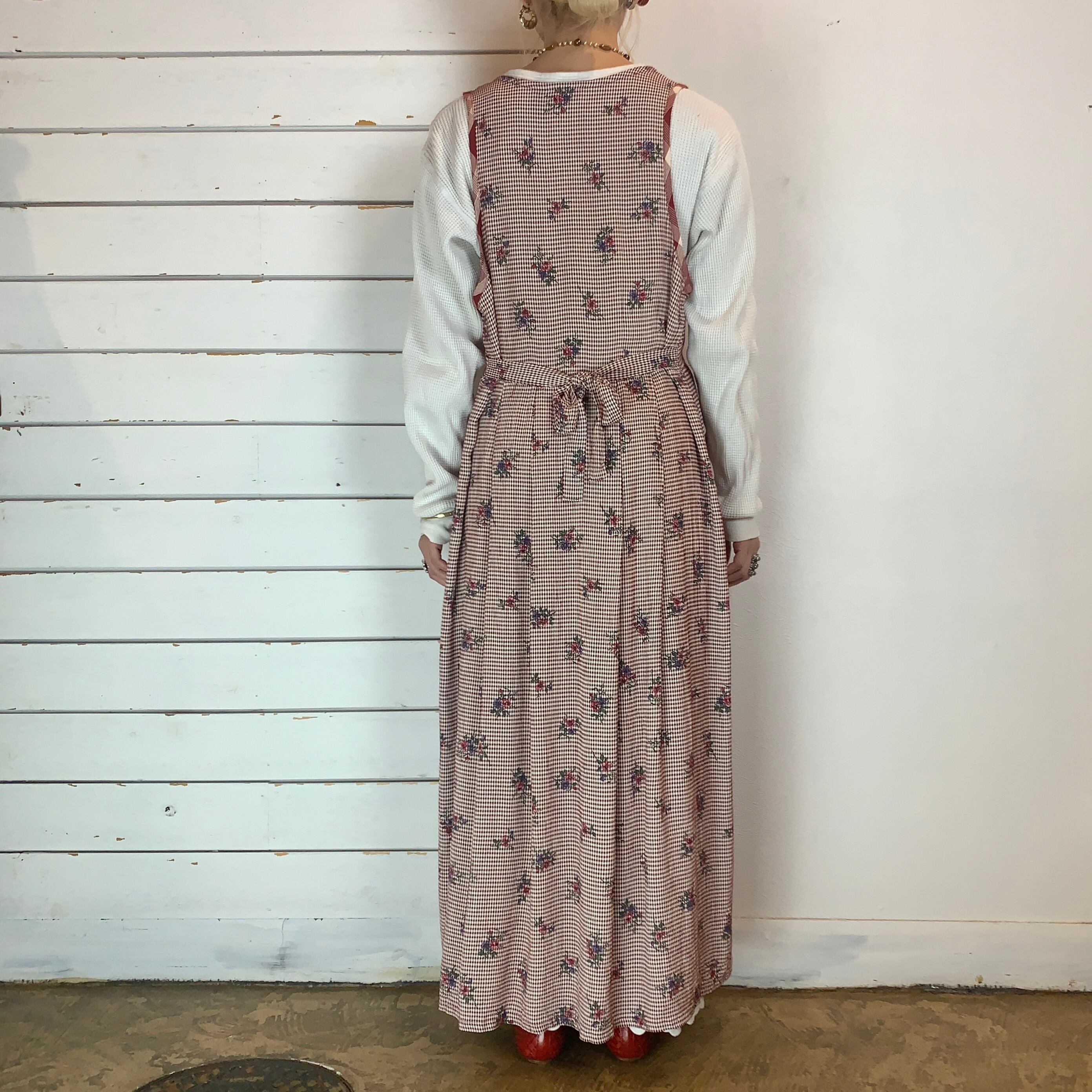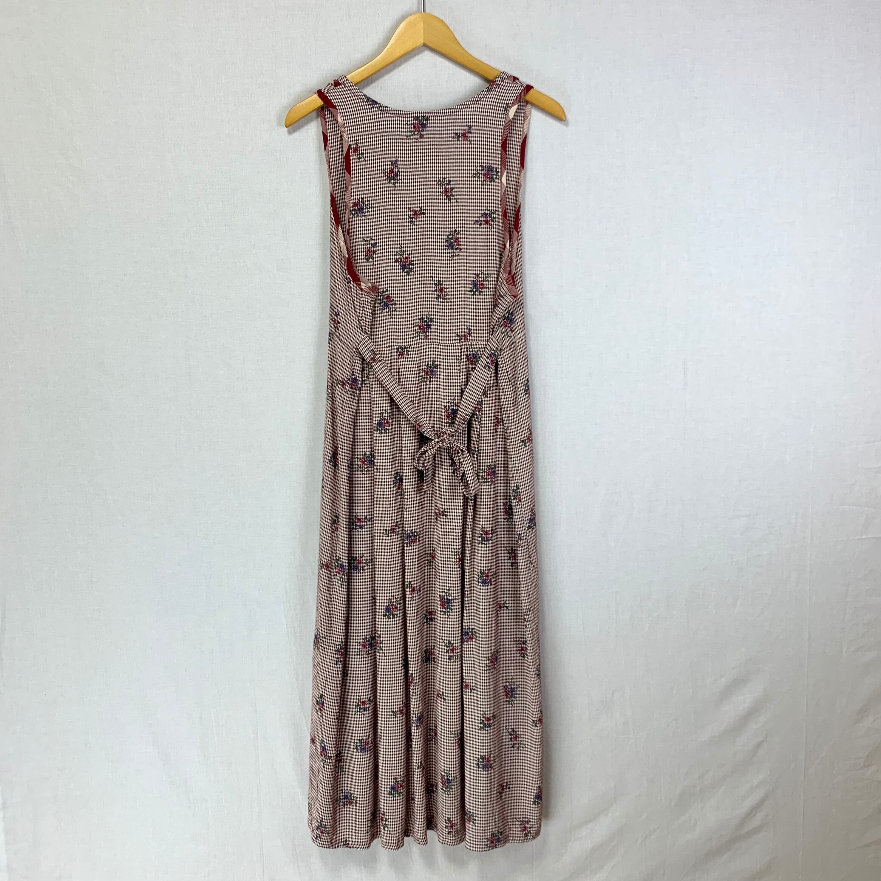 USA / 90s gingham check × flower no sleeve dress