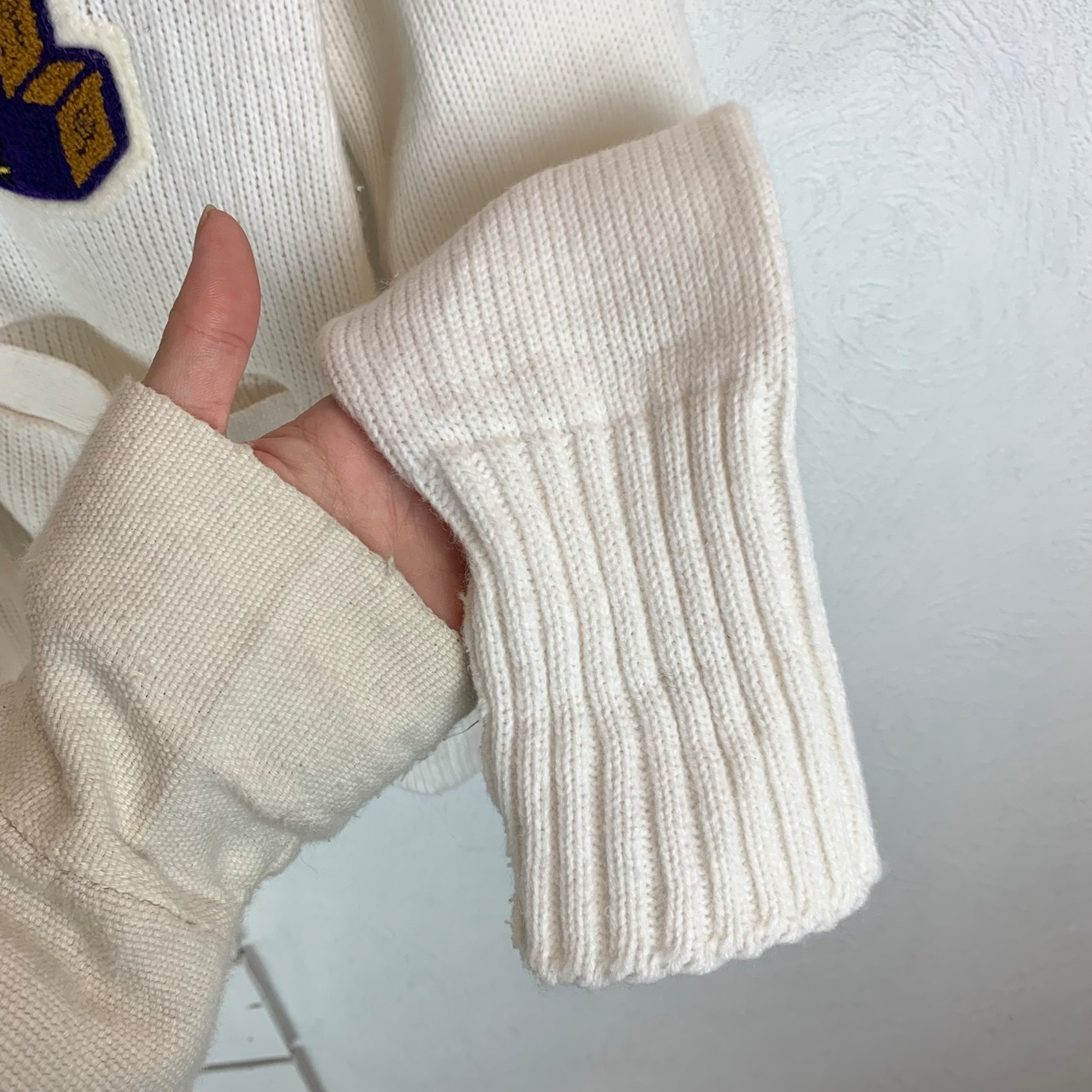 右袖にうっすらとシミ、左ポケット下に点汚れ、首リブにリペアがございます。(写真16枚目〜)
