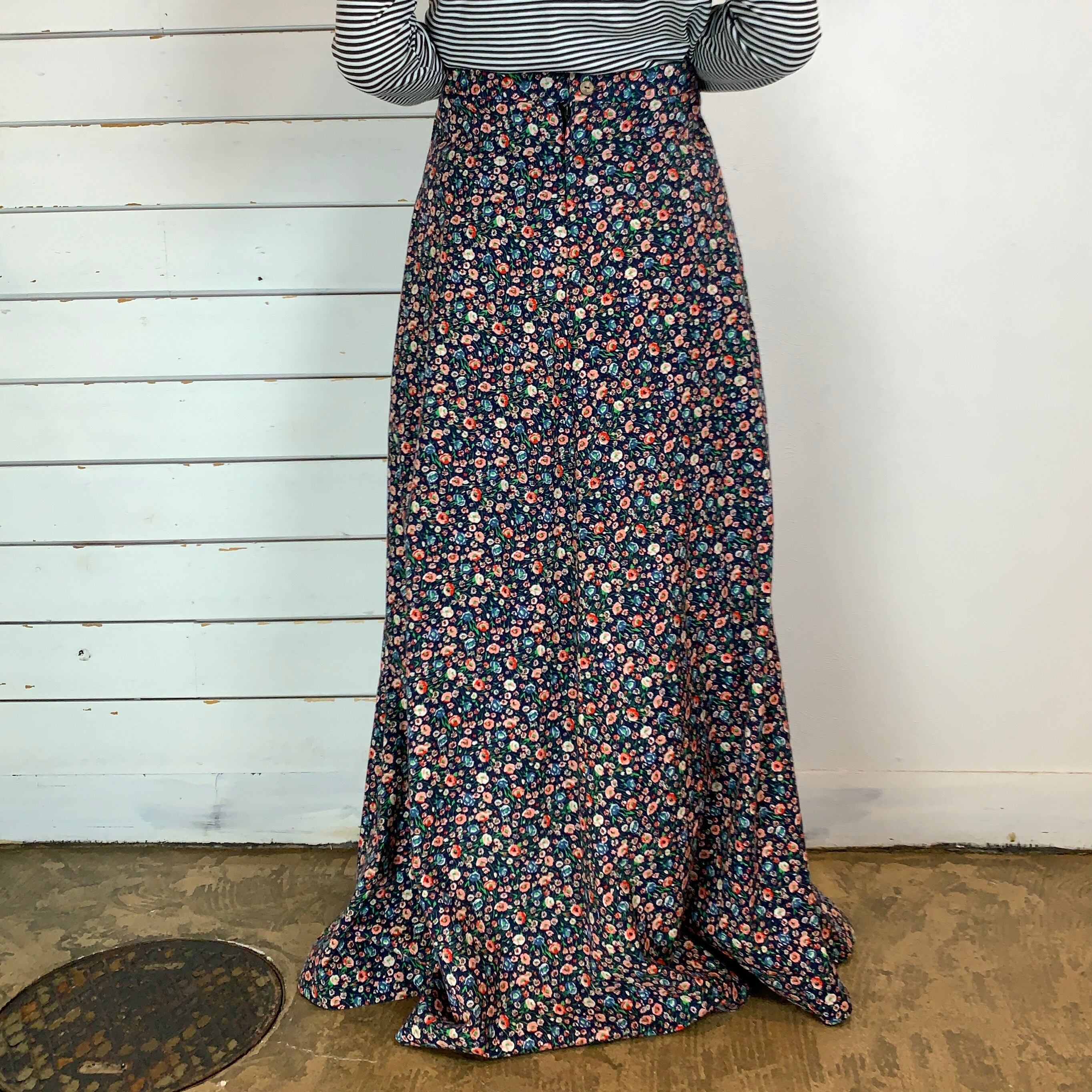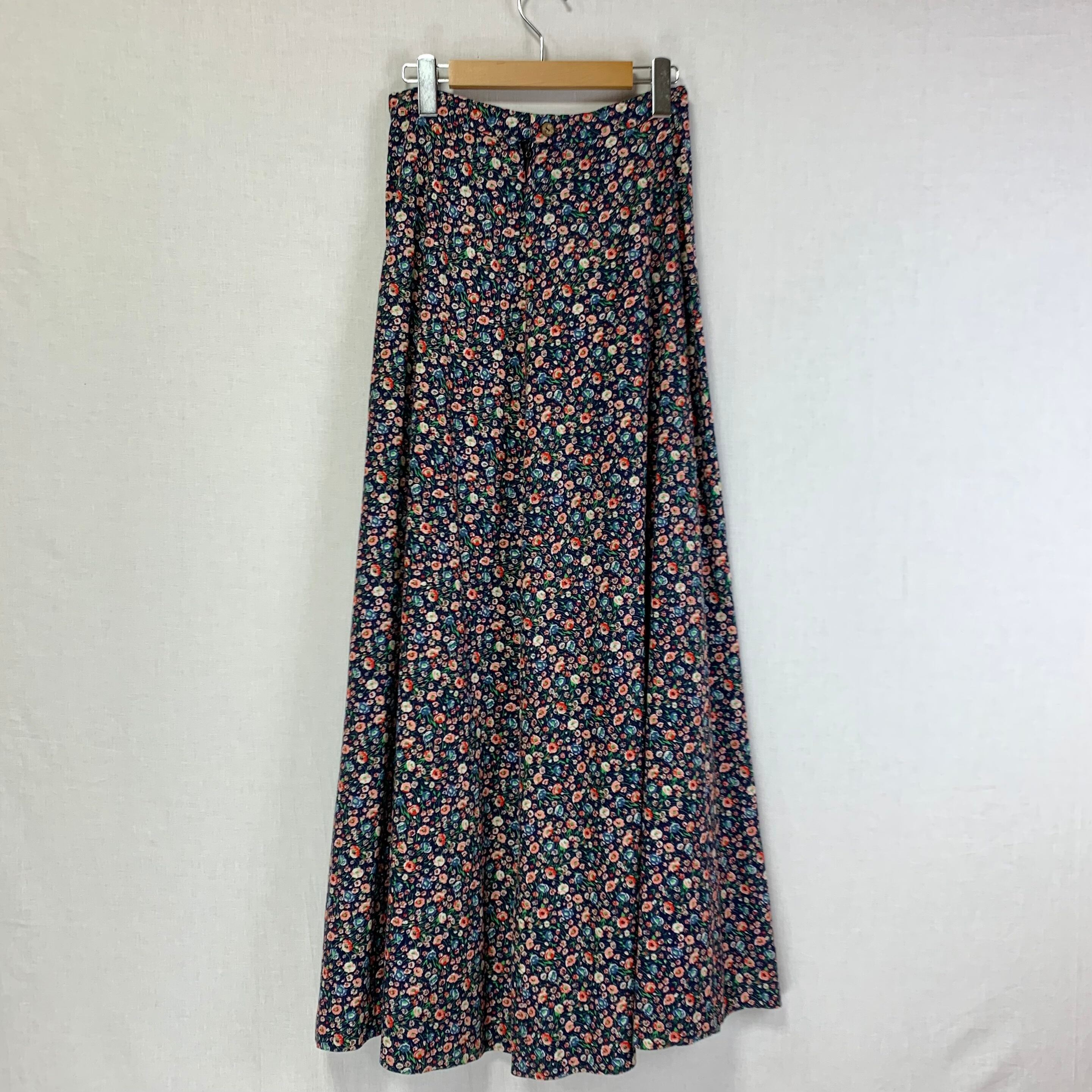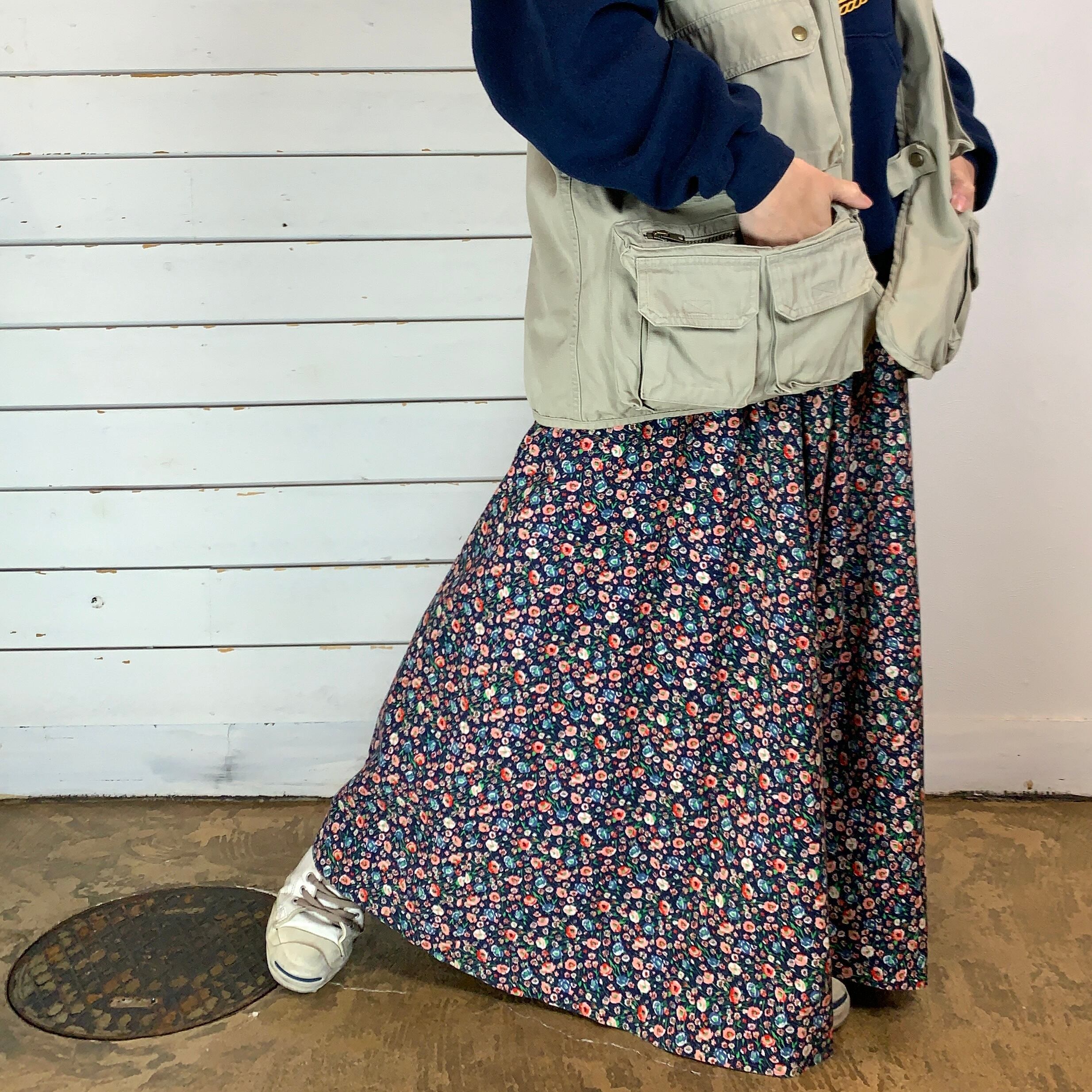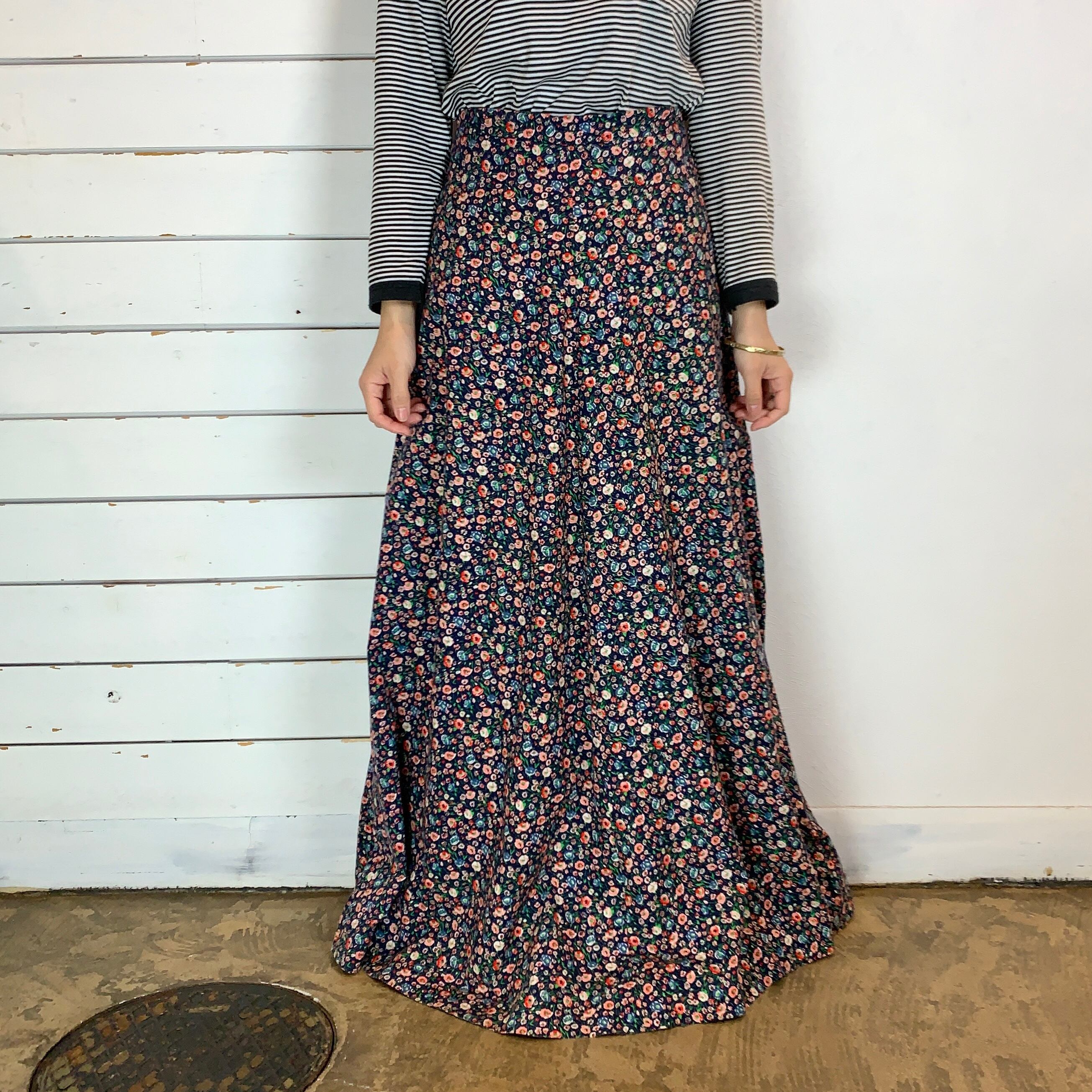 ネイビーベースにガーリーな小花柄のAラインマキシ丈スカート