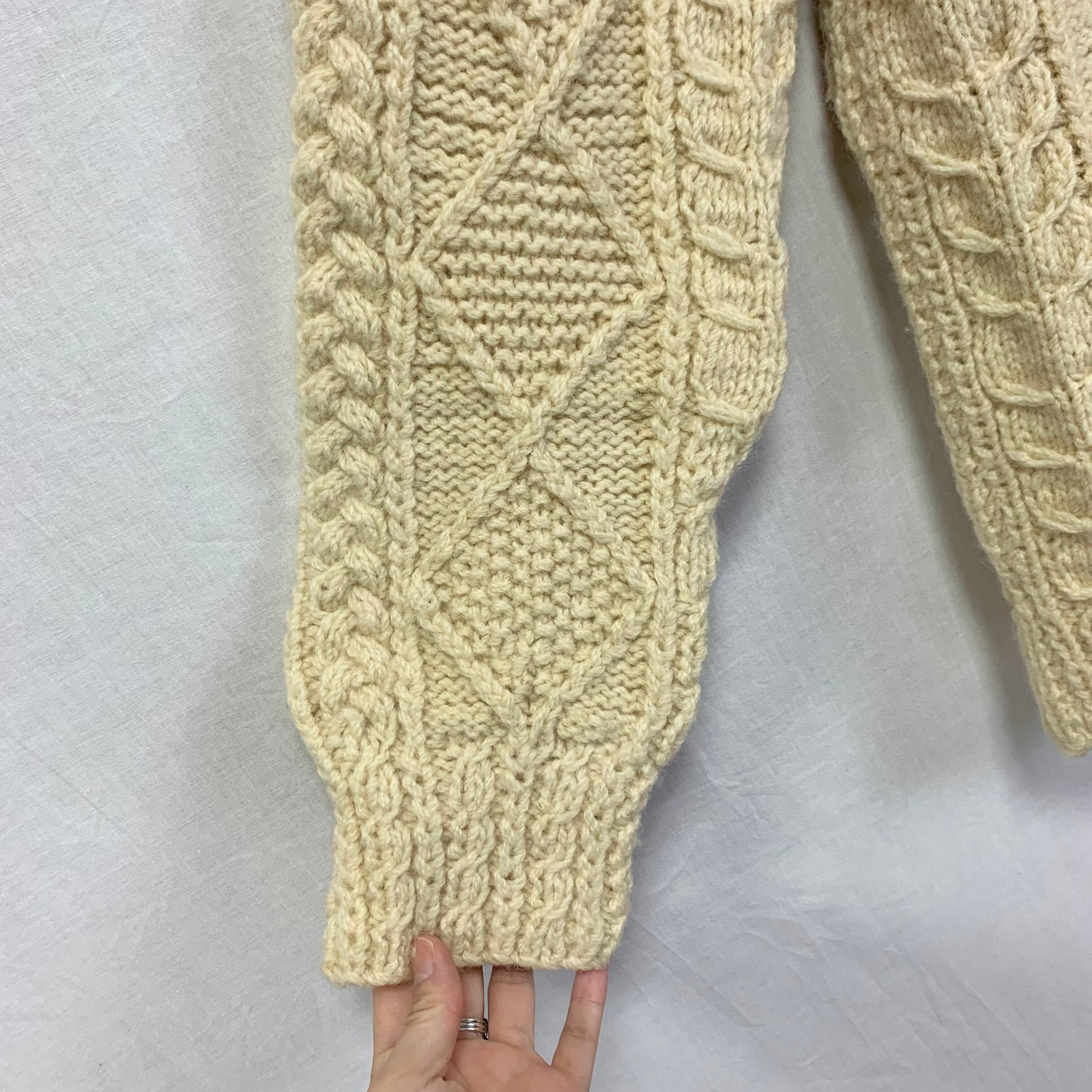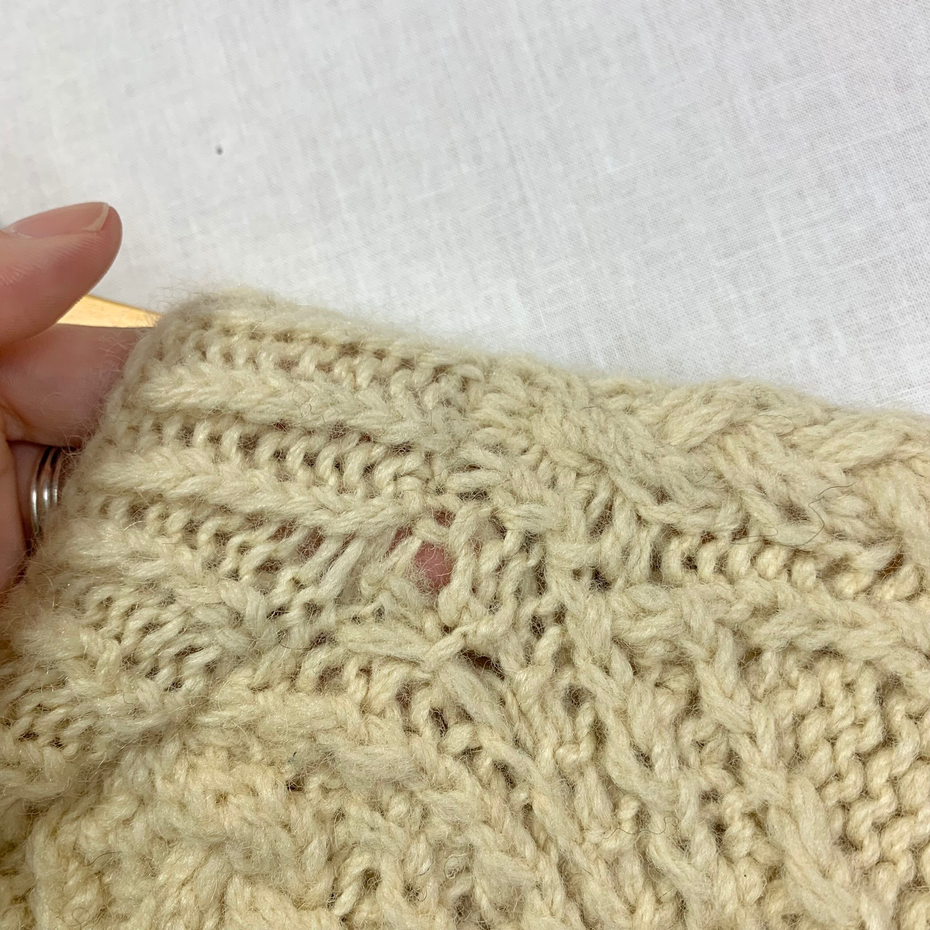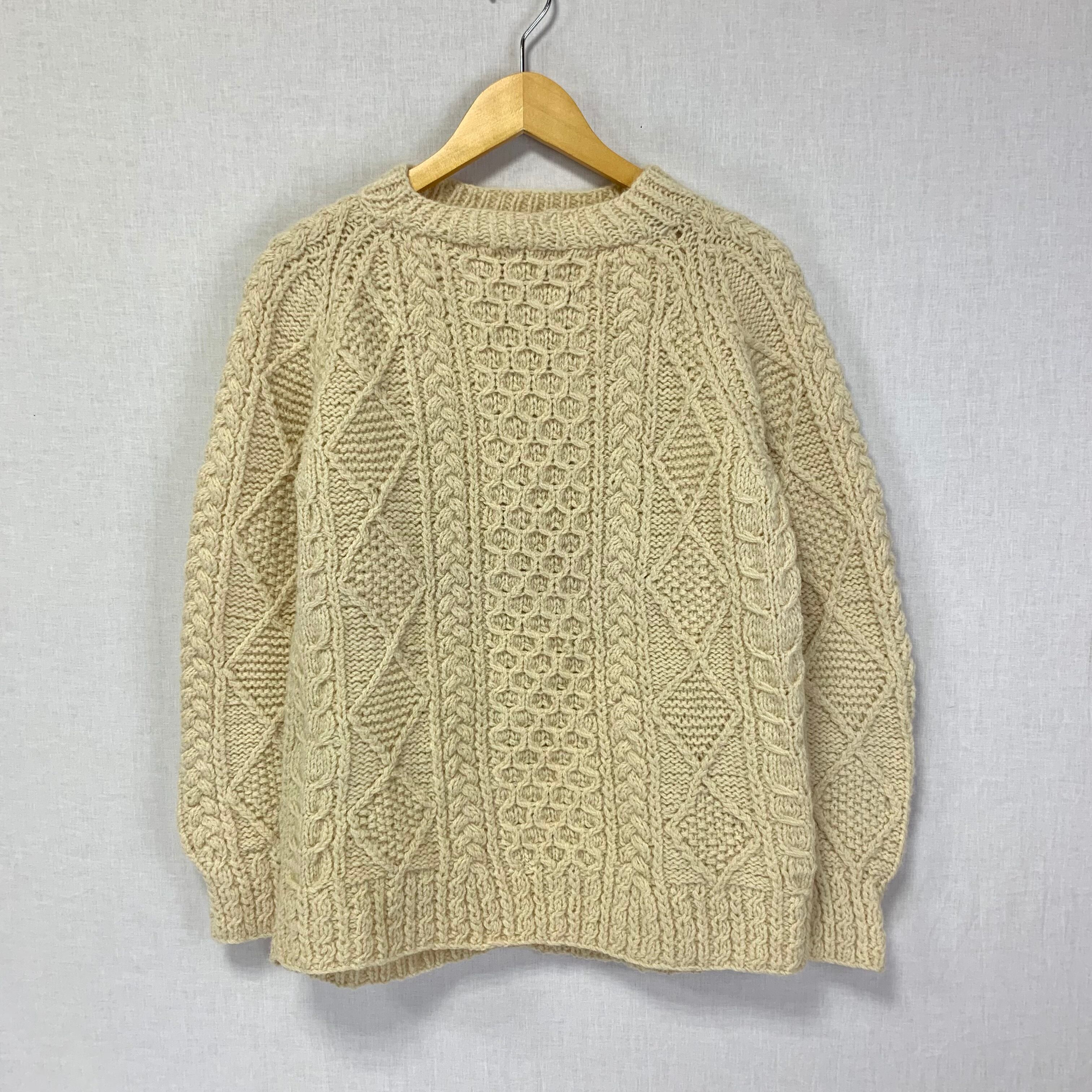 右袖にうっすら汚れ、ハンドメイドニットのため編み目にムラ、使用感による型崩れがございます。(写真15枚目〜)