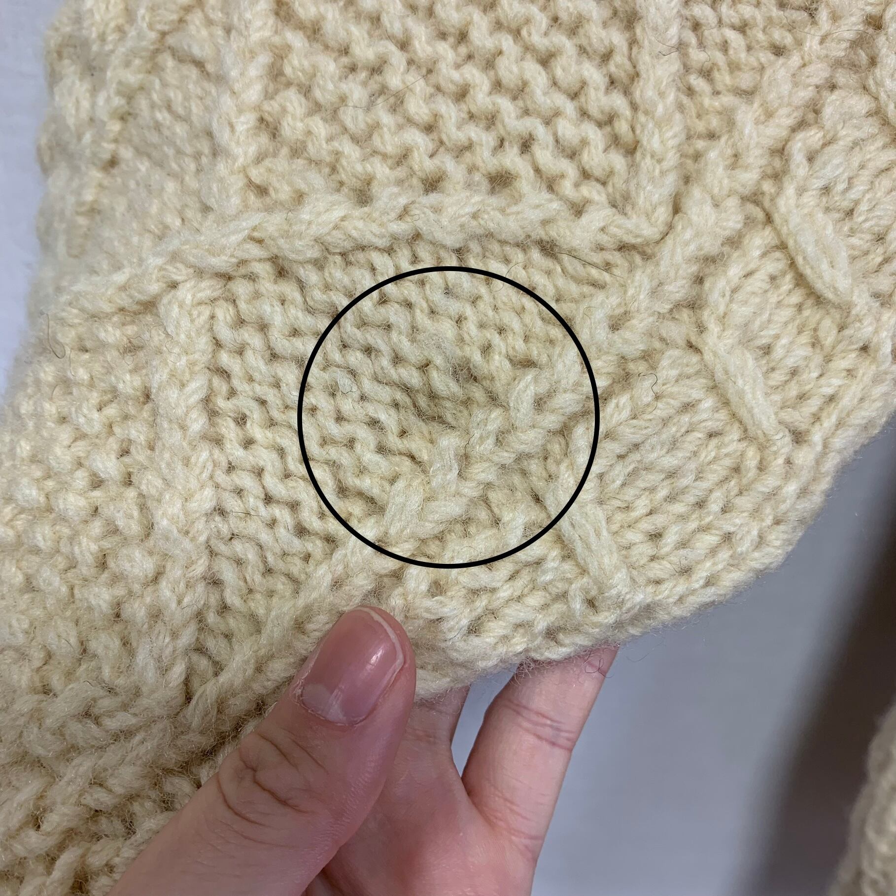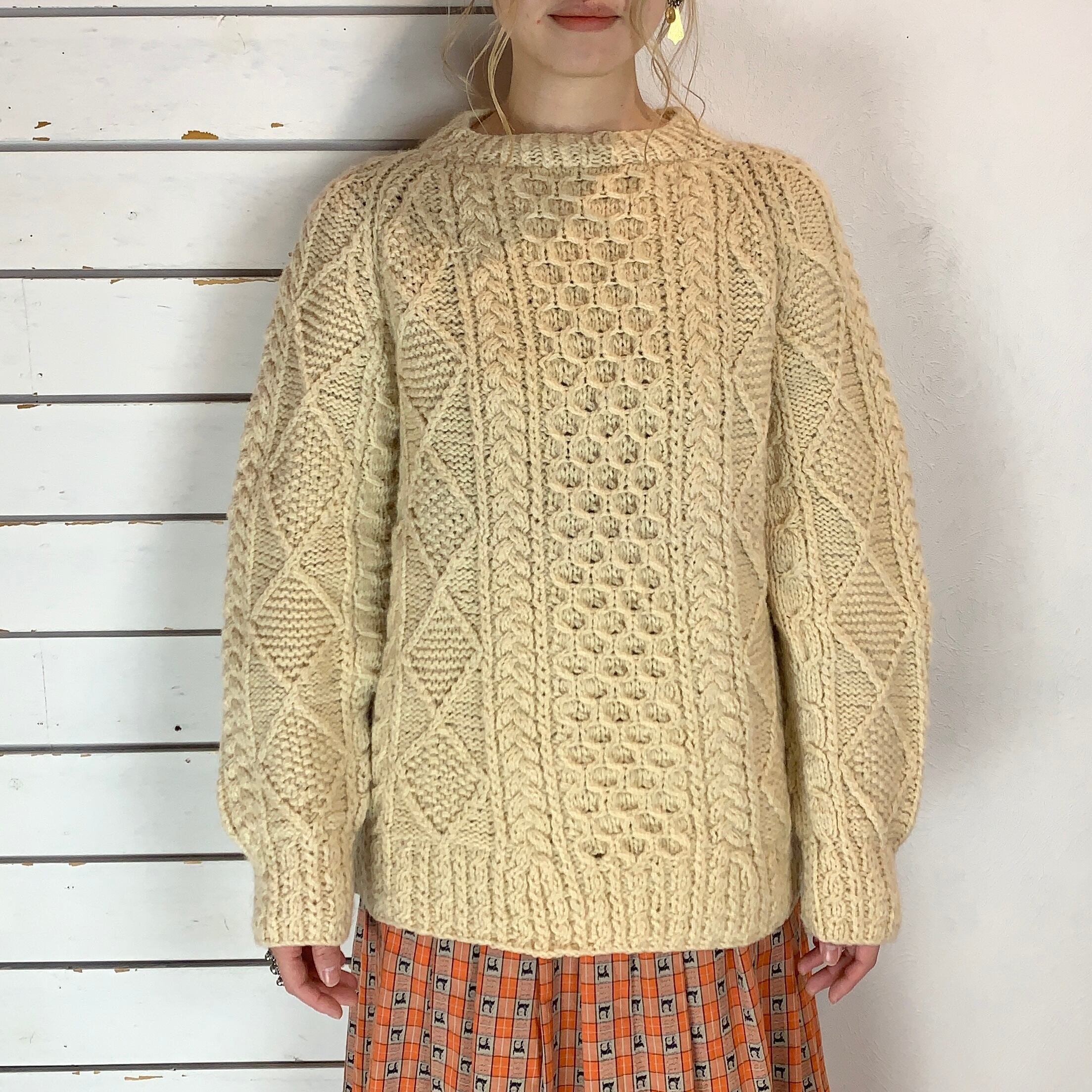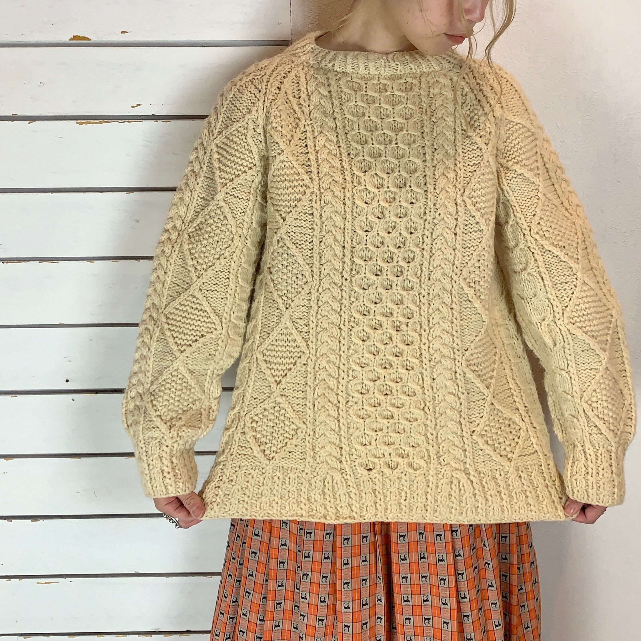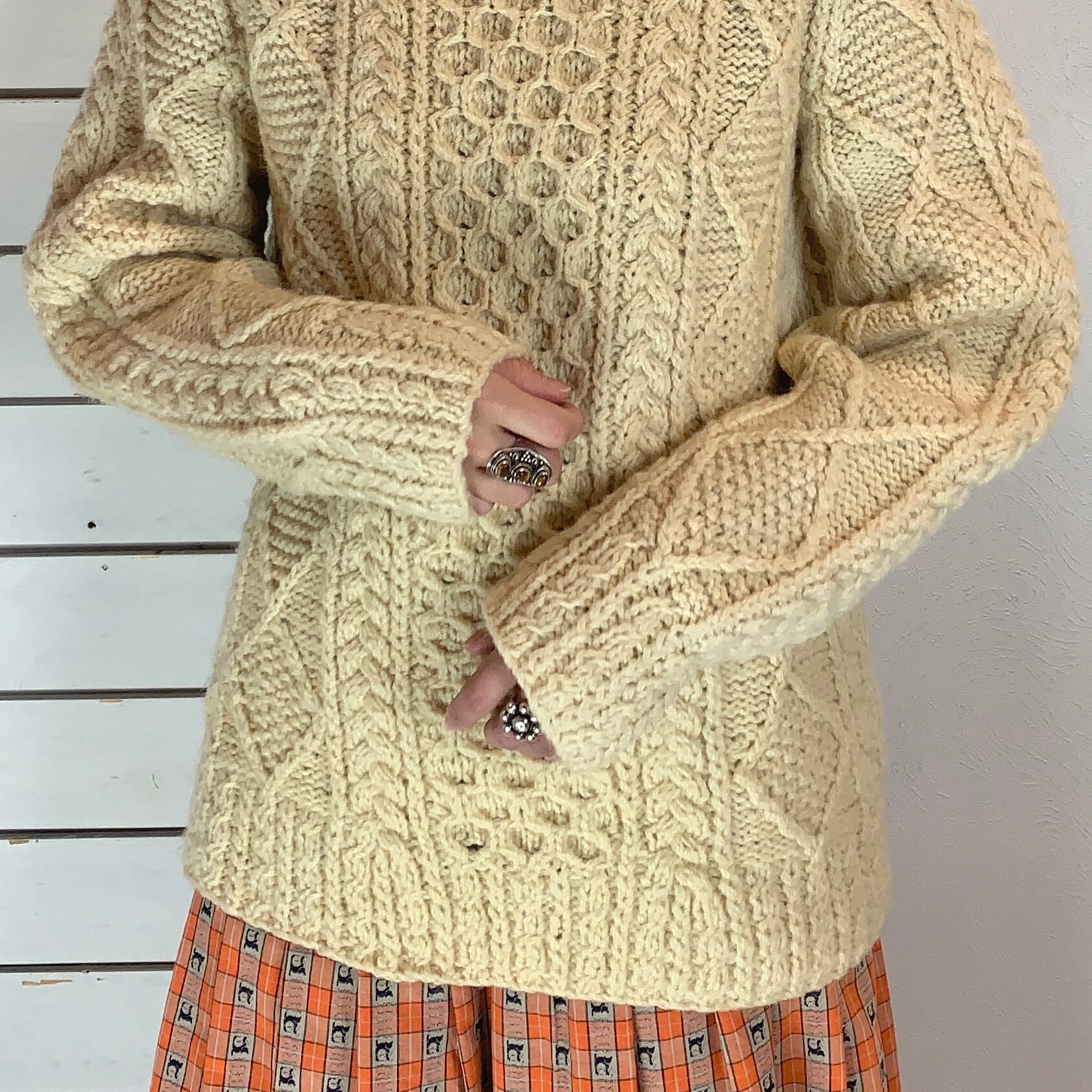 右袖にうっすら汚れ、ハンドメイドニットのため編み目にムラ、使用感による型崩れがございます。(写真15枚目〜)
