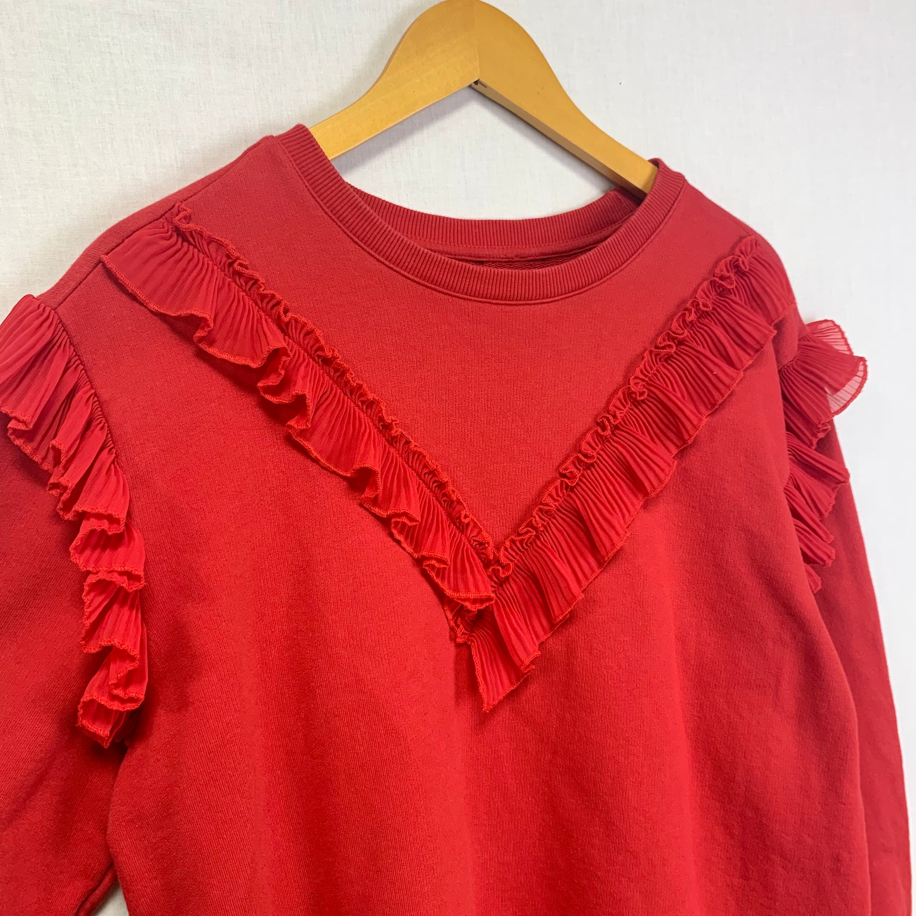 フロントと肩にフリルがついた無地のデザインスウェット