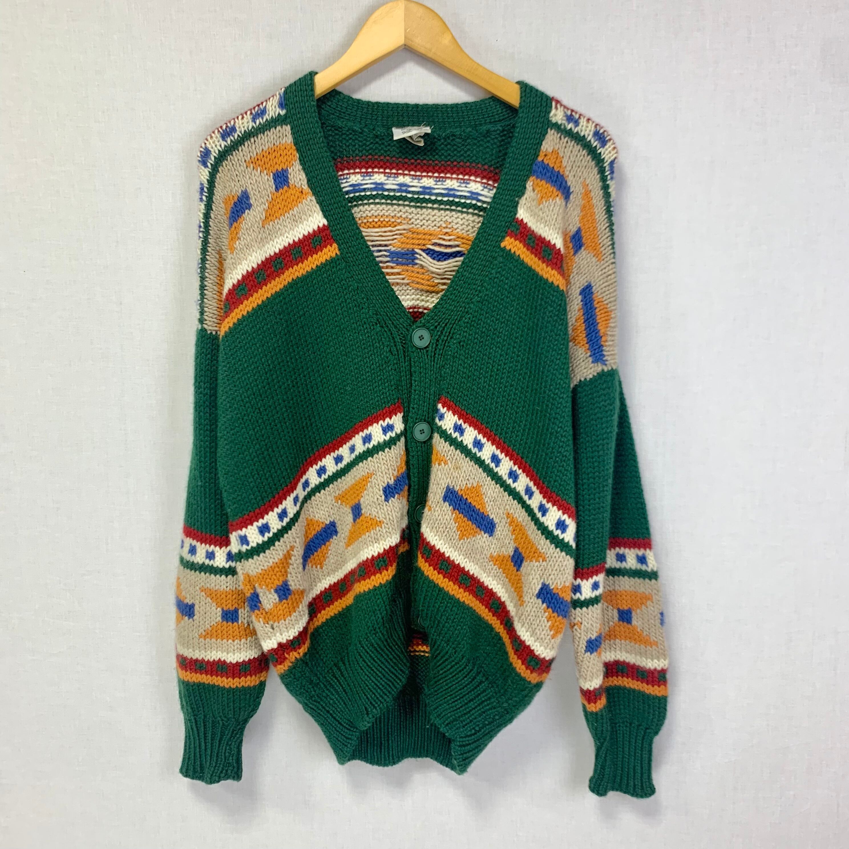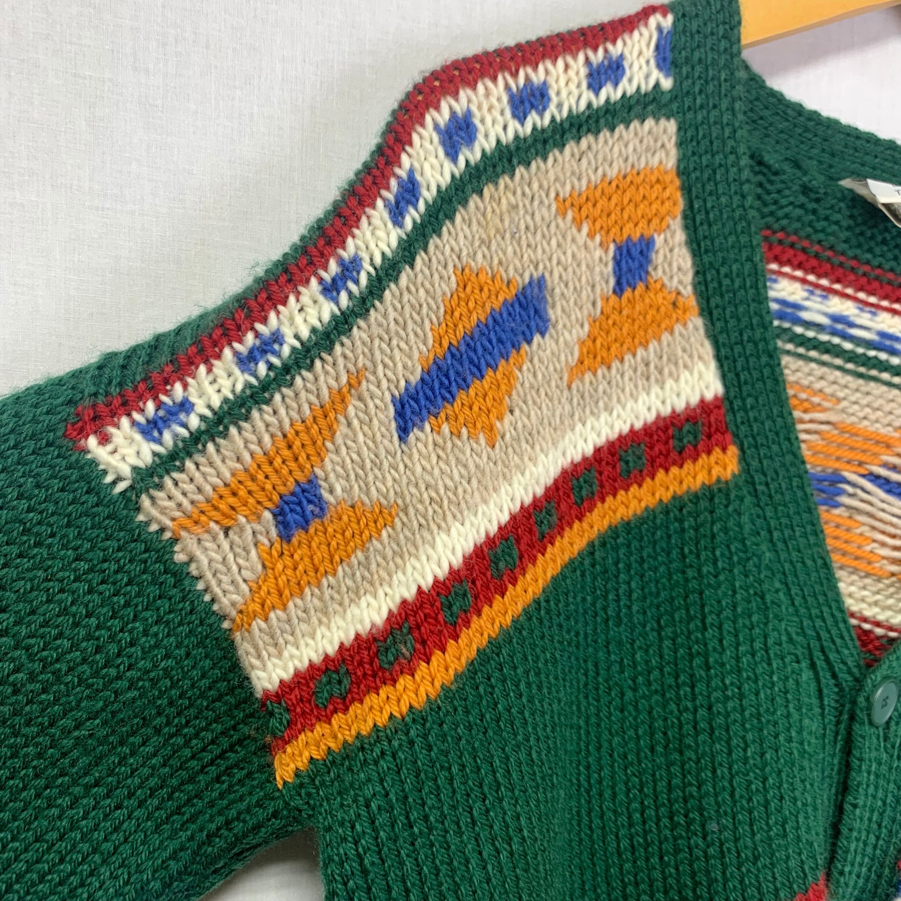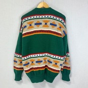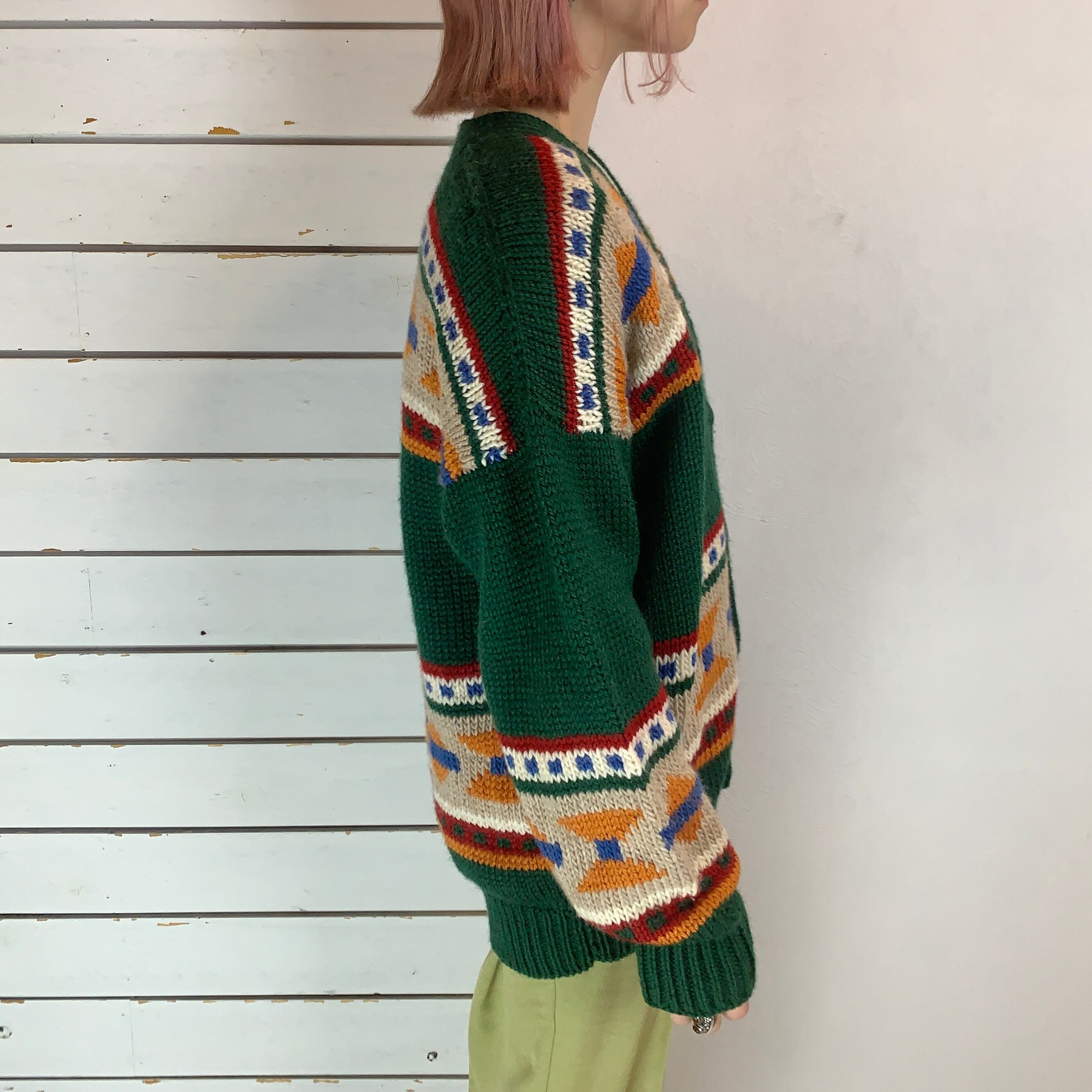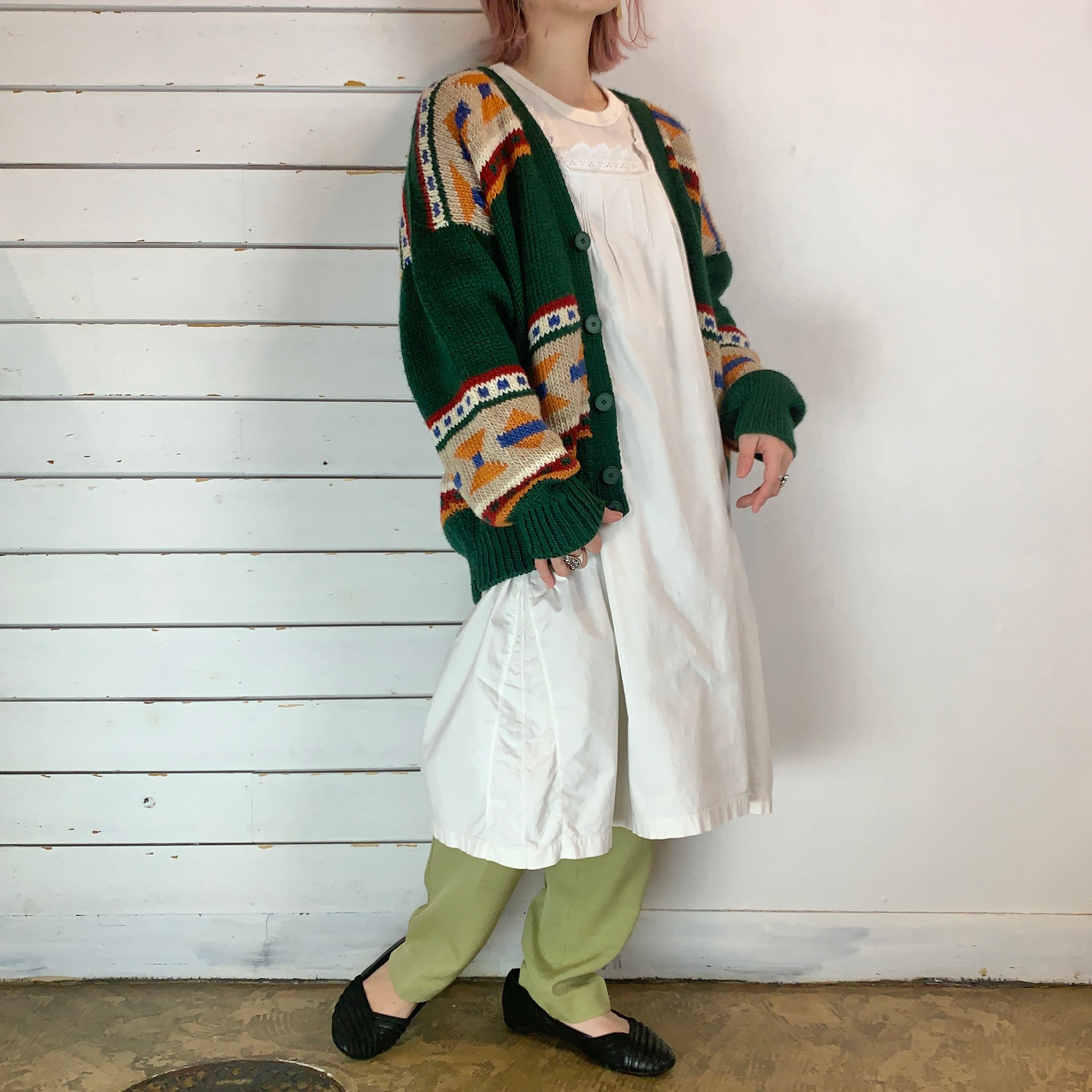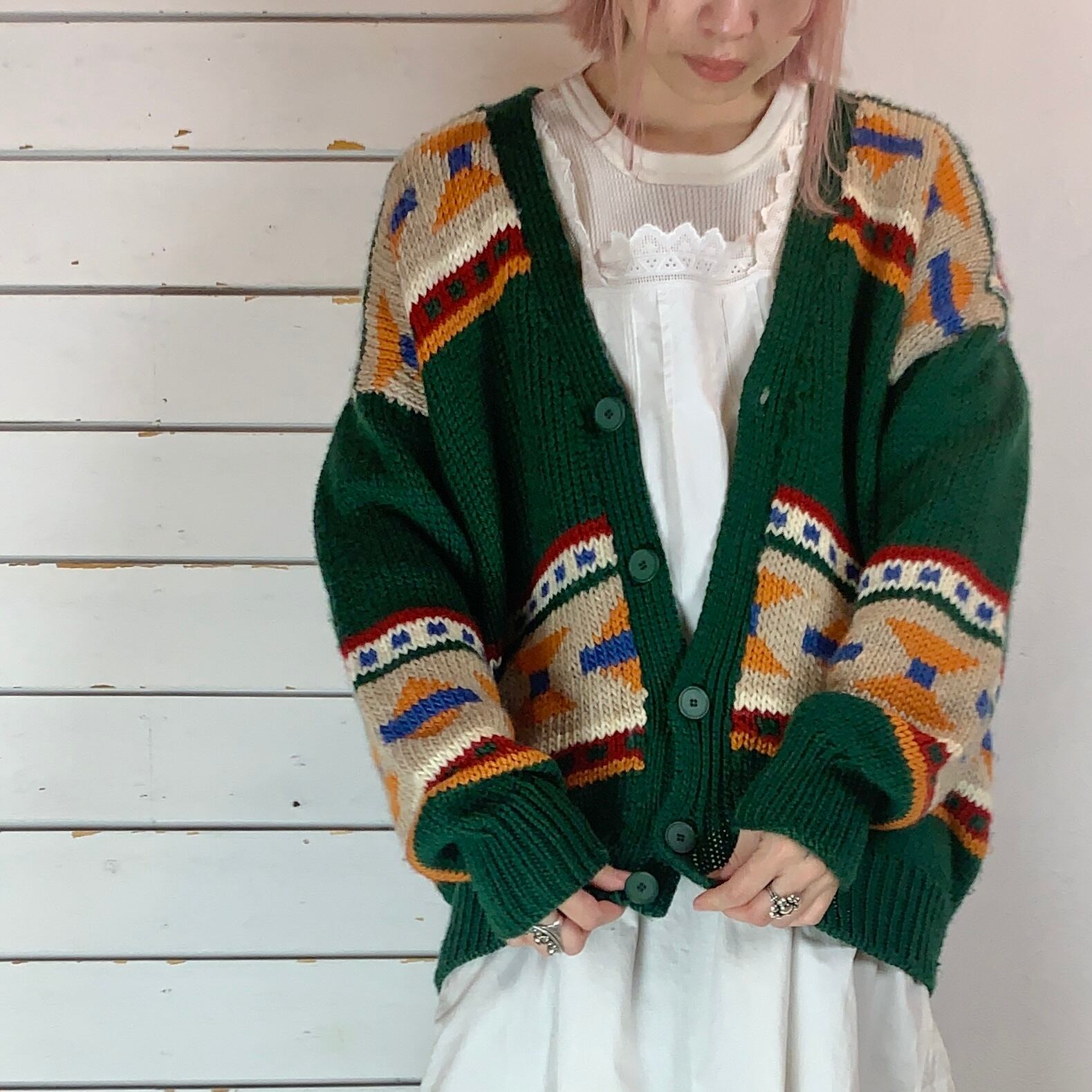 ビビッドグリーンにカラフルで幾何学的な模様が上下と袖先に