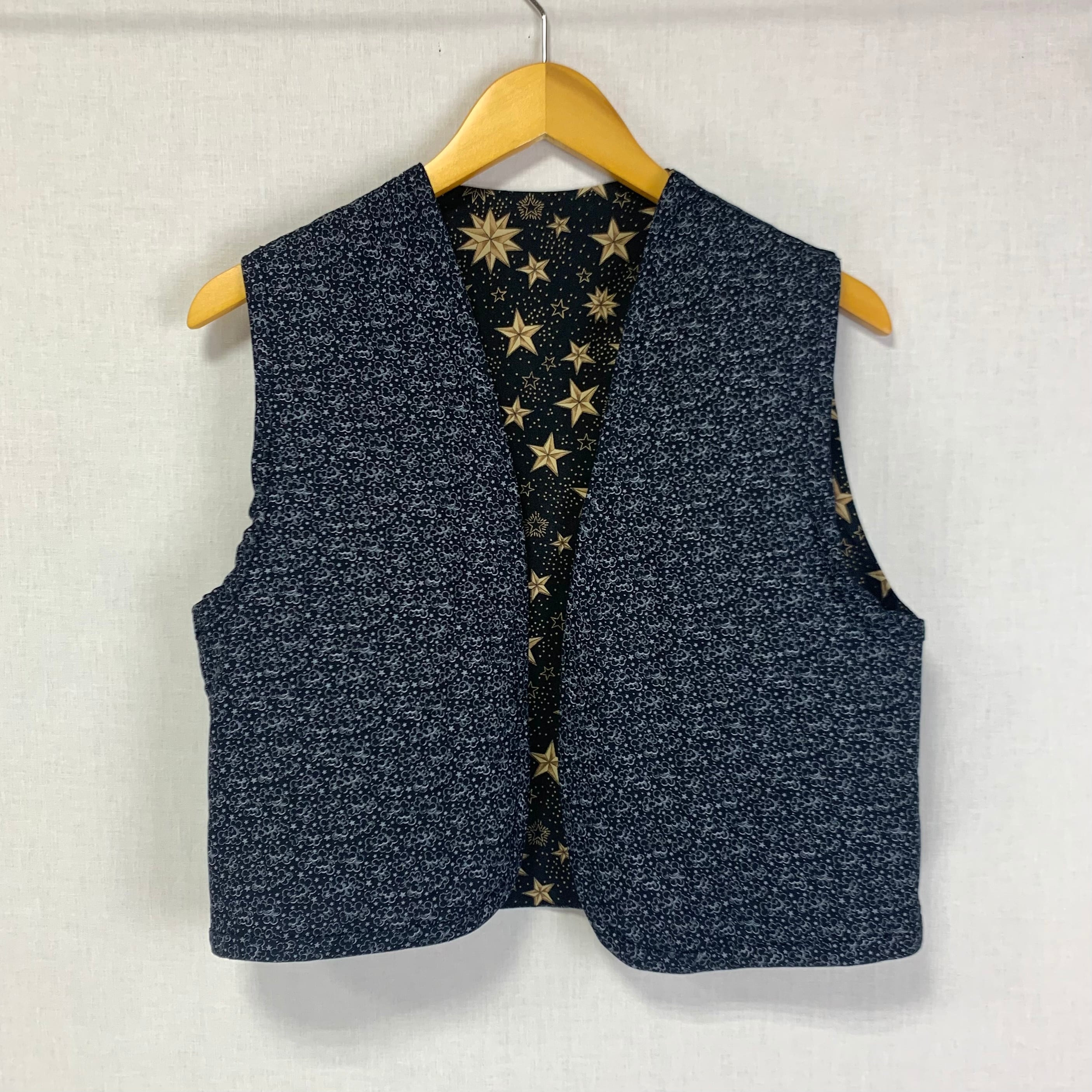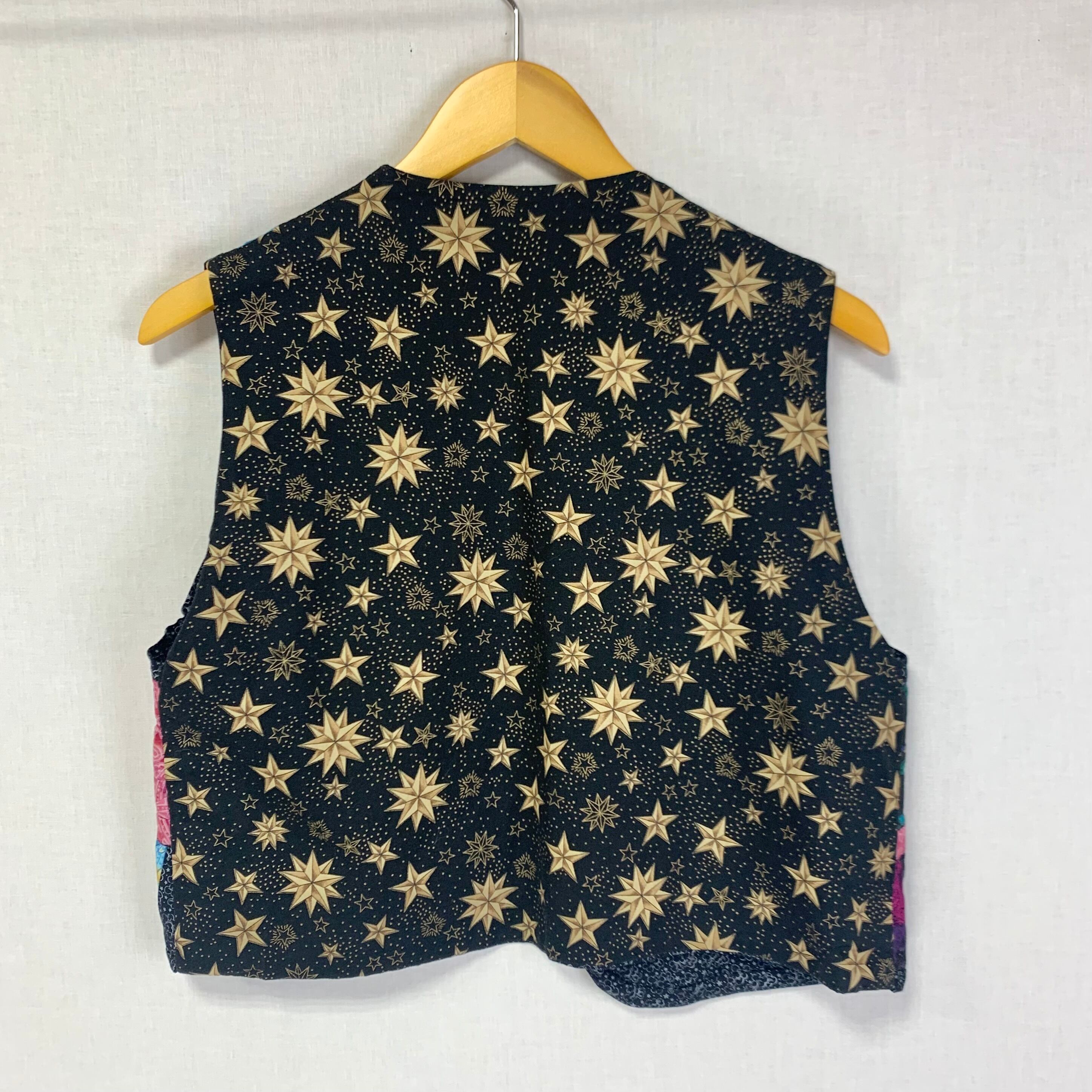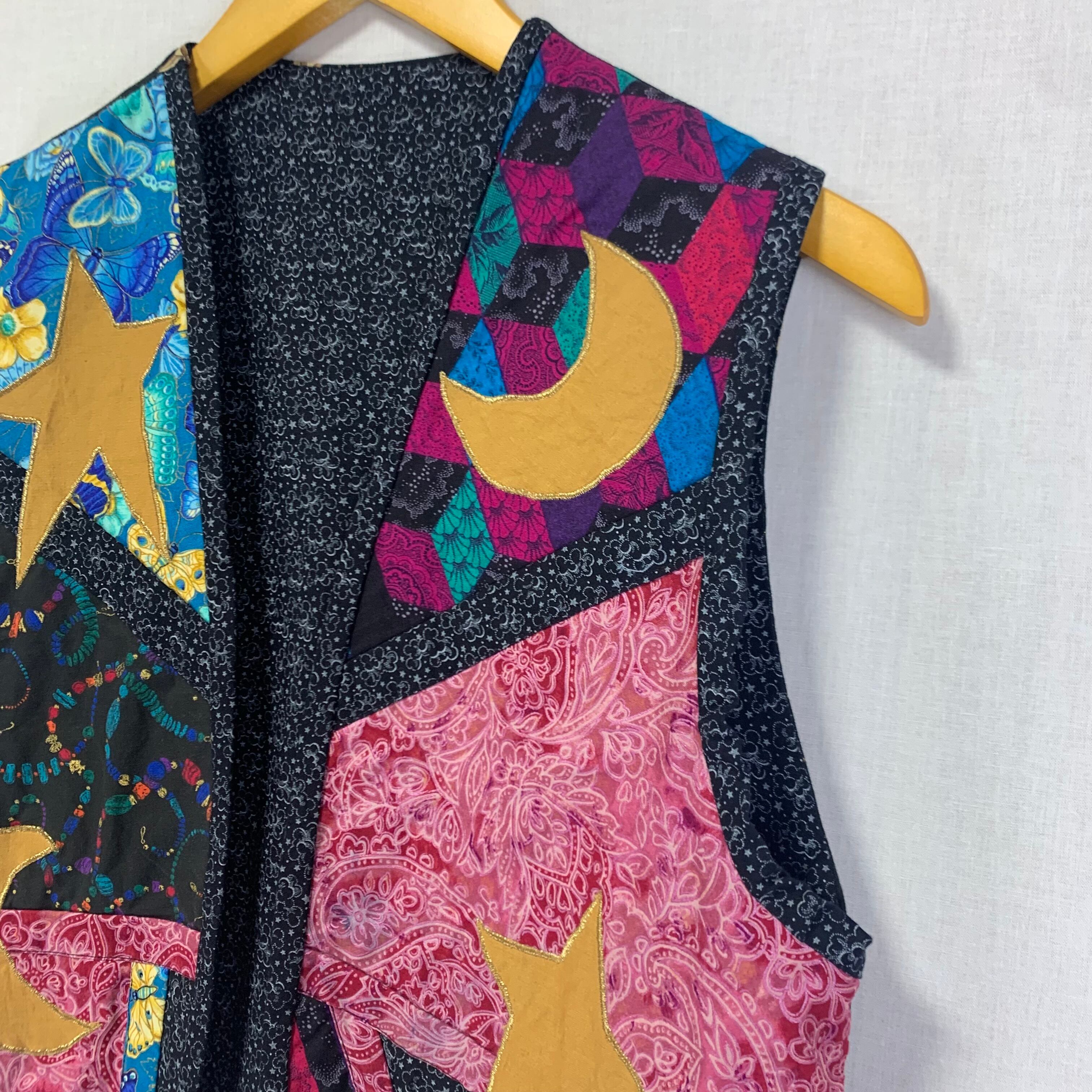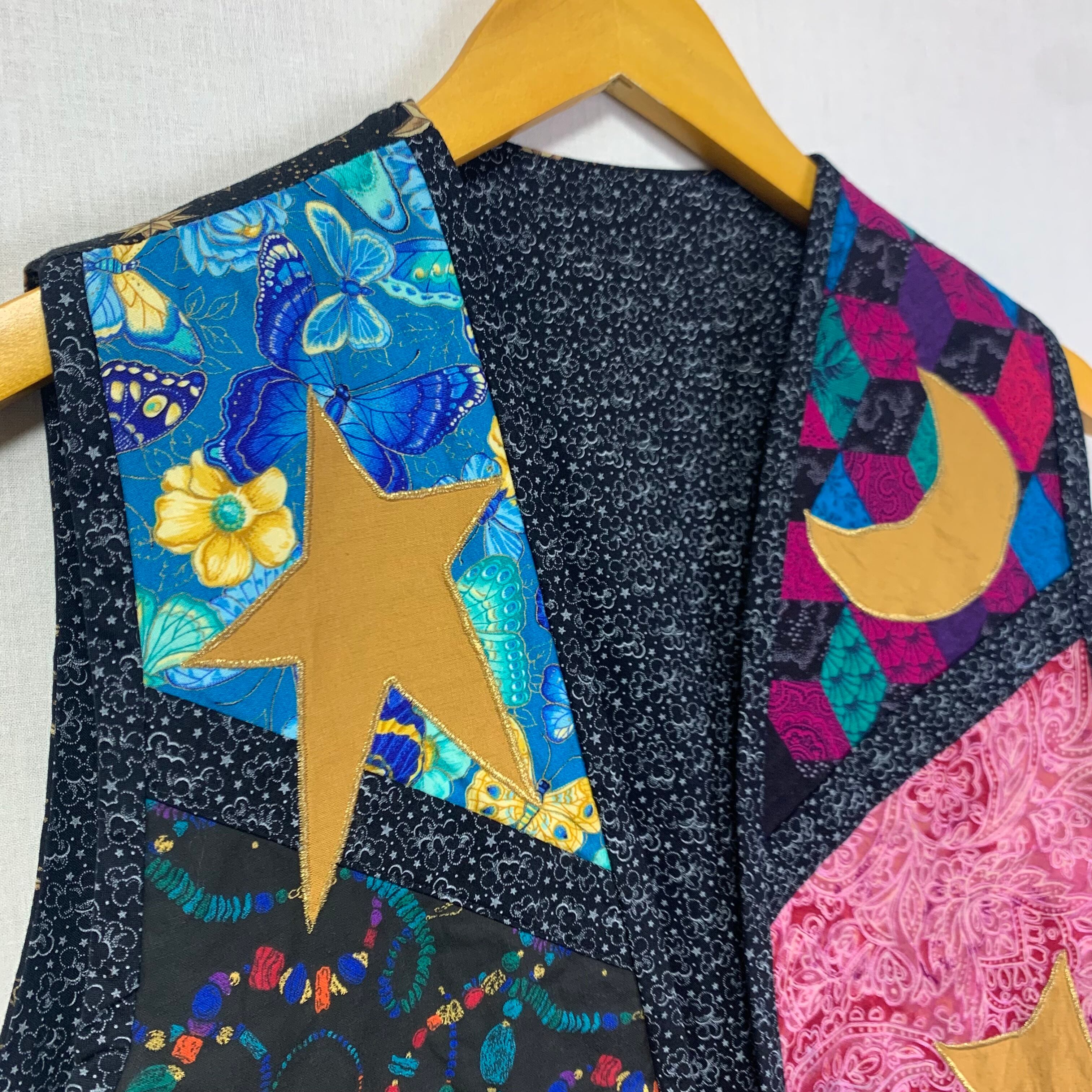 色んなパターンの生地にお月様、お星様モチーフが入ったパッチワークベスト