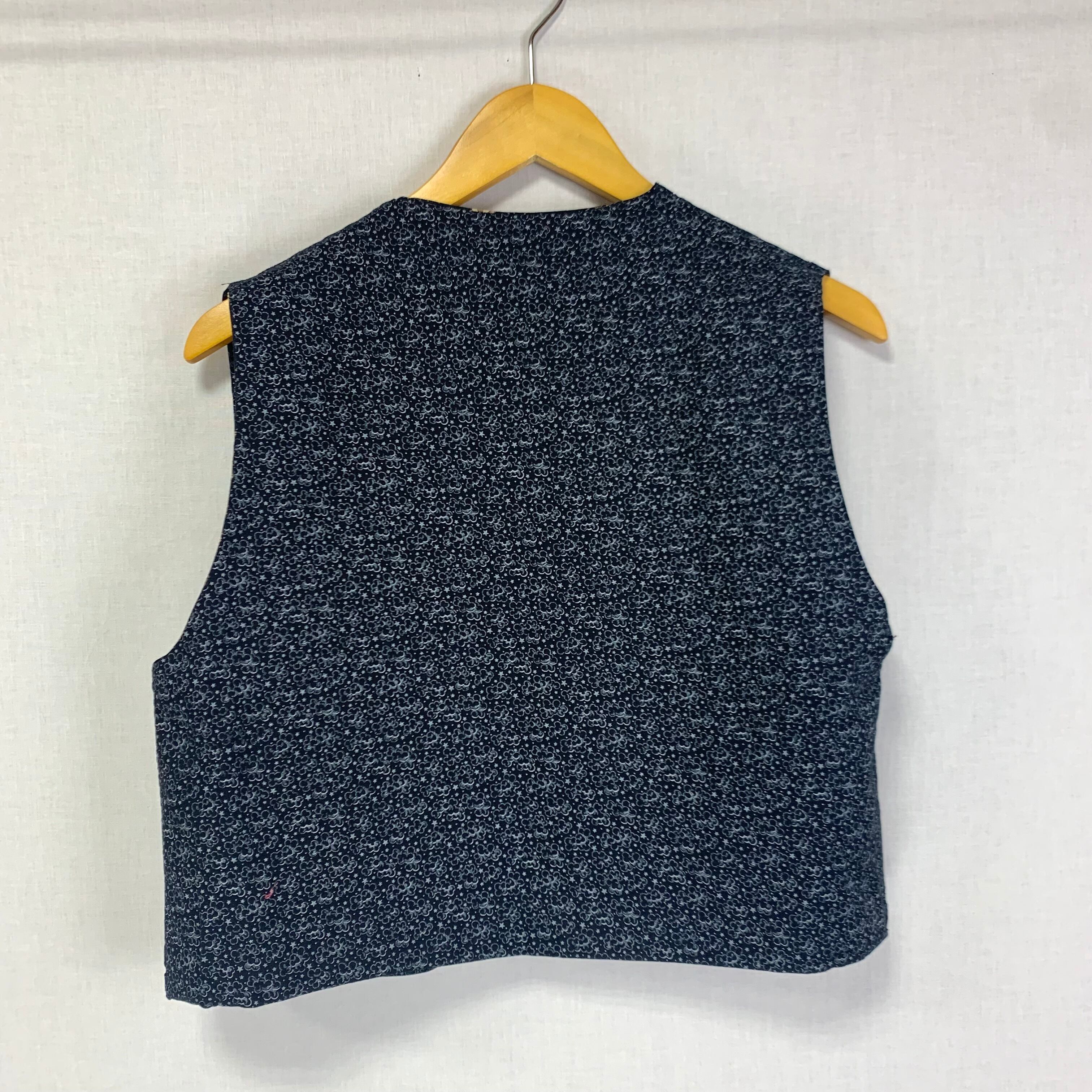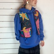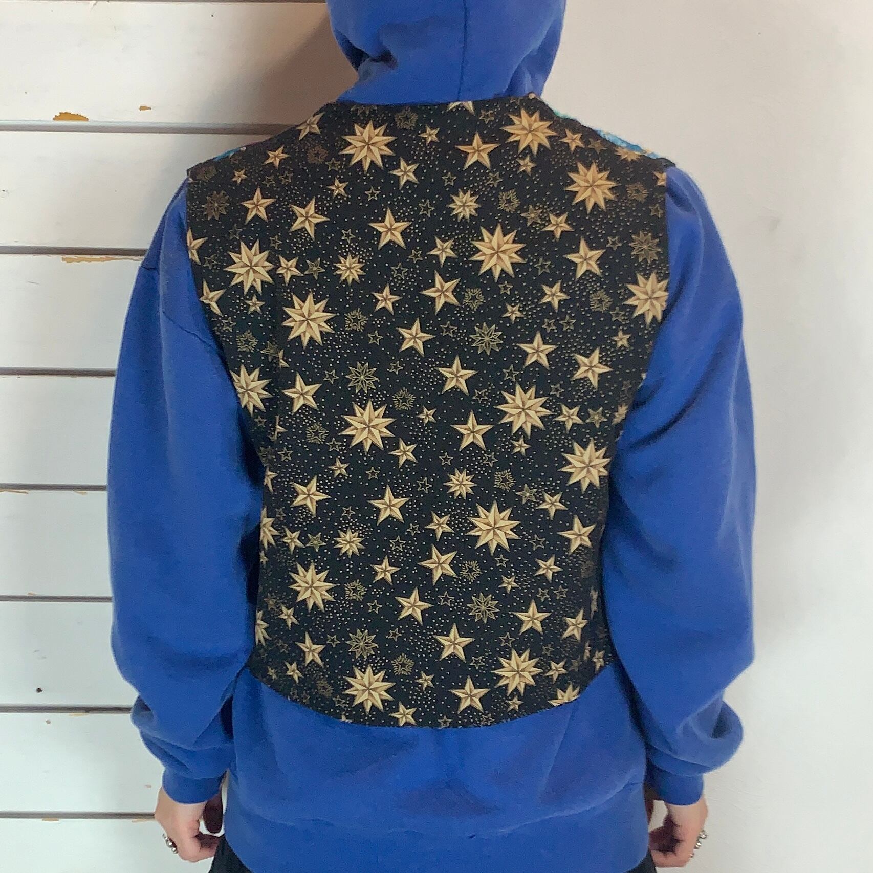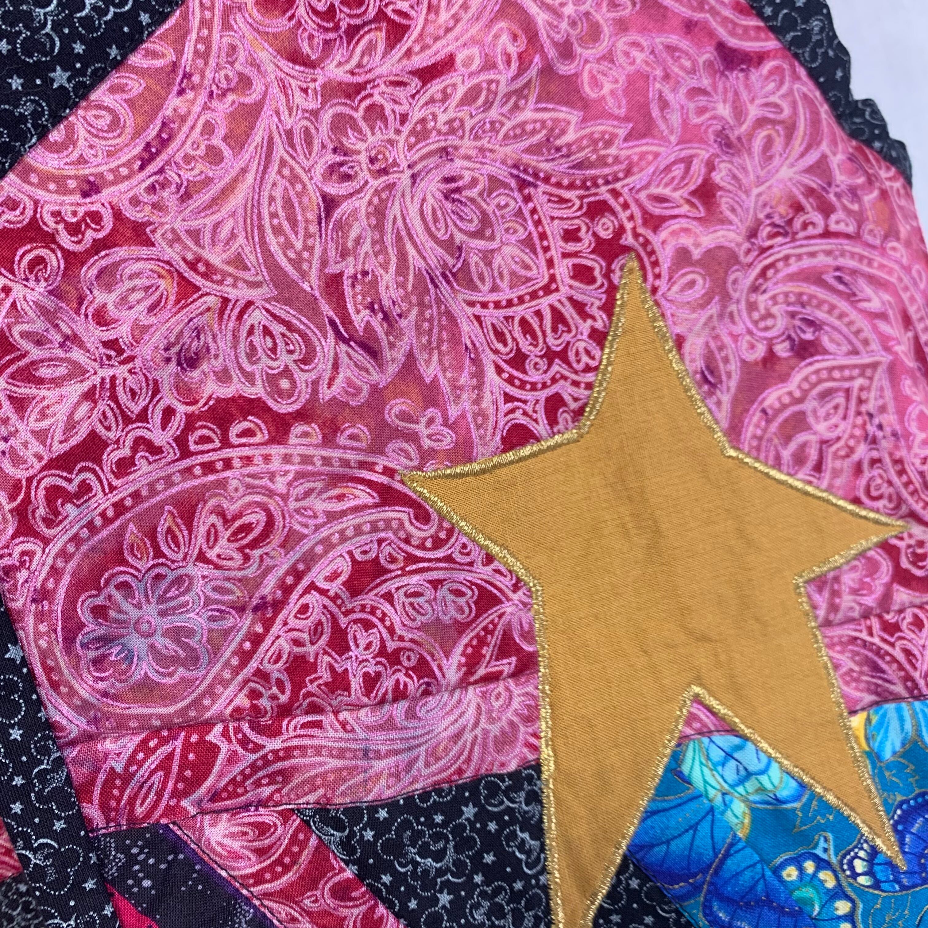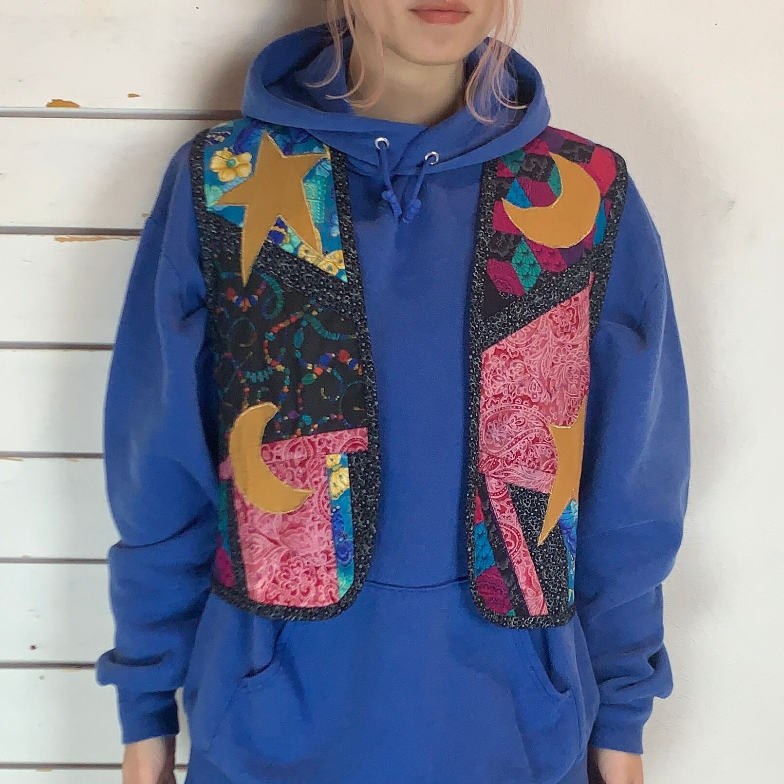 色んなパターンの生地にお月様、お星様モチーフが入ったパッチワークベスト