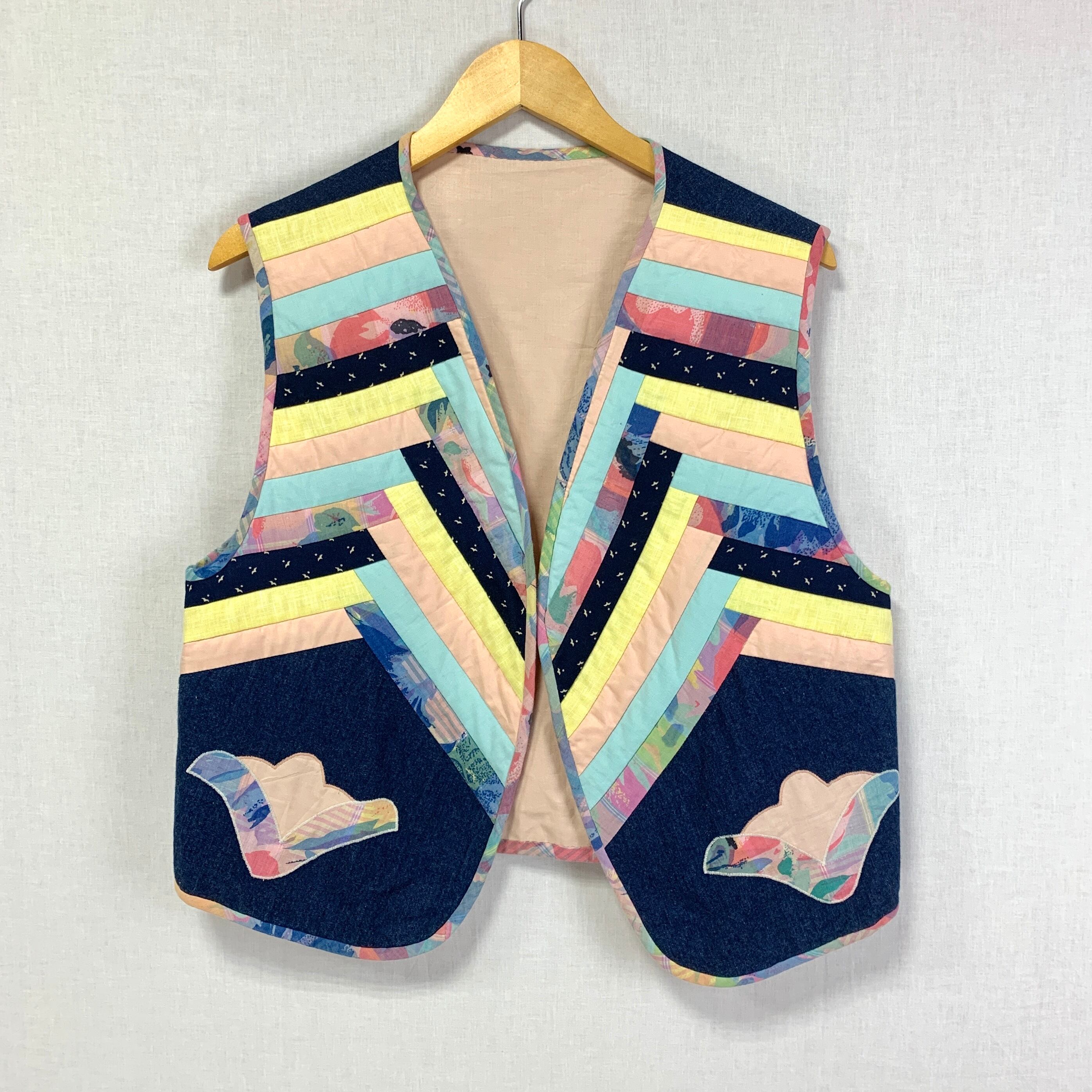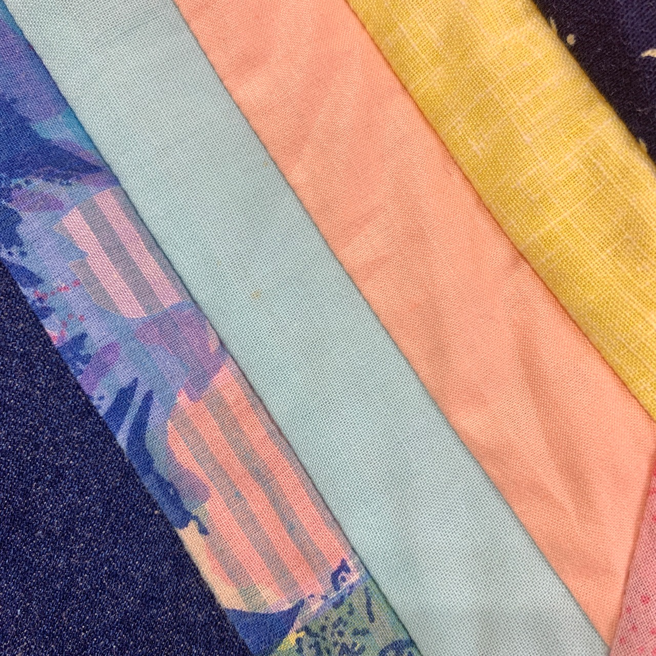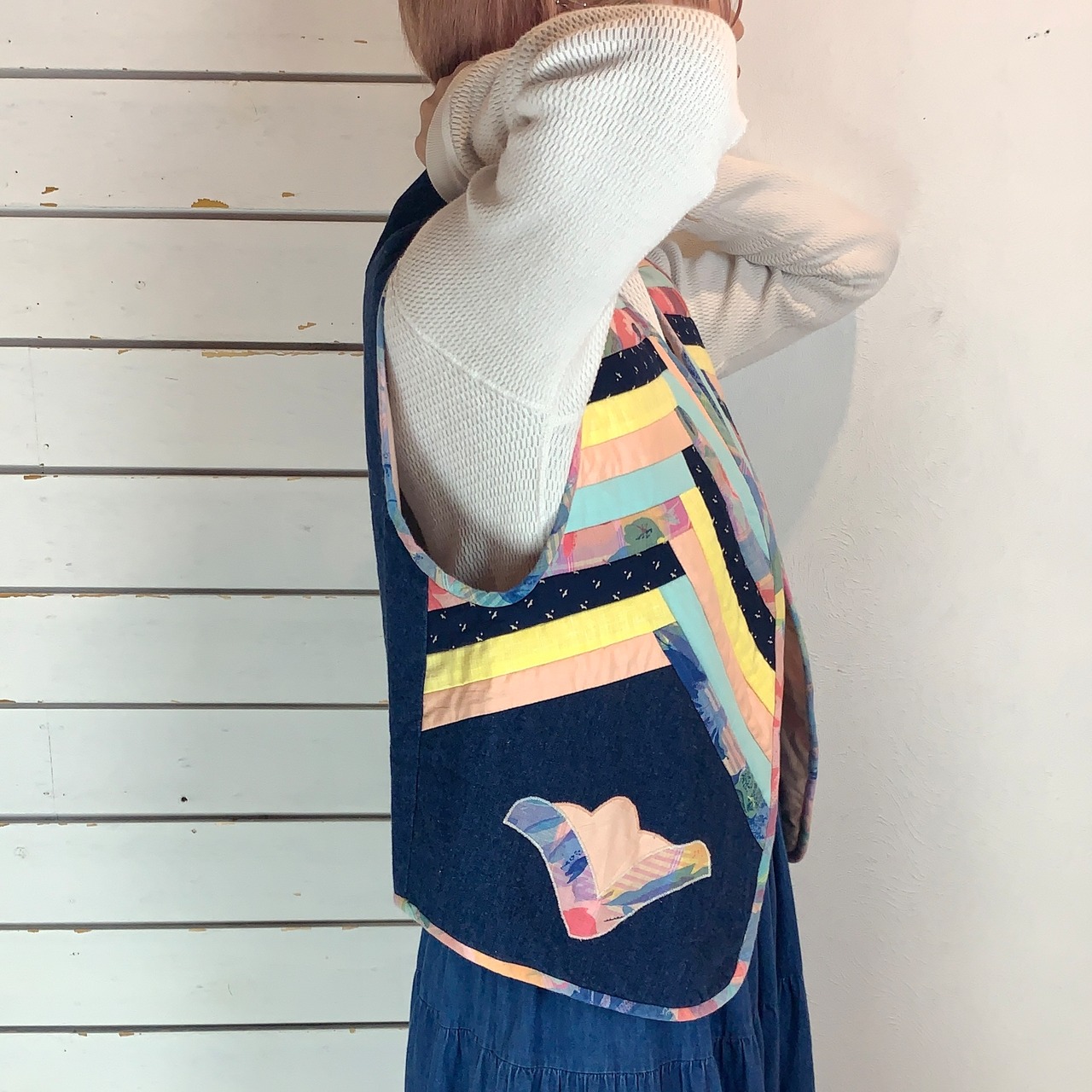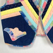 様々なファブリックで前面はパッチワーク、バックはシンプル、パイピングありでぬかりない