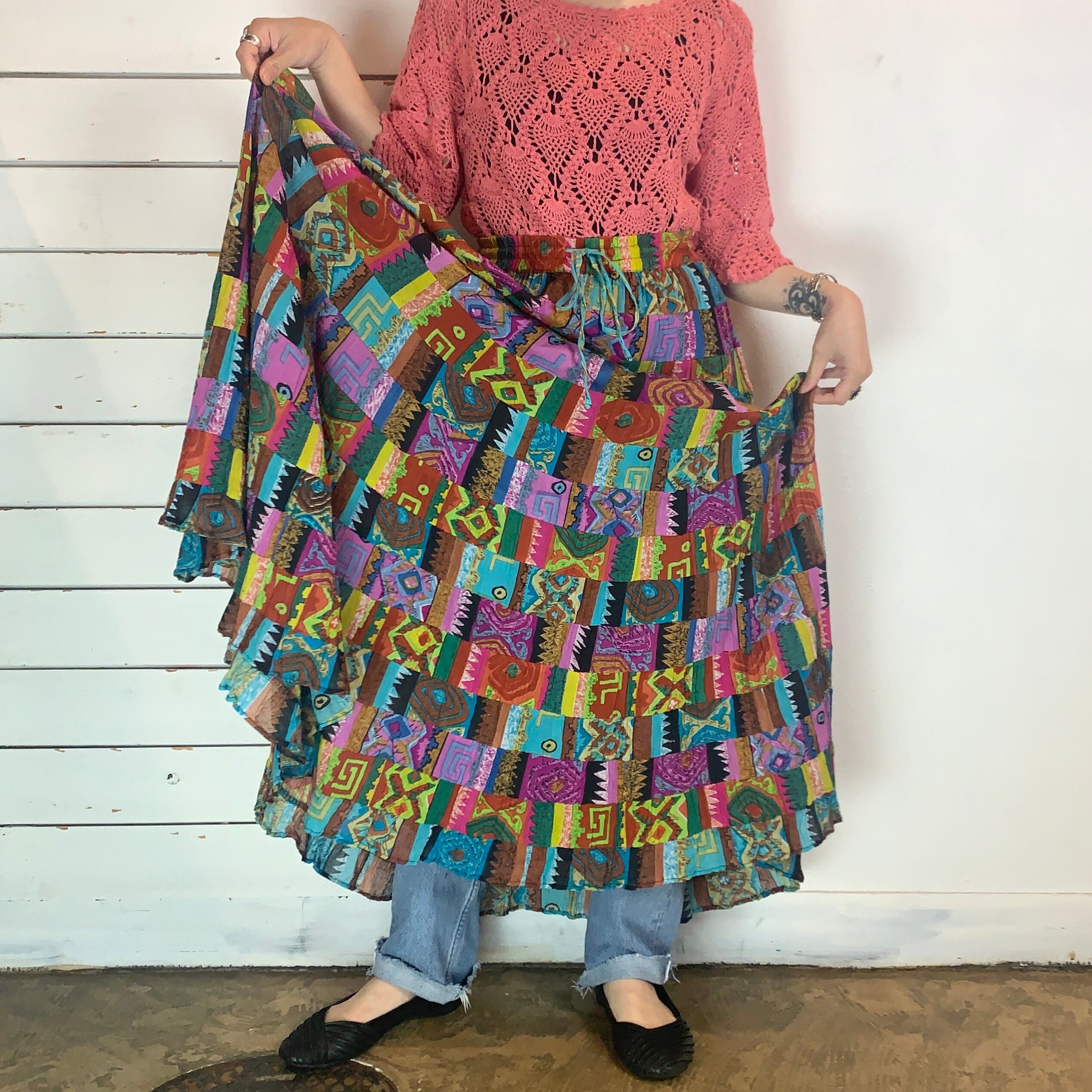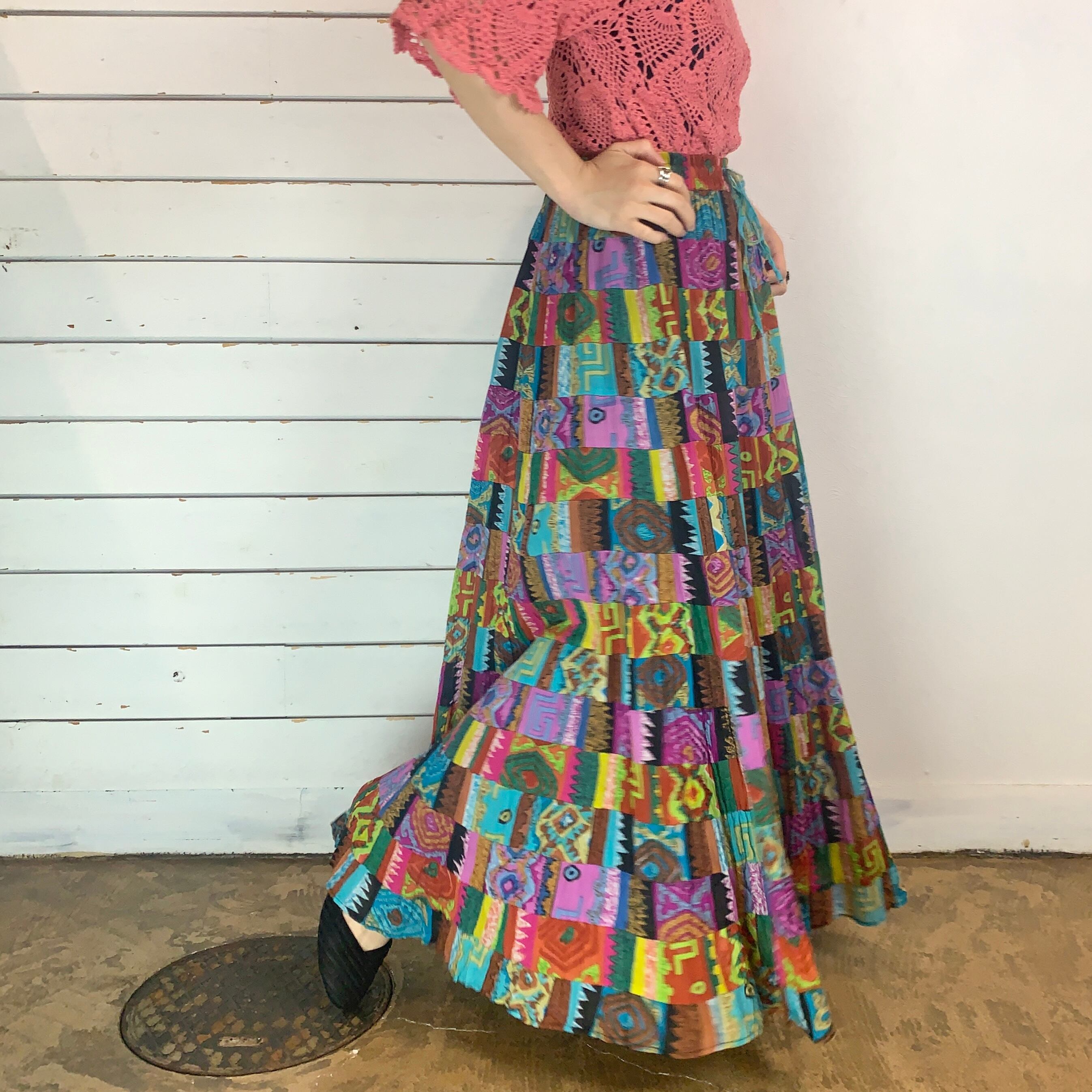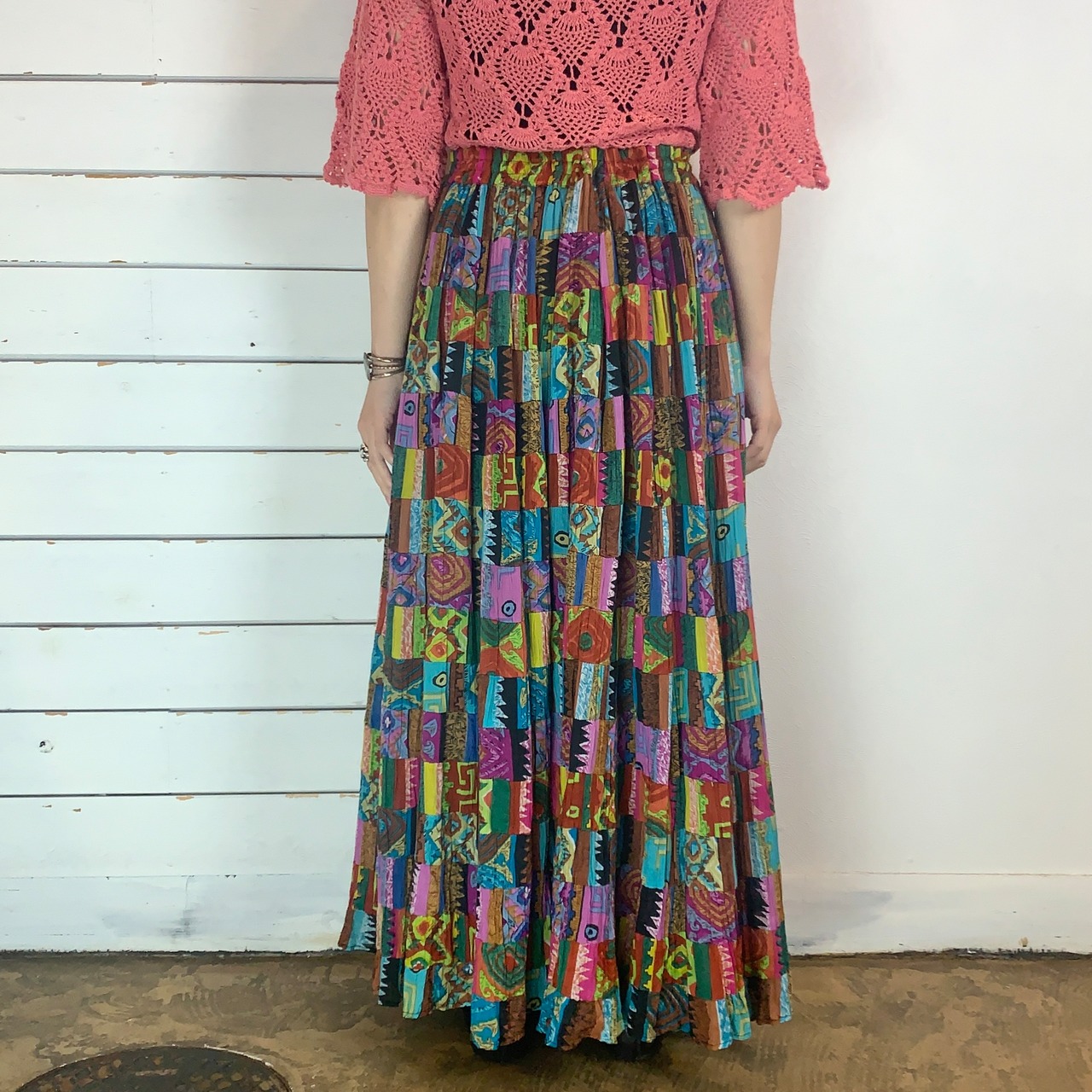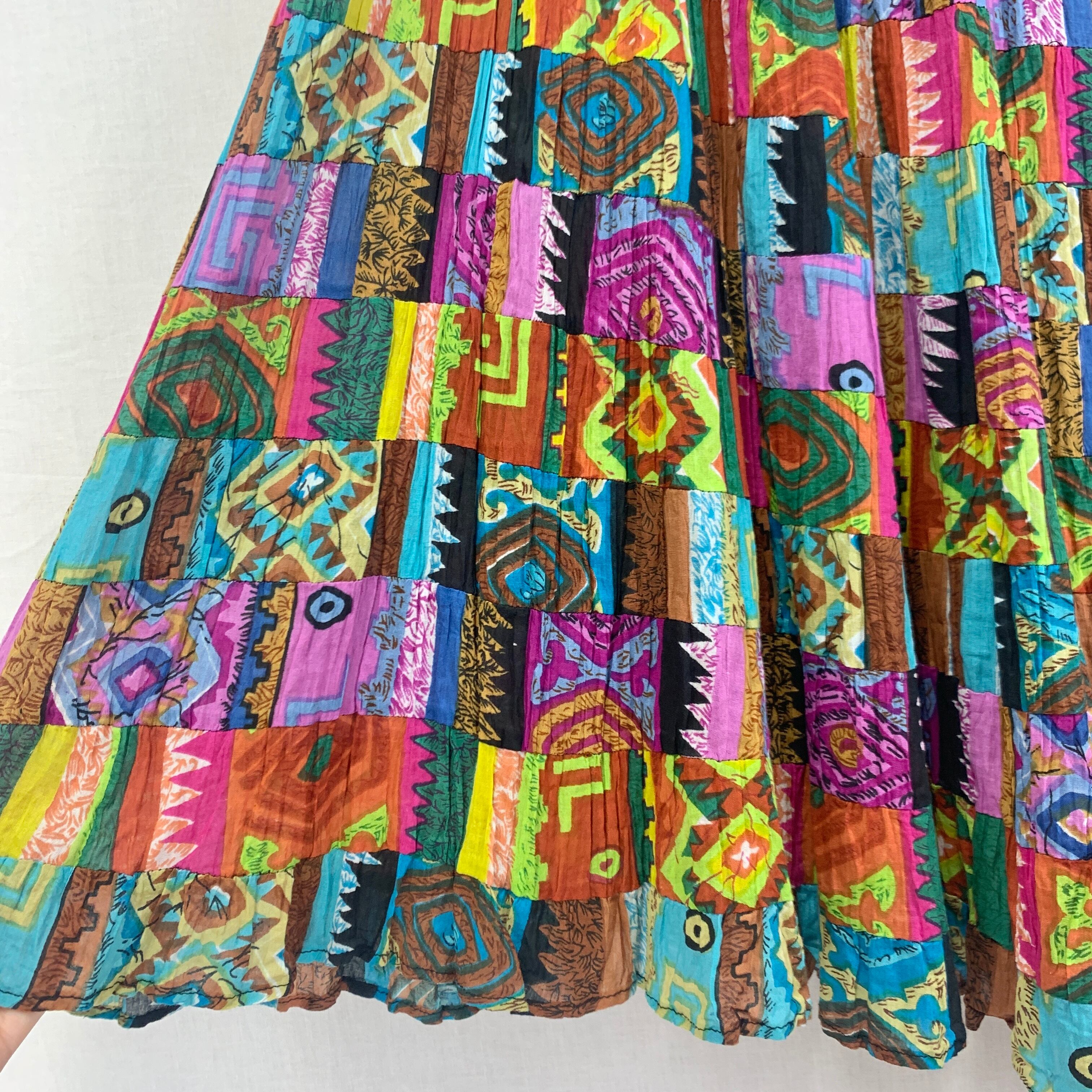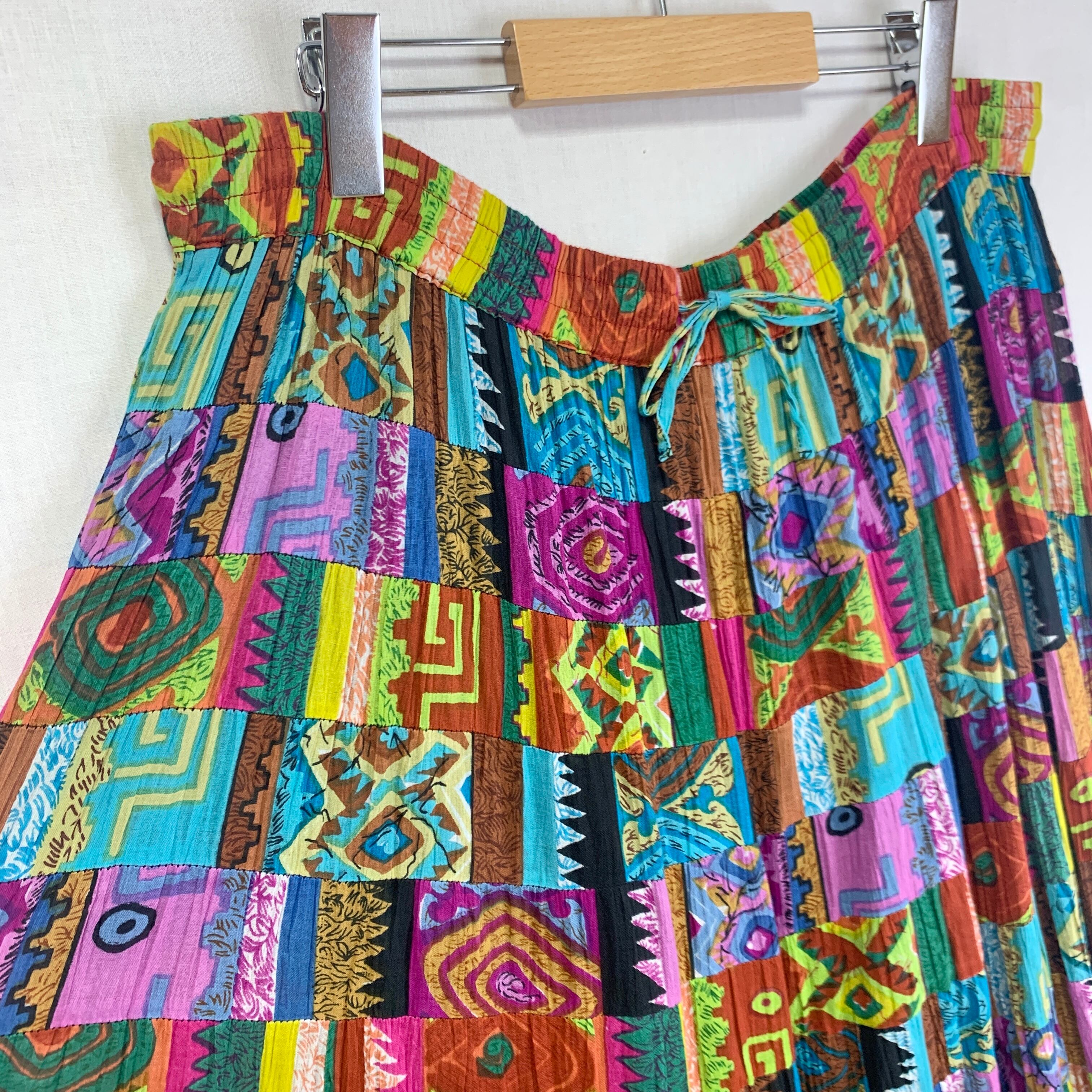 夏らしくカラフルで様々な柄のパッチワークスカート