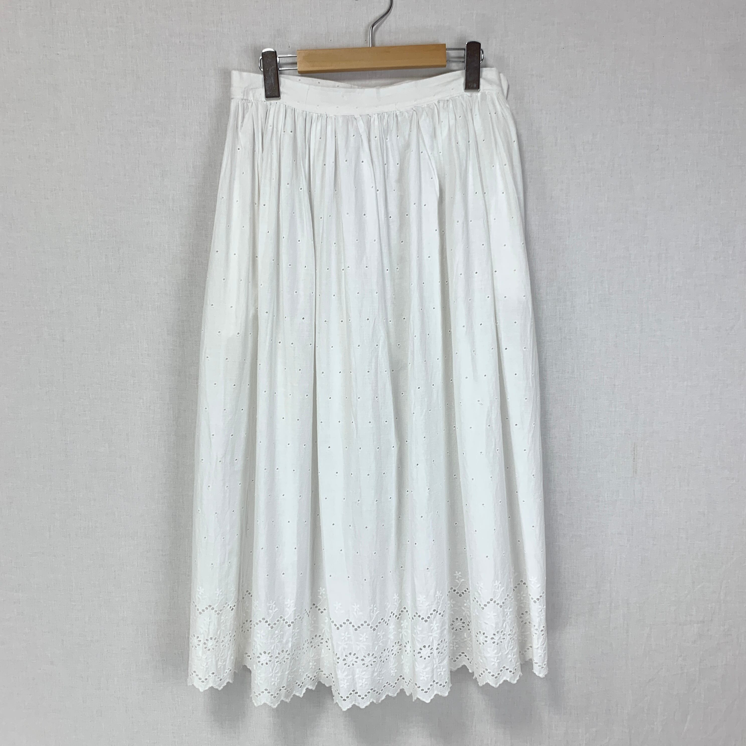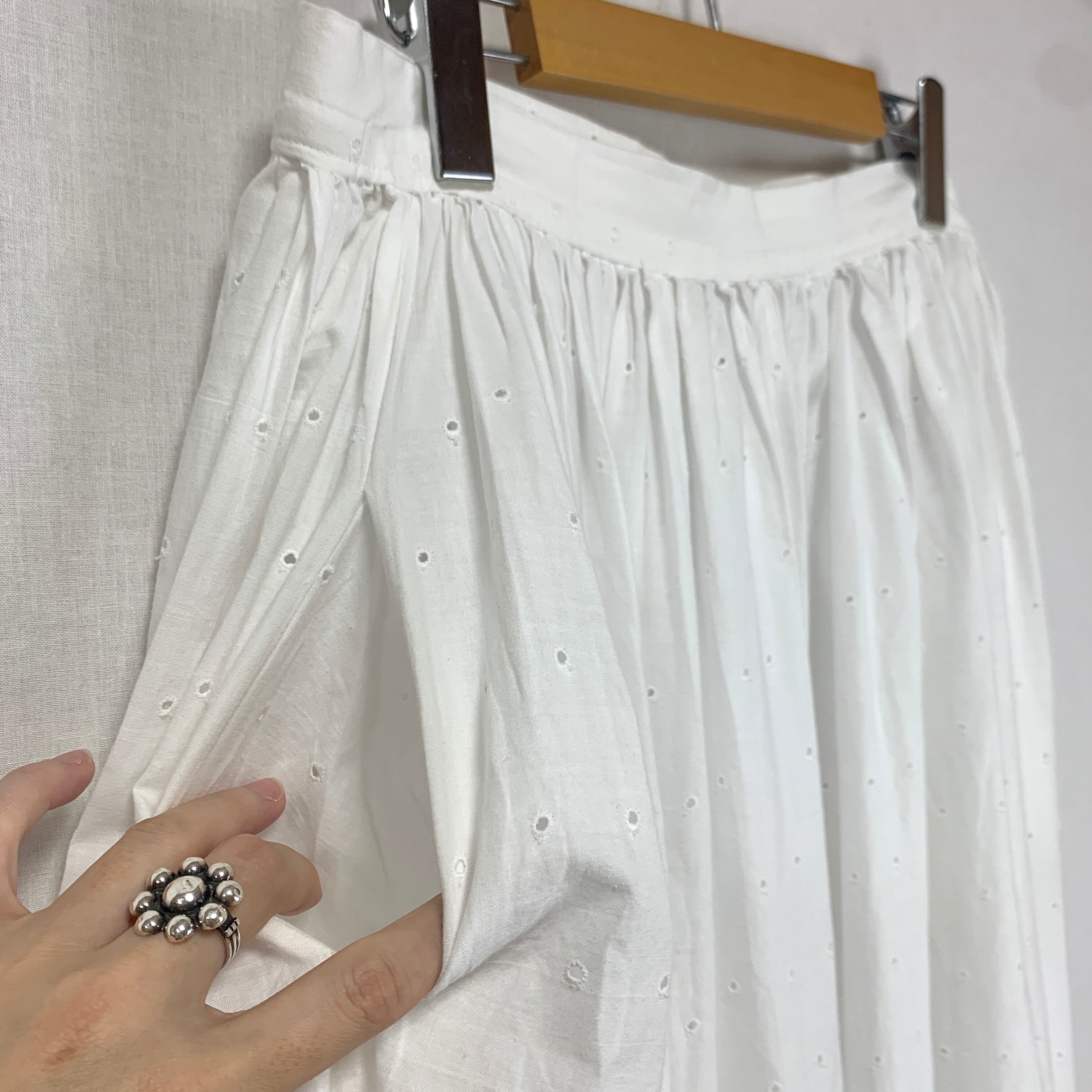 全体的に小さなドット、裾はたっぷりとカットワーク刺繍が入った白スカート