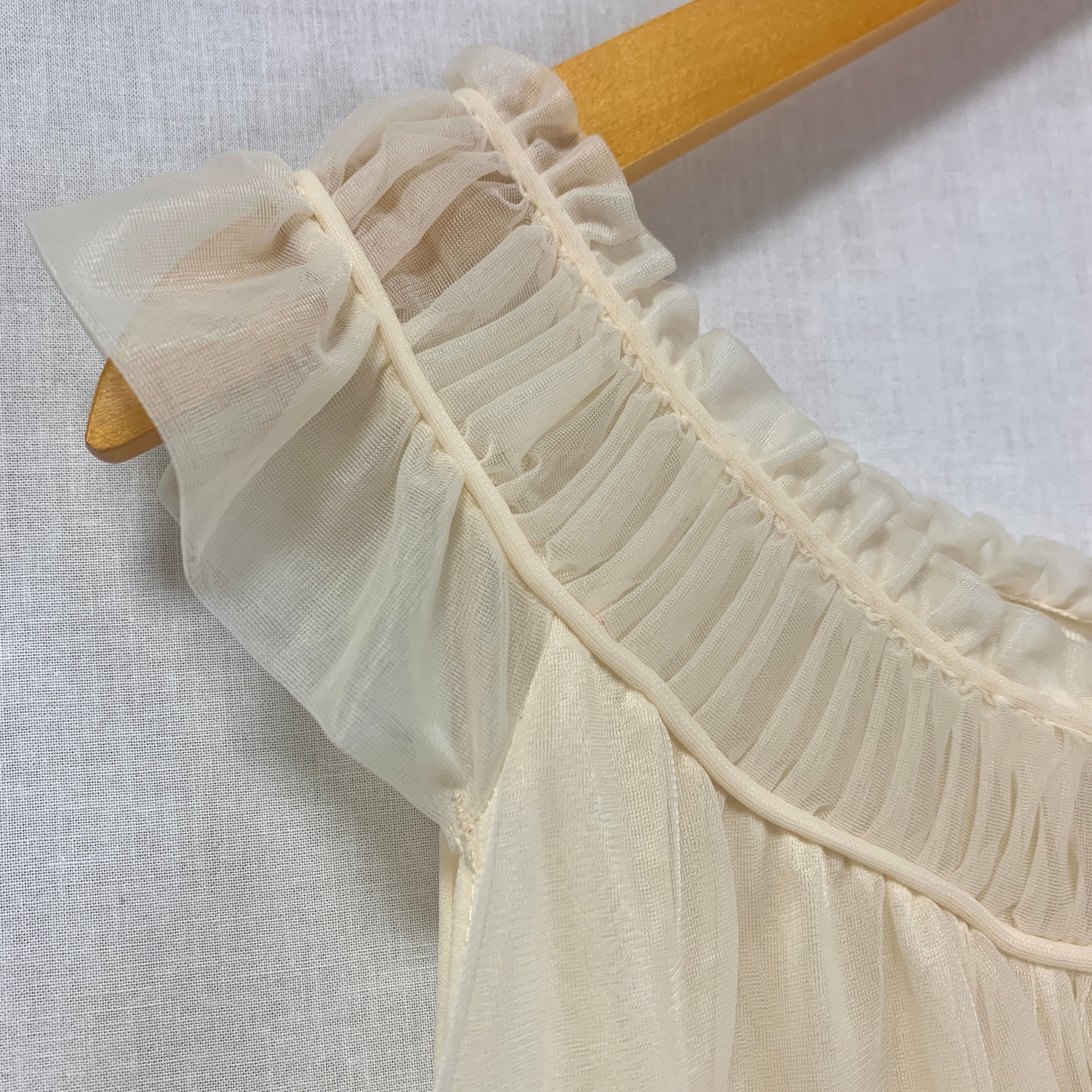 胸元のシャーリングにちょこんと小さなリボン、肩はフリル気味のデザイン◉