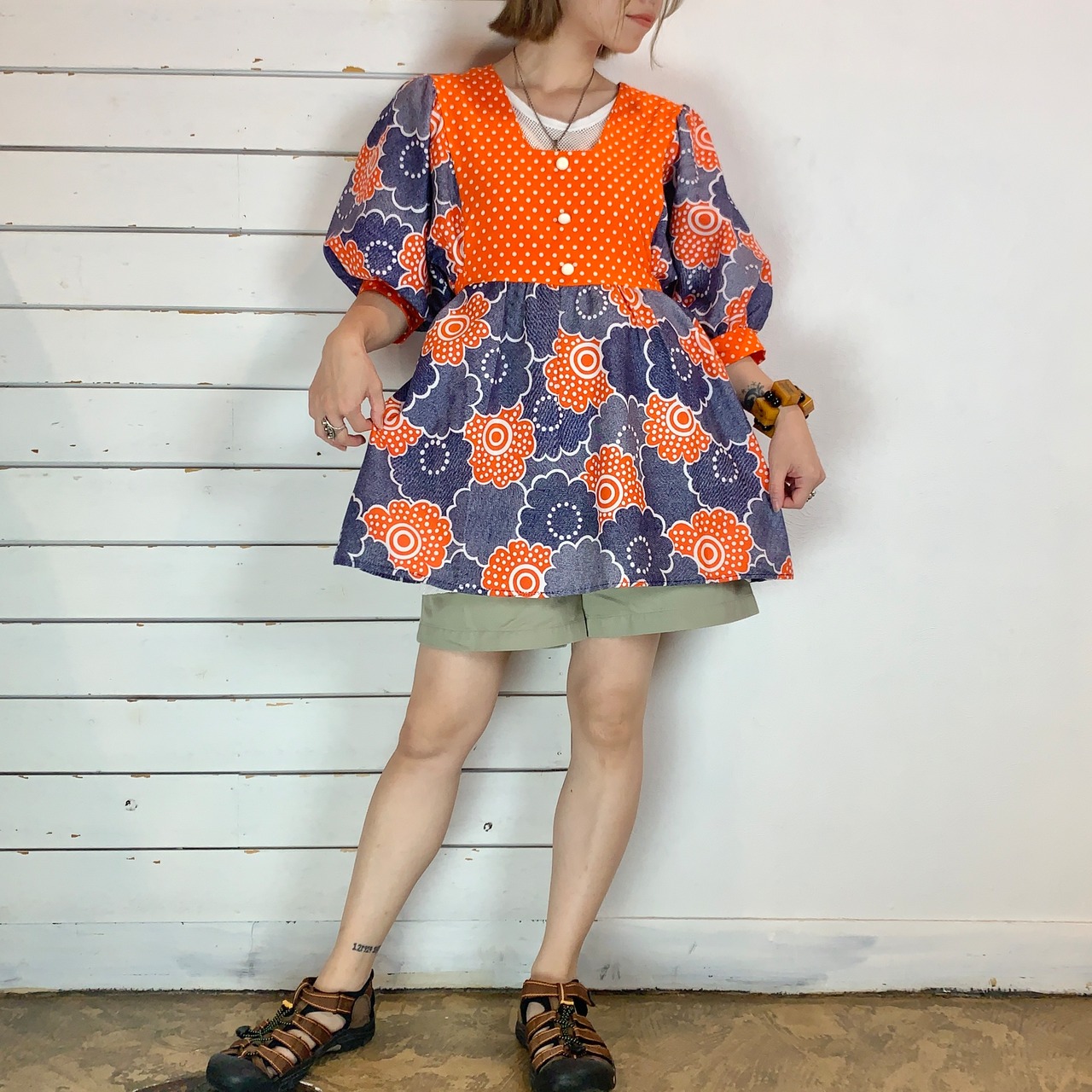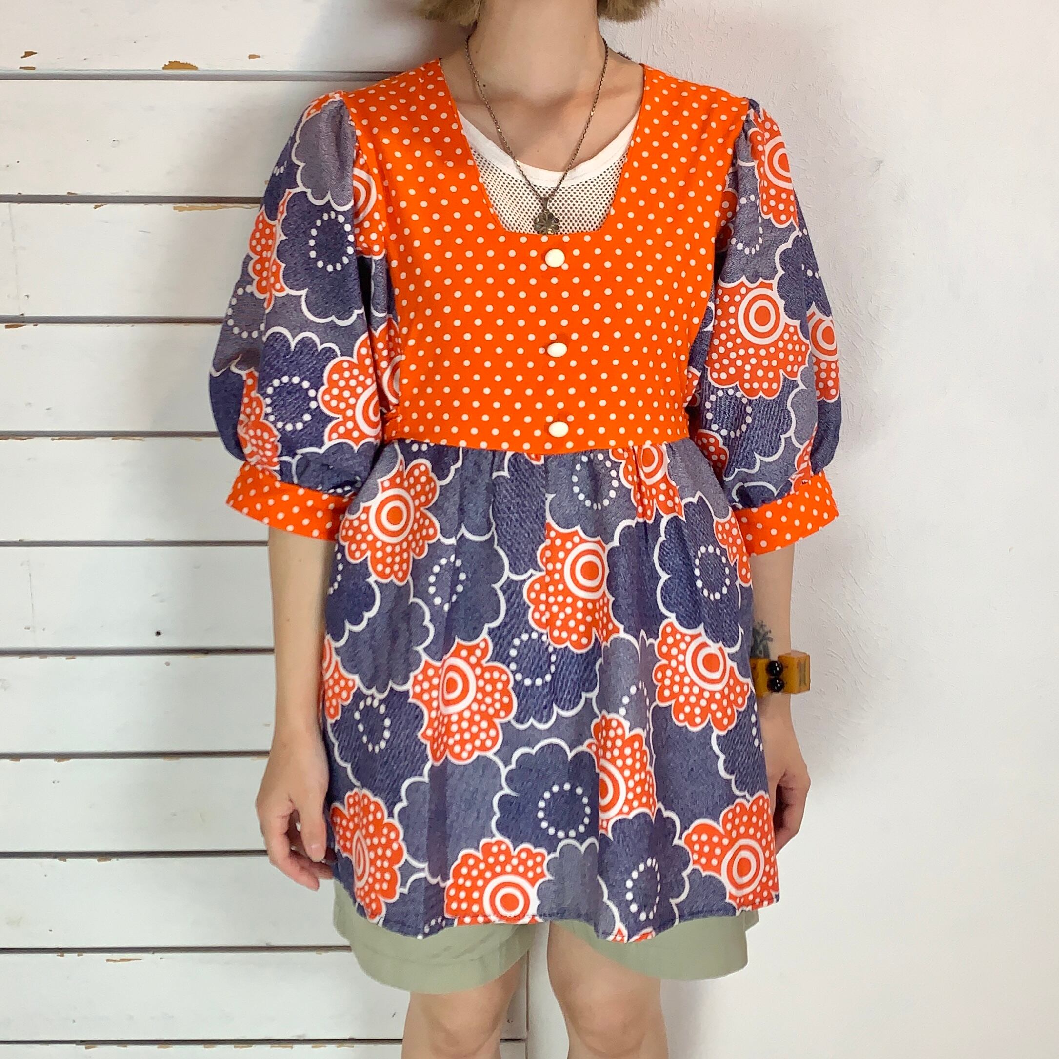 ネイビー×オレンジの好配色にレトロな花柄&ドット柄がかわいいトップス