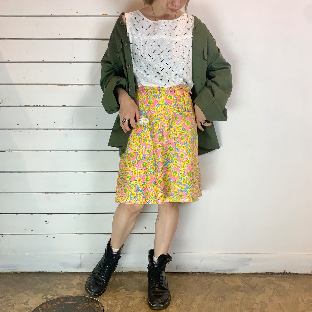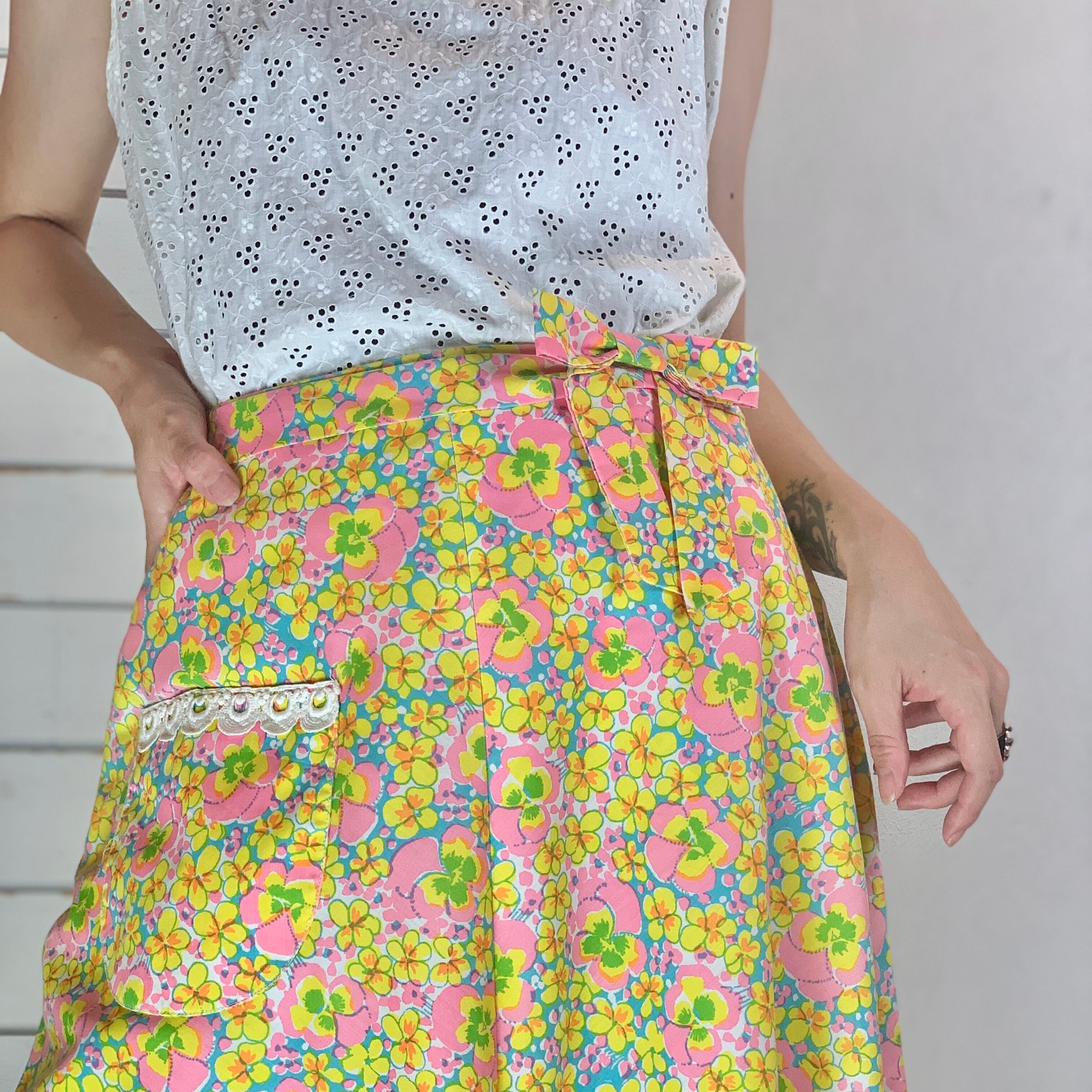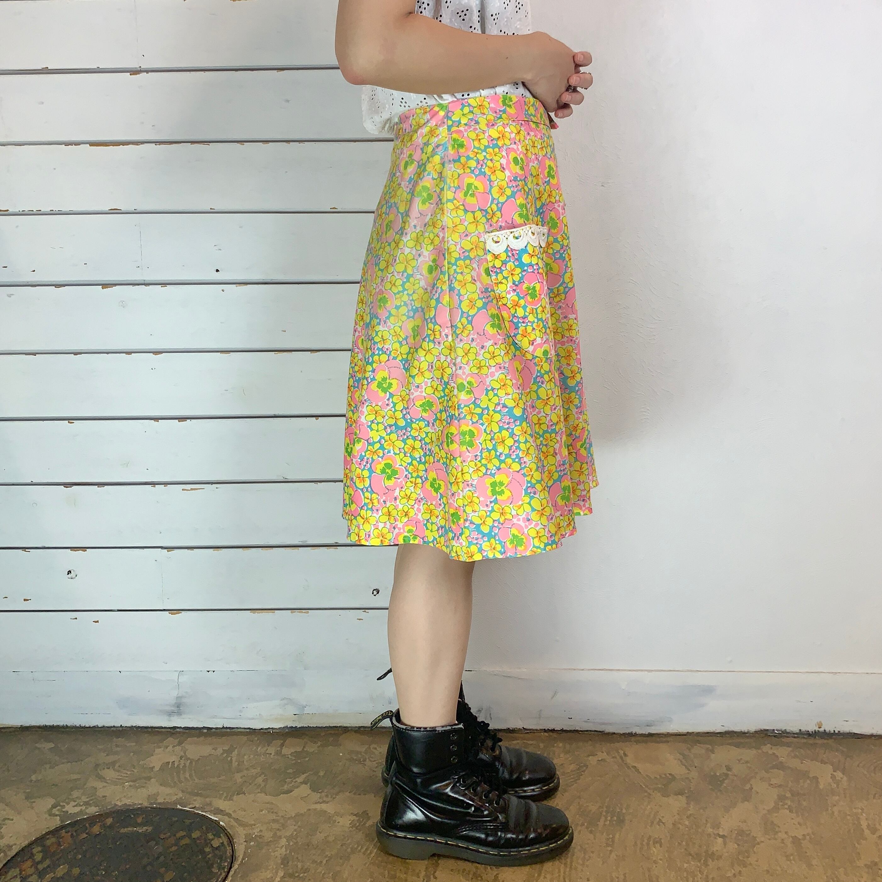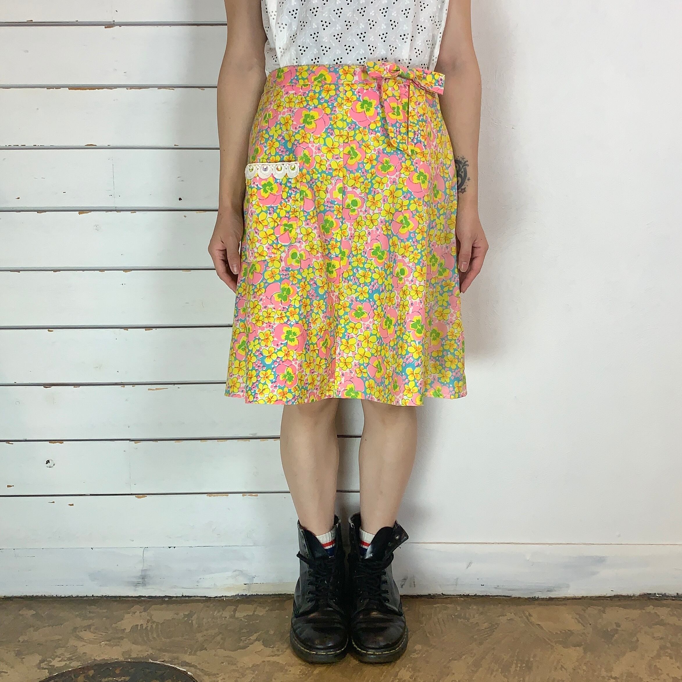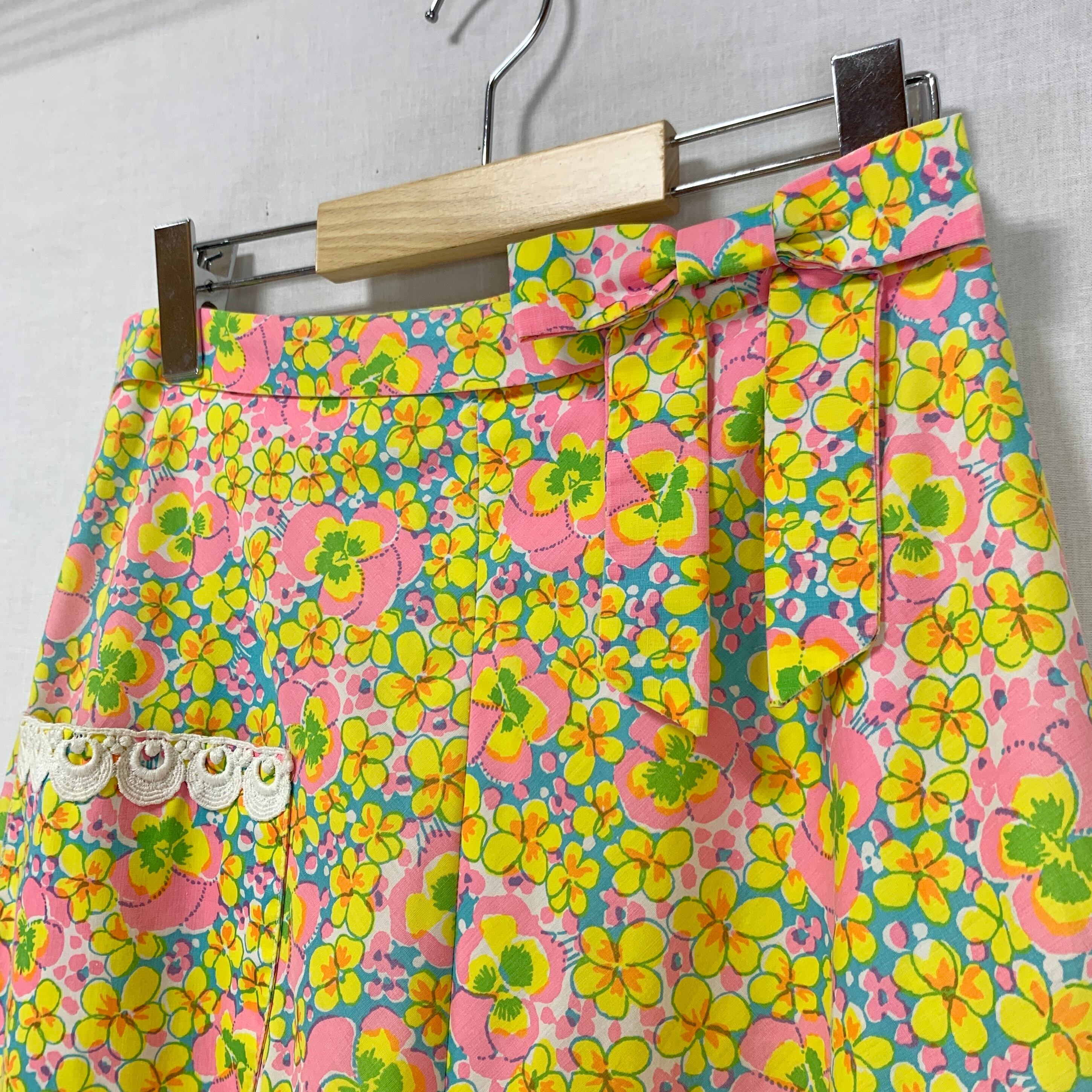 レトロな花柄にレース付きのポケット、ウエストにはリボンとかわいいが詰まったミディアムスカート